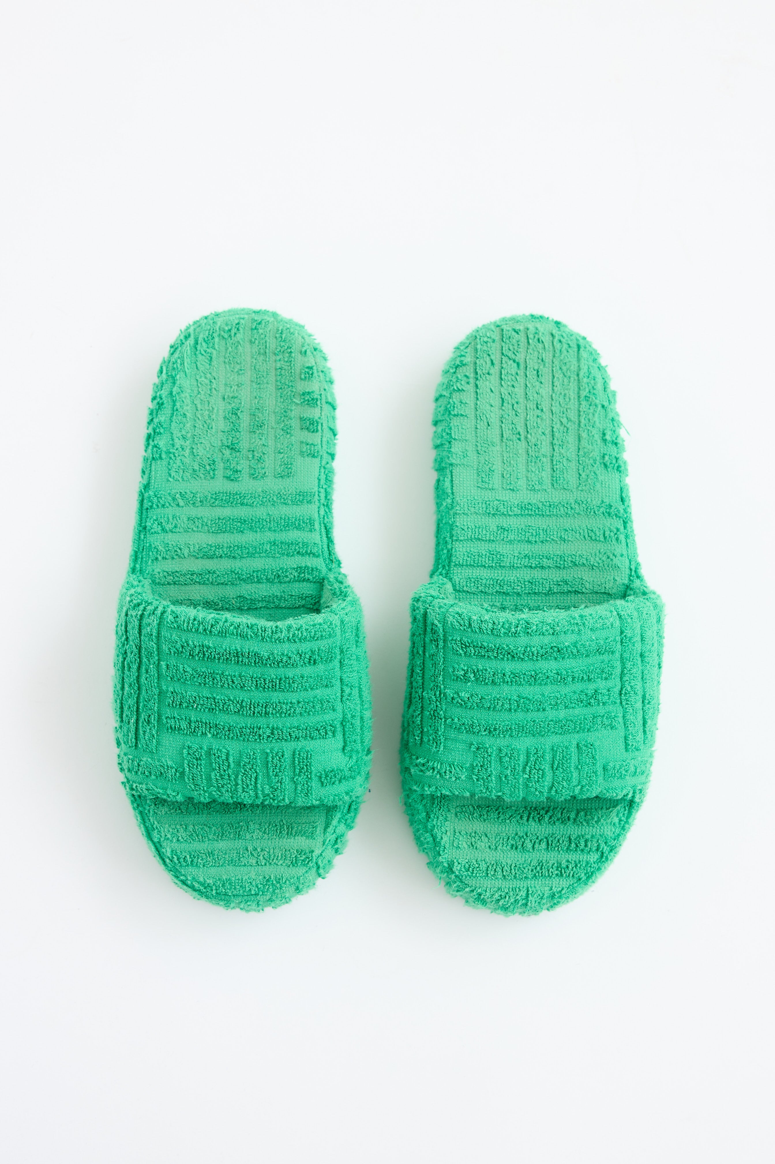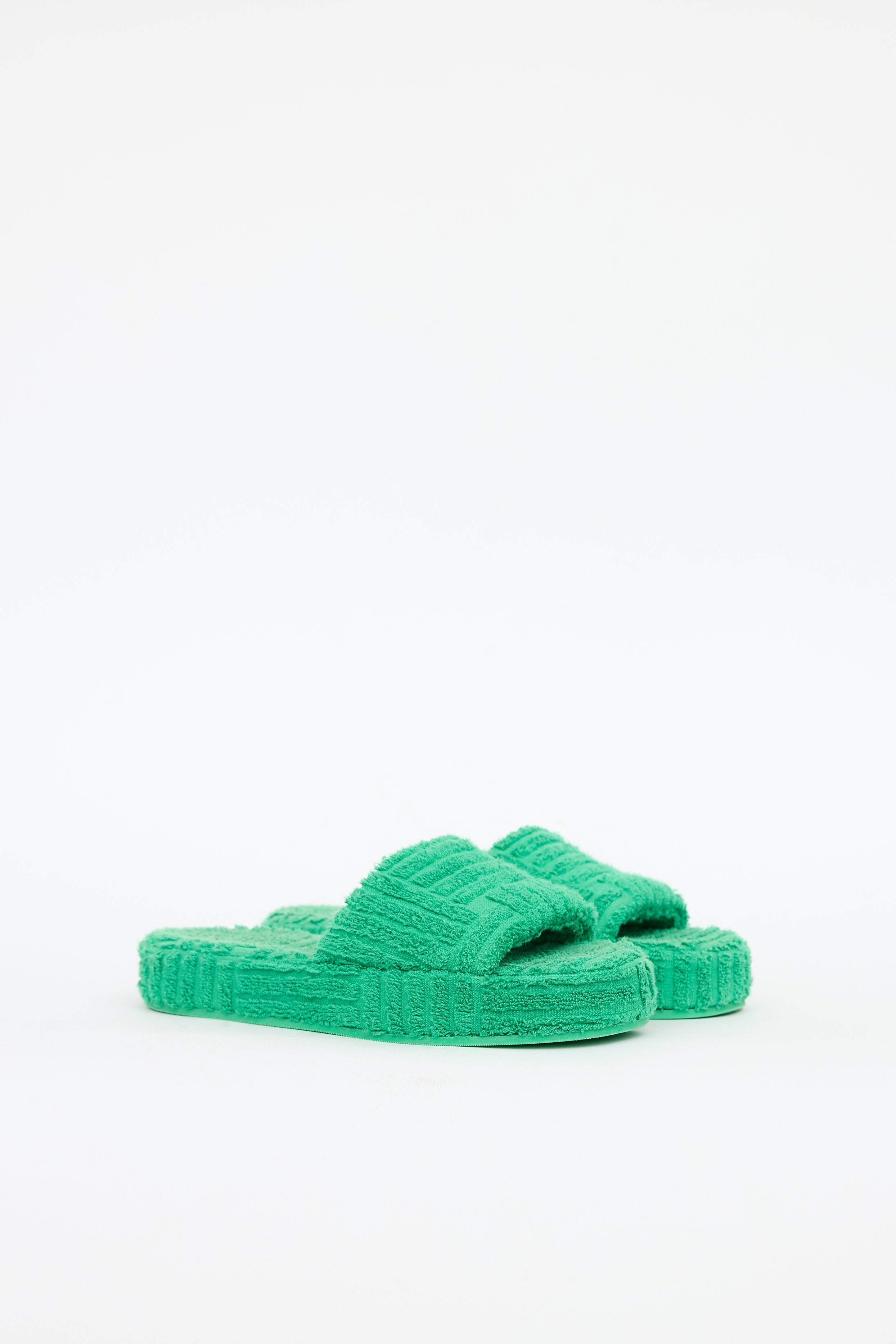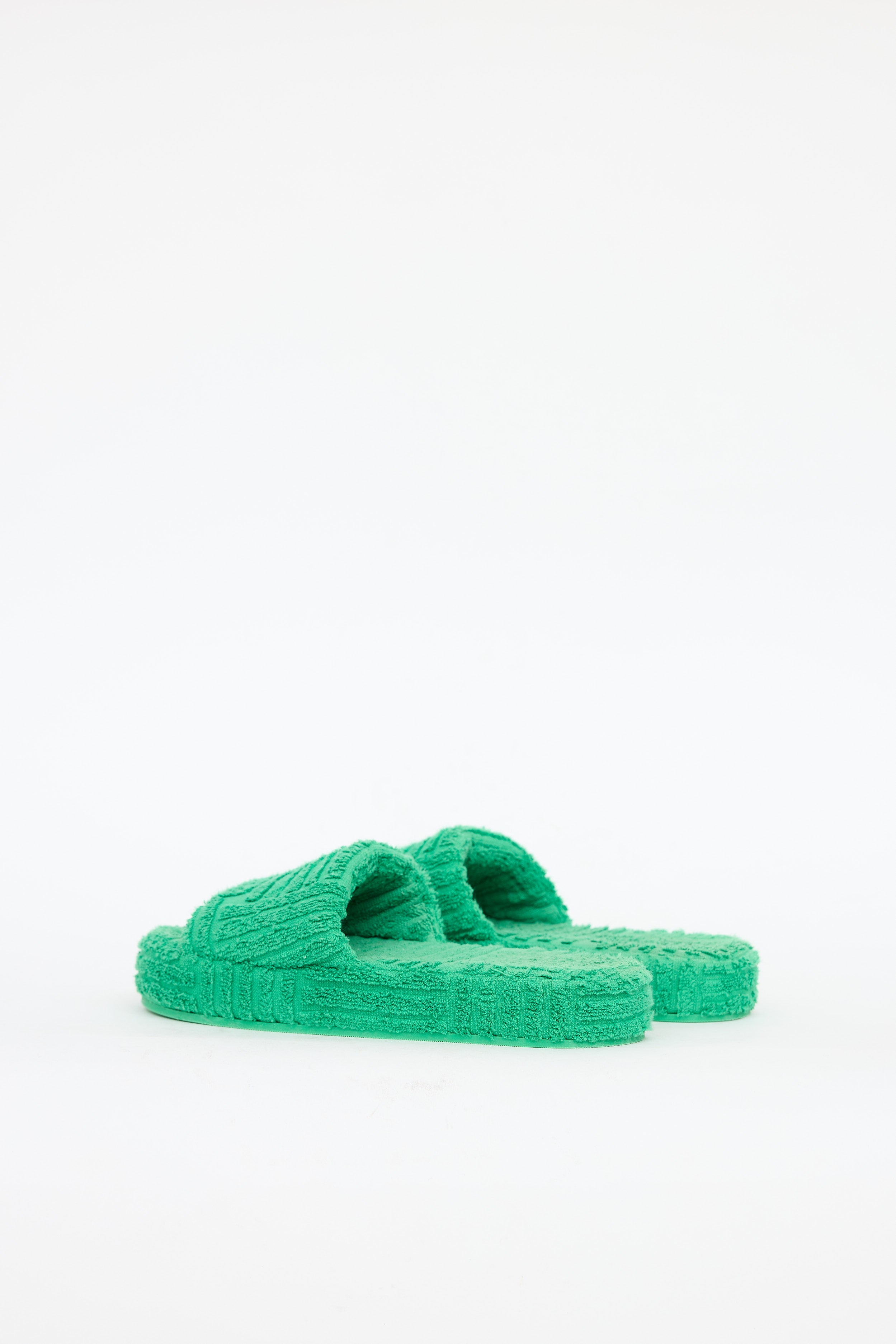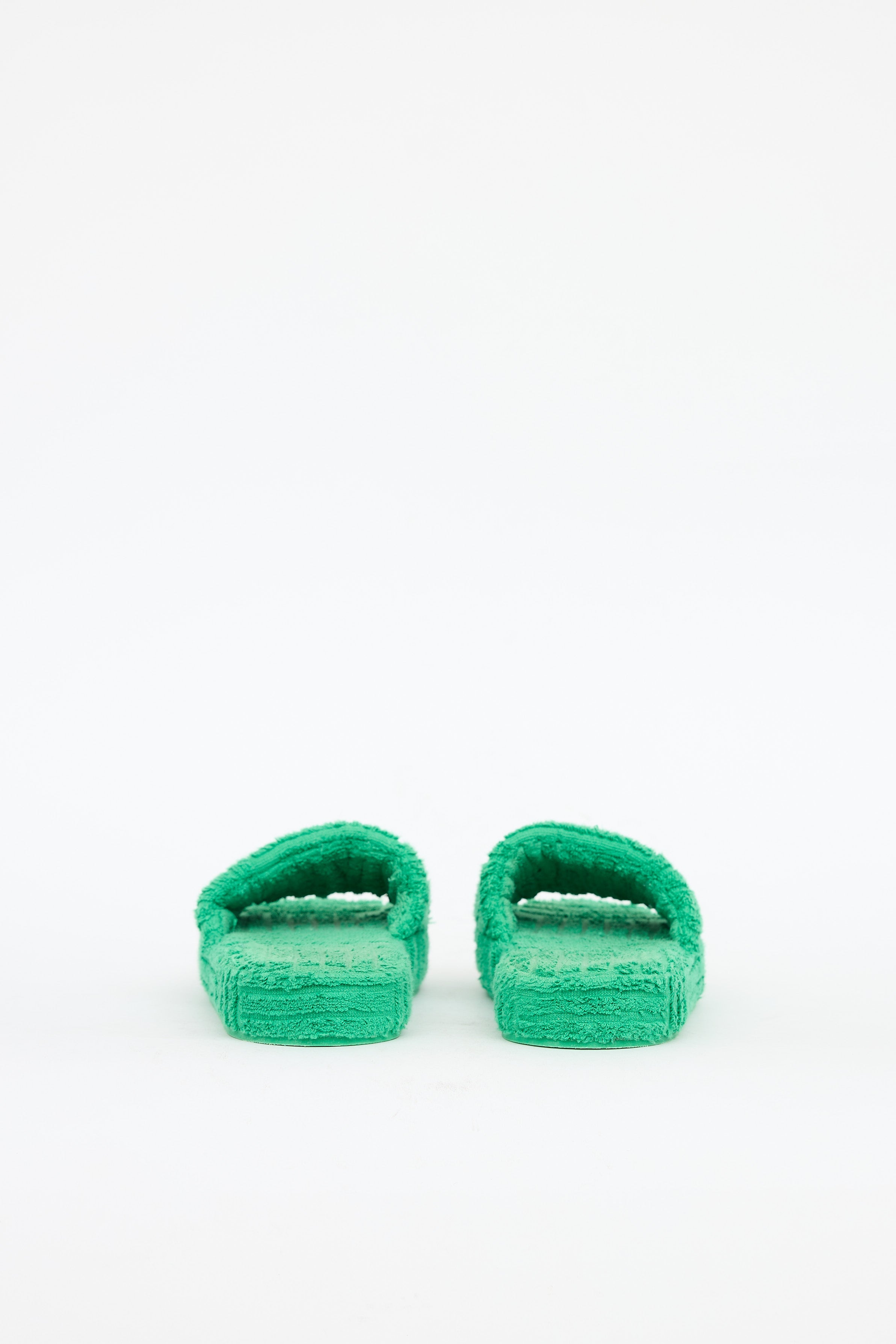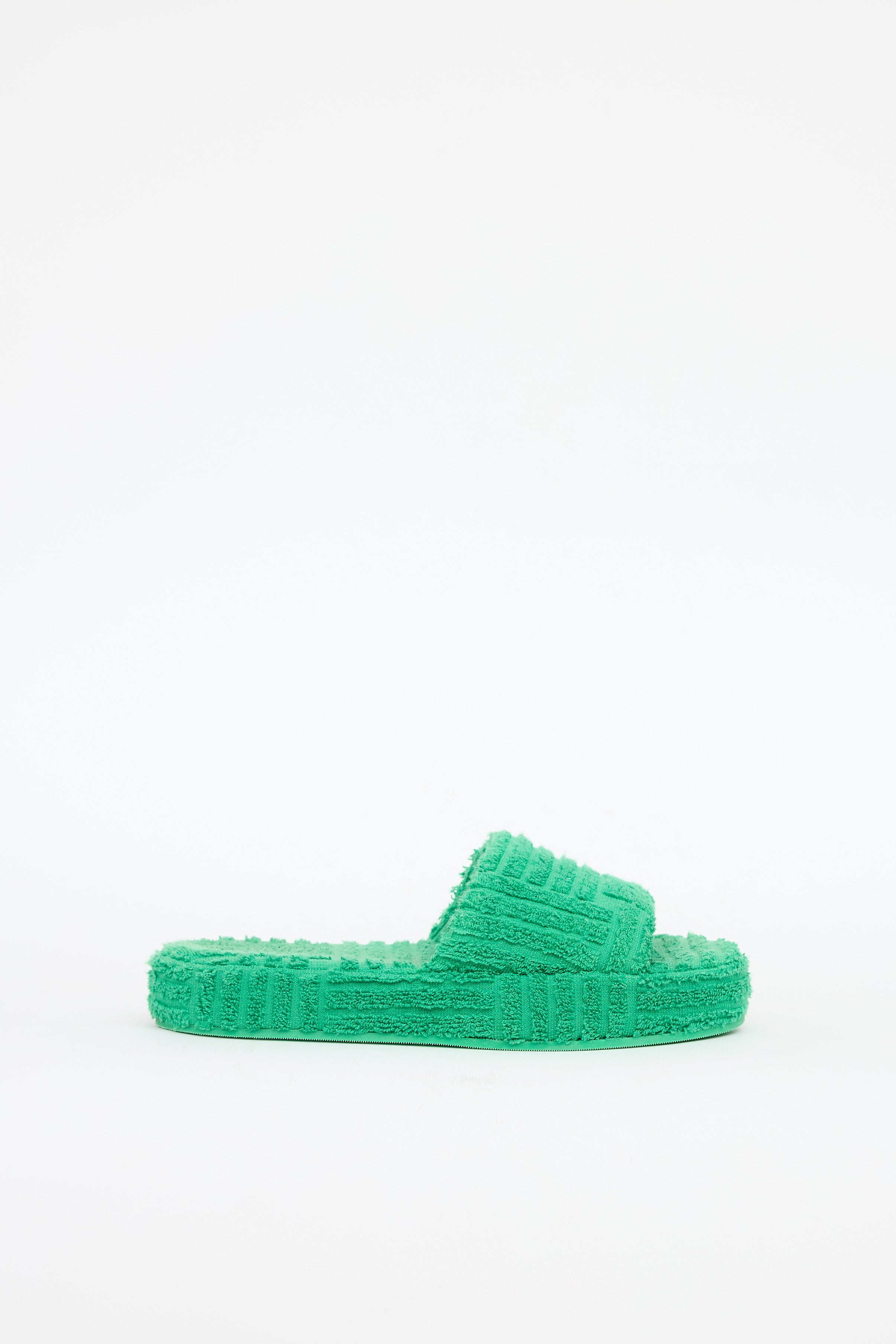 Pre-owned Bottega Veneta green terry cloth slides featuring a round toe, strap at upper, platform midsole, and textured detailing.