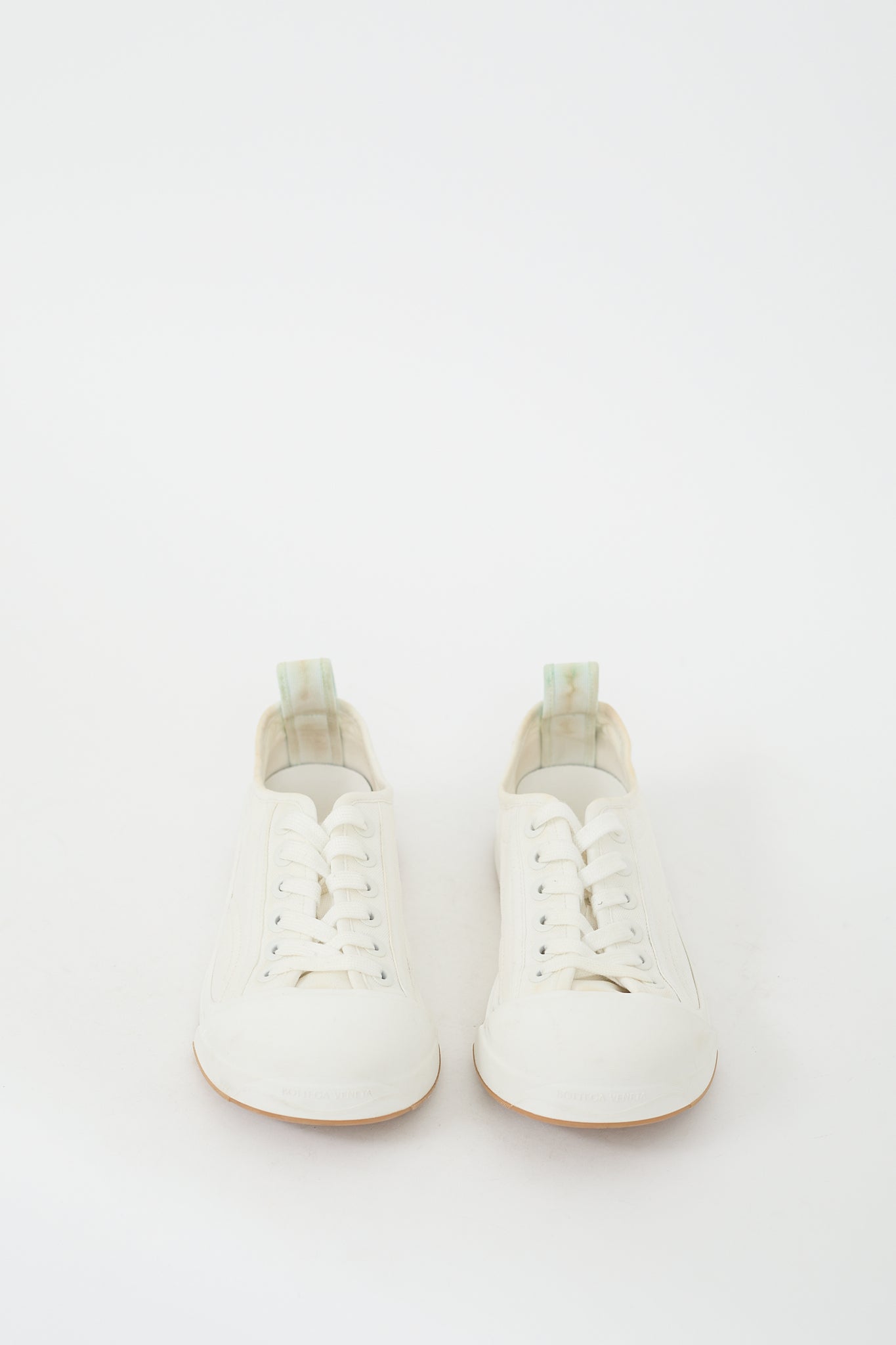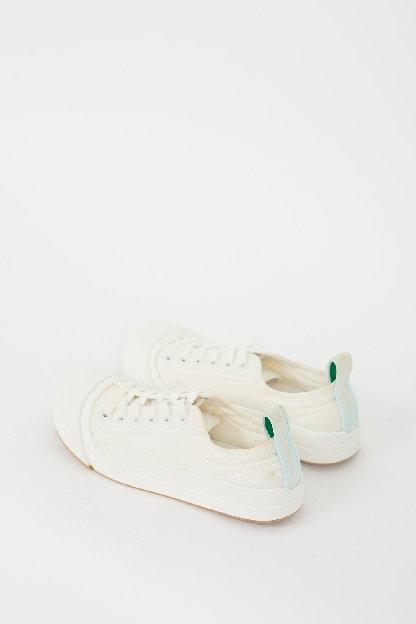 Pre-owned Bottega Veneta white canvas sneakers featuring rubber rounded cap toe, lace up front, rubber midsoles, and pull tab at counter. Comes with original dust bag.