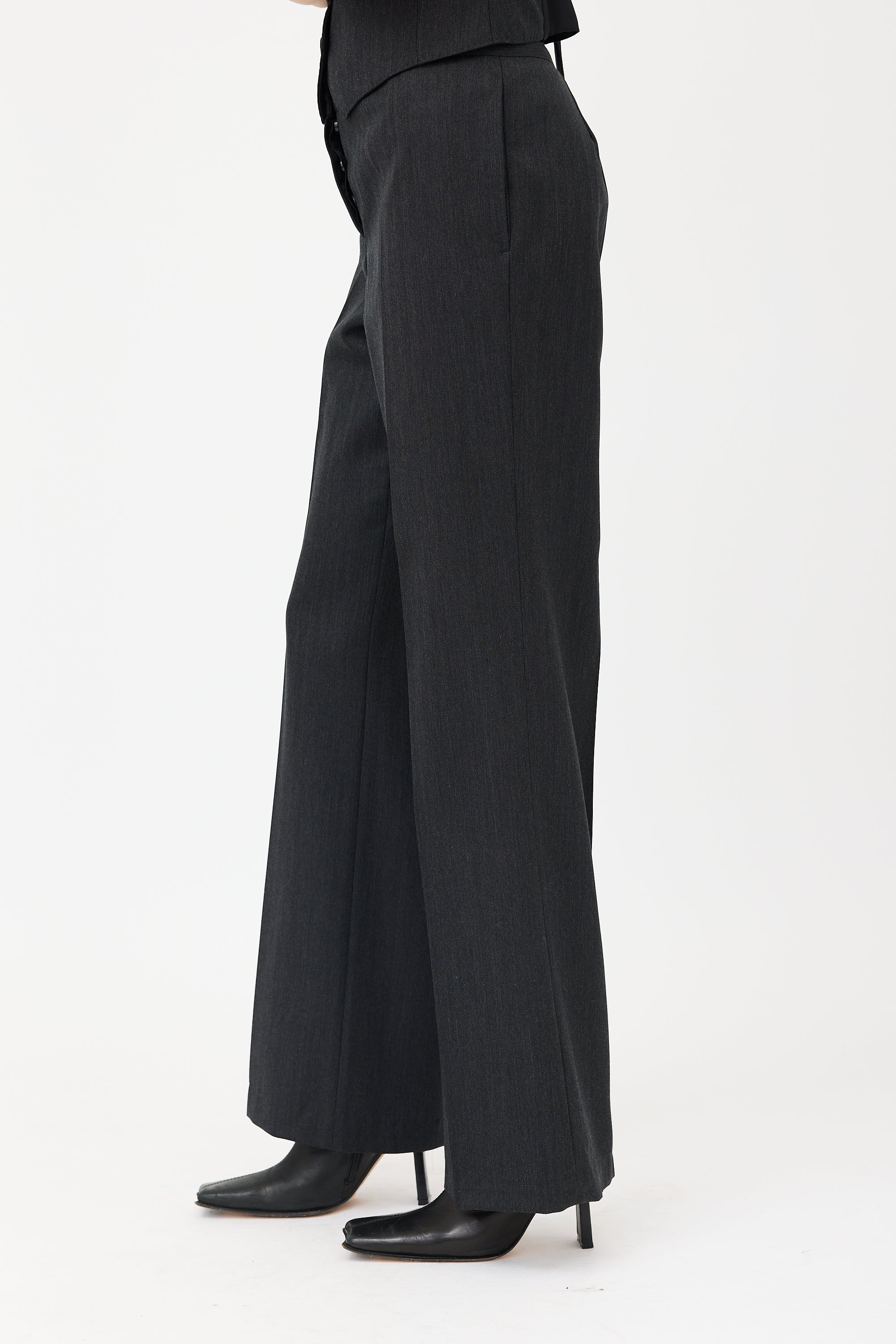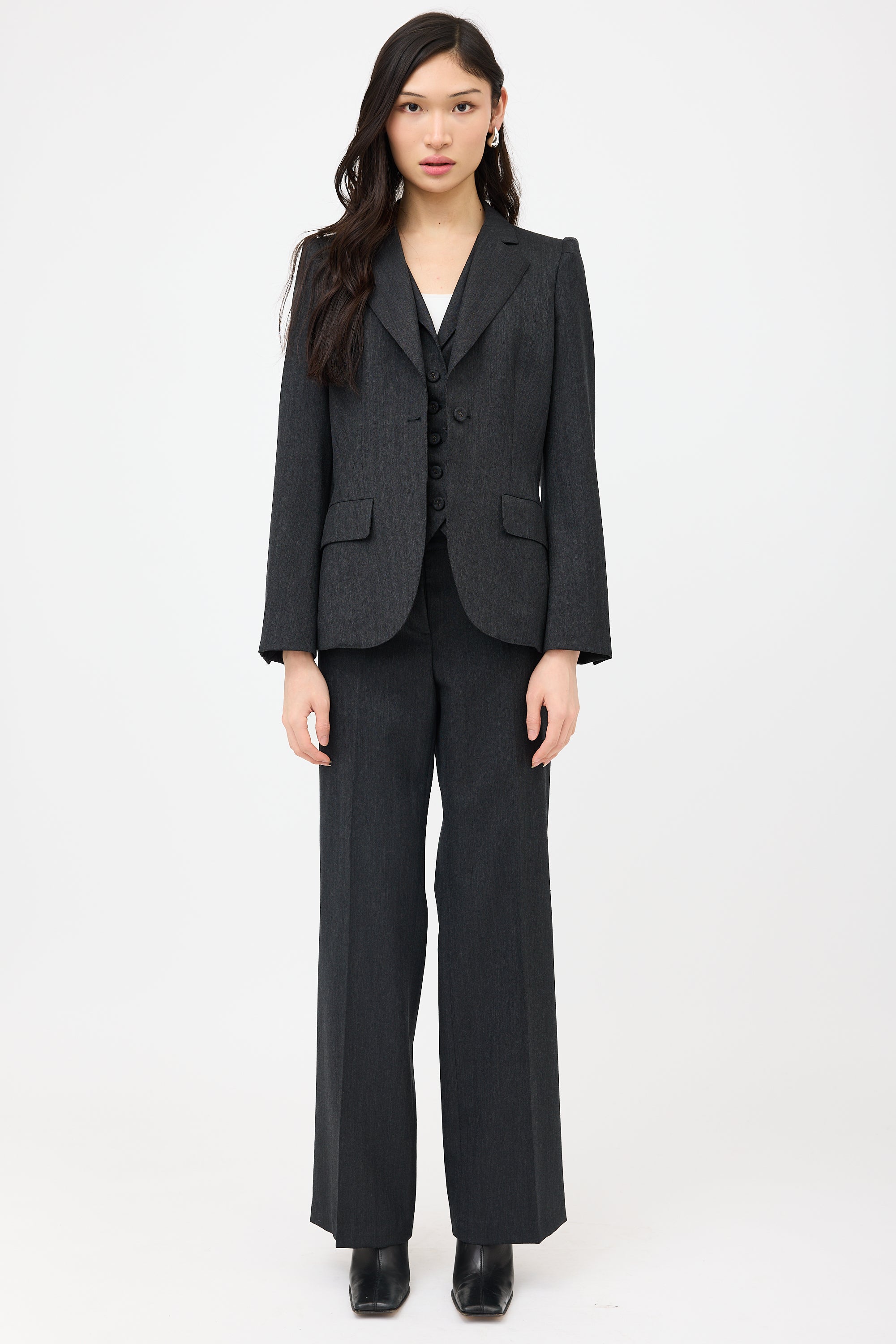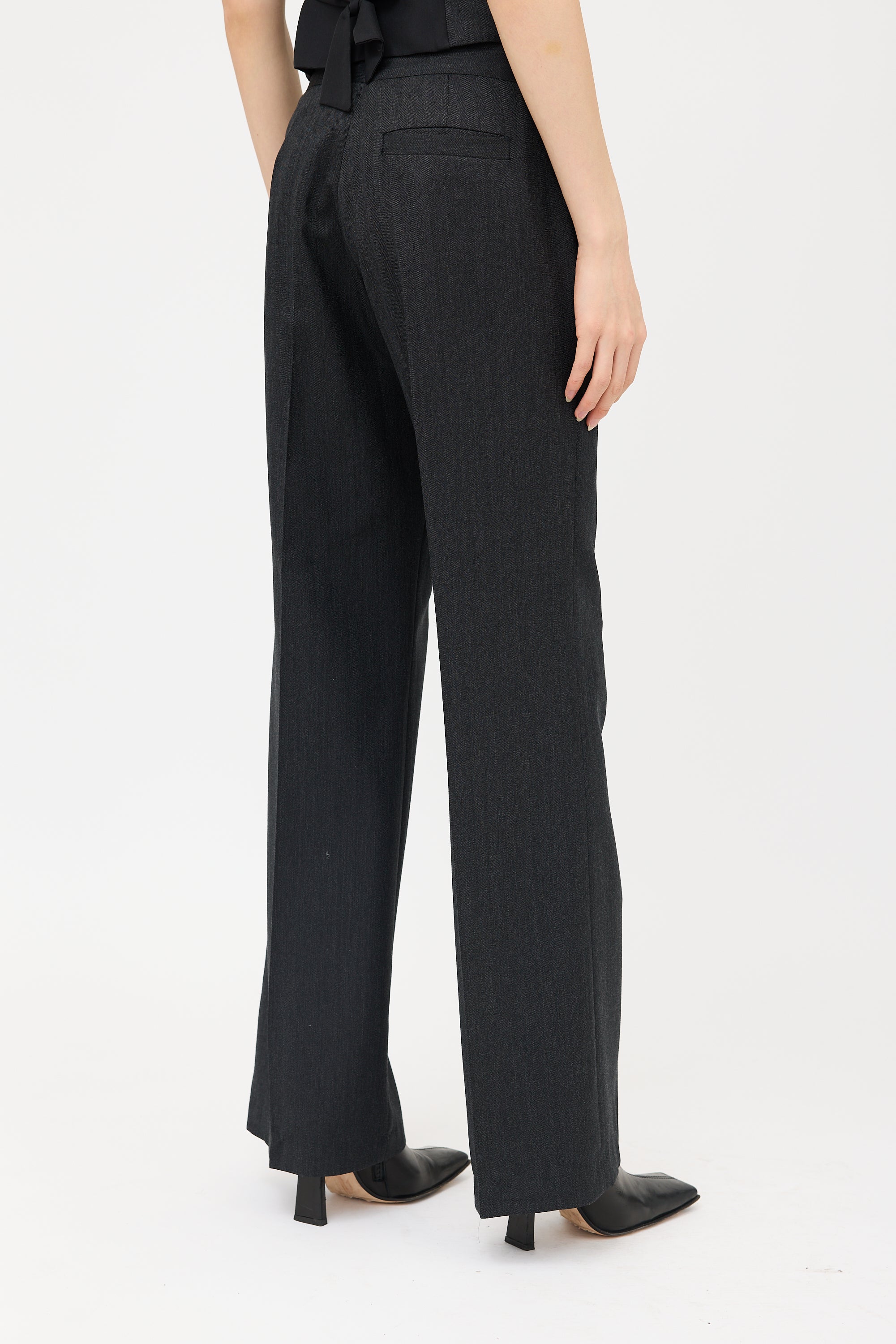 Pre-owned Bottega Veneta grey wool trousers featuring a tonal Herringbone pattern, low rise, three pocket styling, button fly, and straight leg. Unlined.