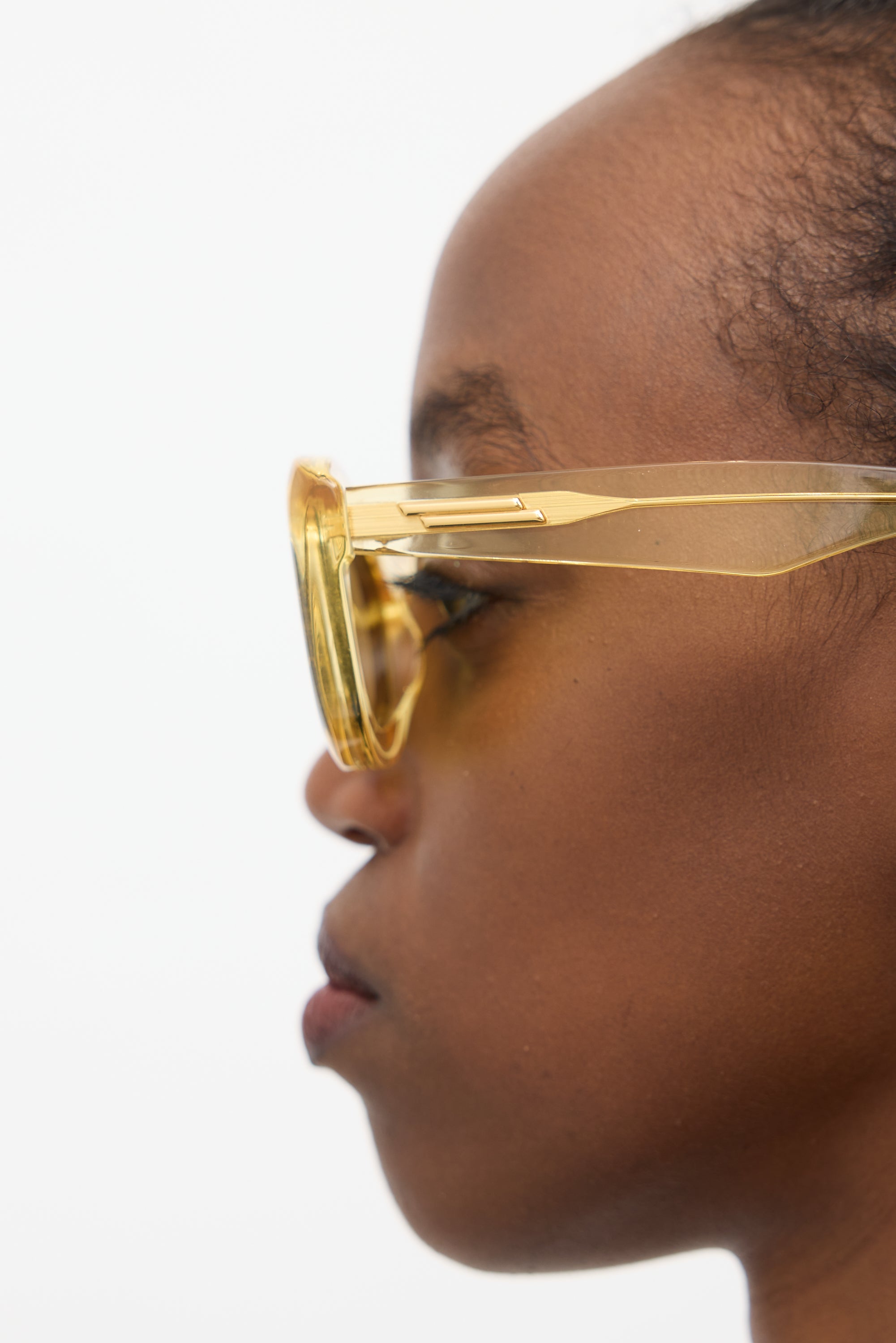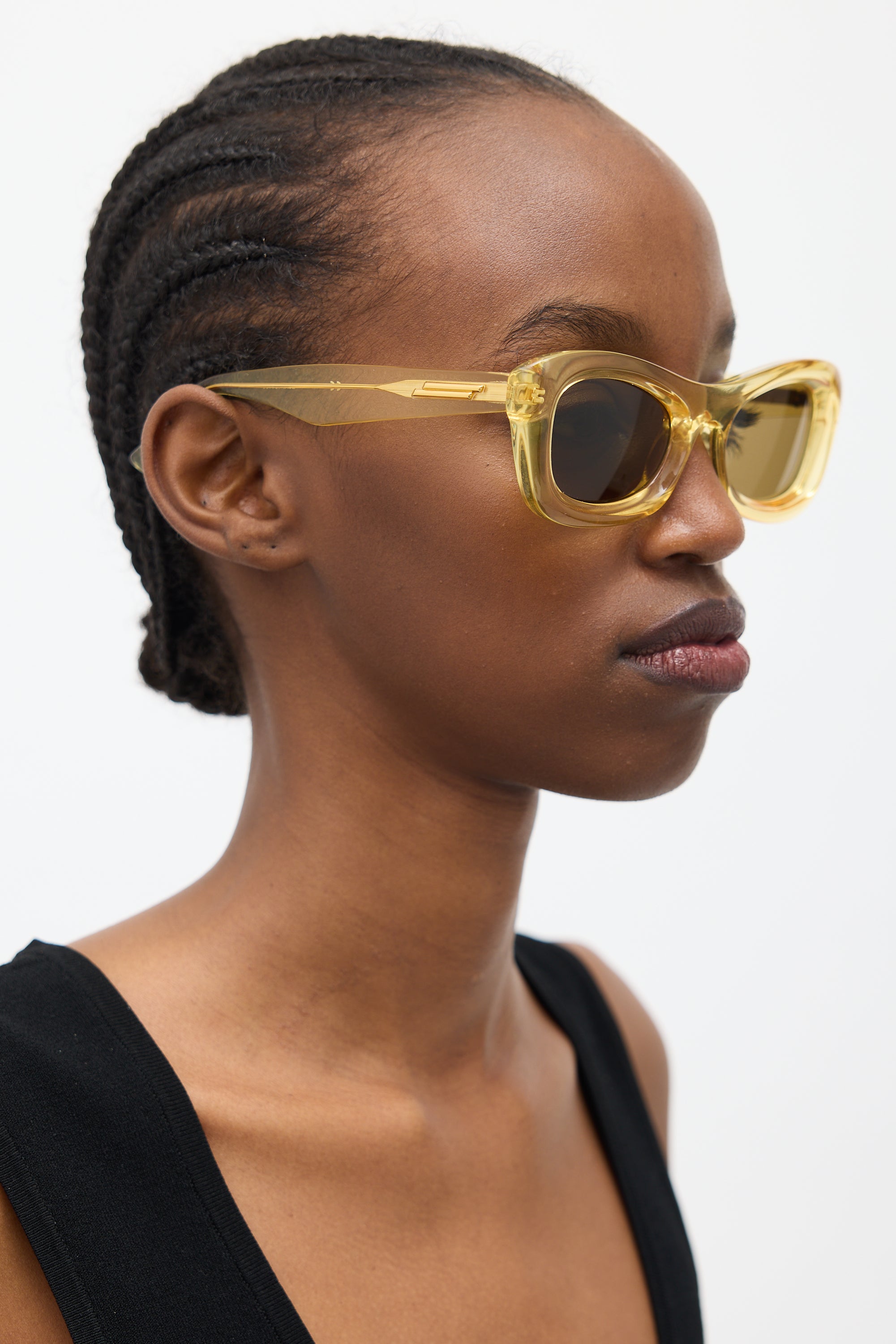 Pre-owned Bottega Veneta BV1088S sunglasses featuring grey tinted lenses, translucent yellow acetate cateye frame, and gold tone hardware accents at temples. Comes with original box, pouch, wipe cloth, care guide, and certificate of authenticity card.