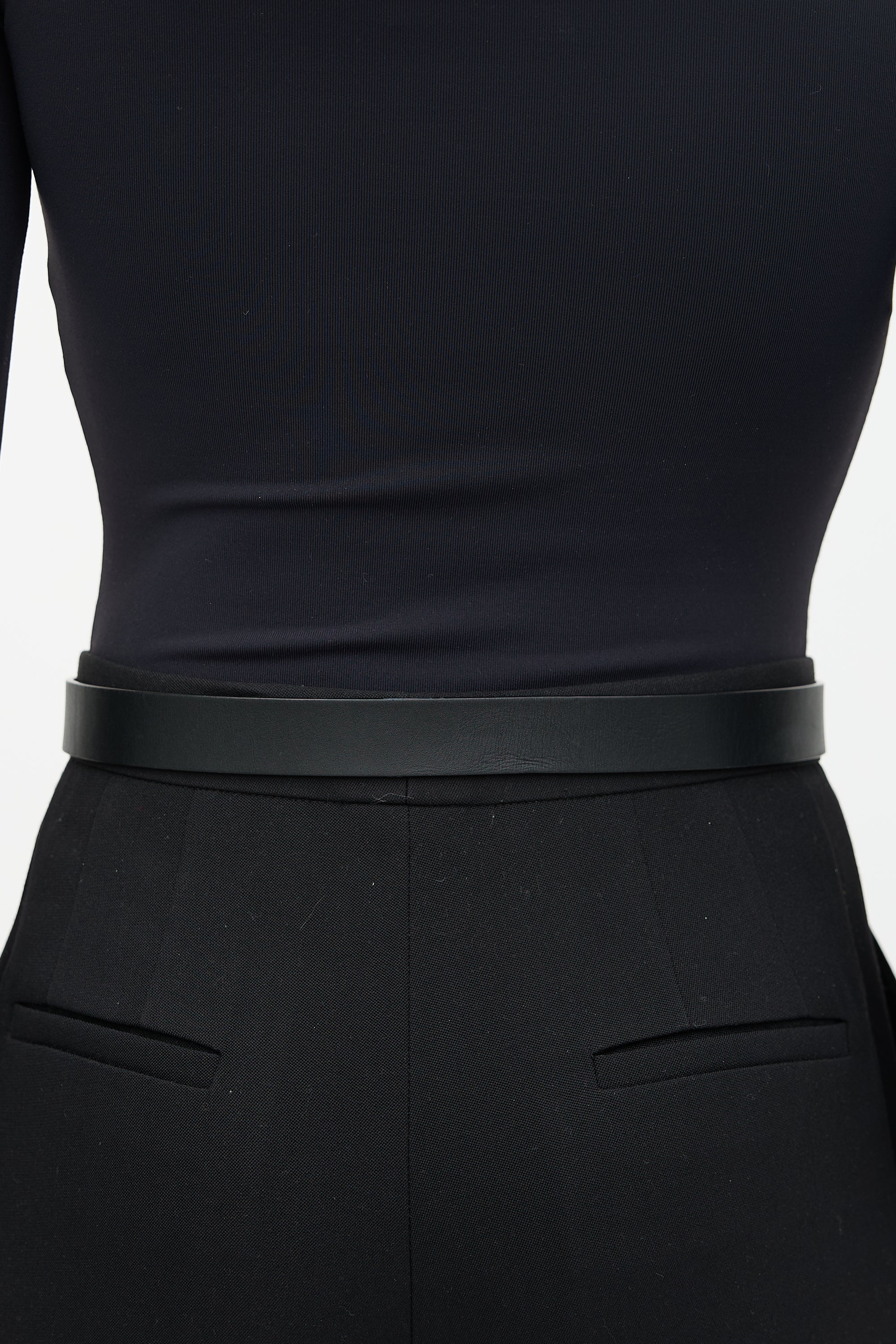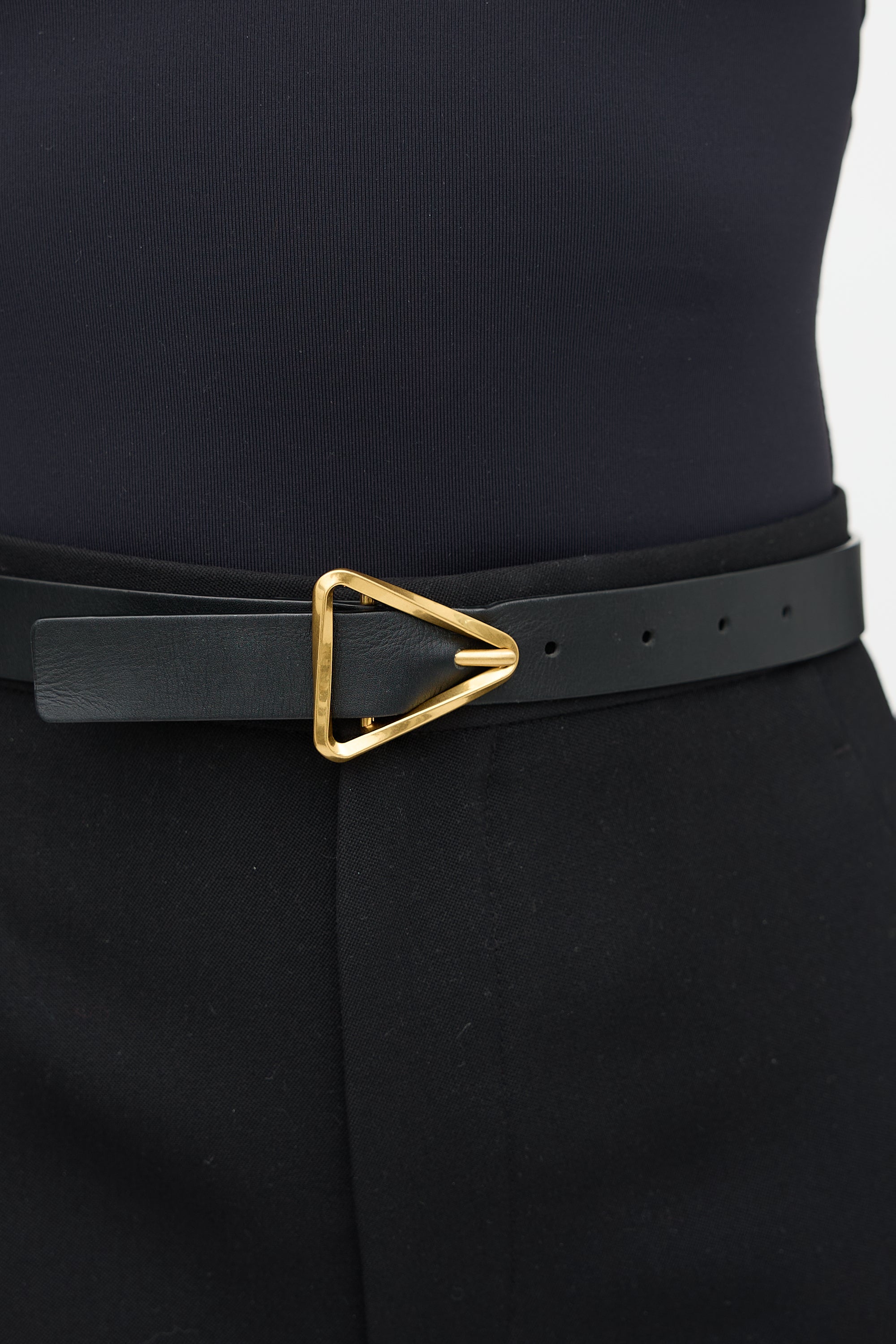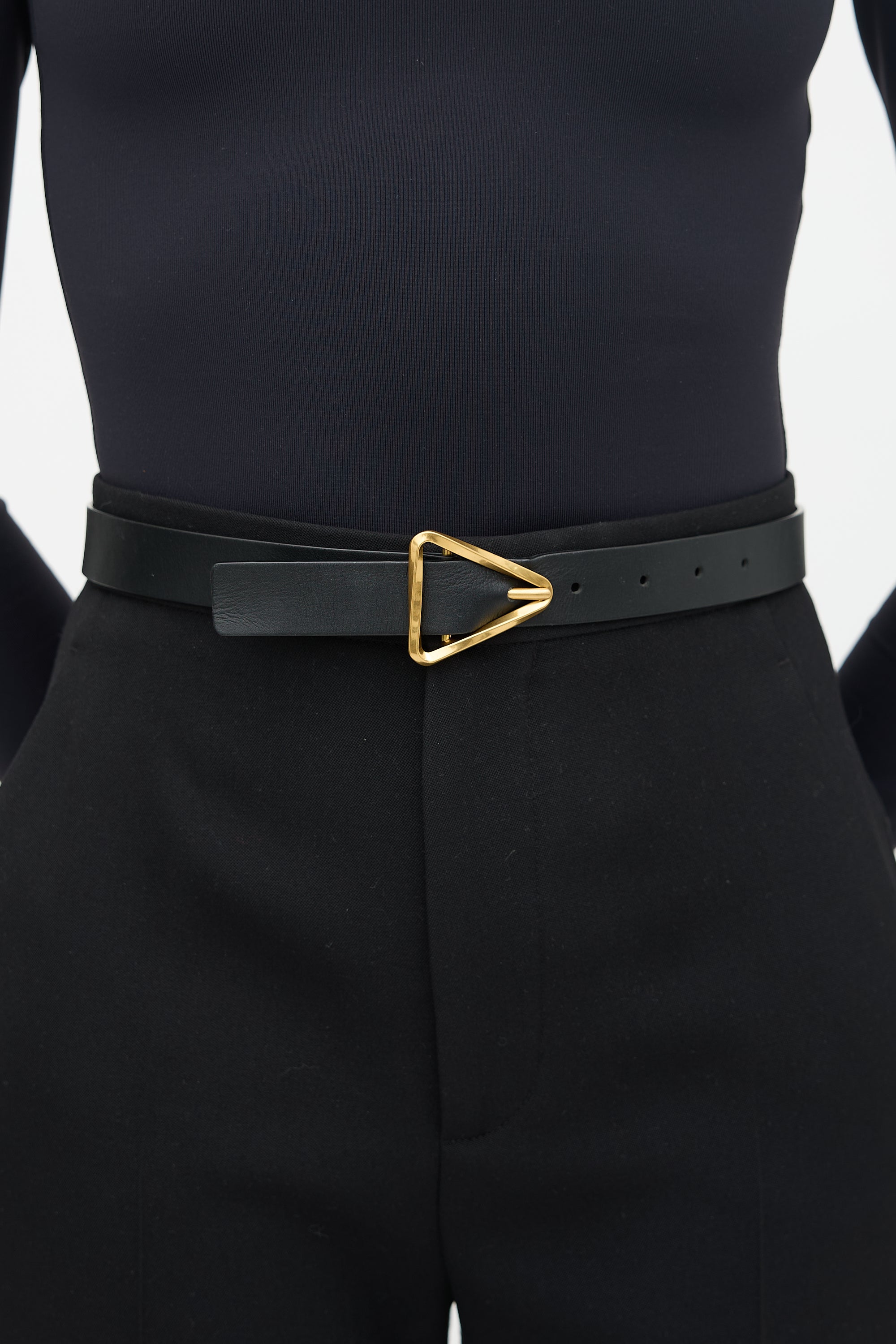 Pre-owned Bottega Veneta black leather belt featuring gold tone triangle buckle and stamped logo at reverse.