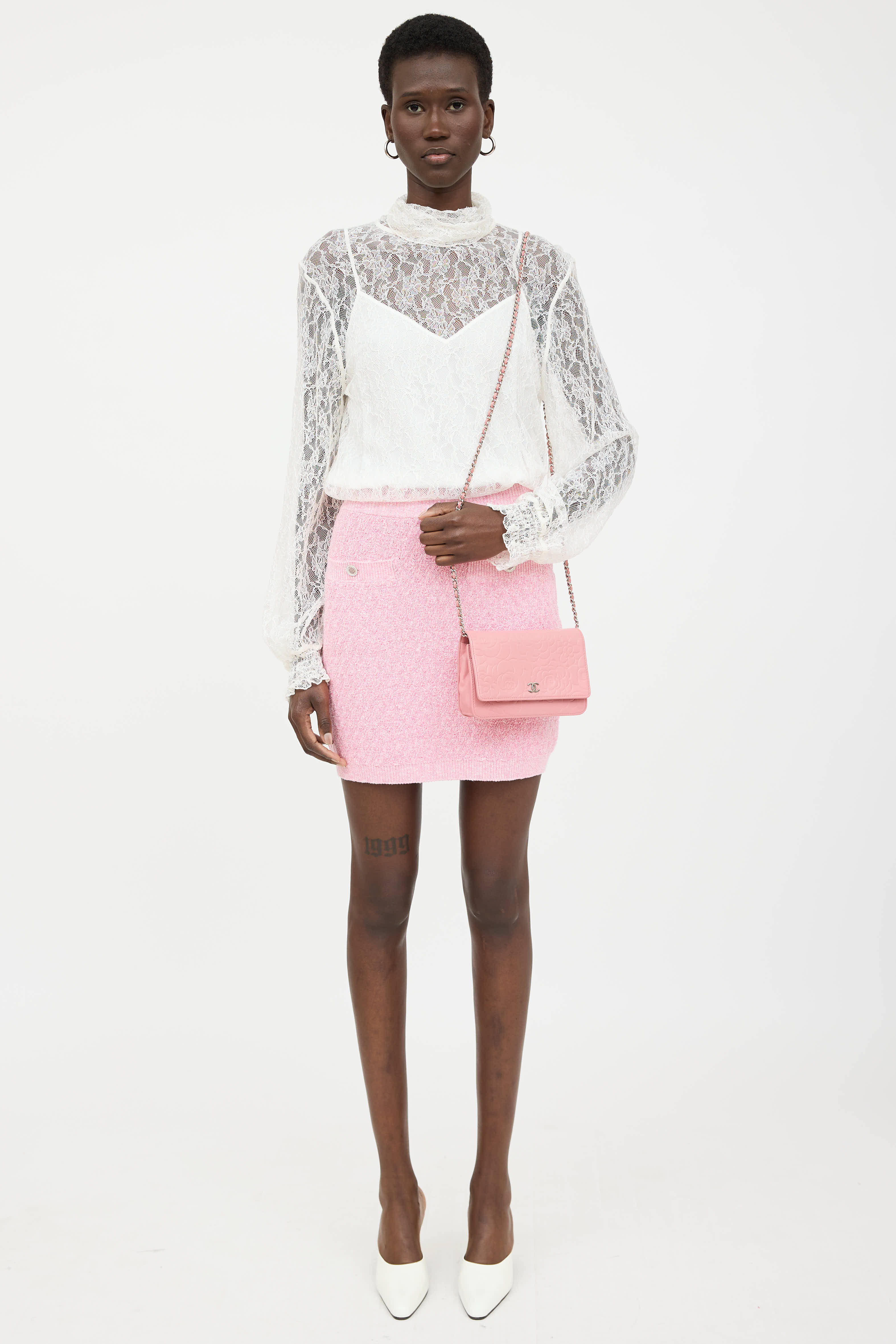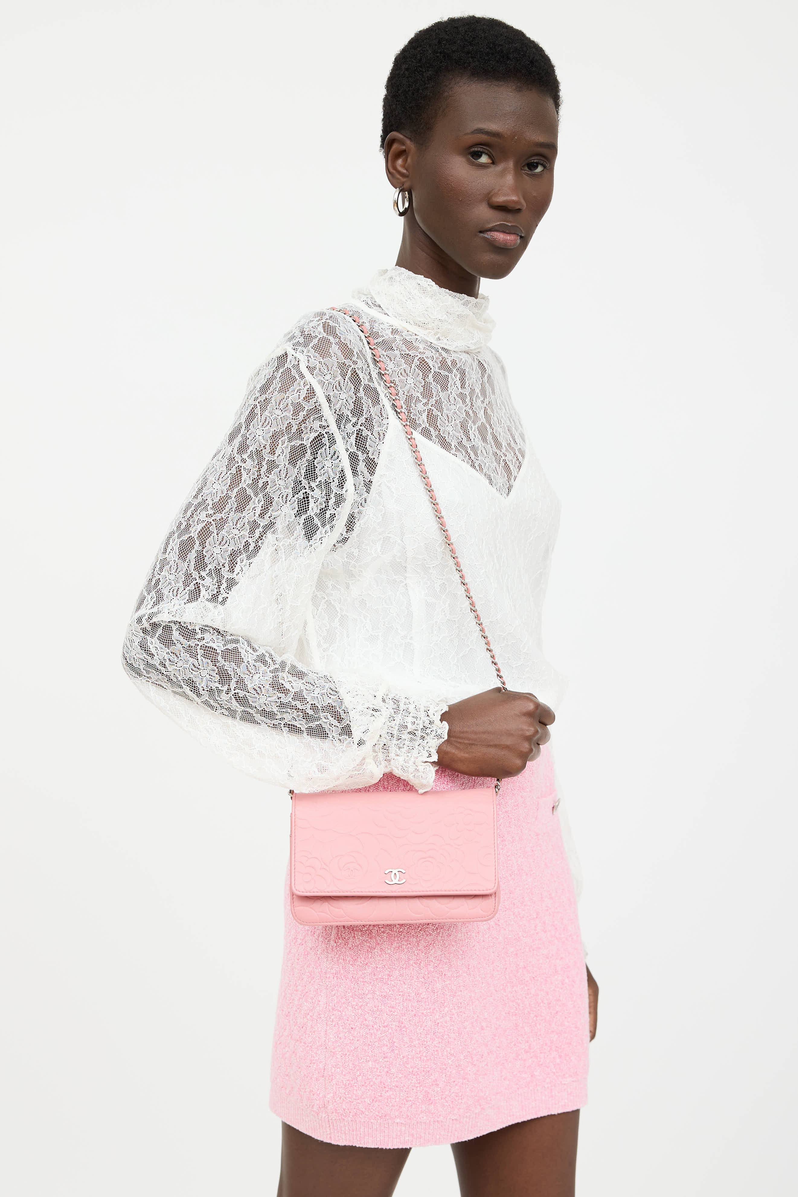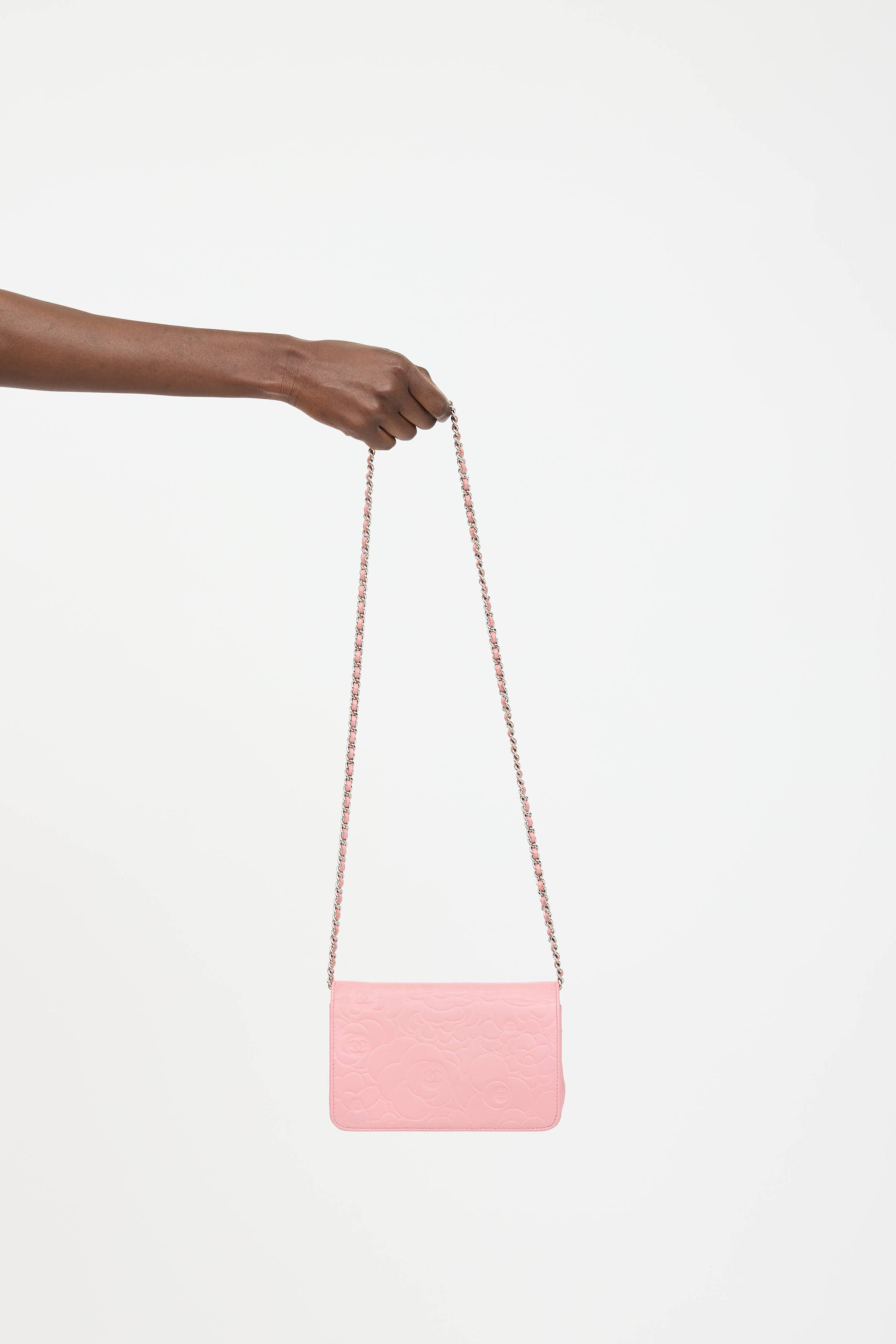 Pre-owned Chanel series 16 pink wallet on chain featuring braided leather and chain strap, silver tone hardware, embossed Camellia throughout, top flap with CC hardware at front, snap closure, one main compartment with two zip and slip interior pockets, and six card slots. From the 2012 Collection by Karl Lagerfeld.