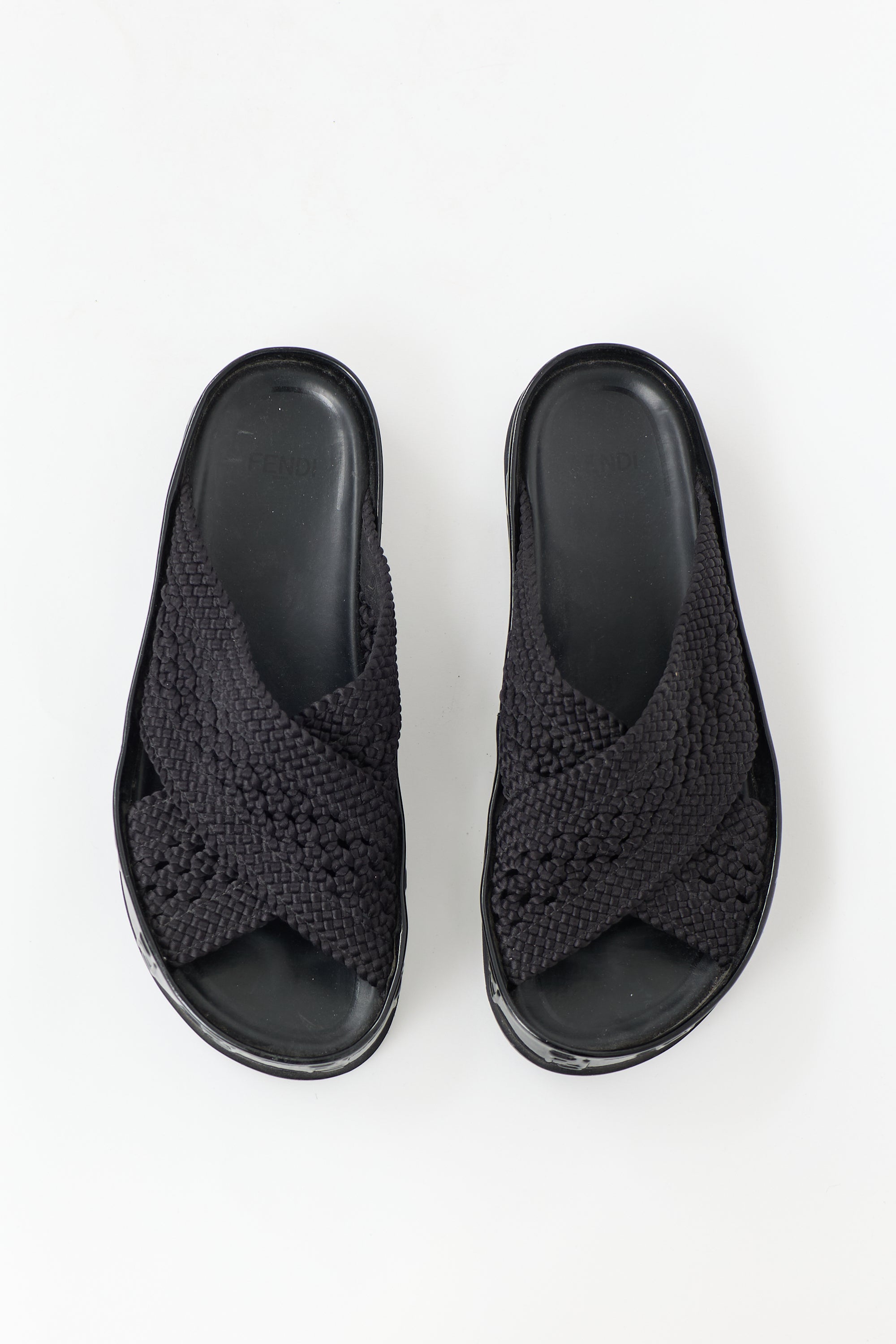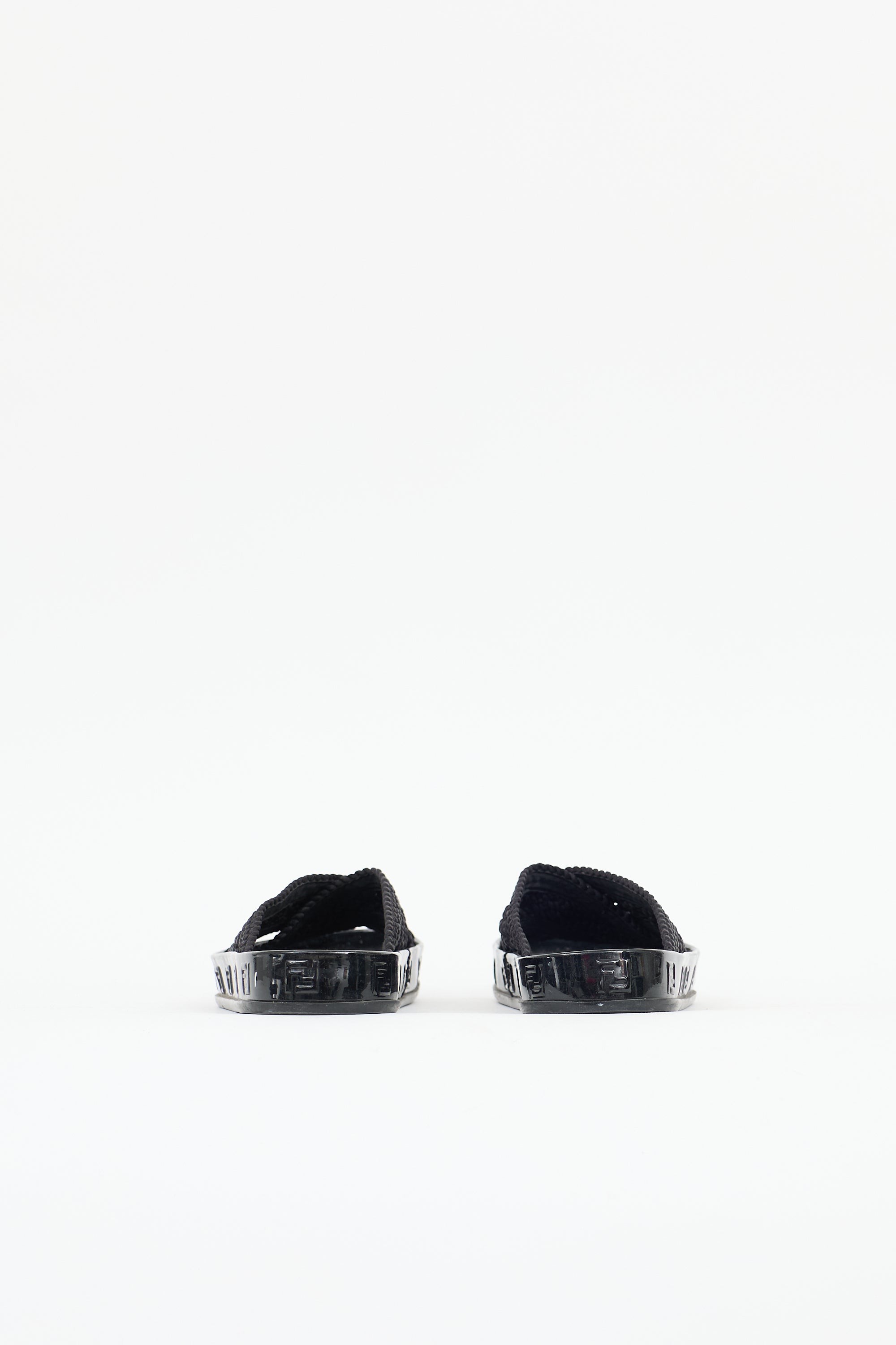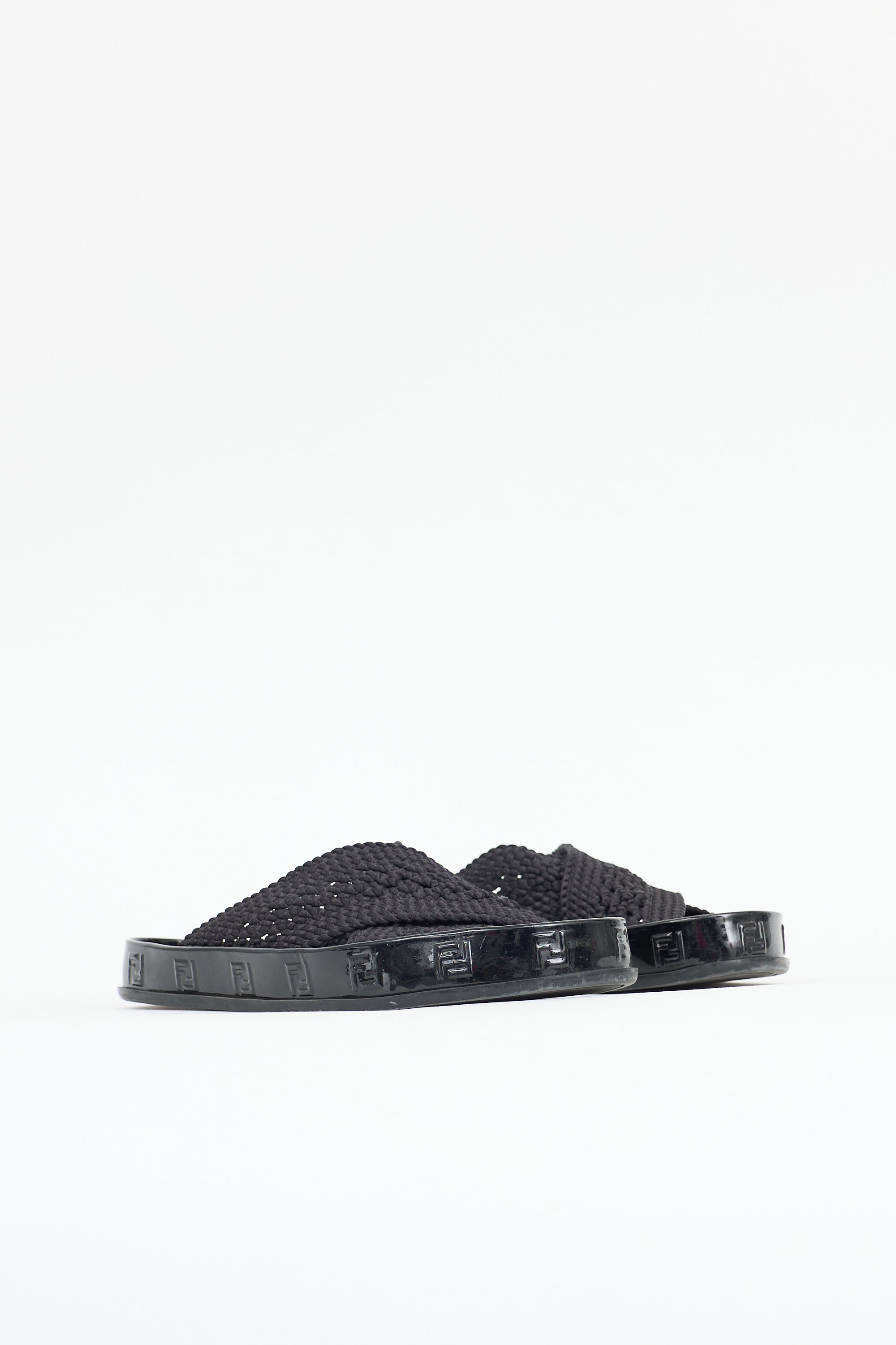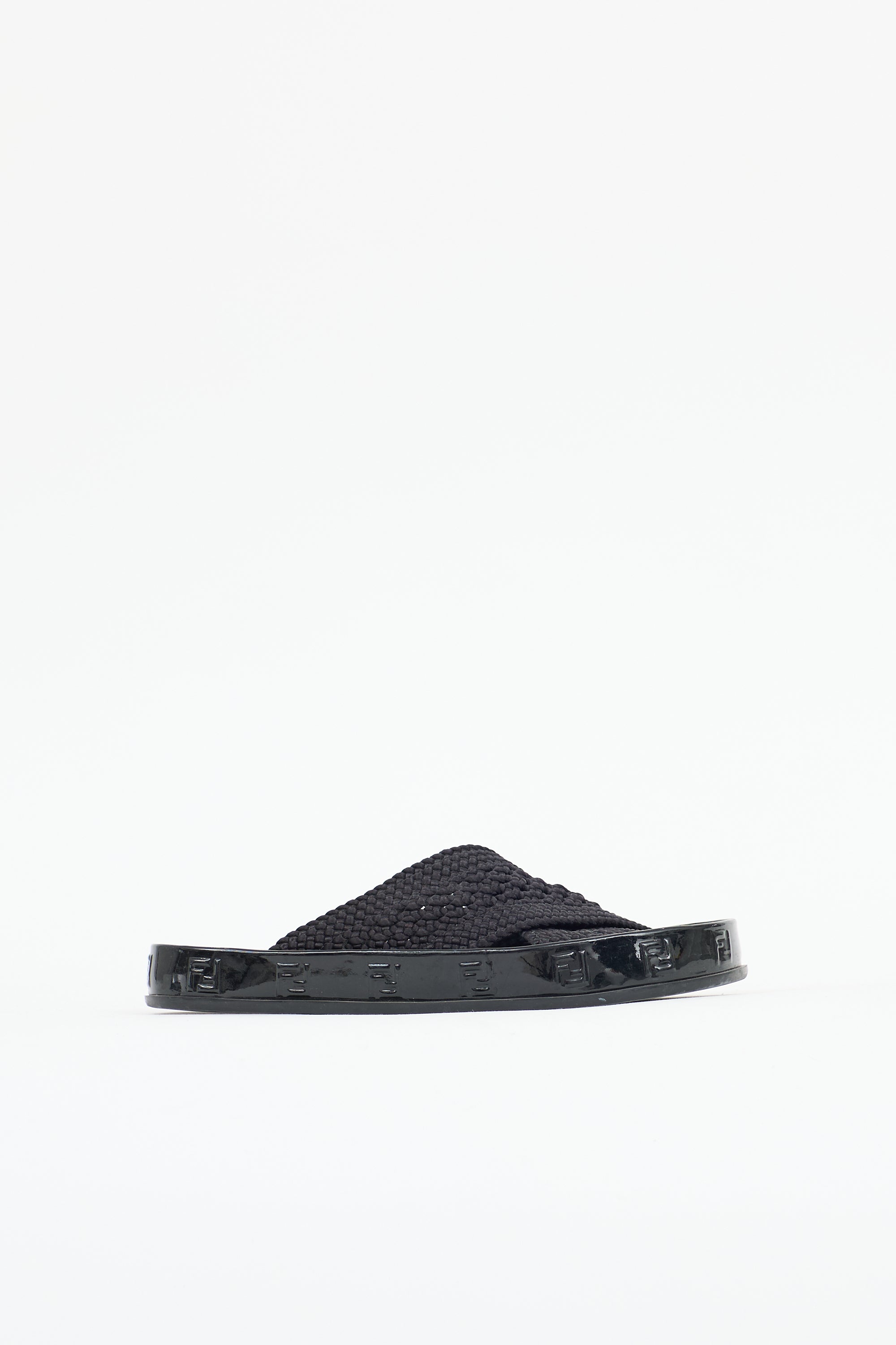 Pre-owned Fendi black patent leather Reflection slides featuring an open rounded toe, crochet criss cross straps at vamp, slip on entry, and embossed FF logo trim.