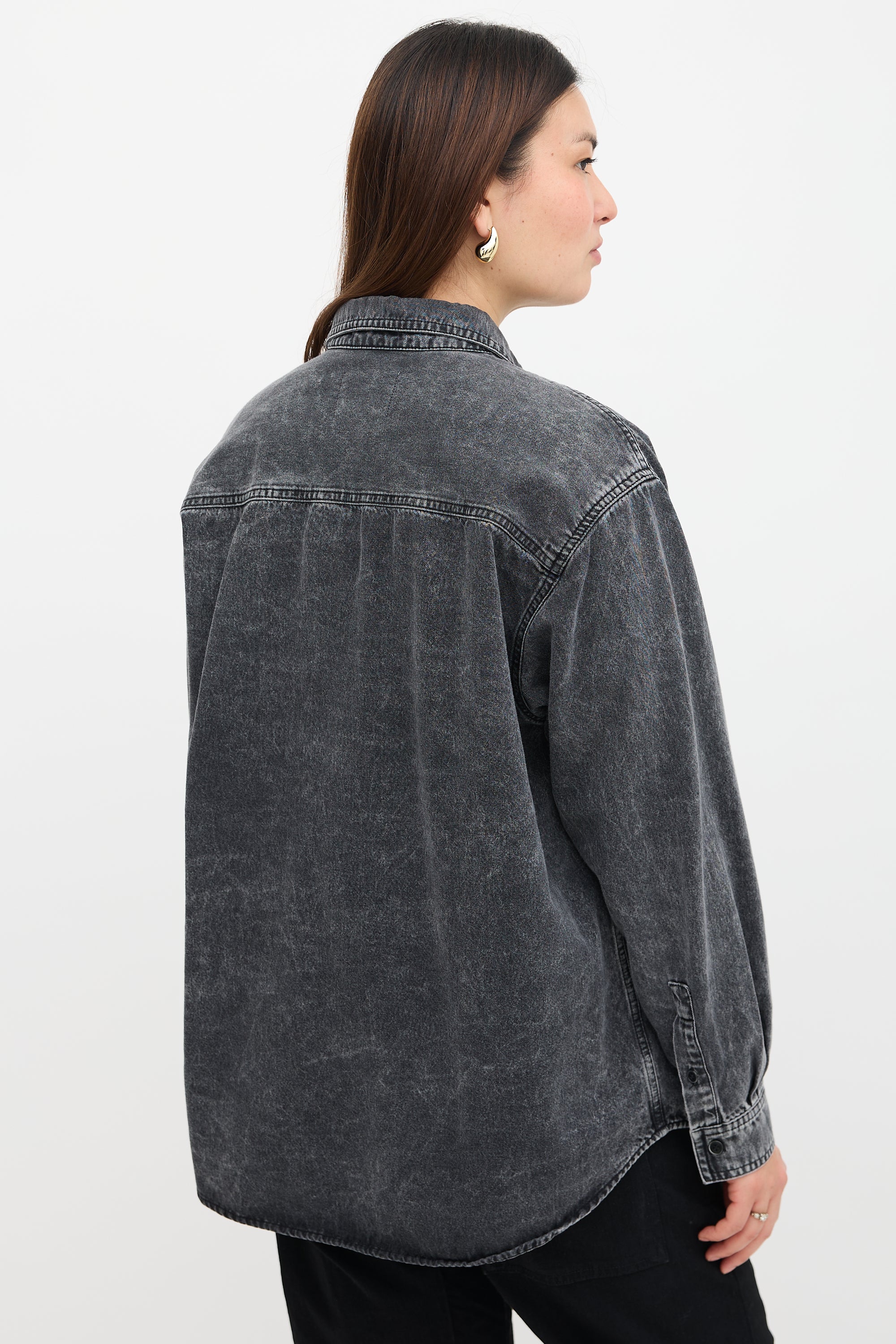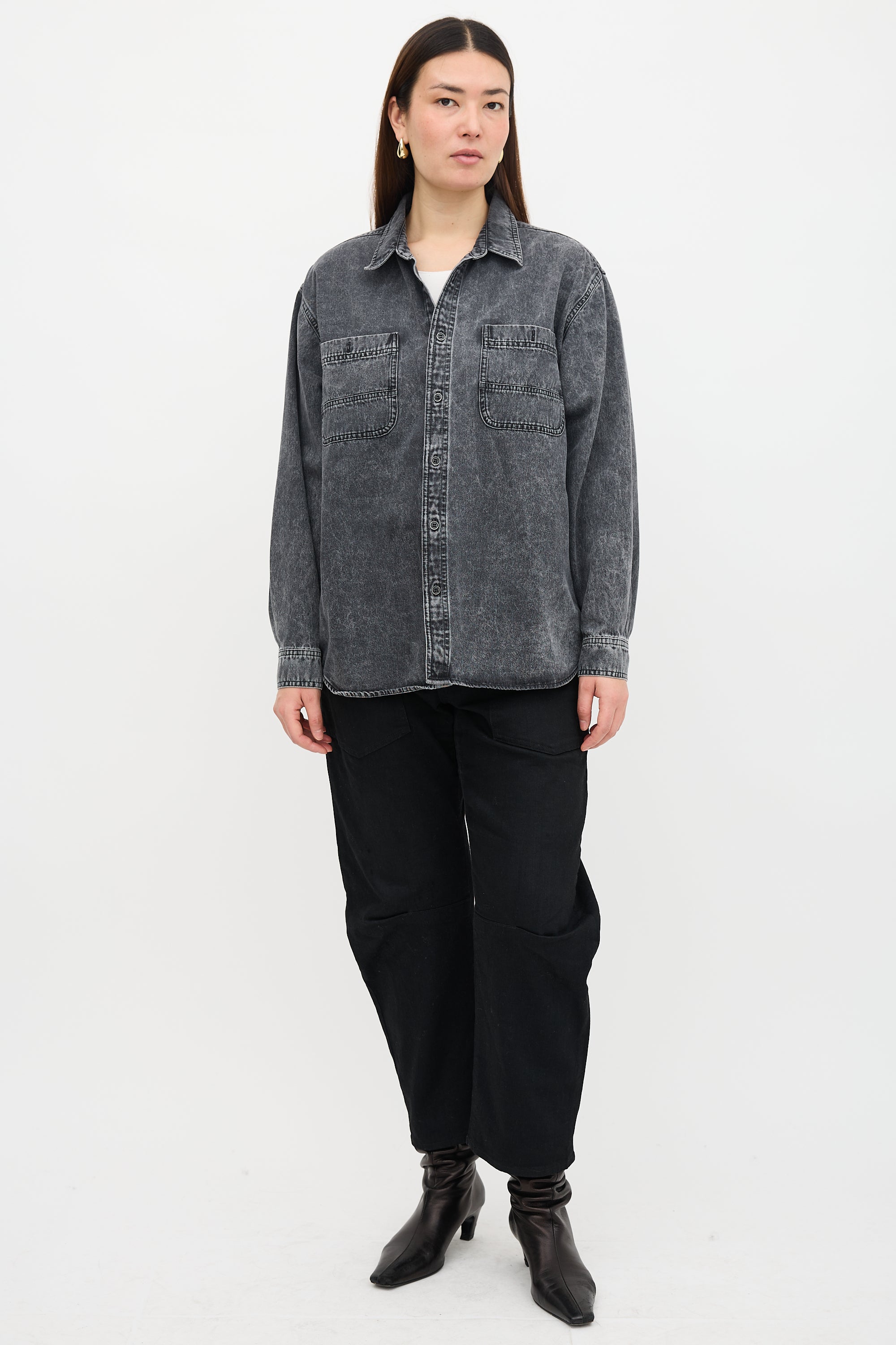 Pre-owned Isabel Marant black washed denim Vhelynton shirt featuring a point collar, button front, two patch pockets at chest, and buttoned cuffs.