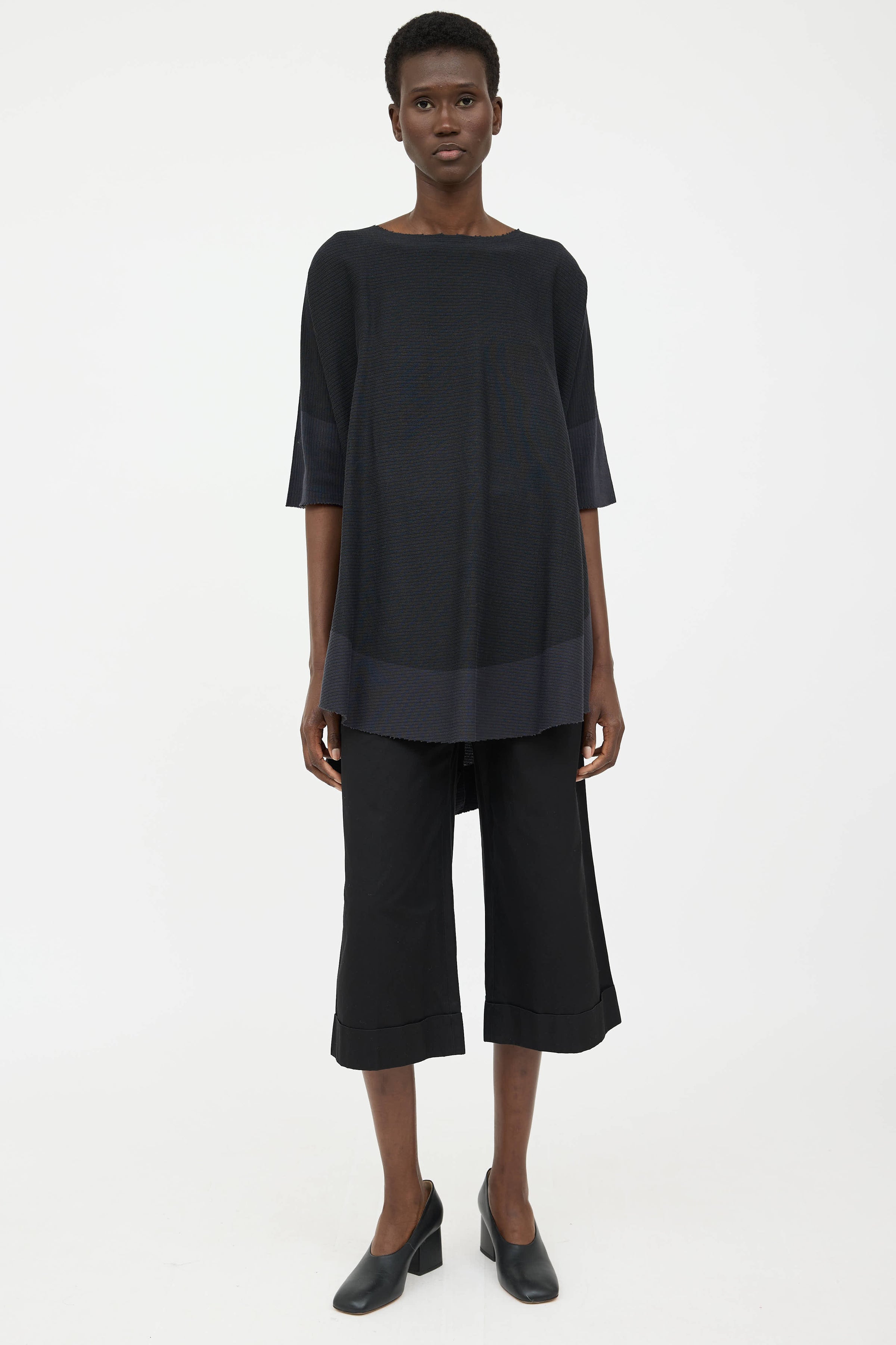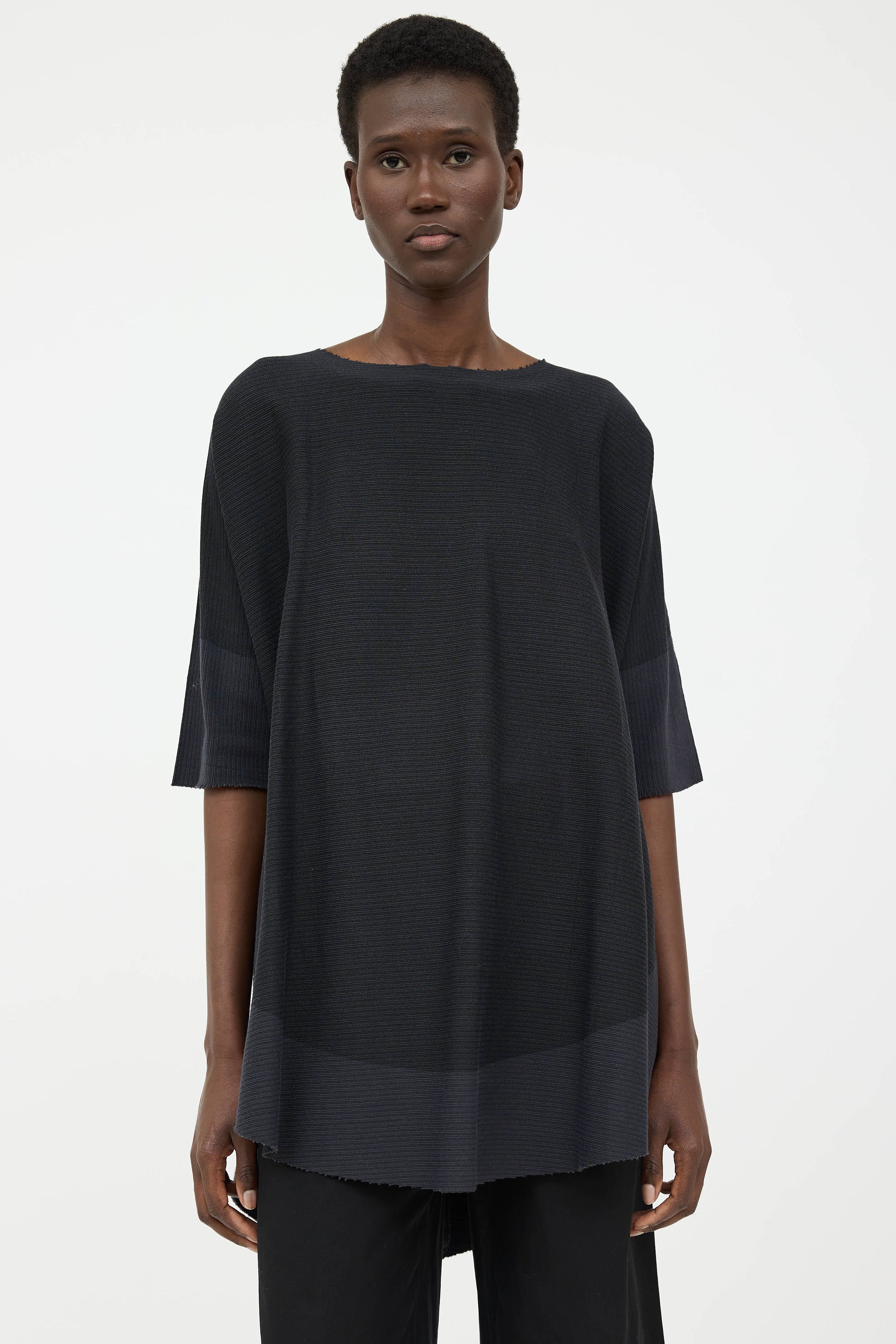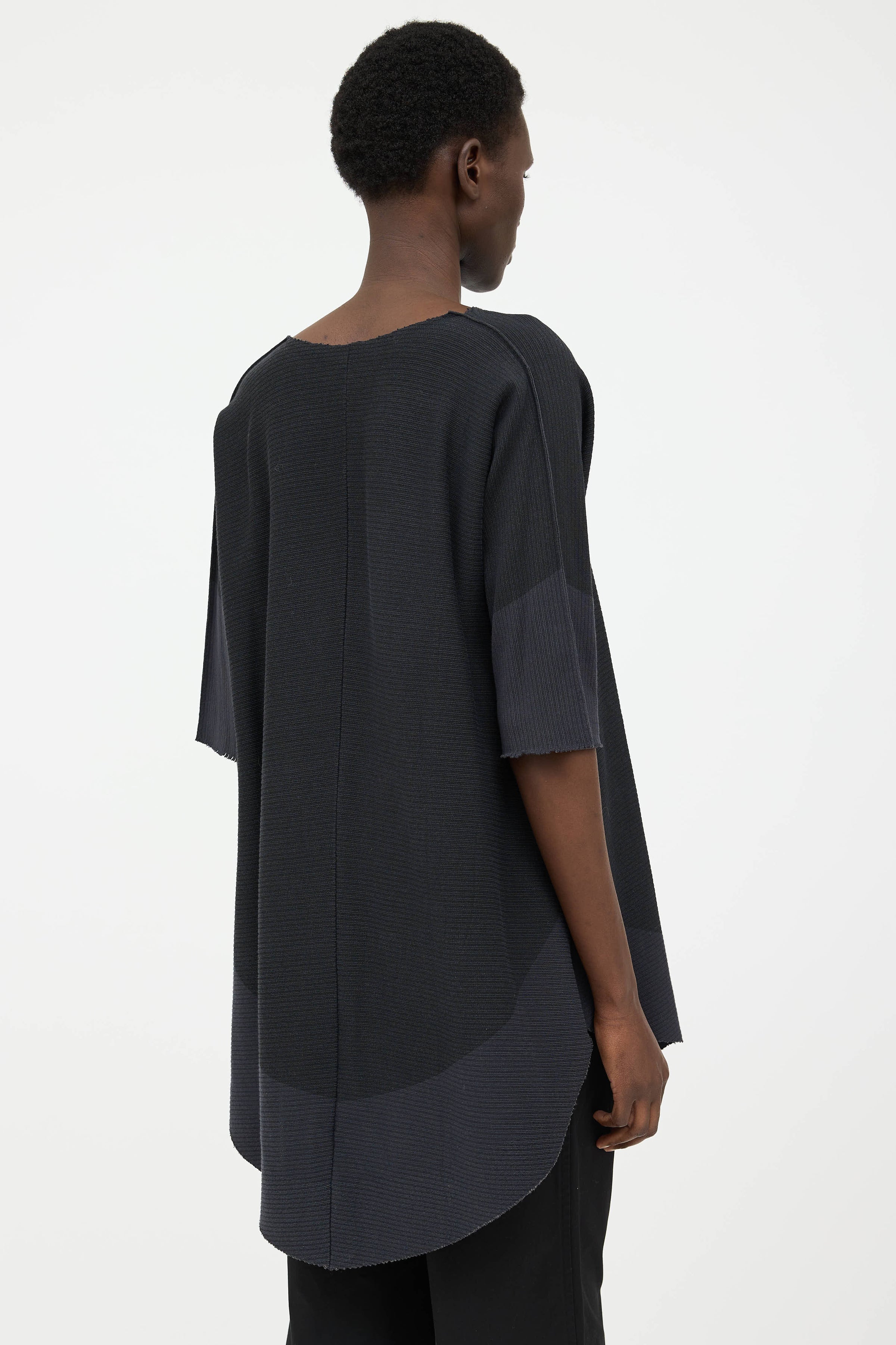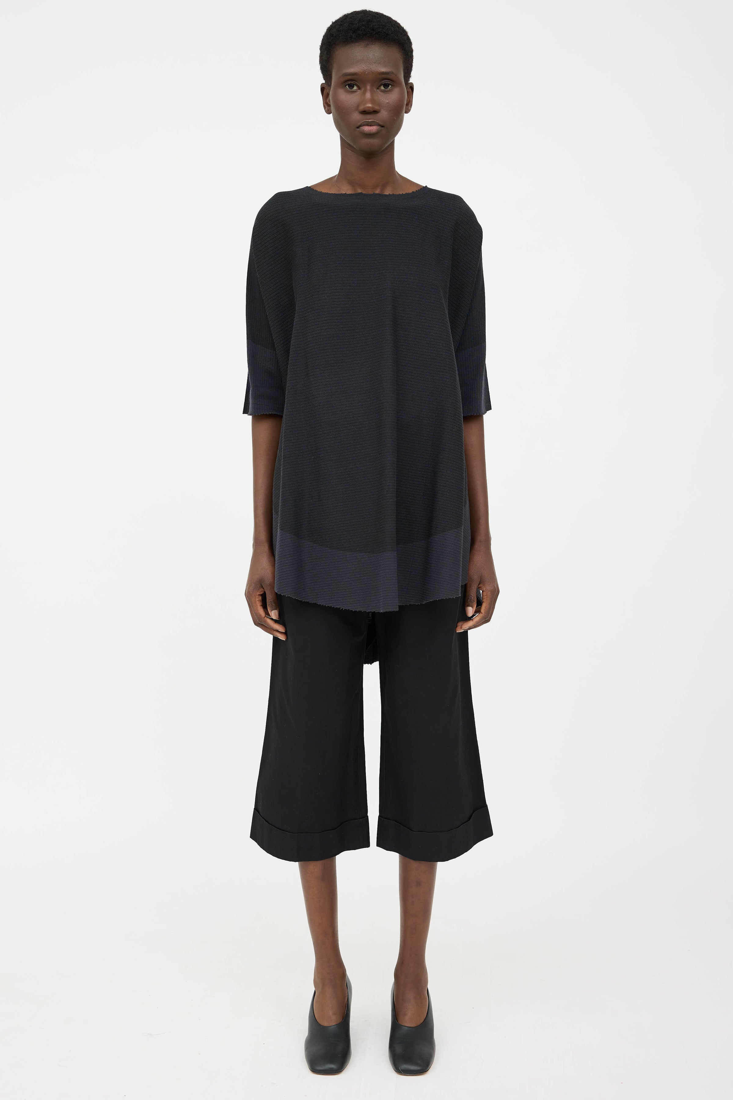 Pre-owned Issey Miyake black pleated top featuring round neckline, half sleeves, and an asymmetrical raw hemline.