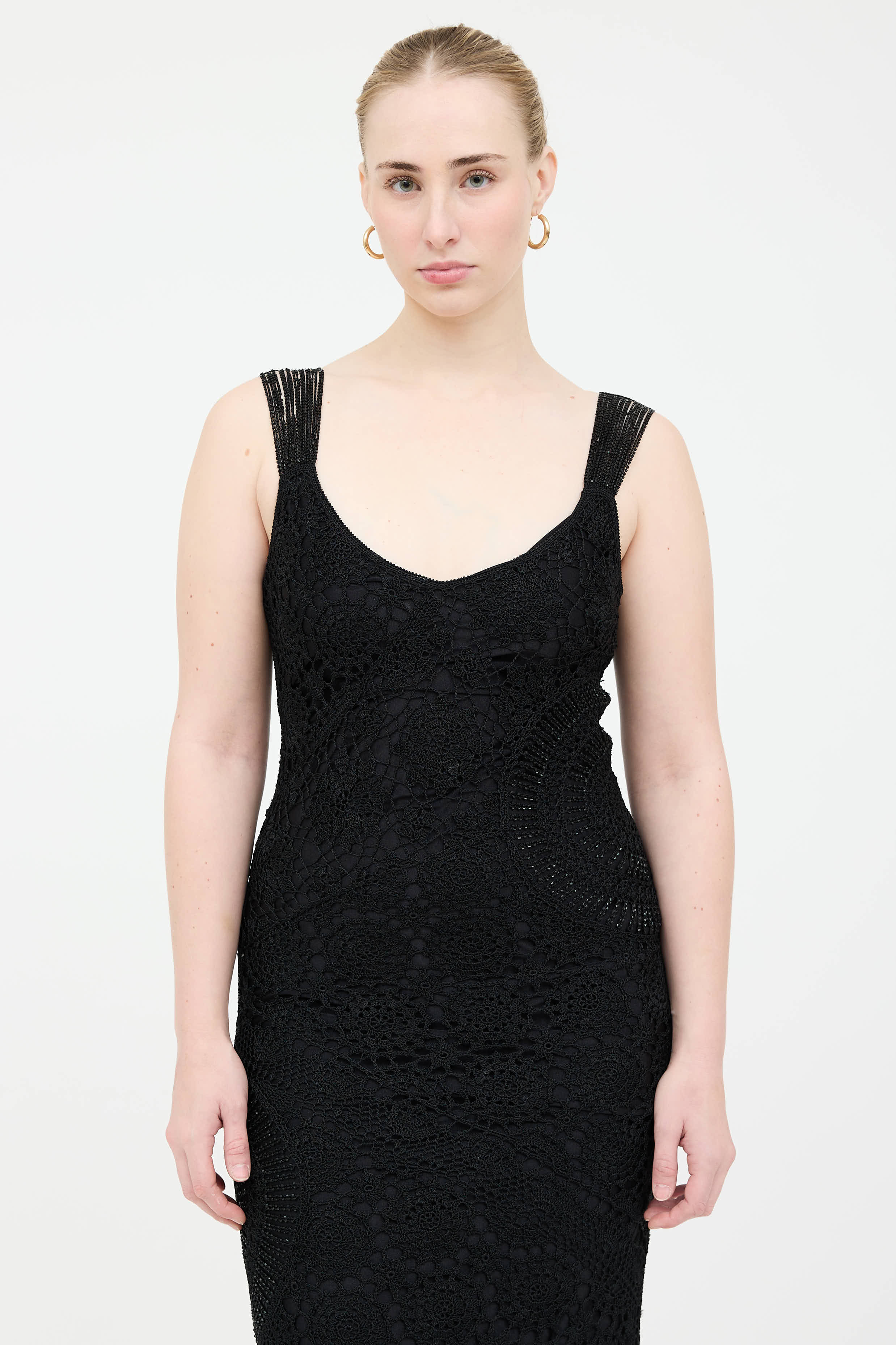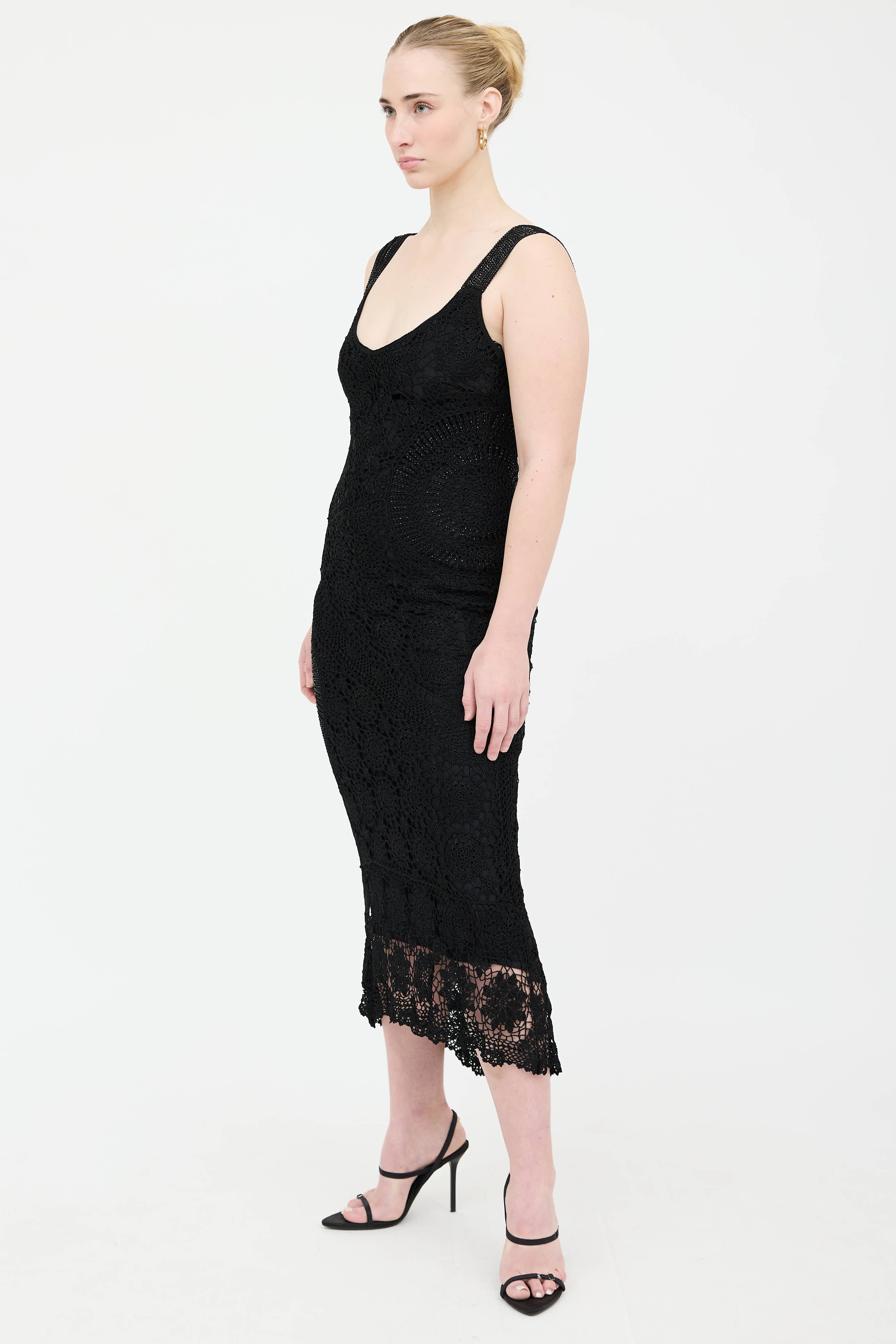 Pre-owned Karen Millen black sleeveless dress featuring v-neckline, beaded shoulders and embellishments, and crochet throughout. Lined.