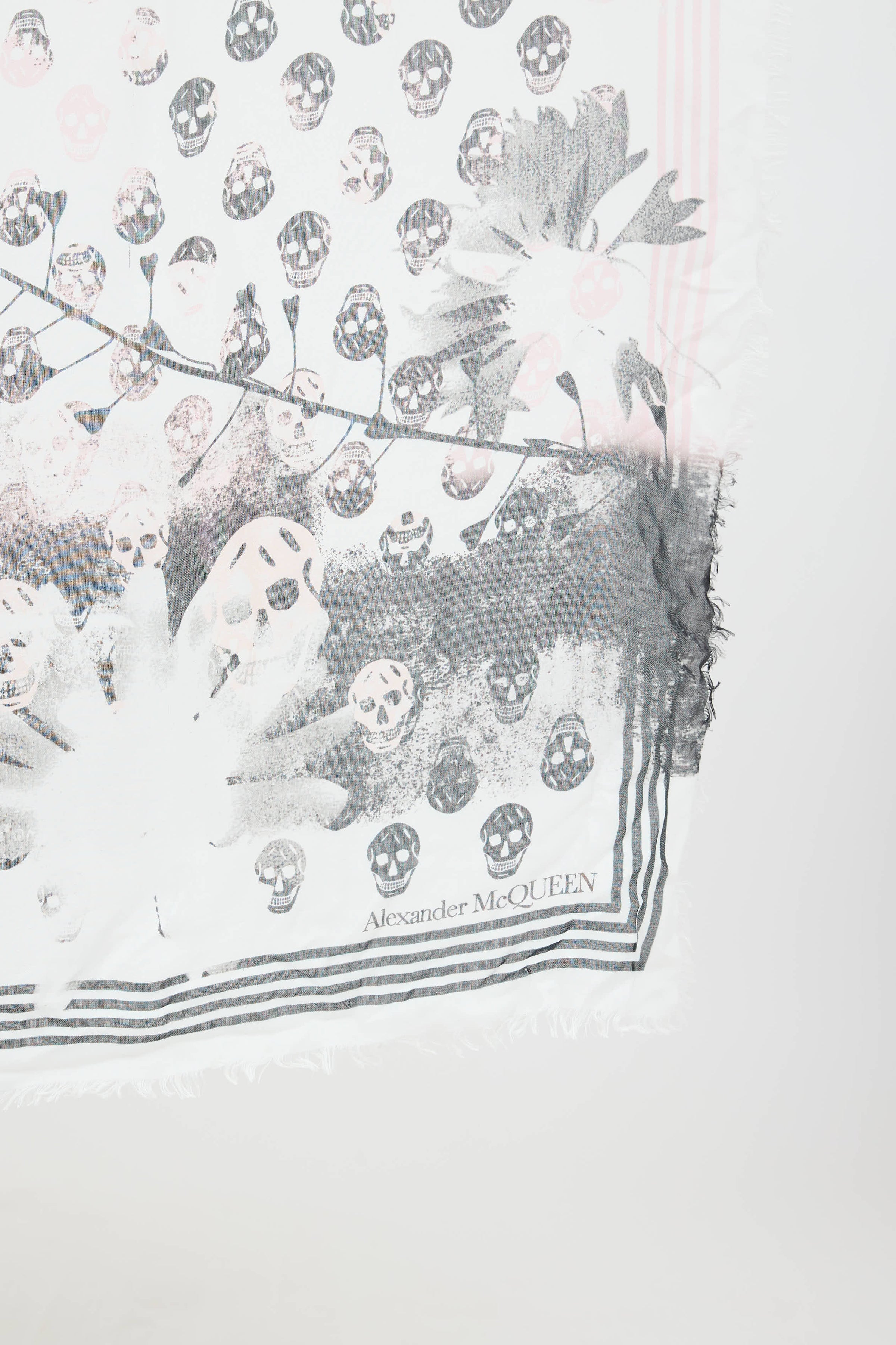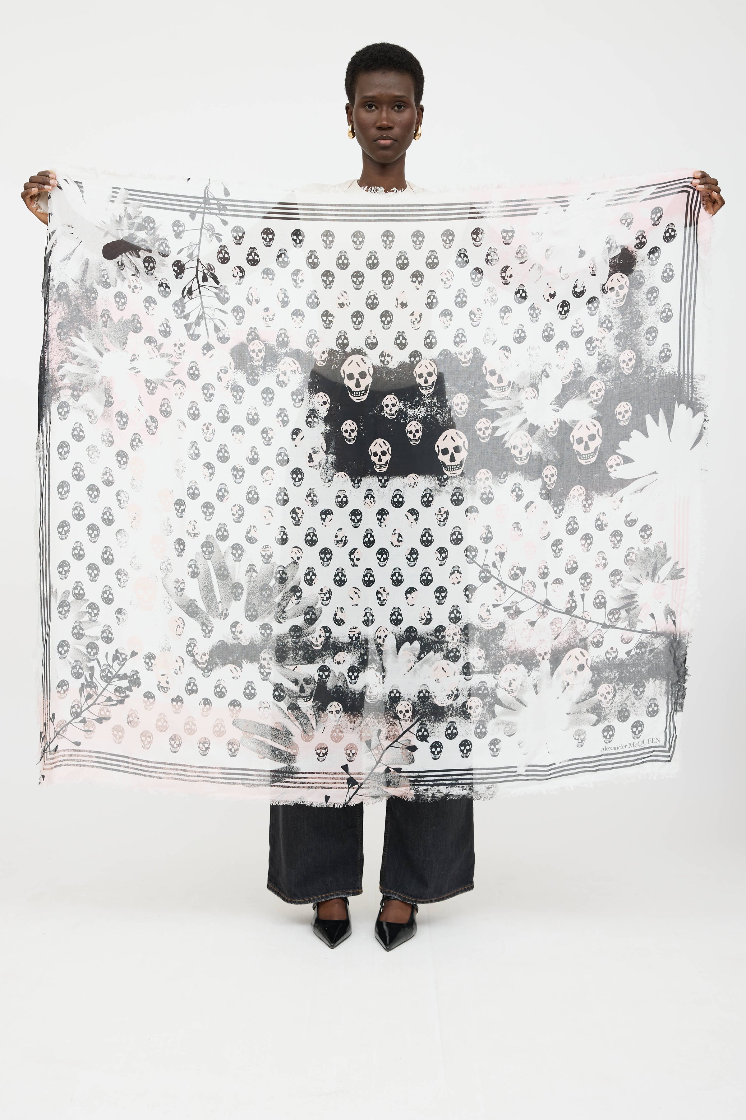 Pre-owned Alexander McQueen white, black and pink Solarized scarf featuring signature skull print, logo at bottom corner, and fringed edges.