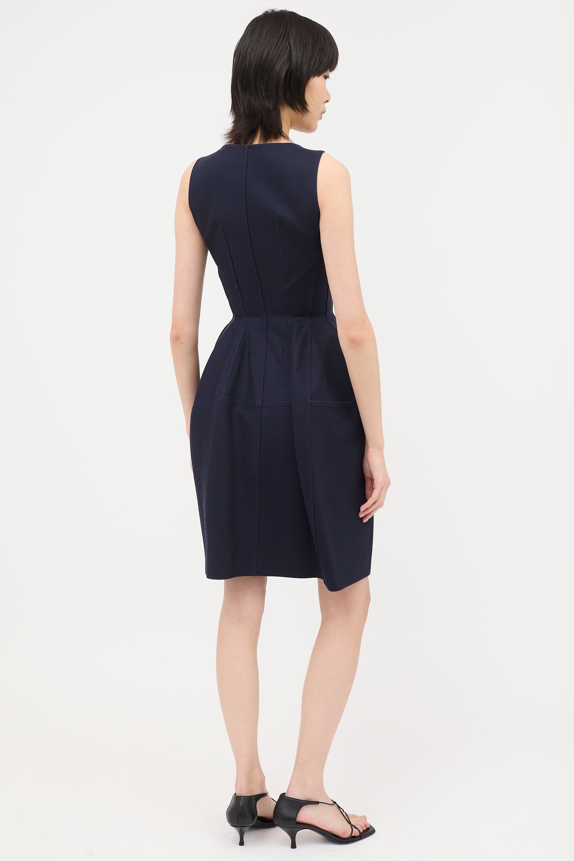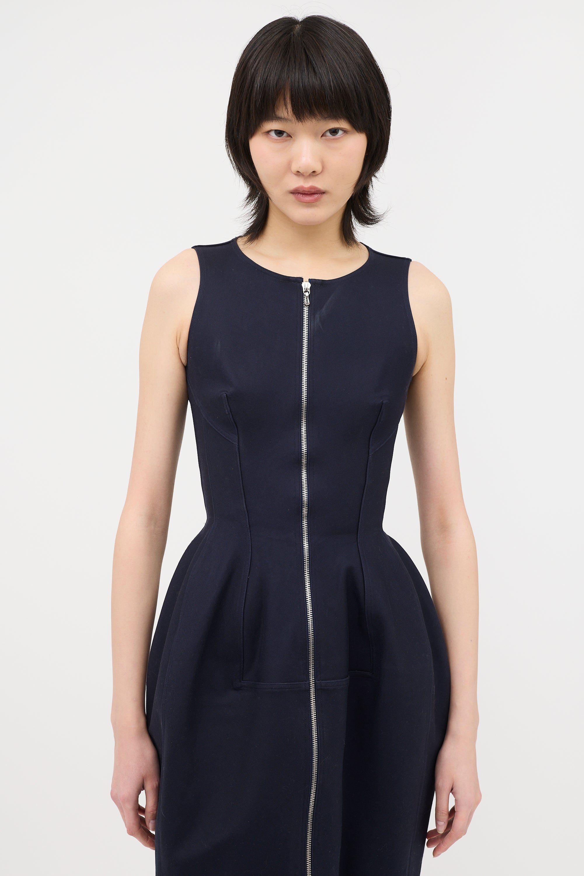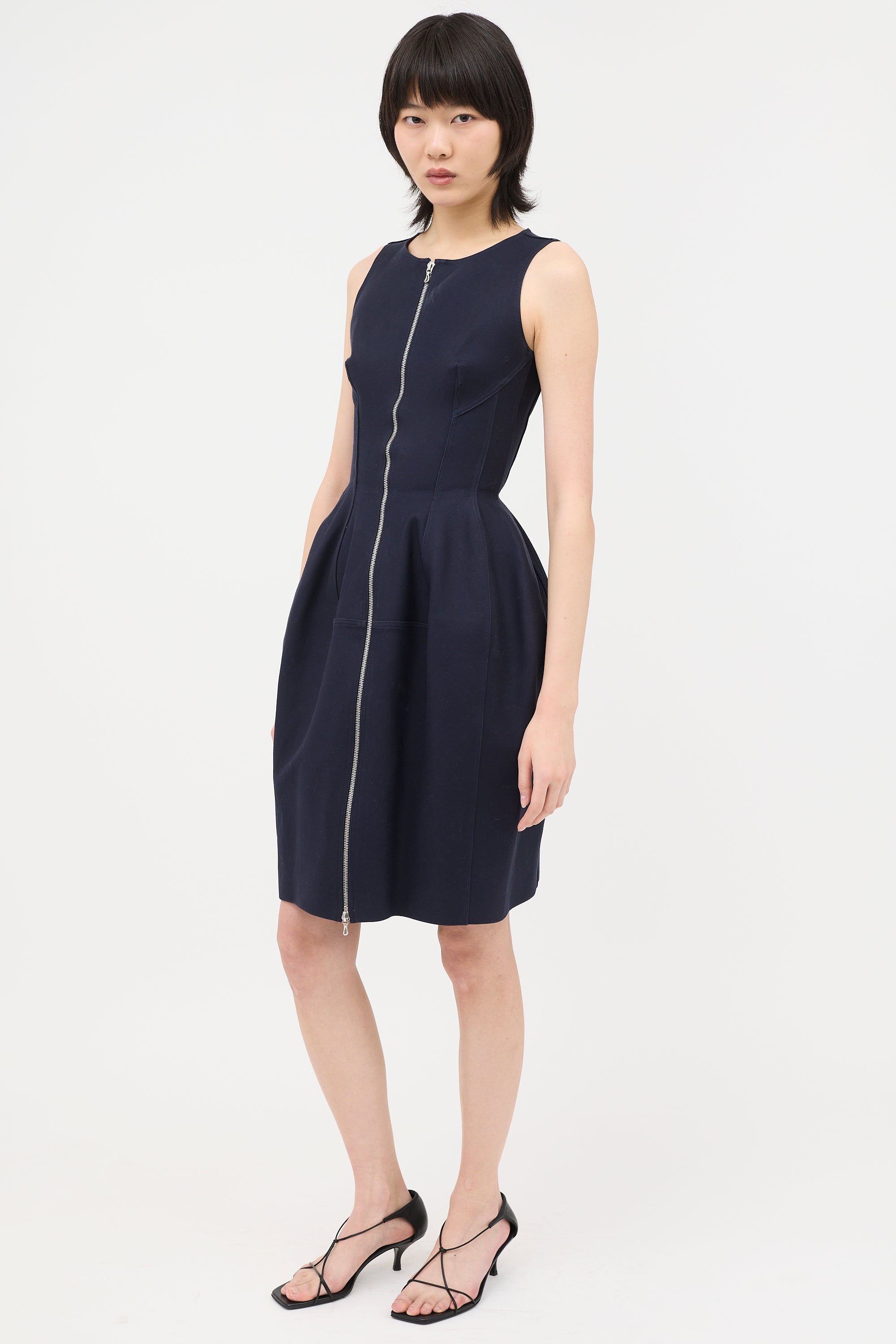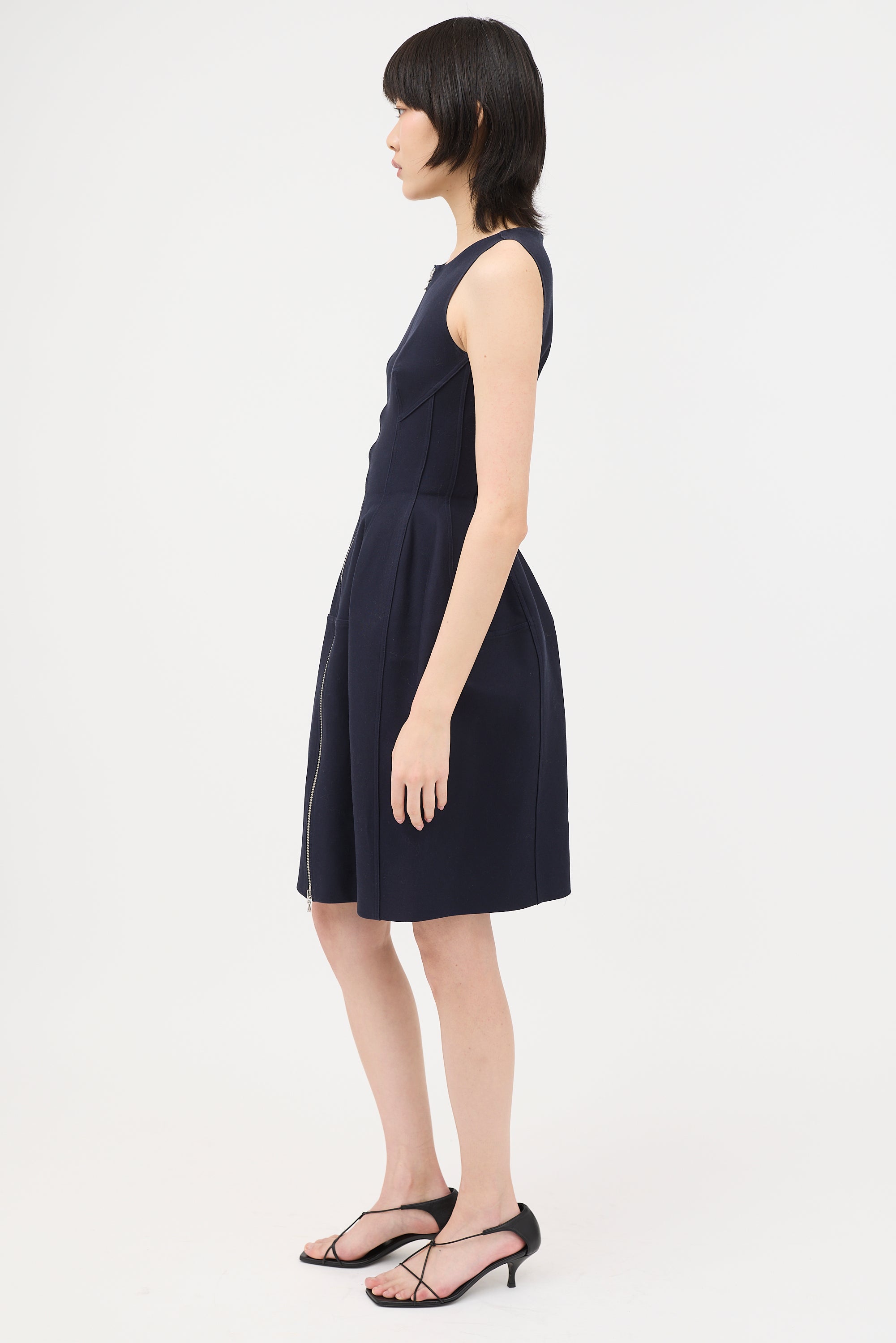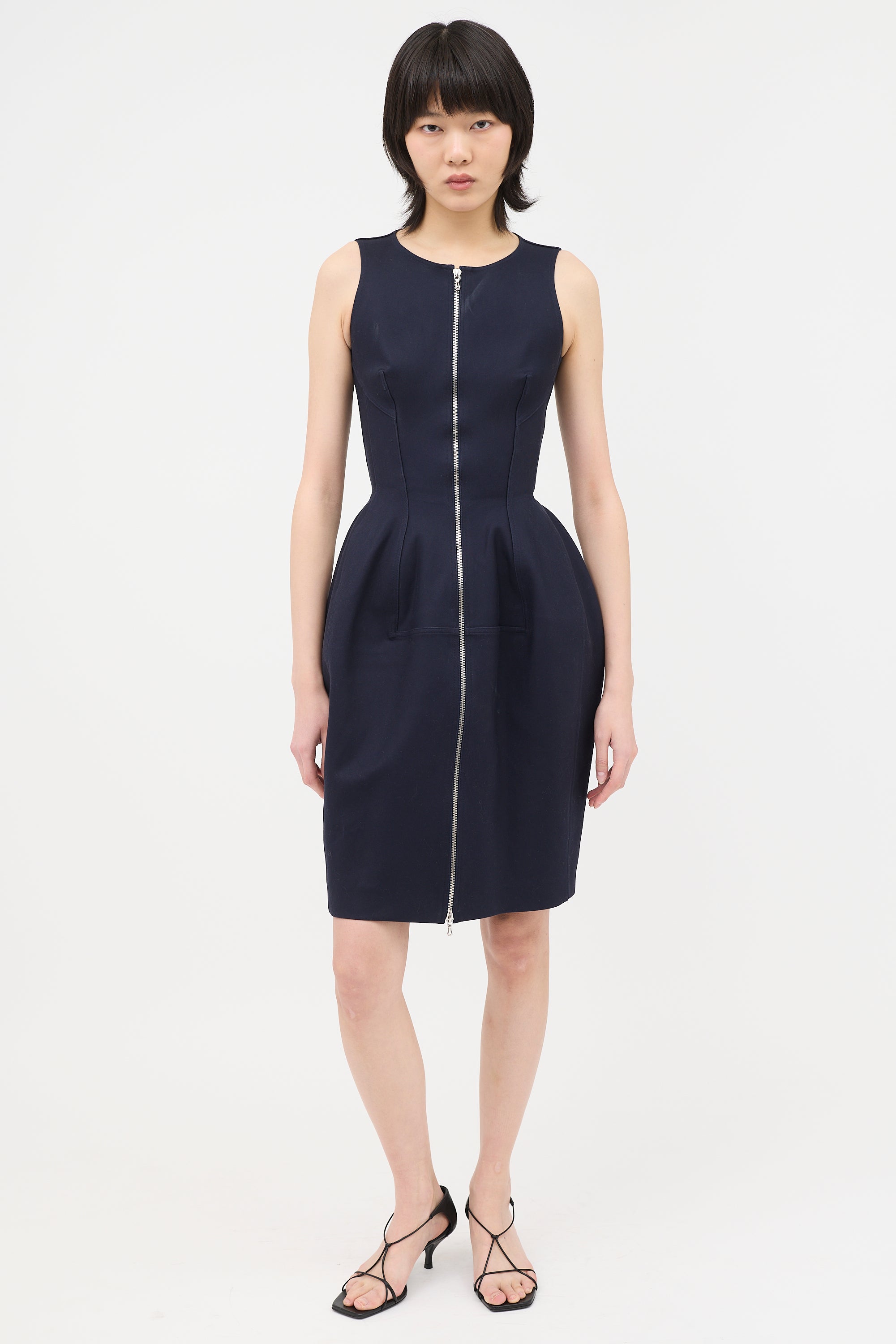 Pre-owned Alaïa navy sleeveless midi dress featuring round neckline, tailored bodice, and double zip front.