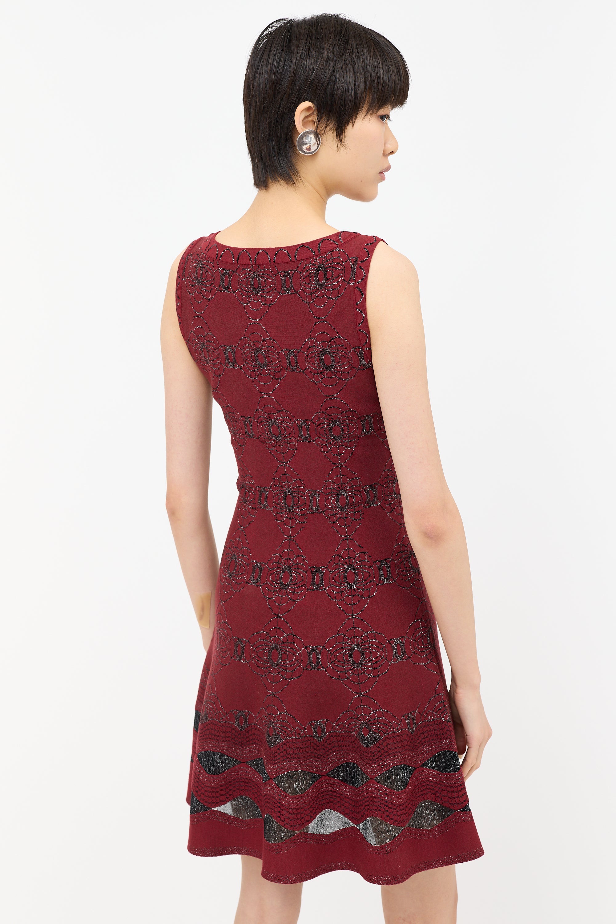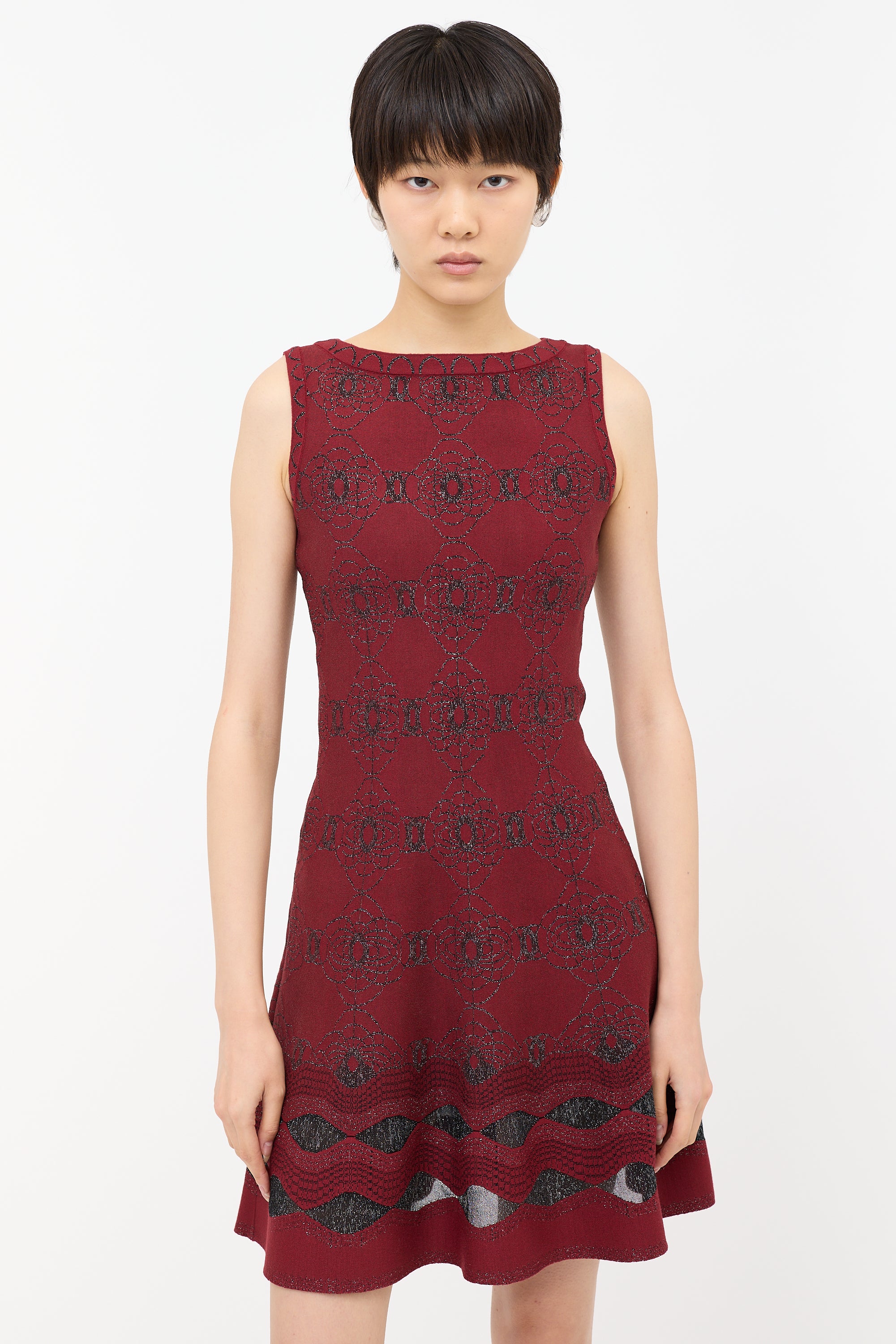 Pre-owned Alaïa red A-line mini dress featuring a bateau neckline, side zip closure, and silver metallic threaded floral jacquard.