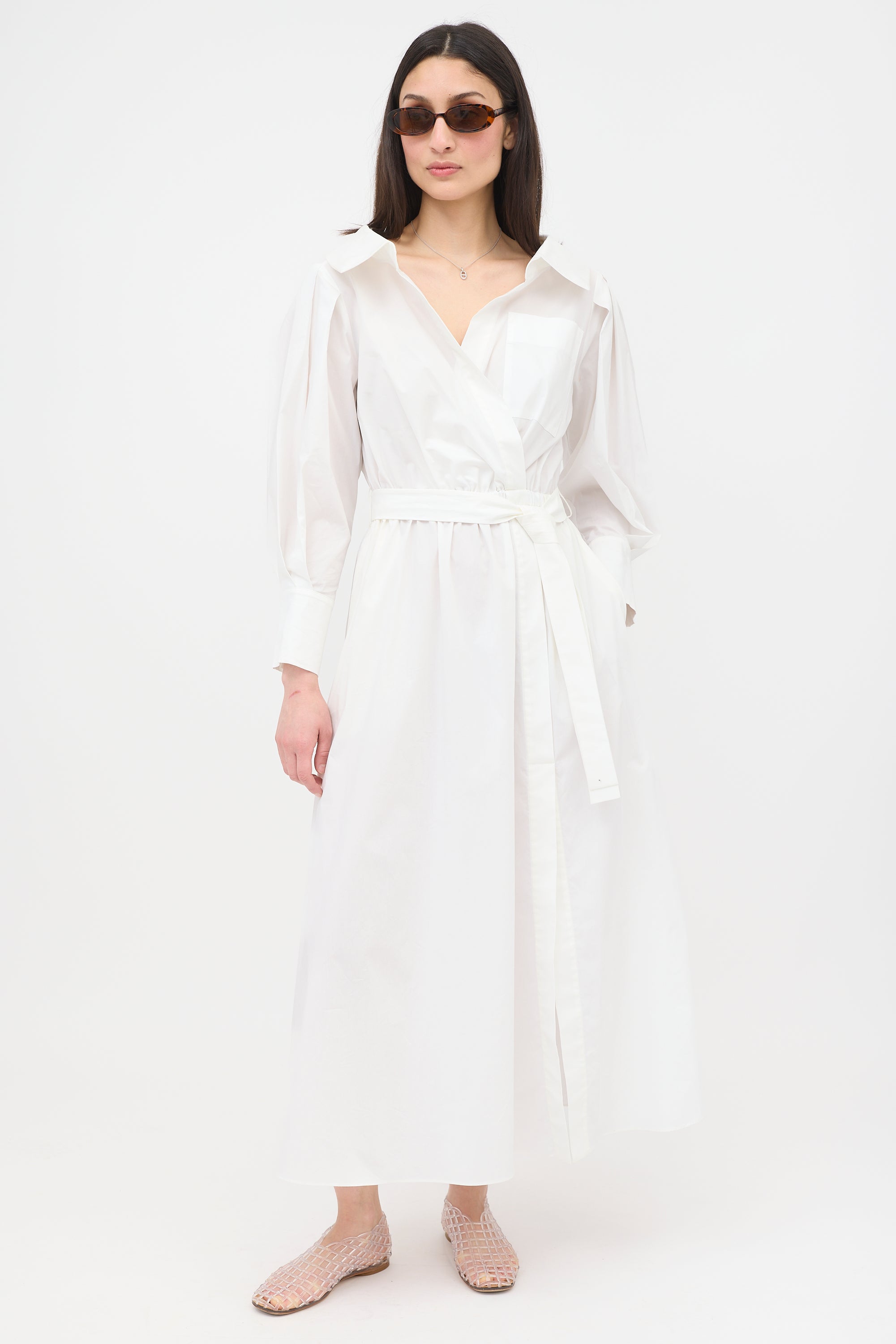 Pre-owned Altuzarra optic white cotton poplin Lyddy midi dress featuring wide collar, surplice neckline, patch pocket at left chest, elasticized waist, tie belt, faux wrap front, in seam pockets, pleated back yoke and shoulders, and buttoned cuffs.