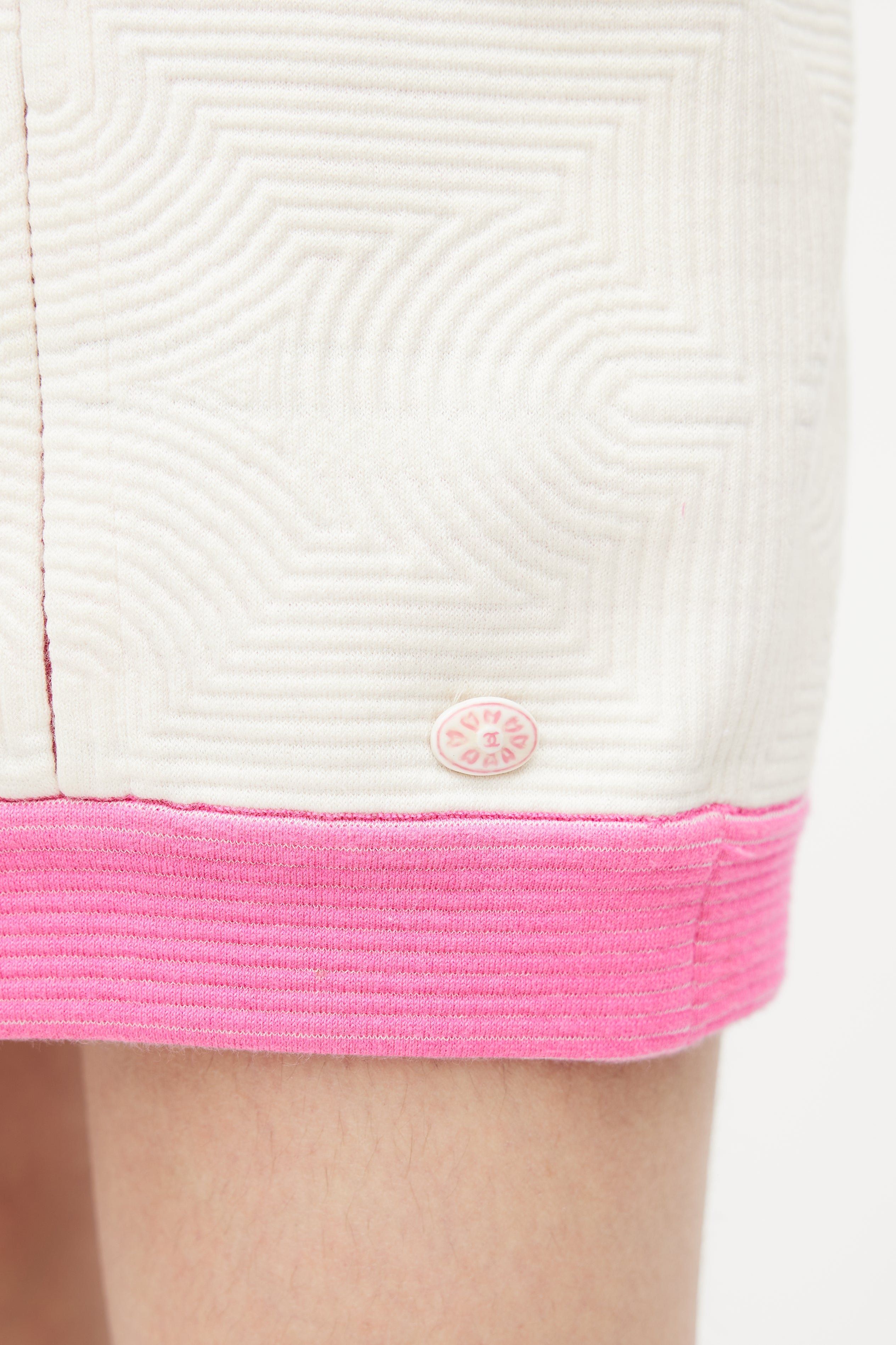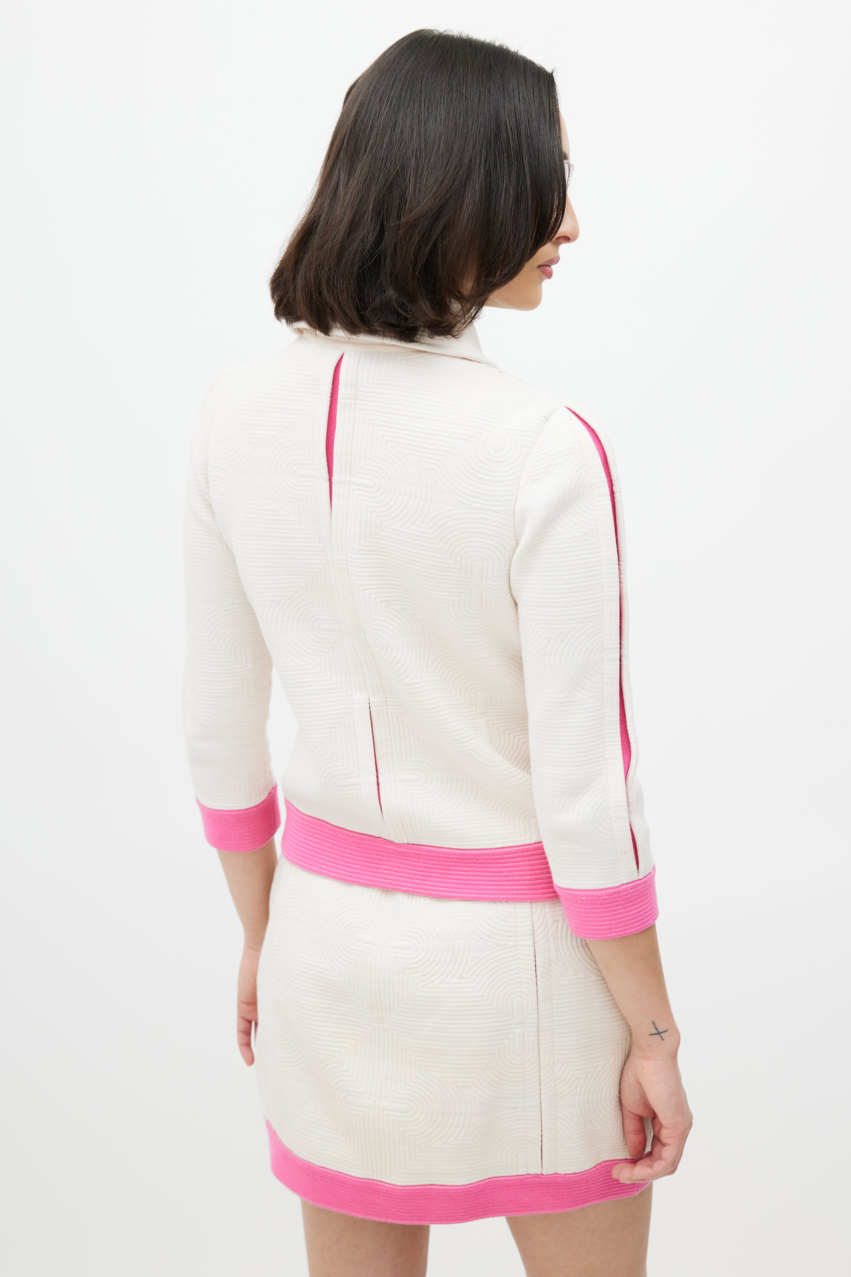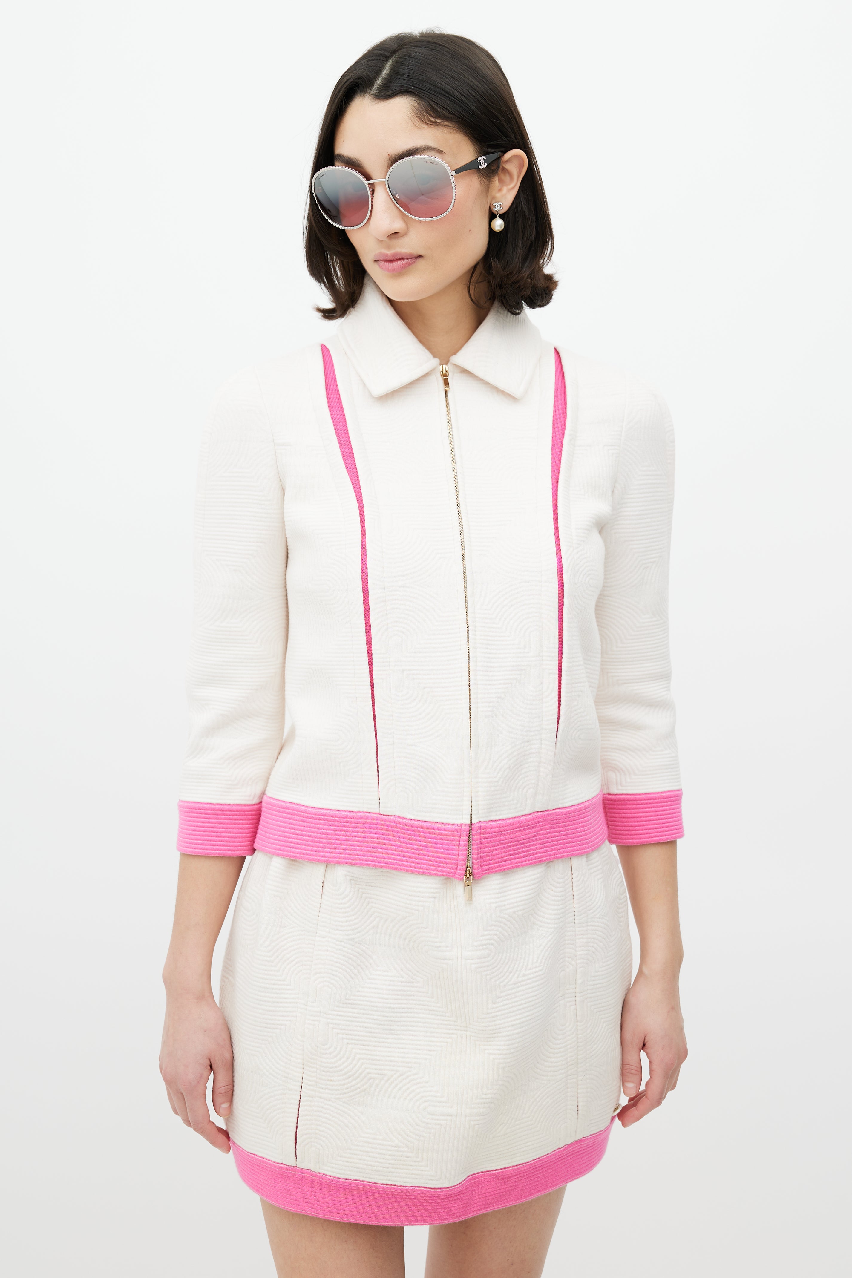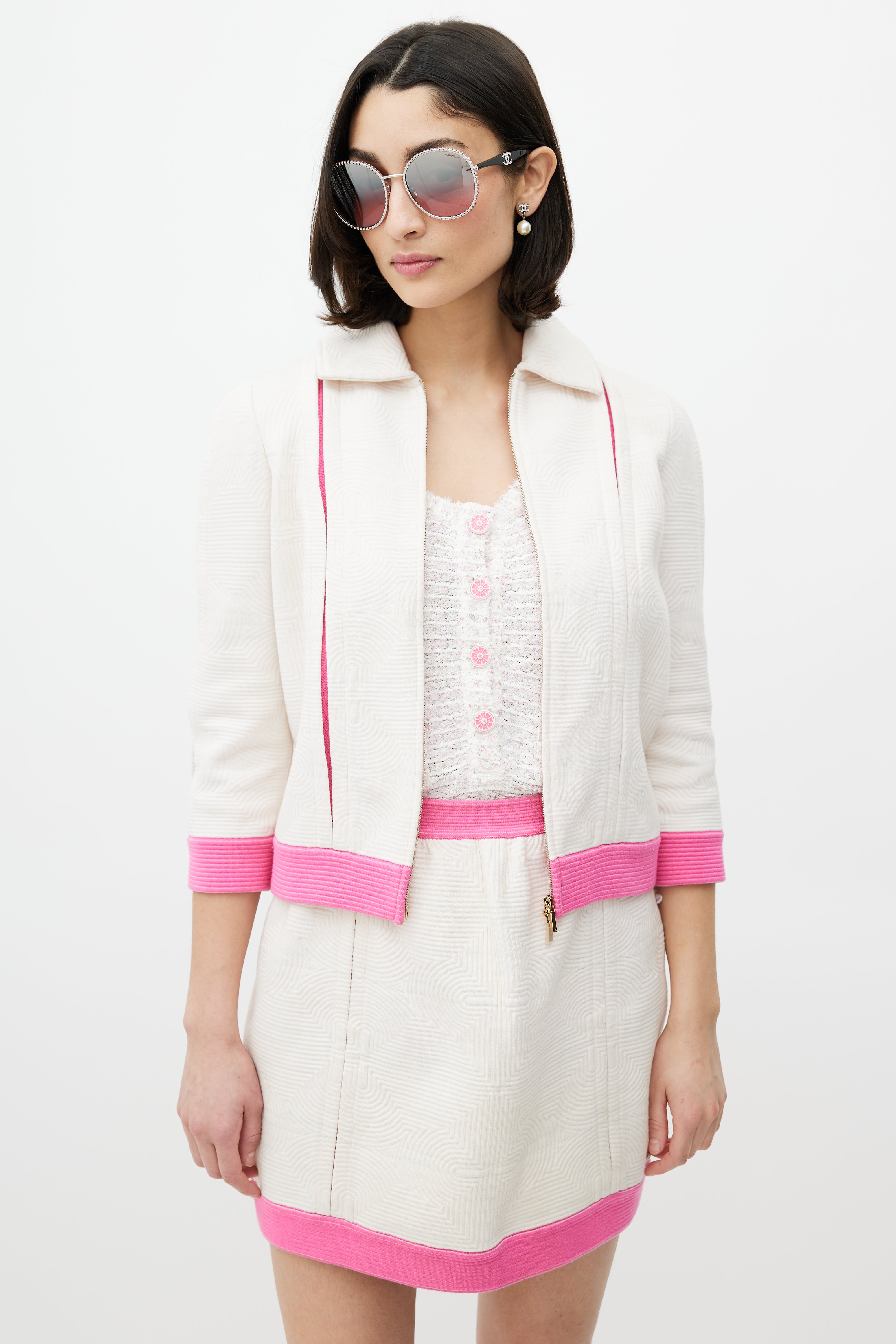 Pre-owned Chanel cream jacket featuring a pointed collar, three quarter length sleeves, ribbed detailing, pink trim at hem, and zip closure. Matching skirt features an elasticized waist, pink trim at hem, logo button at thigh, and zip at side with hook and eye closure.