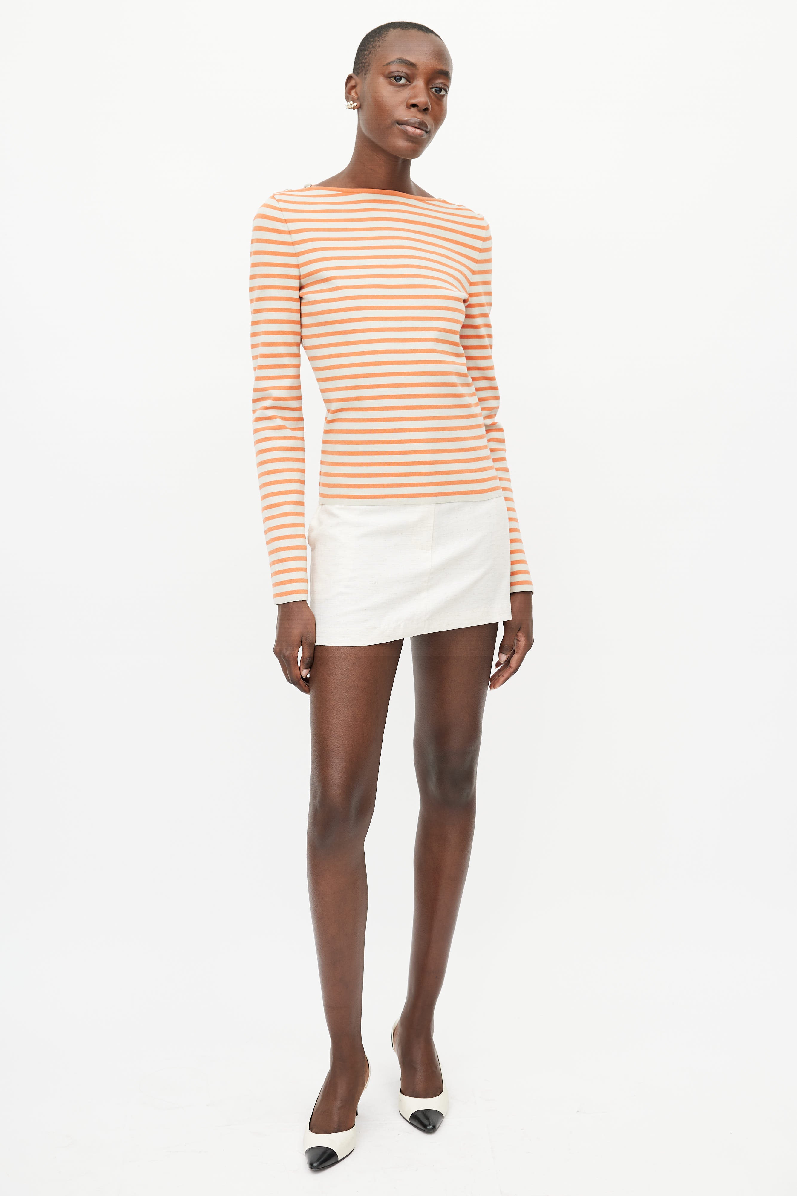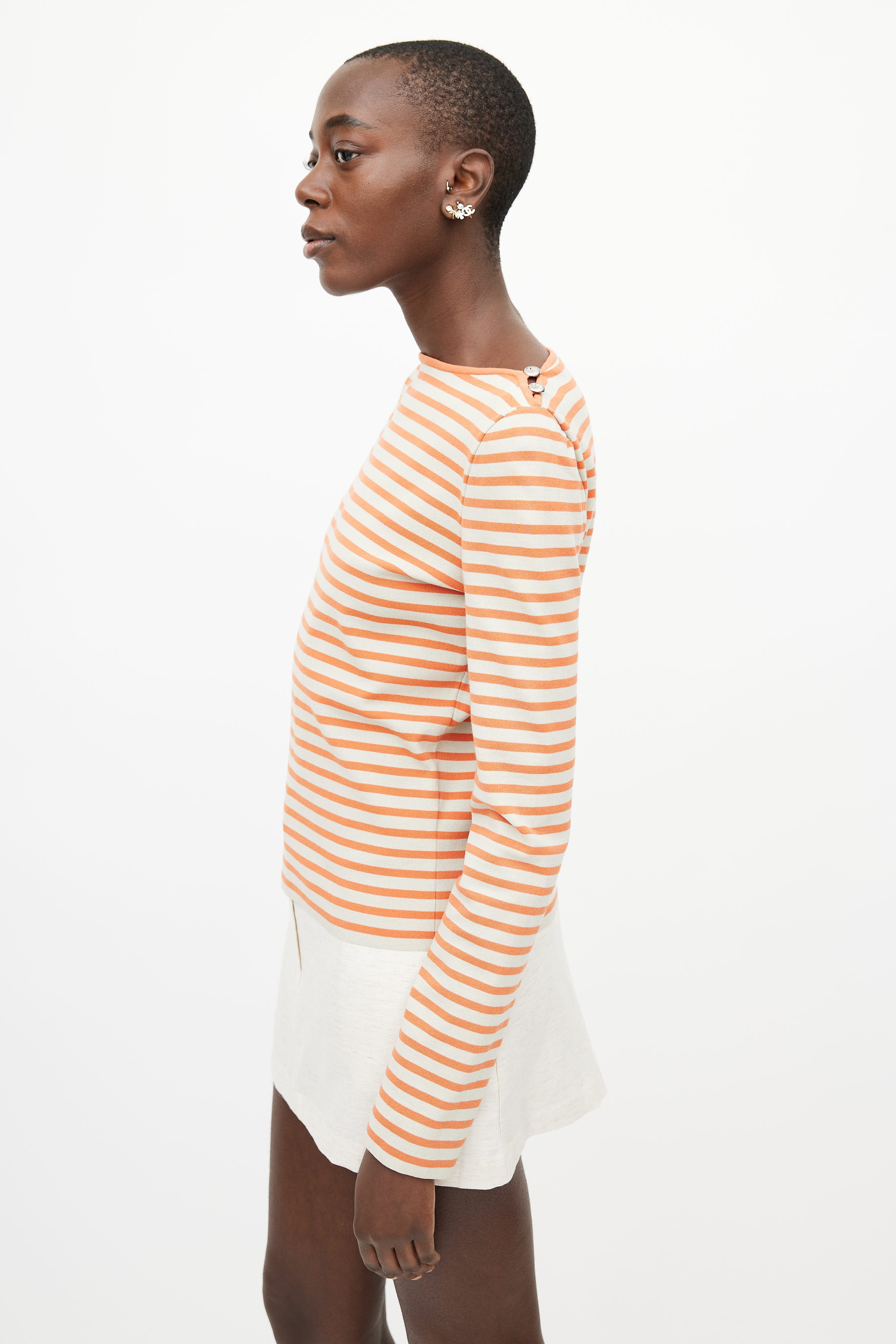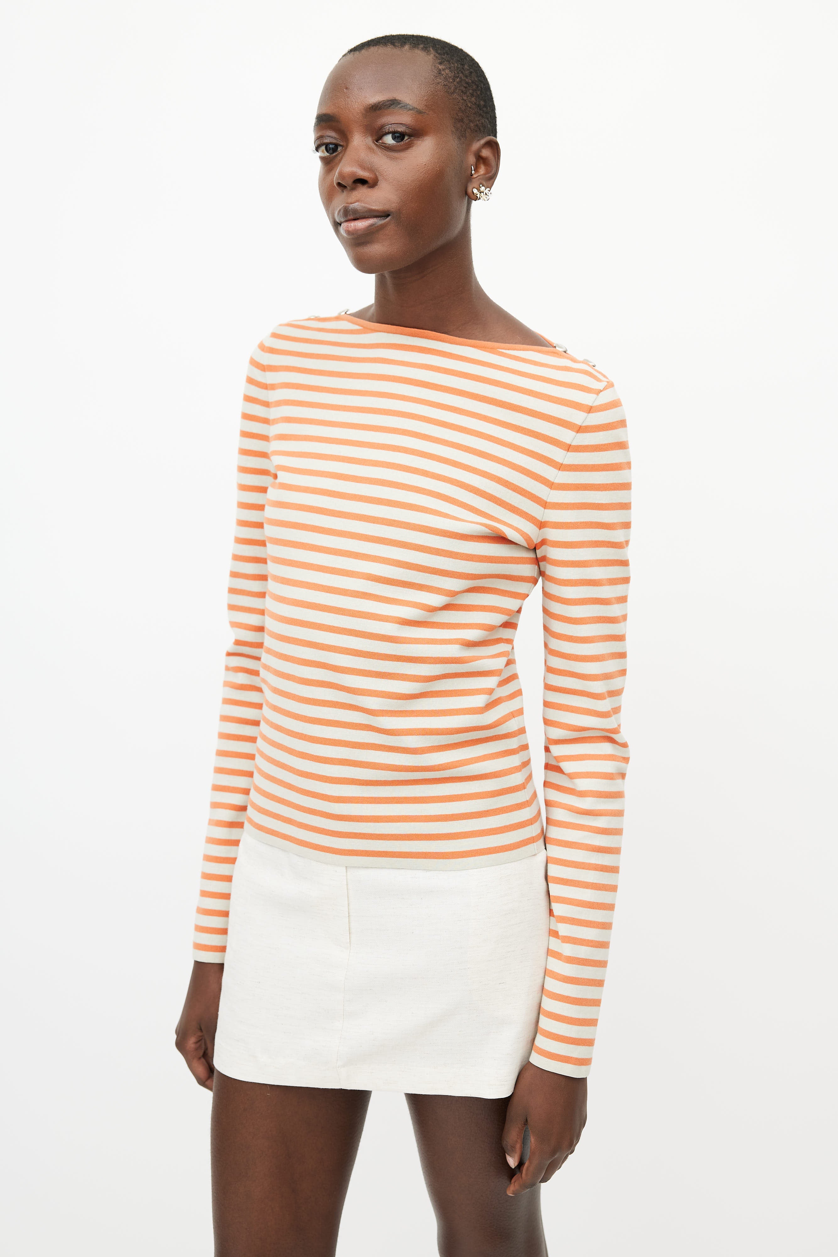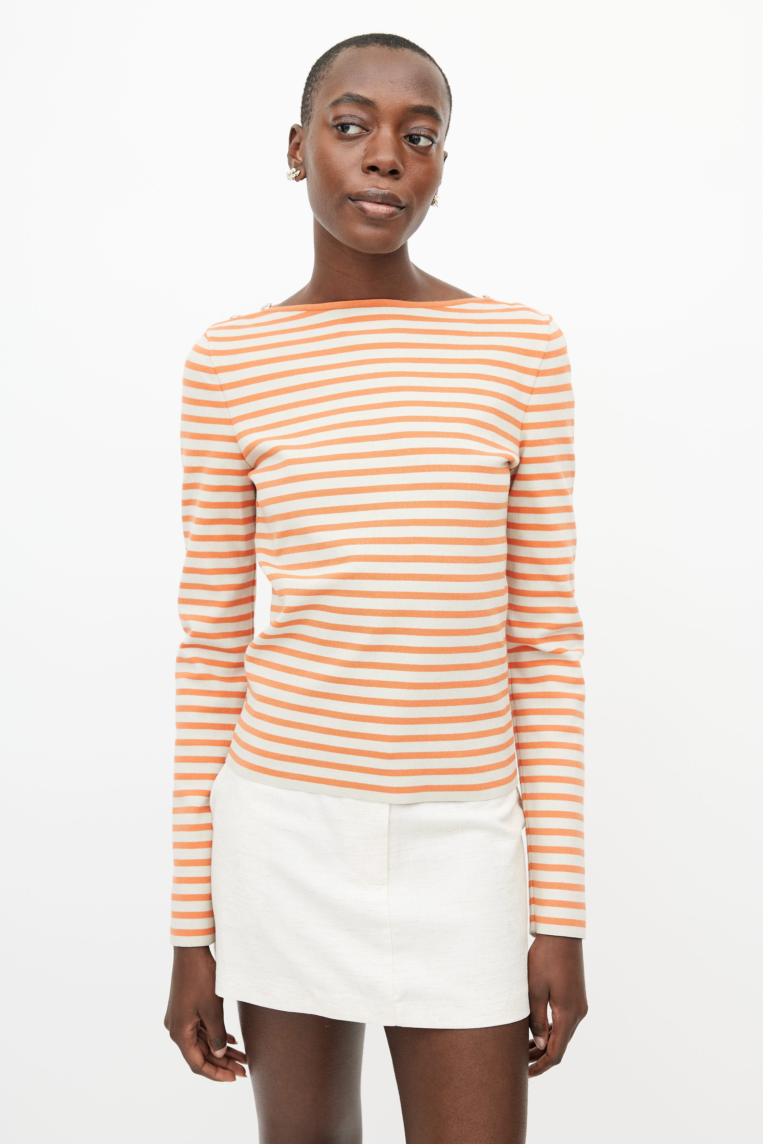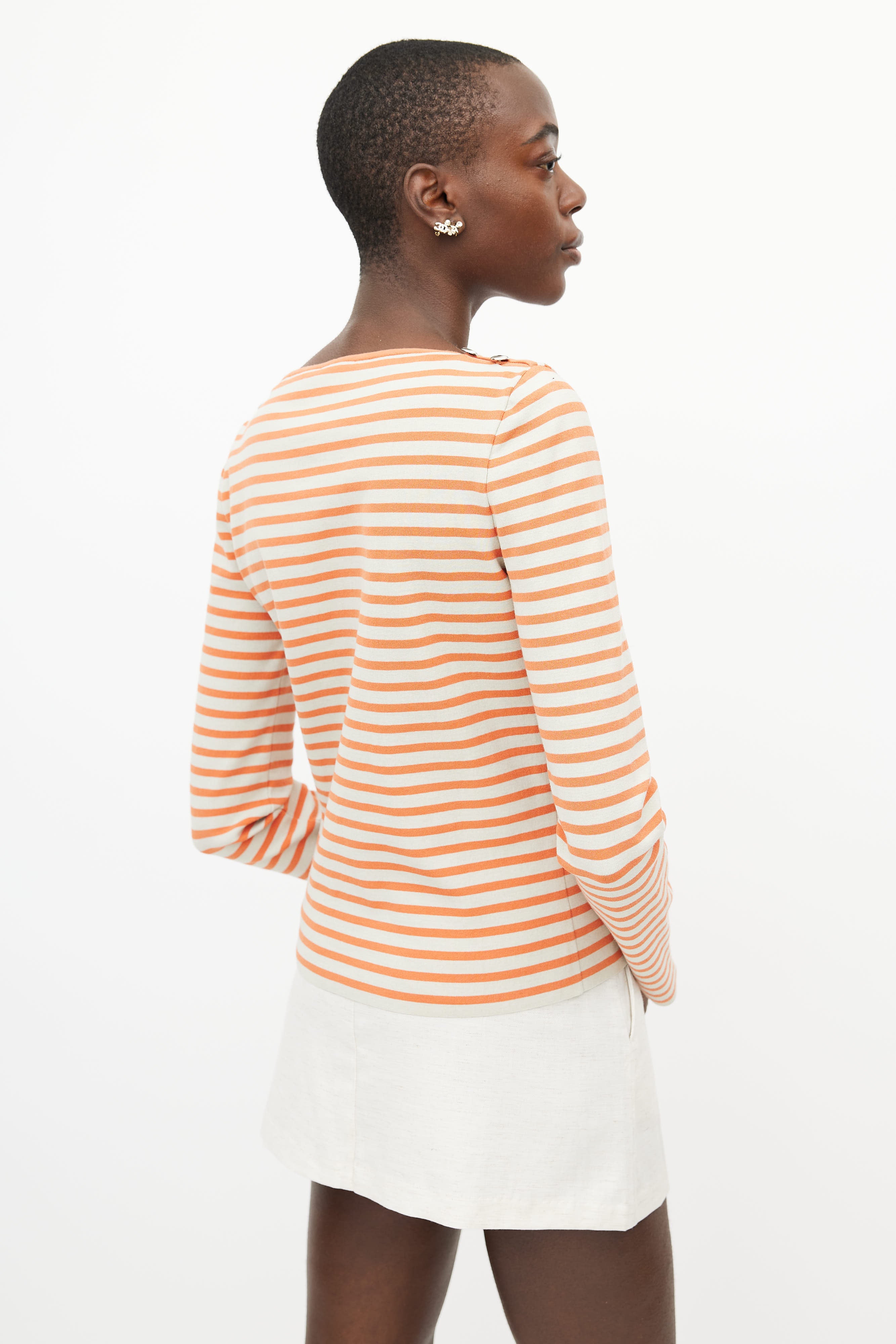Pre-owned Chanel orange and cream top featuring a striped pattern throughout, bateau neckline, long sleeves, and silver tone button hardware at shoulder.