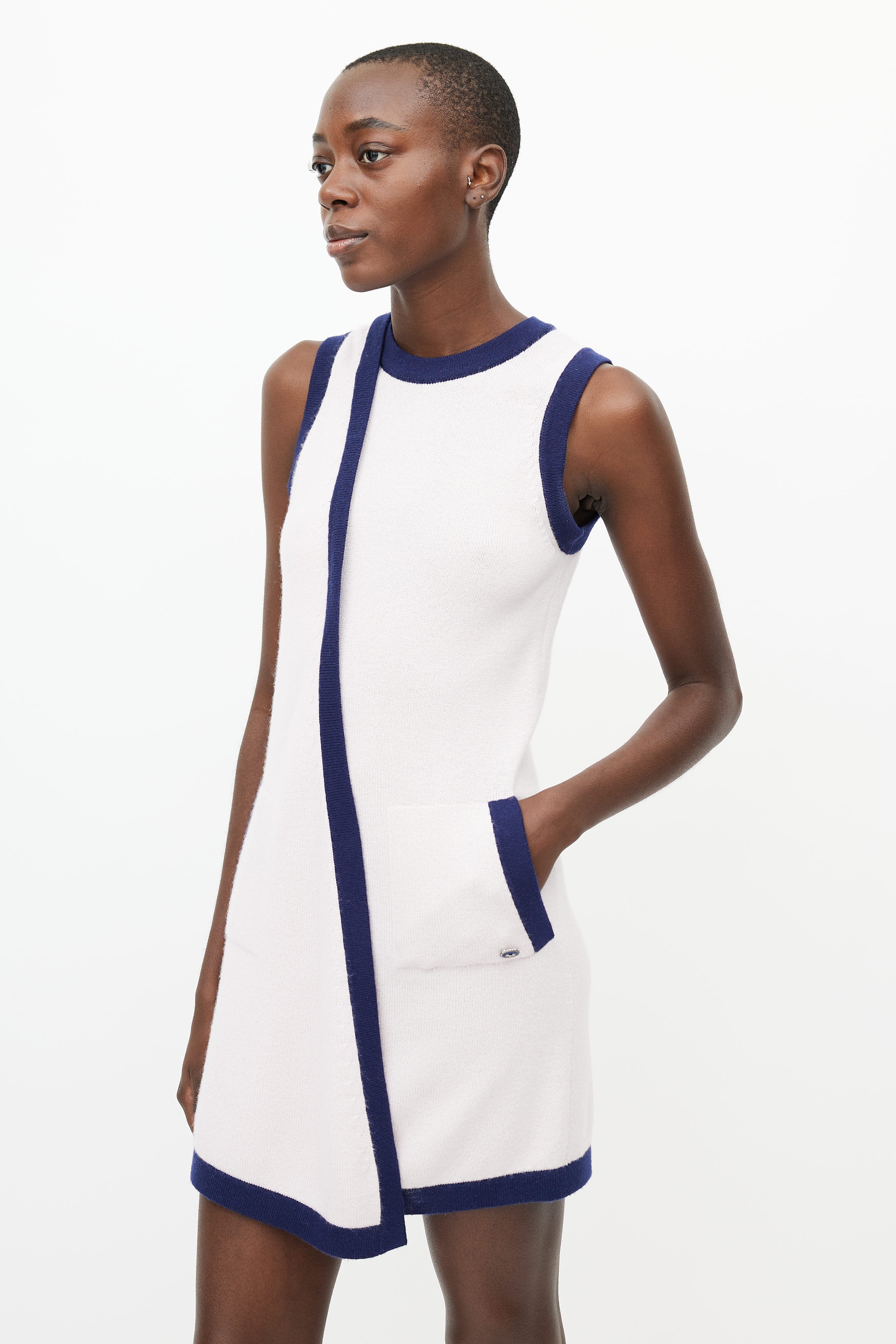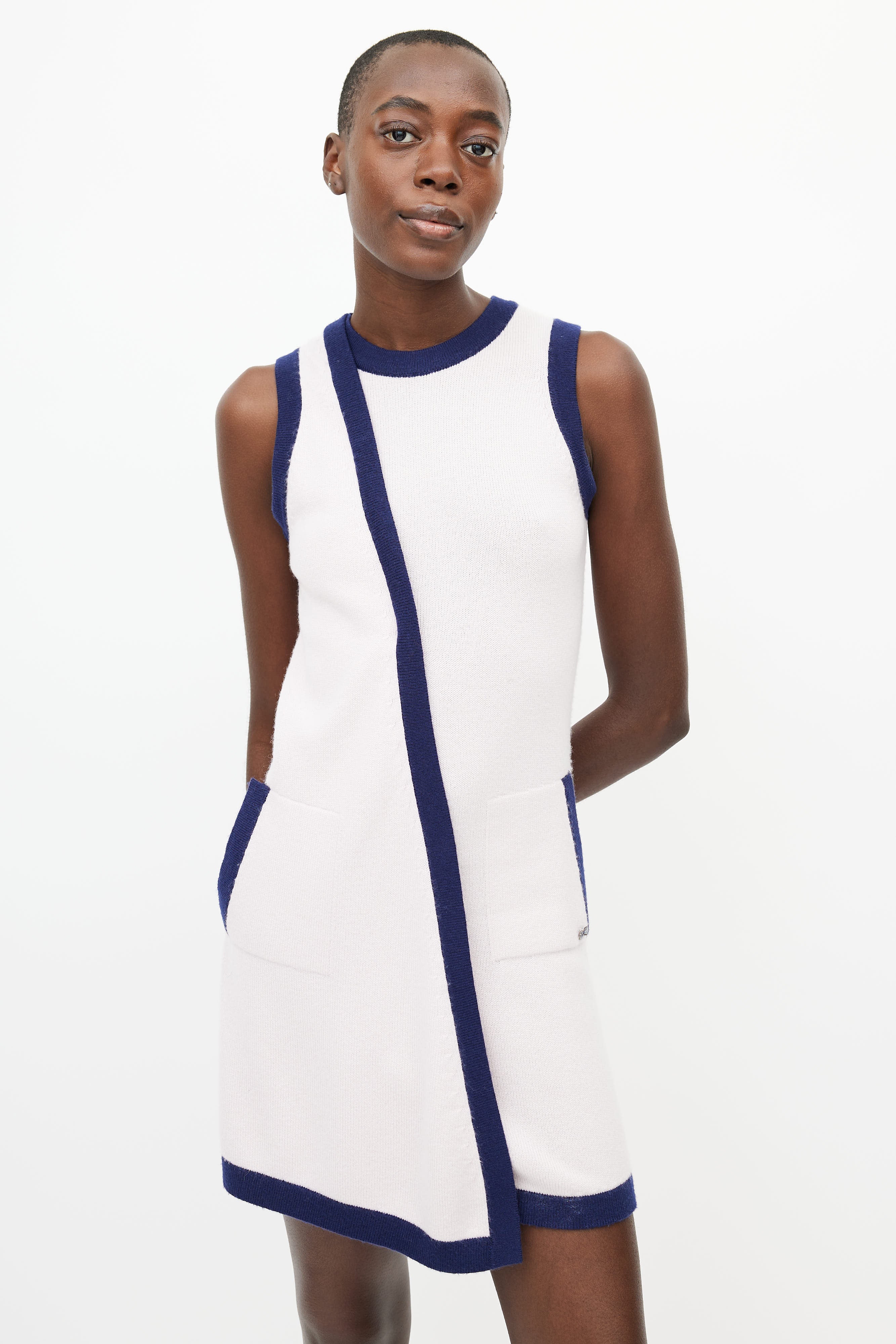 Pre-owned Chanel blue and pink knit dress featuring a crew neckline, two patch pockets at hip, wrap front, and silver tone hardware.