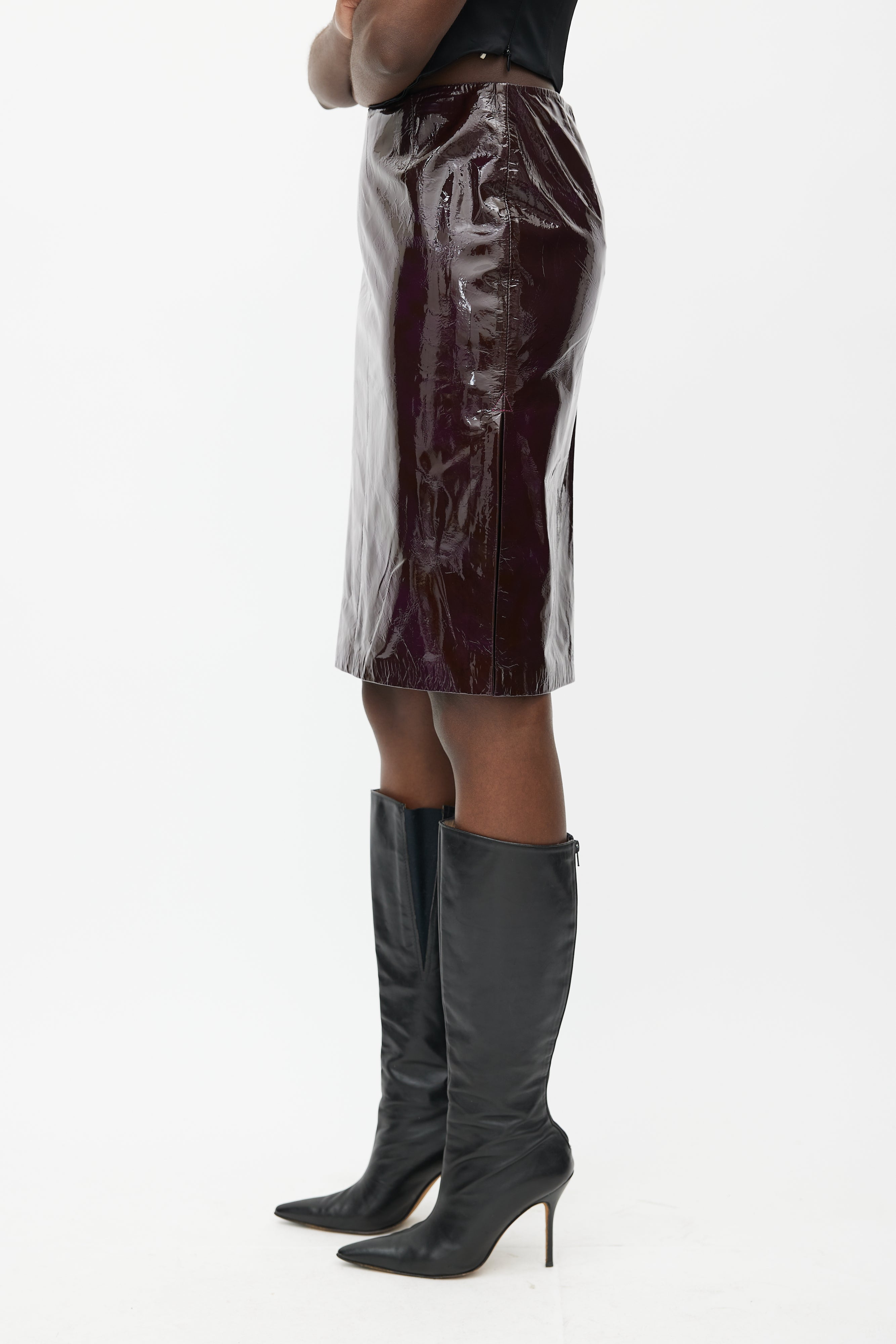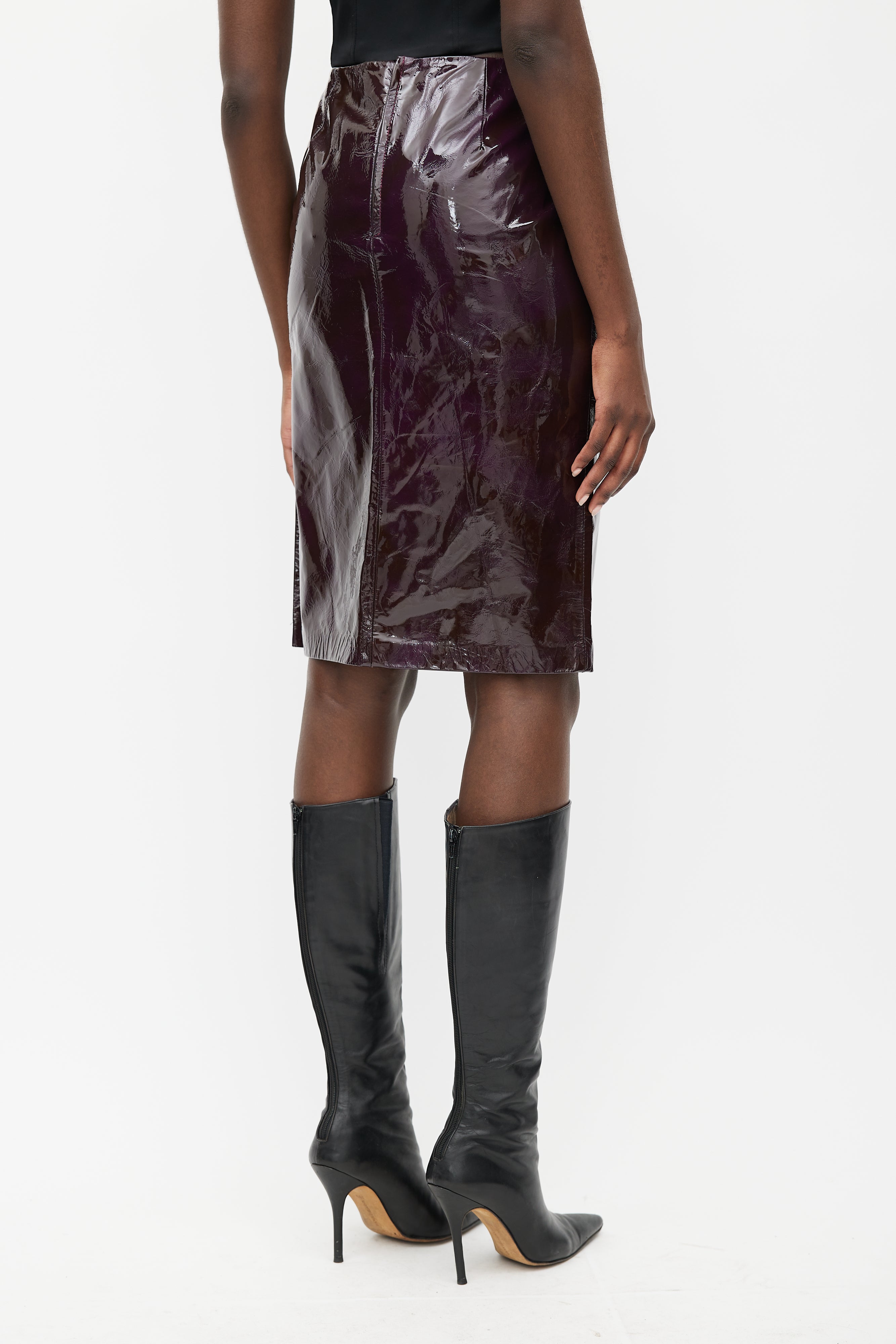 Dolce & Gabbana burgundy patent skirt featuring fixed waistband, concealed zip closure at back, side slit, and zebra lining. Clipped to fit model.