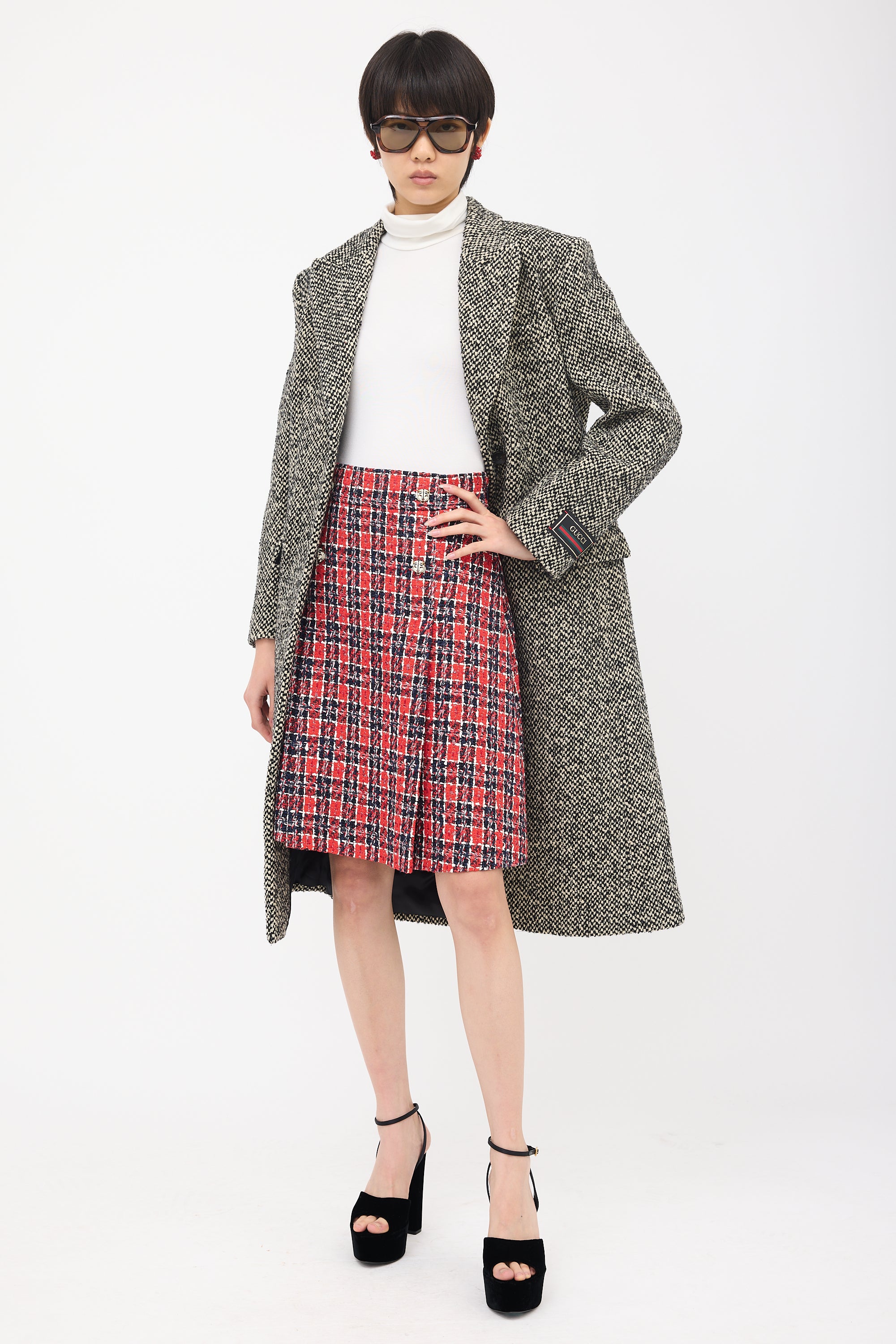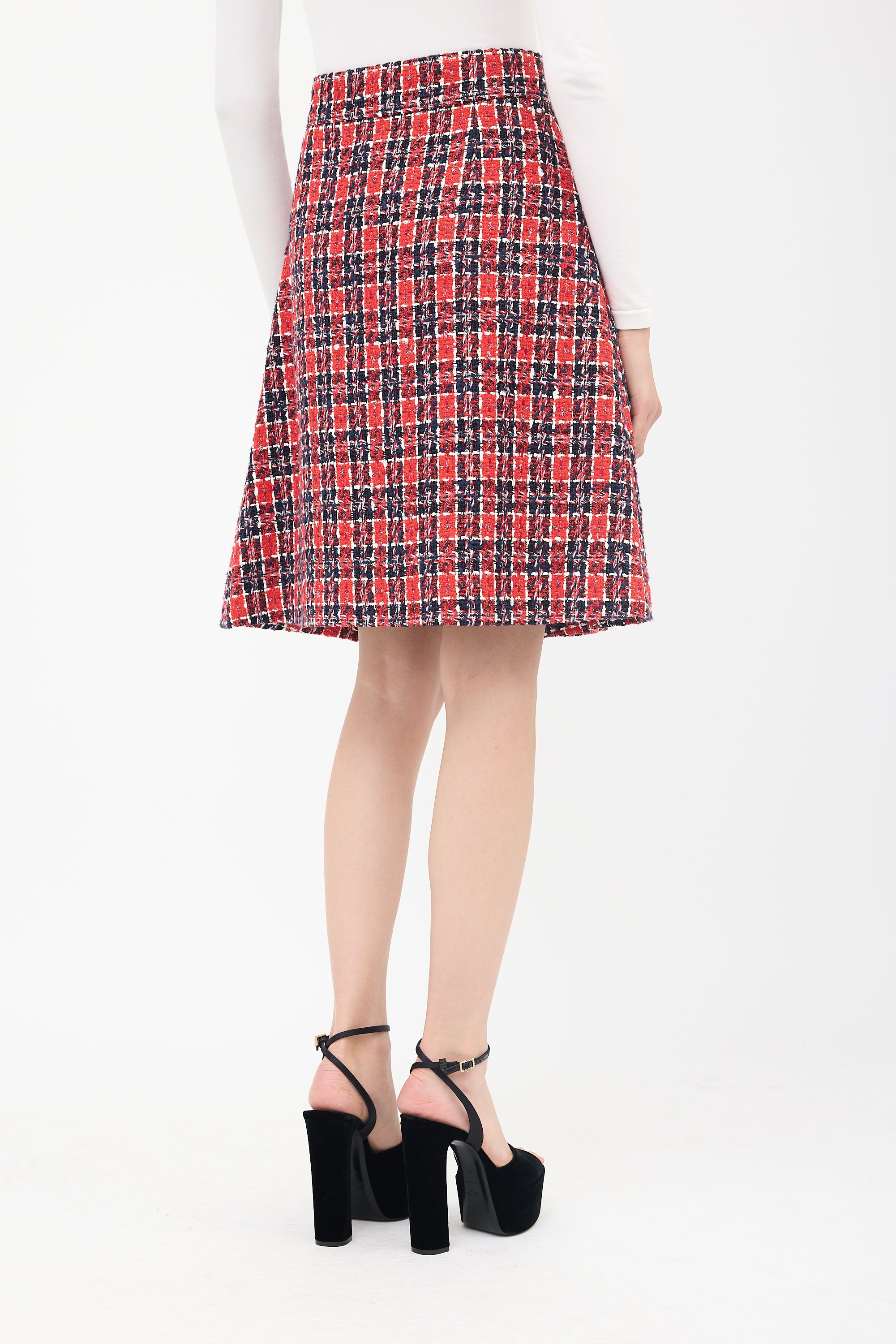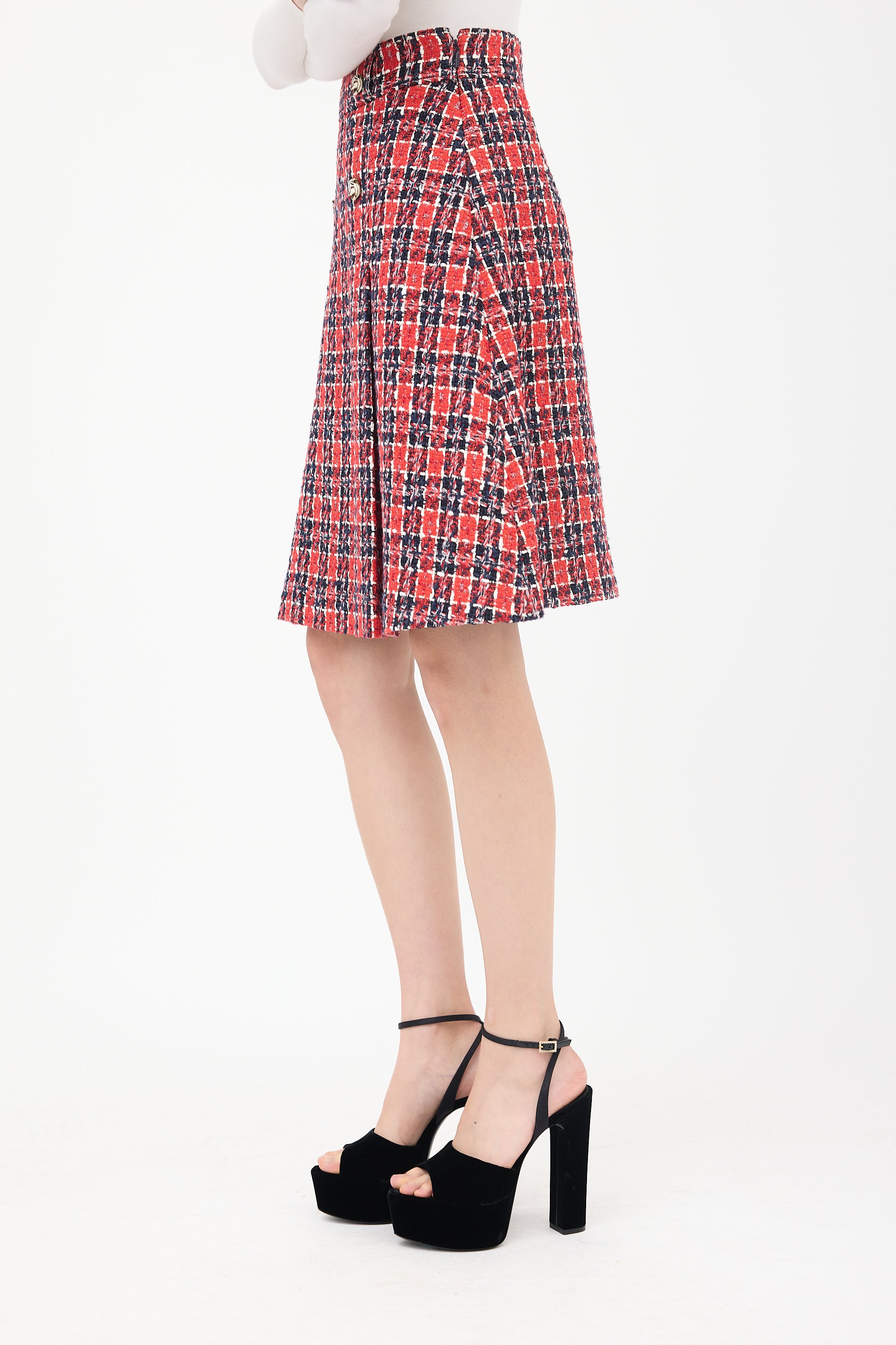 Pre-owned Gucci red and navy tweed A-line skirt featuring a side zip closure, four enameled tiger head faux buttons at front, and a front pleat. Lined. Clipped to fit model.