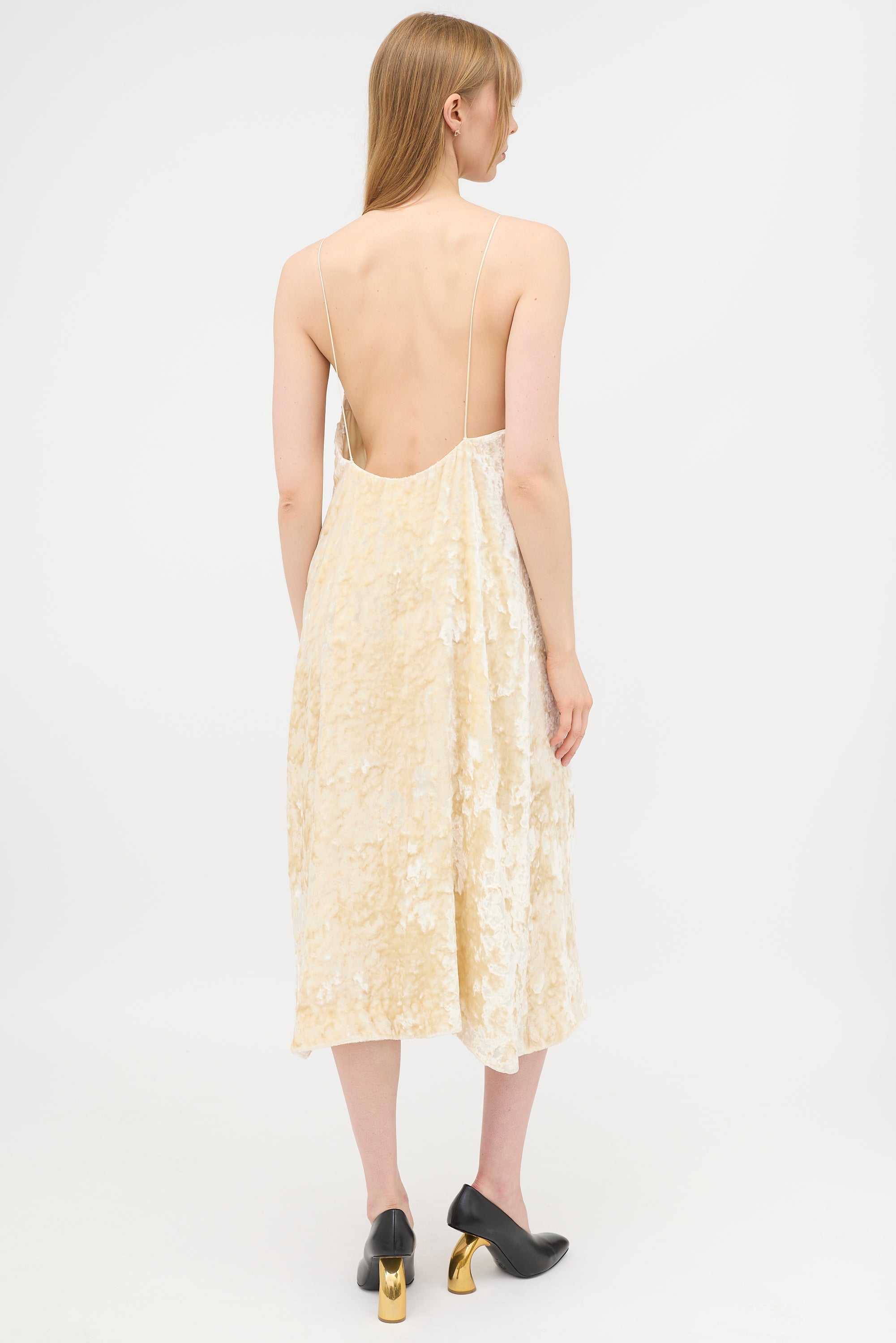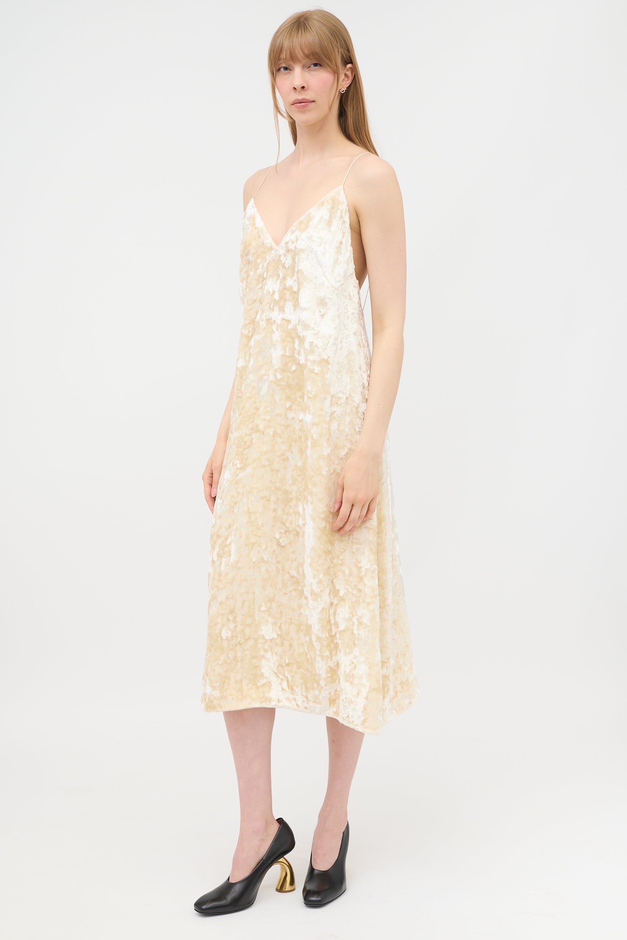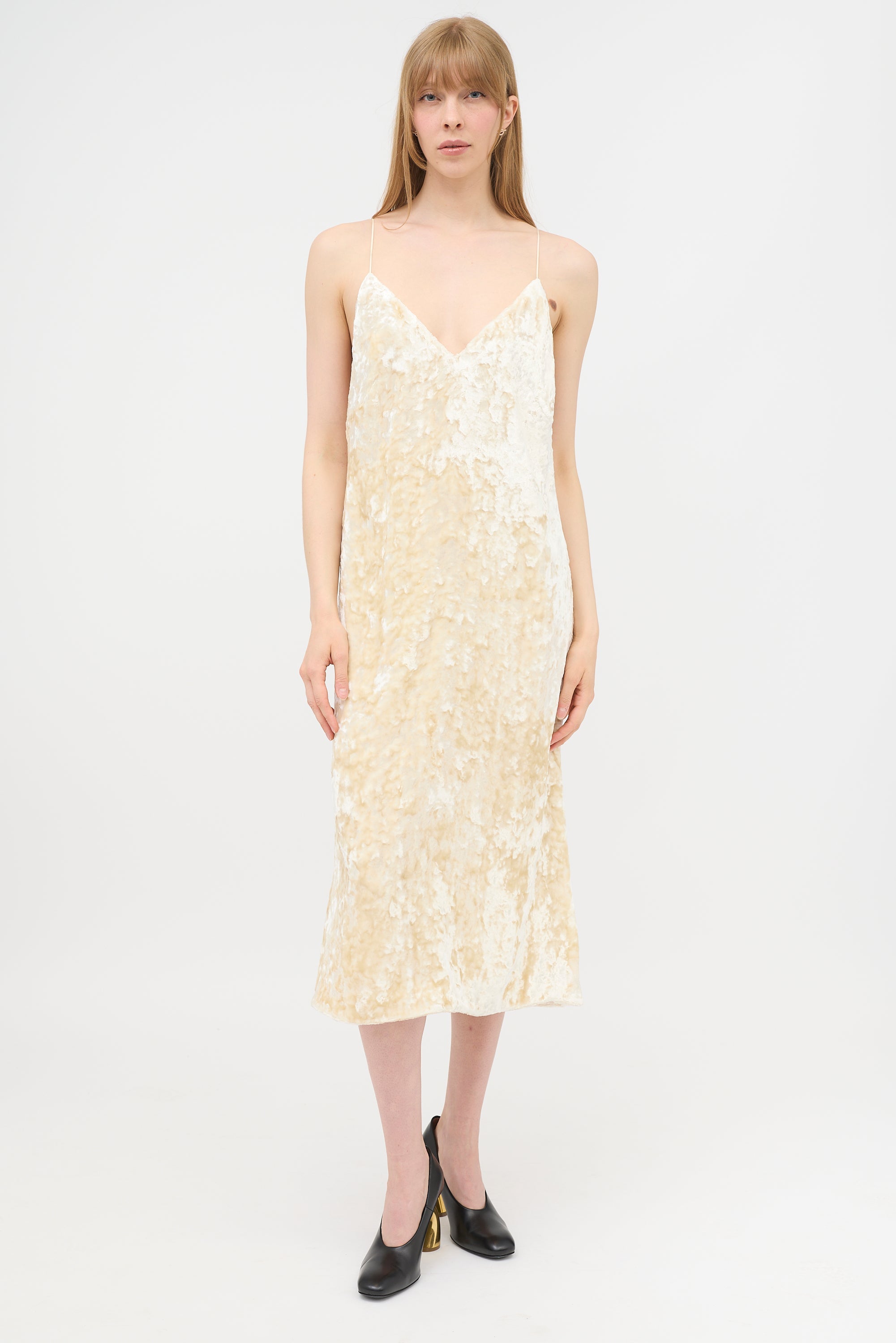 Pre-owned Jil Sander cream crushed velvet slip dress featuring a V-neckline, side zip closure, spaghetti straps, and an open back. Lined.