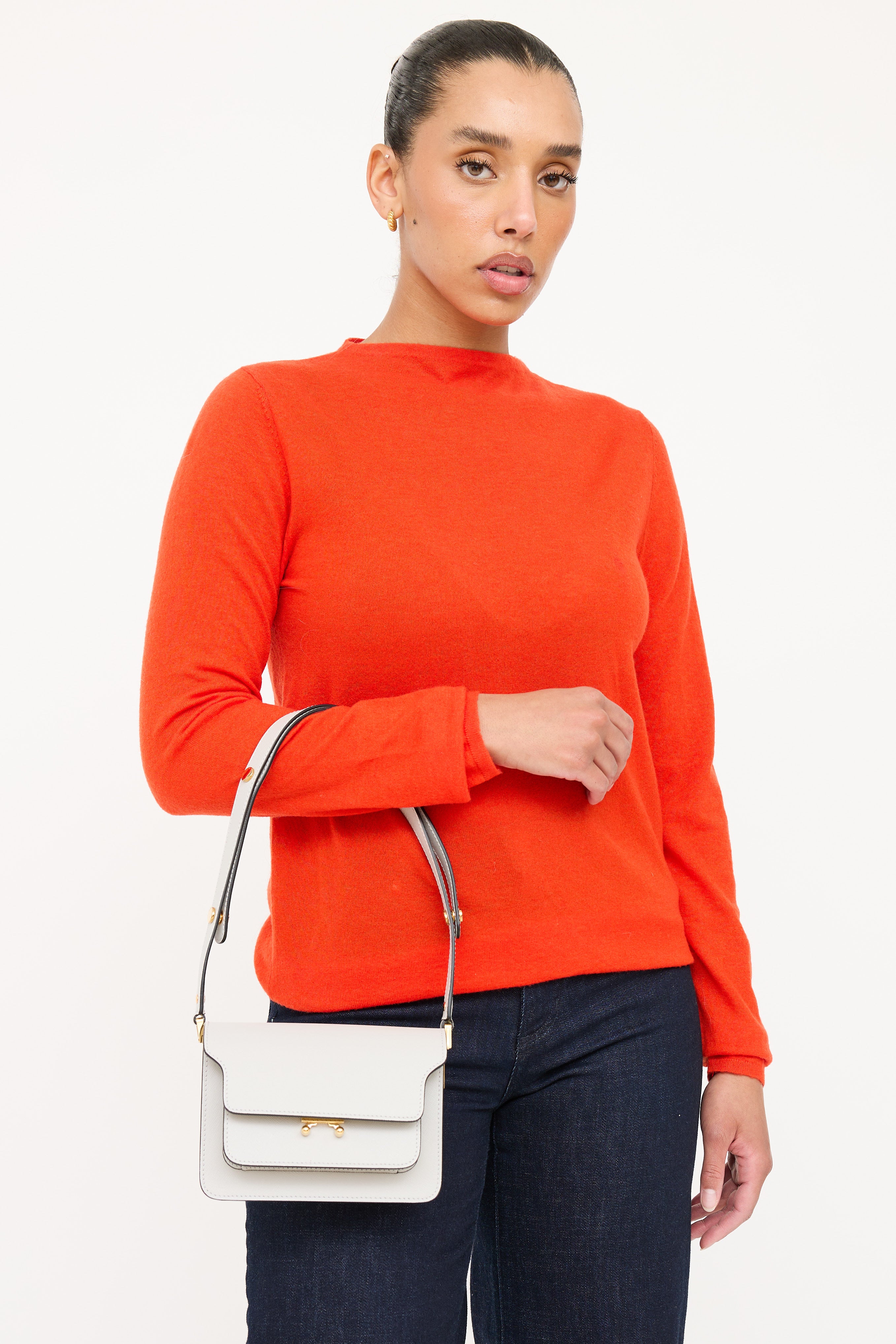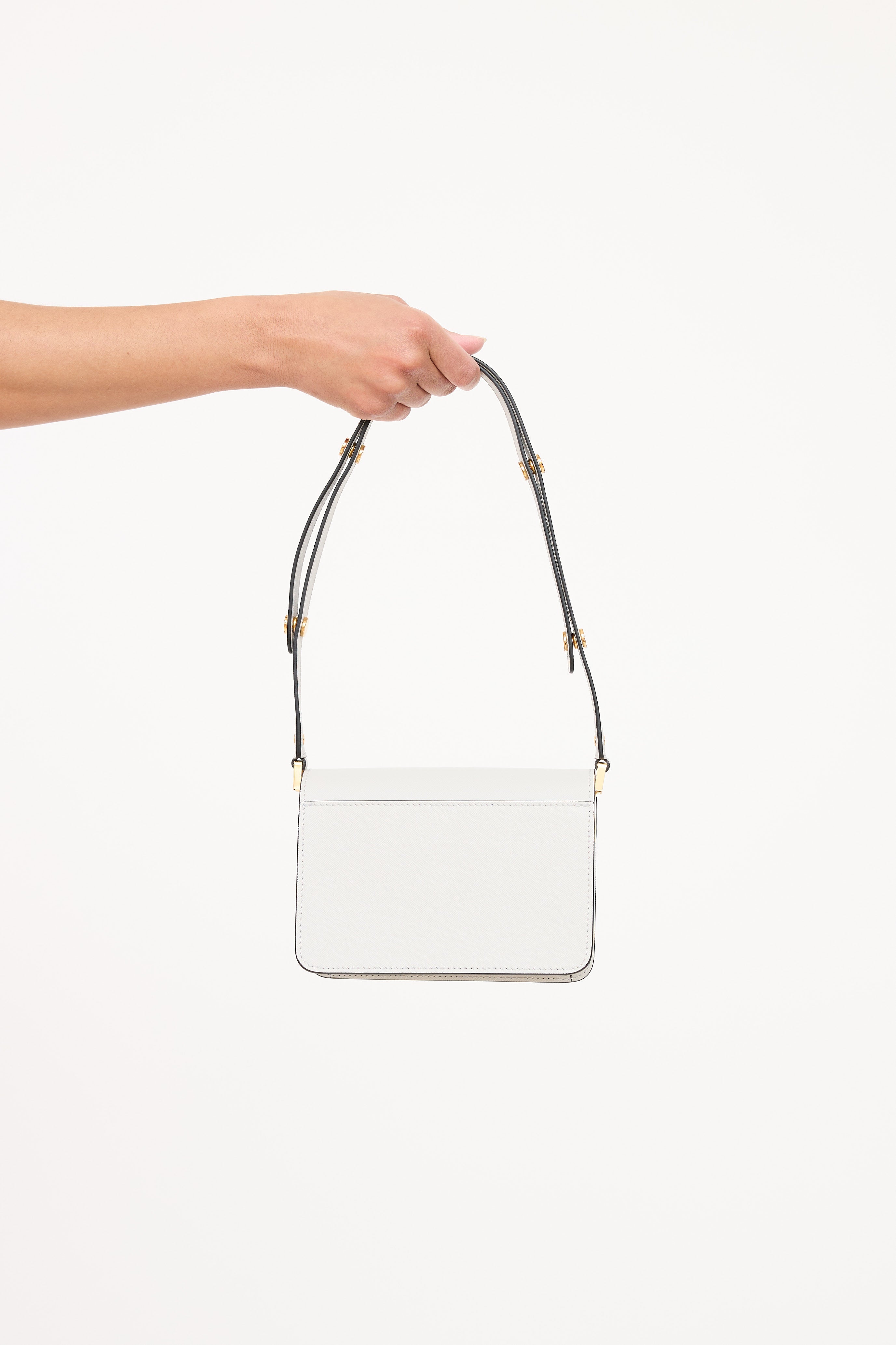 Pre-owned Marni grey Mini Trunk shoulder bag featuring adjustable strap with additional extension and snap buttons, slip pocket at back, partially concealed push lock closure at front and gold tone hardware. Interior features one slip pocket at face, two open compartments and one zipped compartment.