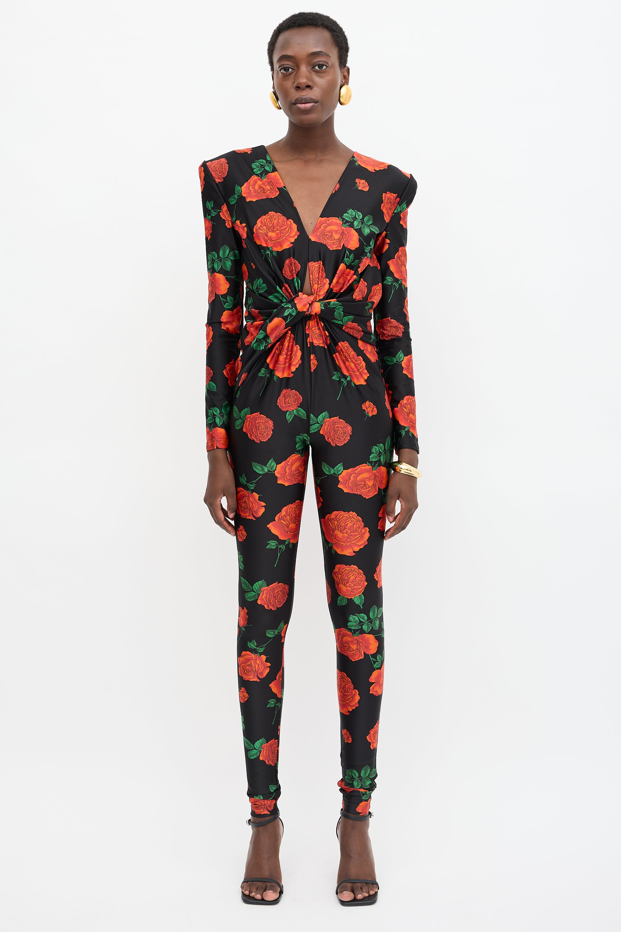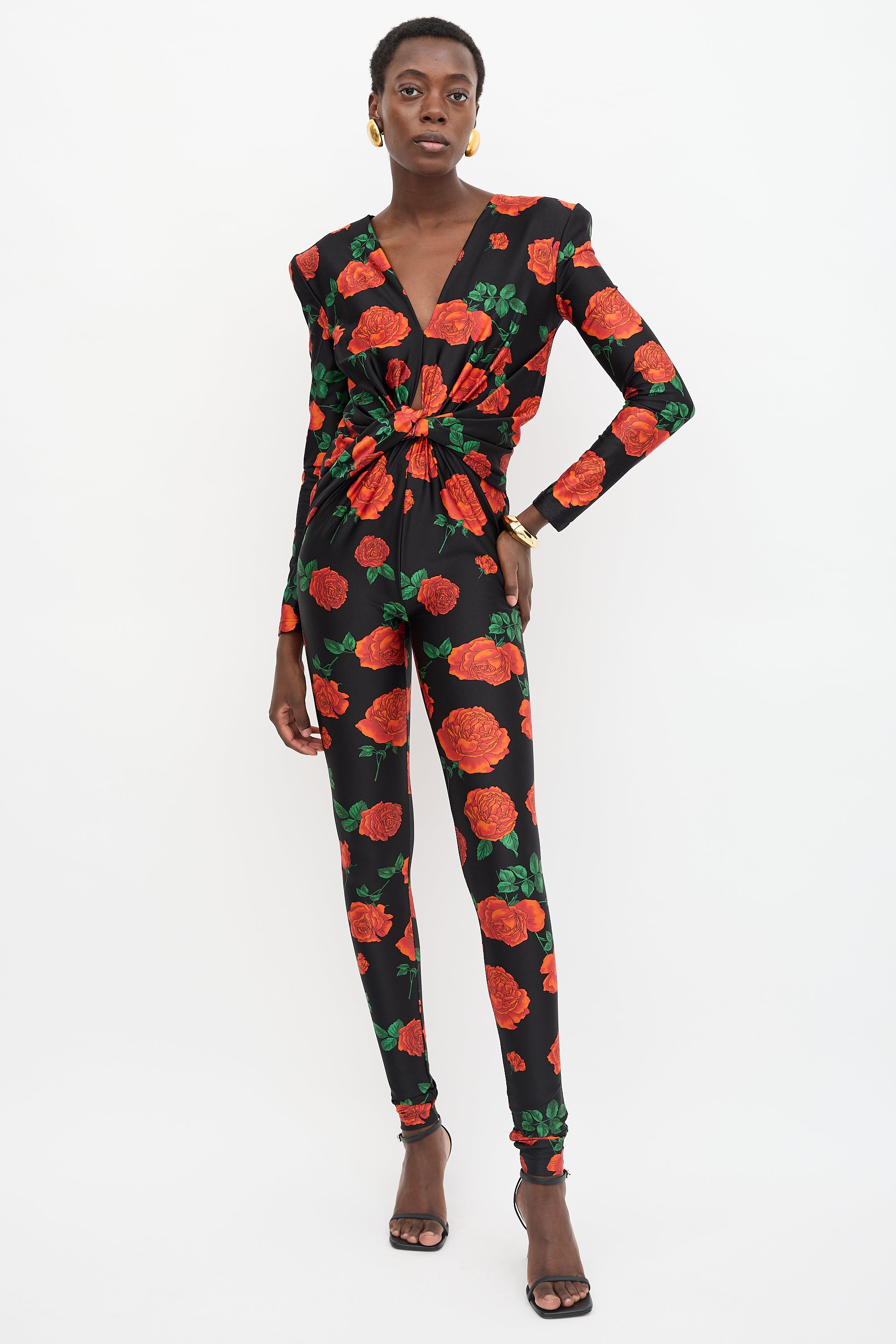 Pre-owned Saint Laurent Spring 2022 black jumpsuit featuring red and green rose print,  deep v-neckline, cutout front with twist detail, concealed back zip, padded shoulders, front ruching at waist, and slim leg.