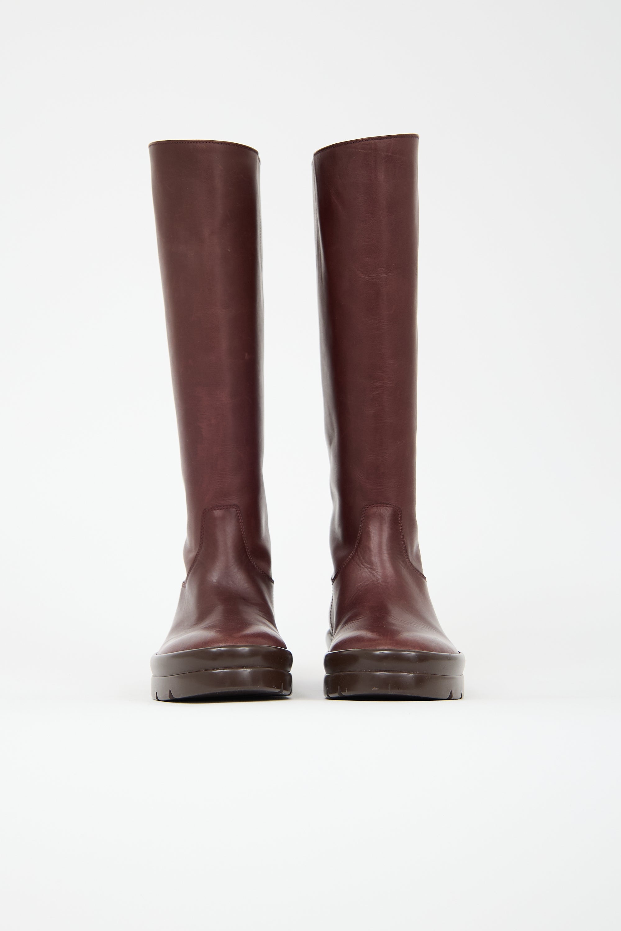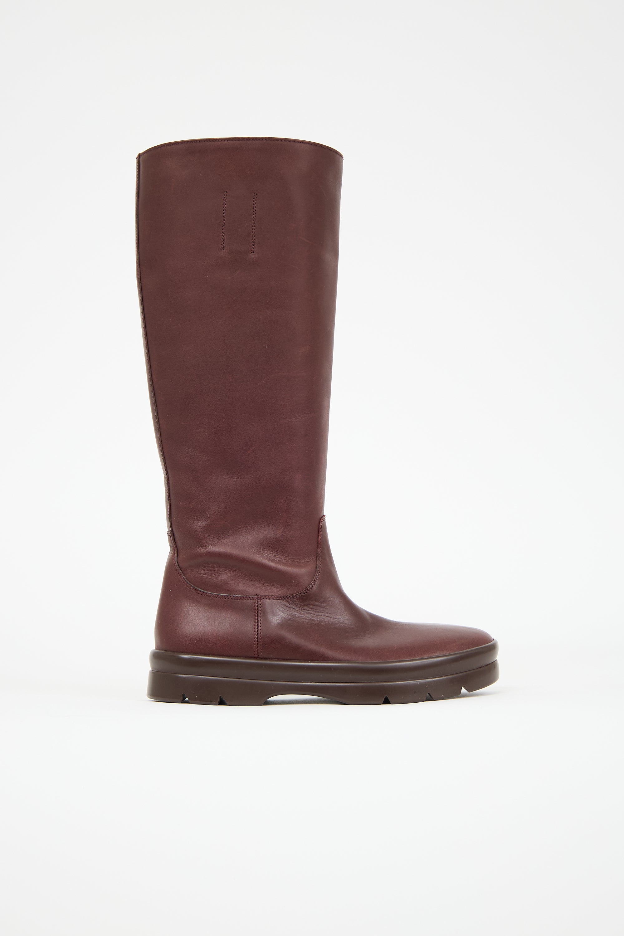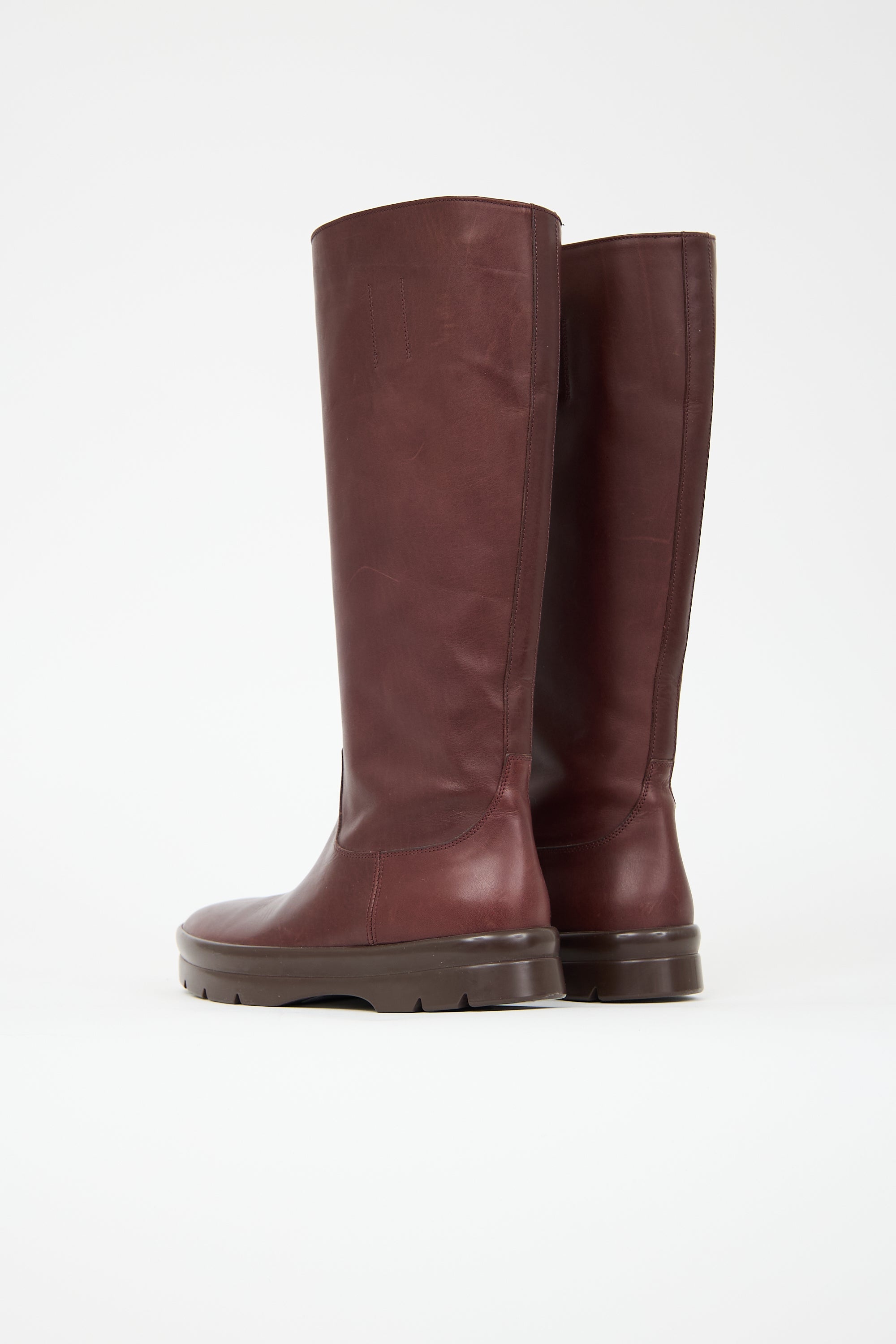 Pre-owned The Row burgundy leather Billie knee high boots featuring rounded toe, asymmetrical topline, interior pull tabs, and treaded rubber sole.
