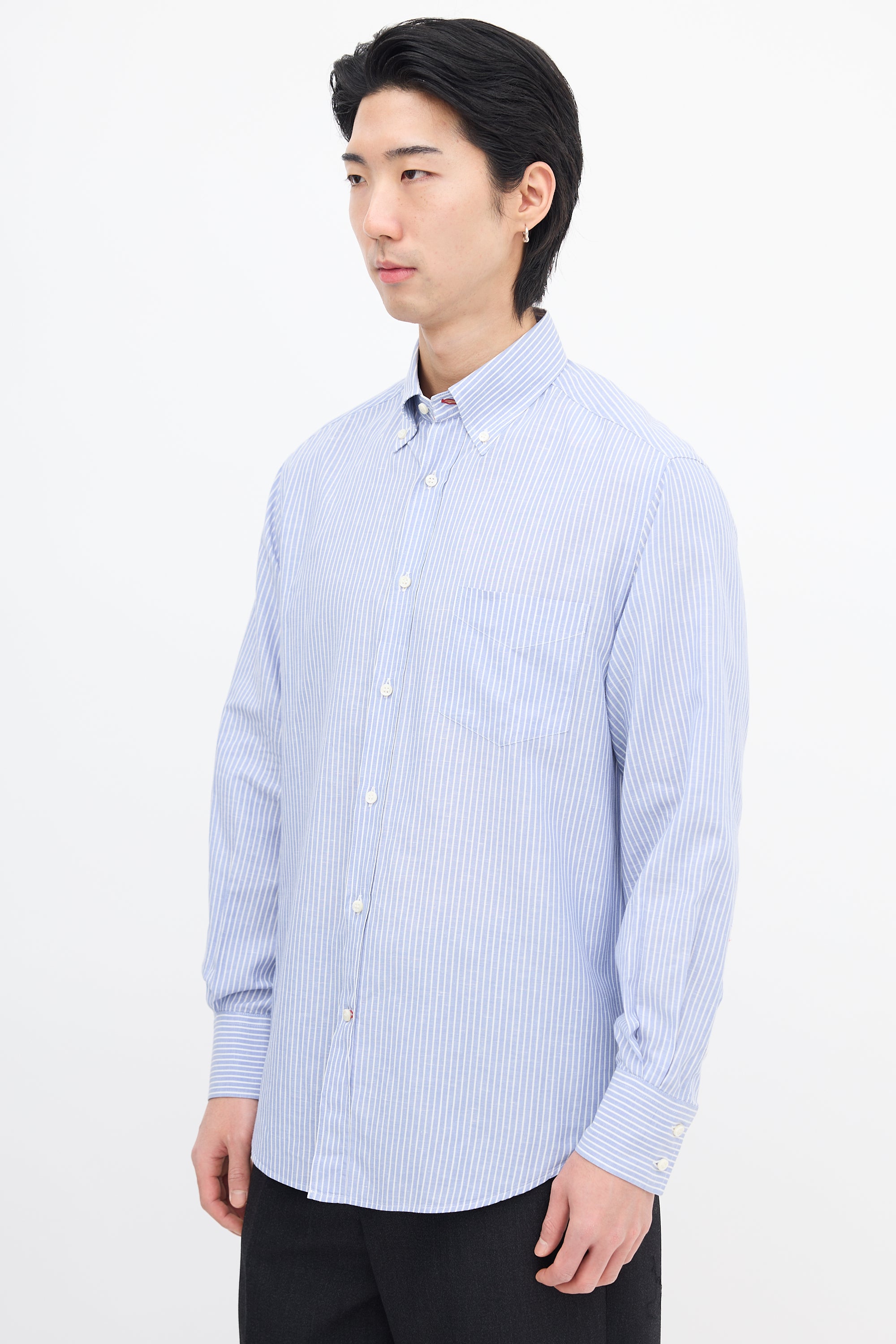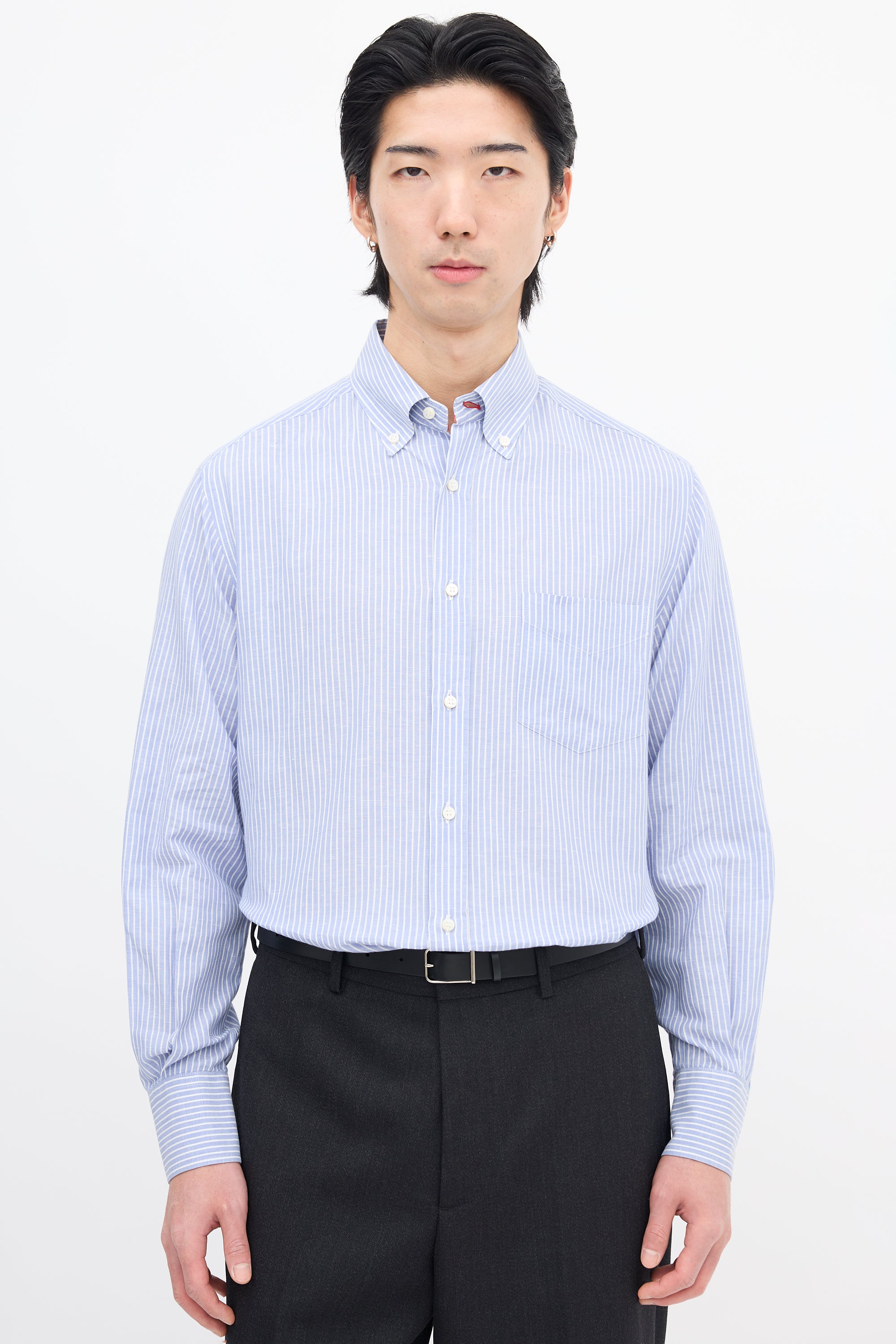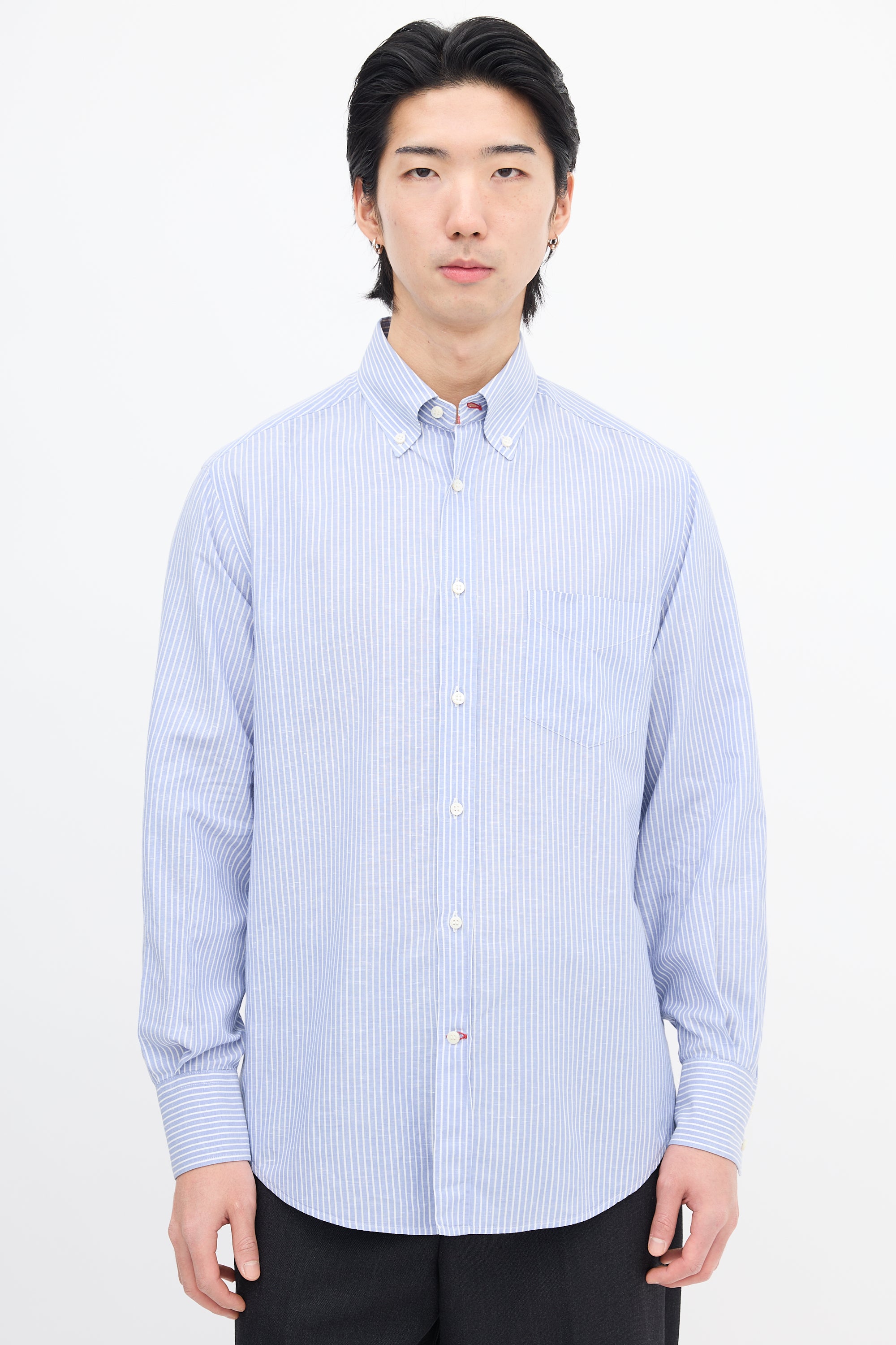 Pre-owned Brunello Cucinelli blue and white shirt featuring a wide pinstripe pattern, buttoned point collar, button up front, patch pocket at left chest, pleated back yoke, and pleated and buttoned cuffs.