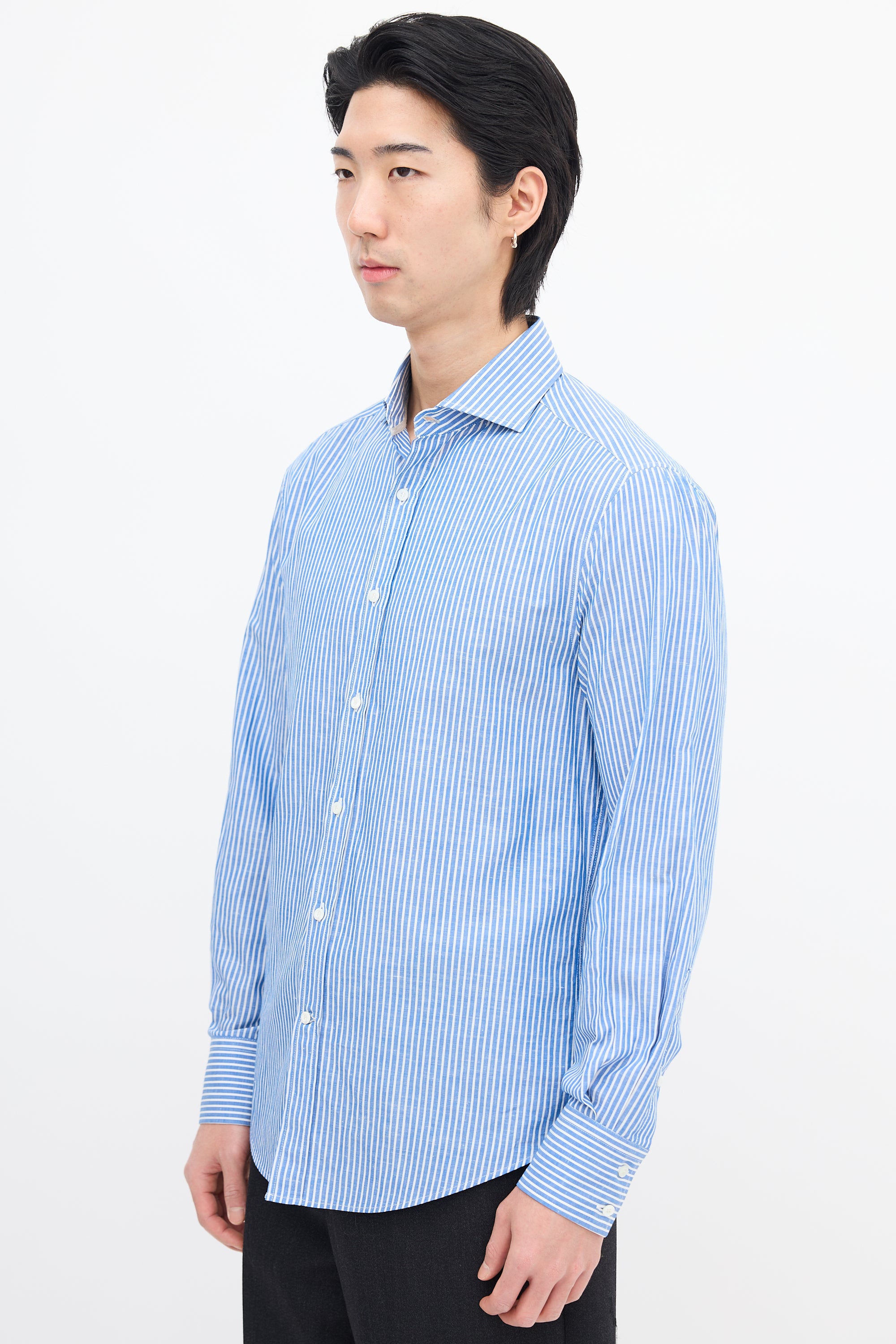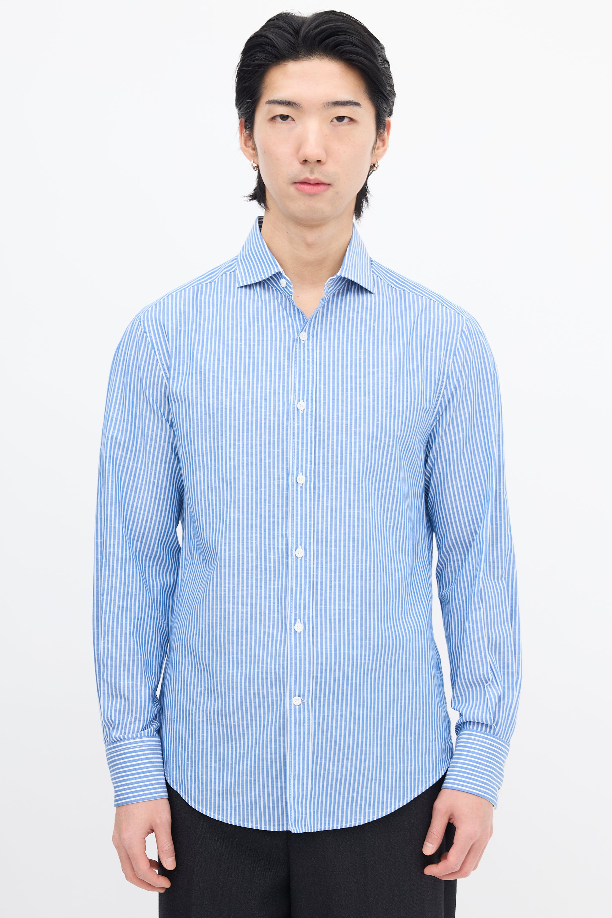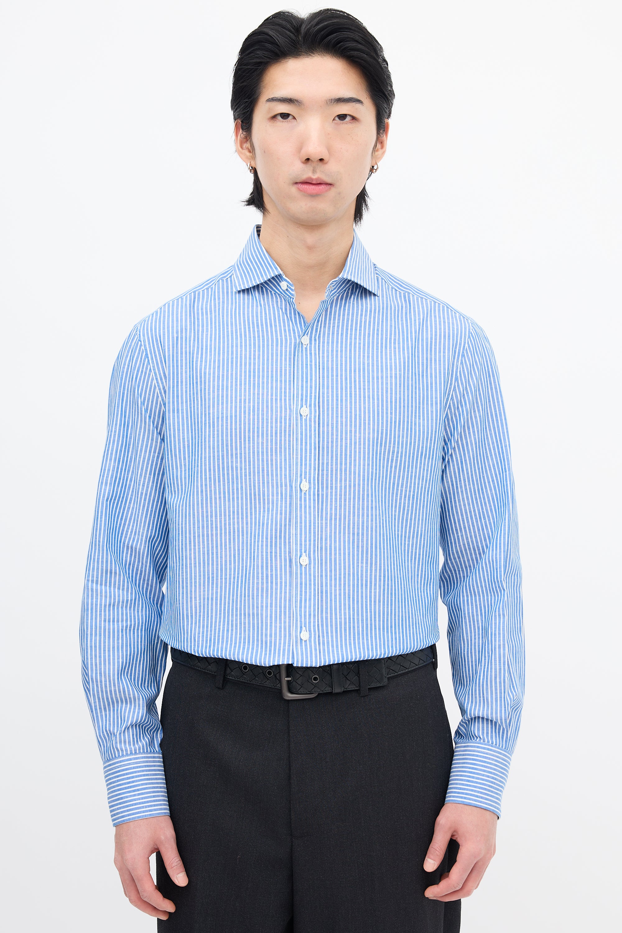 Pre-owned Brunello Cucinelli blue and white slim fit shirt featuring a wide pinstripe pattern, spread collar, button up front, pleated back yoke, and pleated and buttoned cuffs.