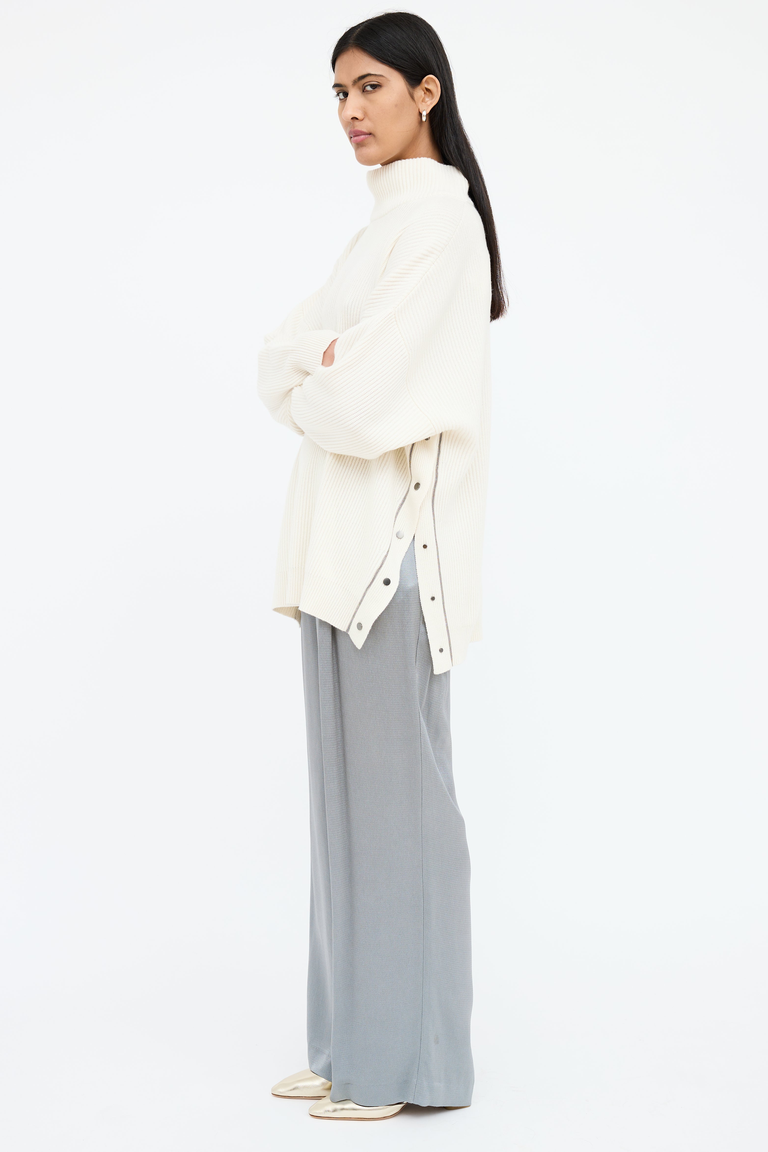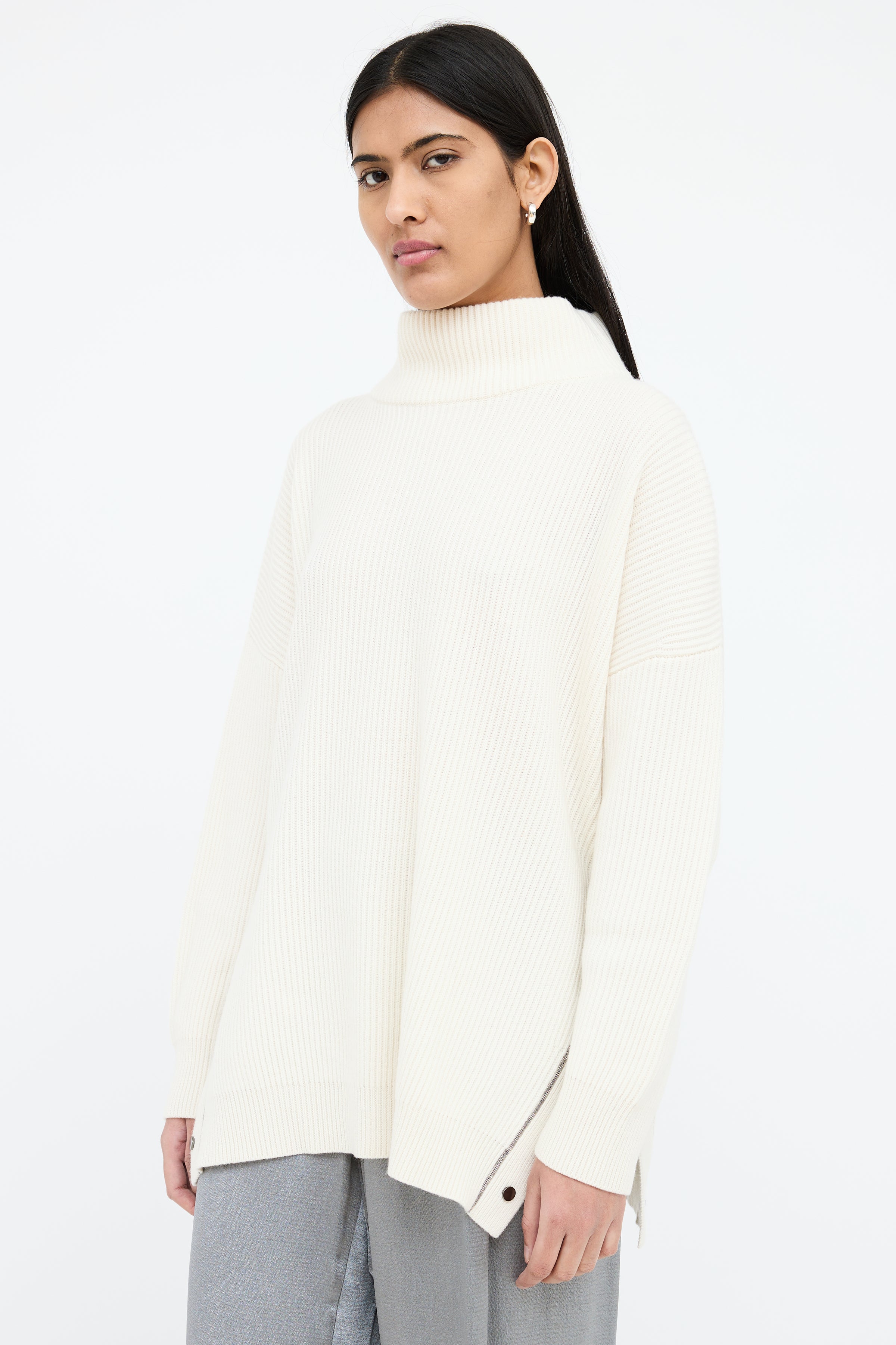 Pre-owned Brunello Cucinelli cream cashmere knit sweater featuring a turtleneck, ribbed knit, long sleeves and side snap buttons with signature beaded detailing.