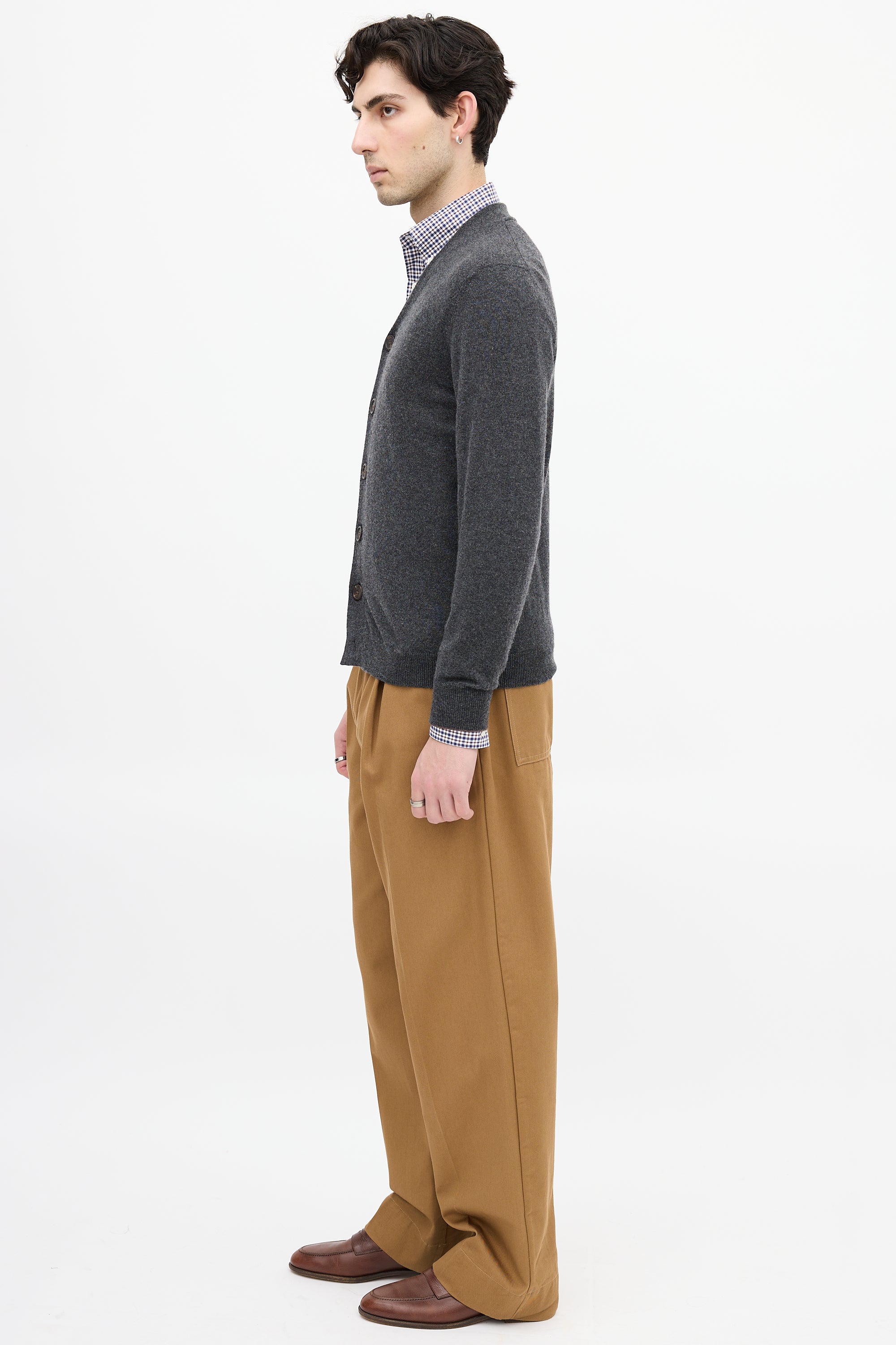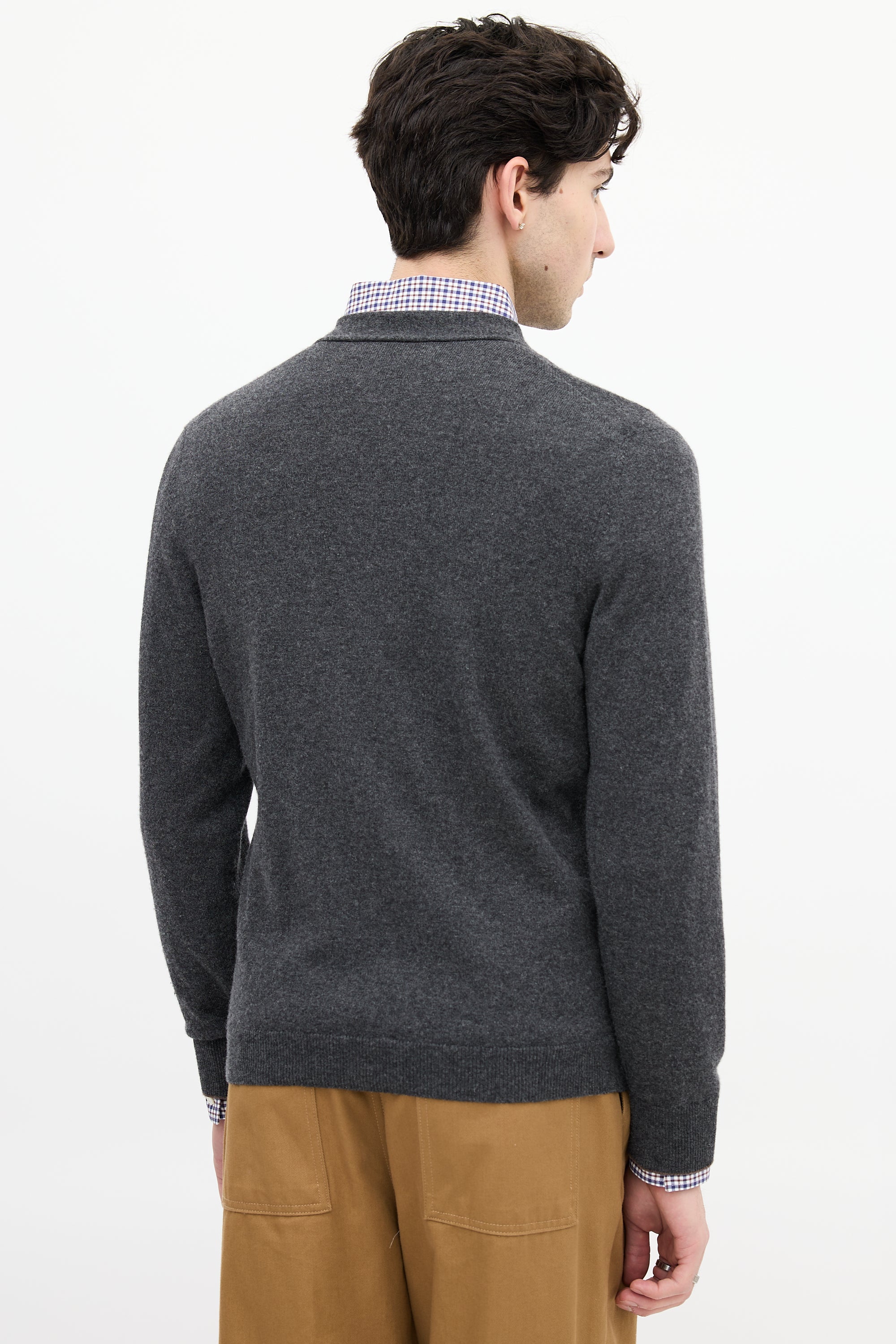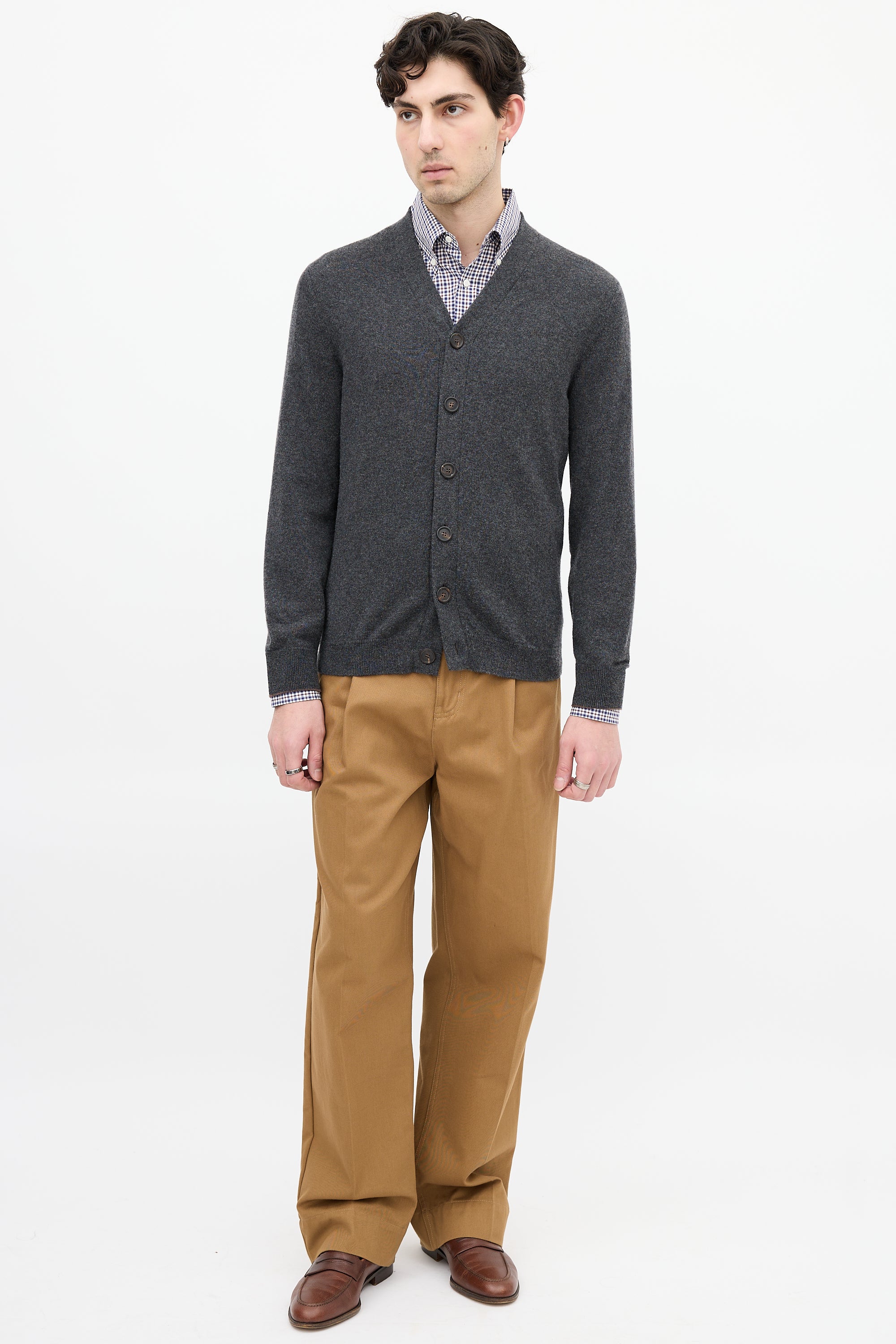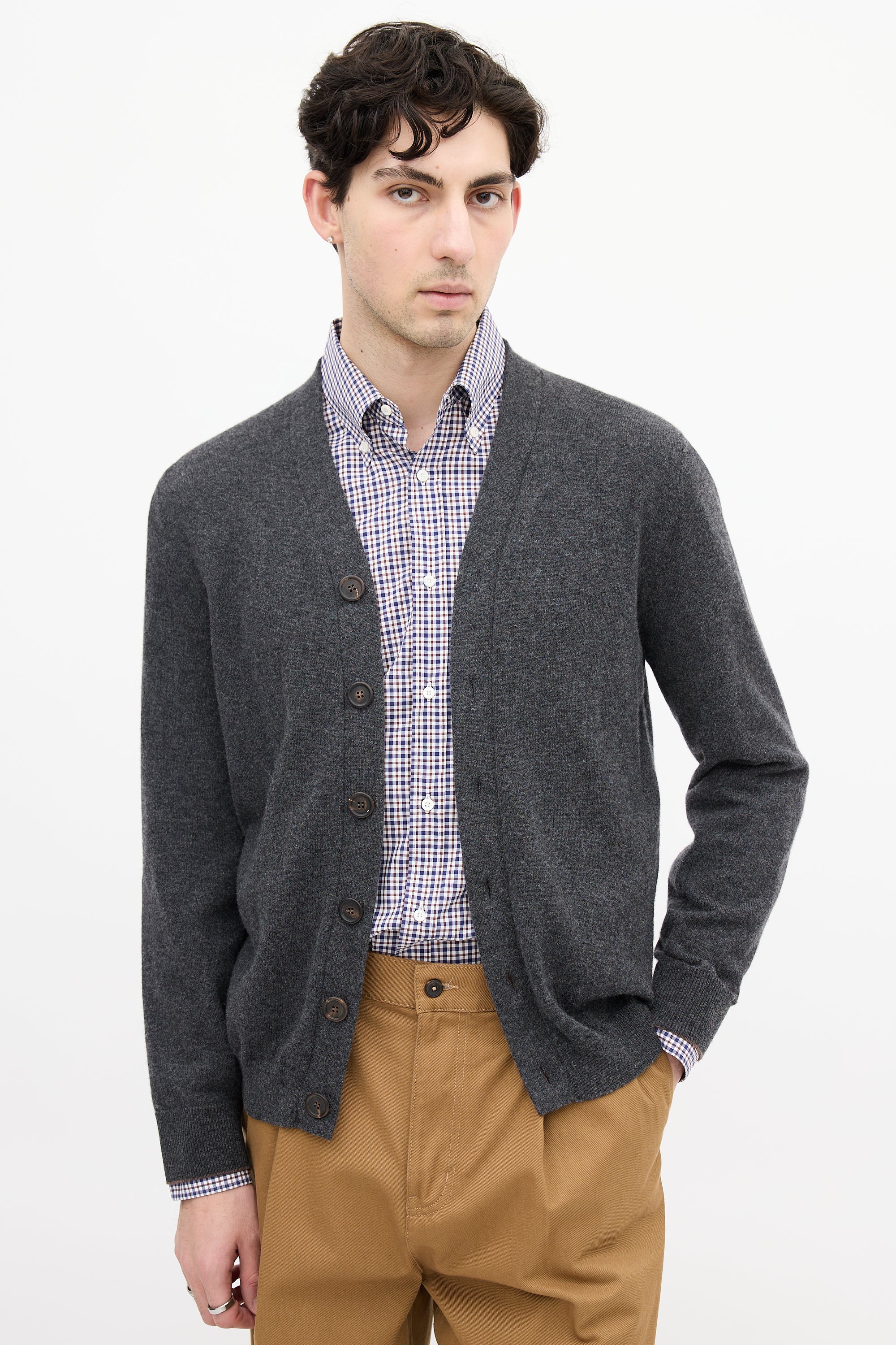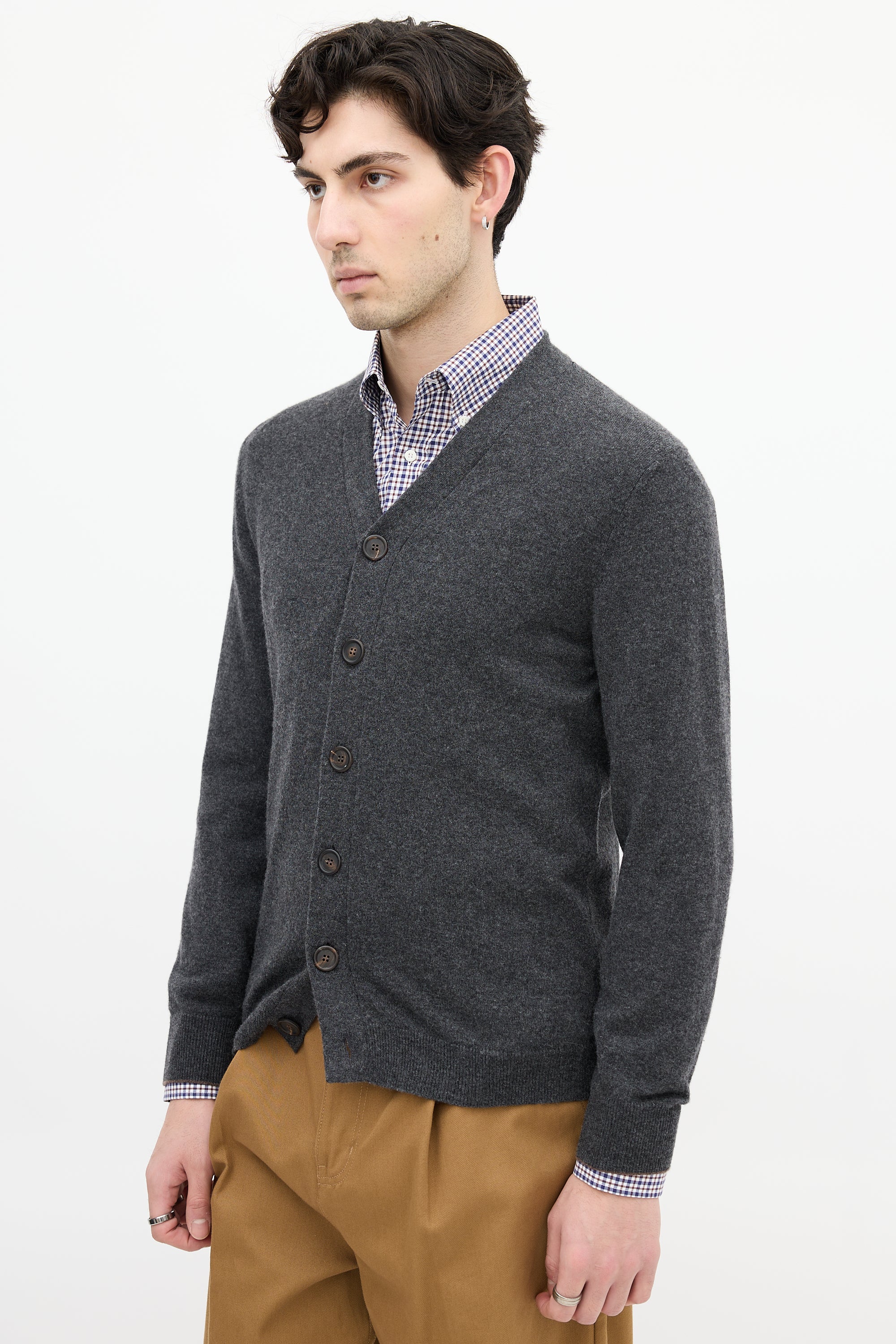 Pre-owned Brunello Cucinelli dark grey cashmere cardigan featuring a V-neckline, button up front closure, and ribbed hem and cuffs.
