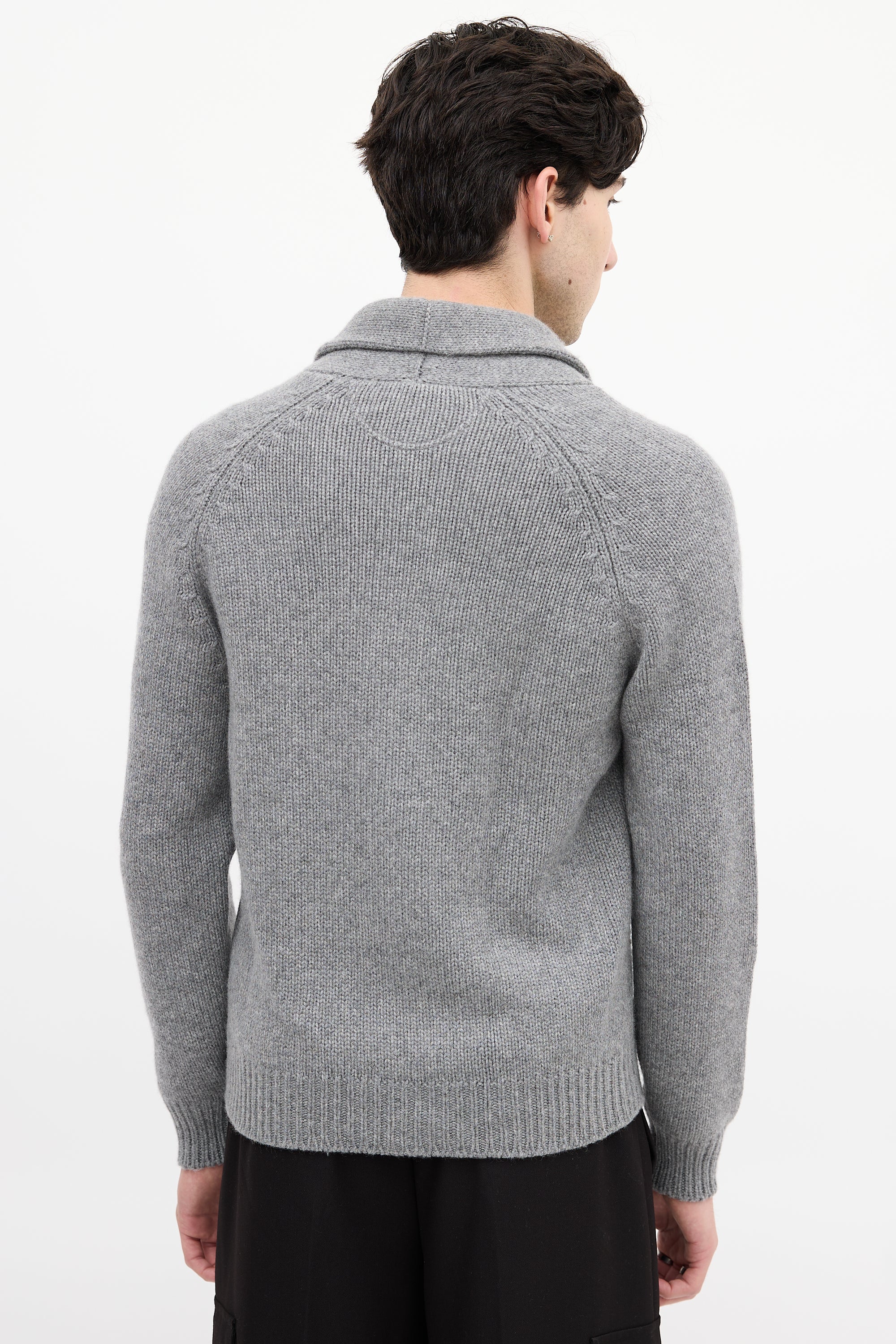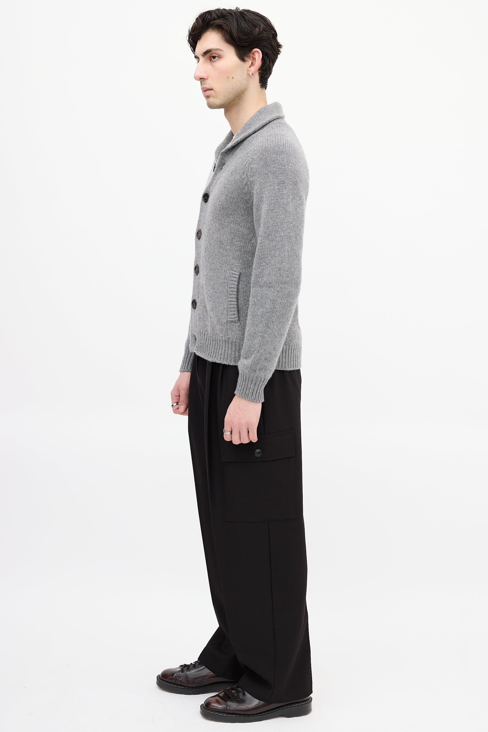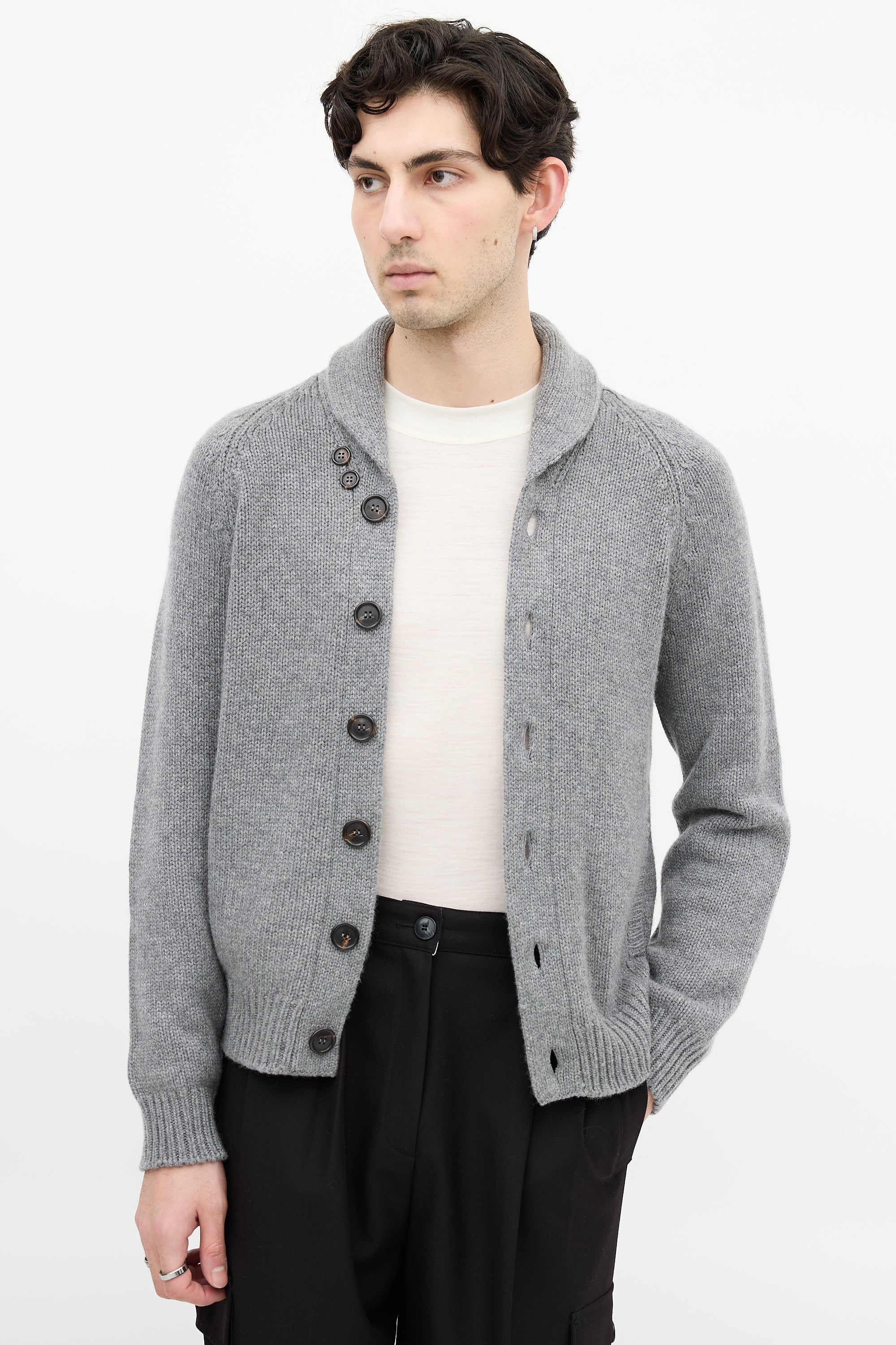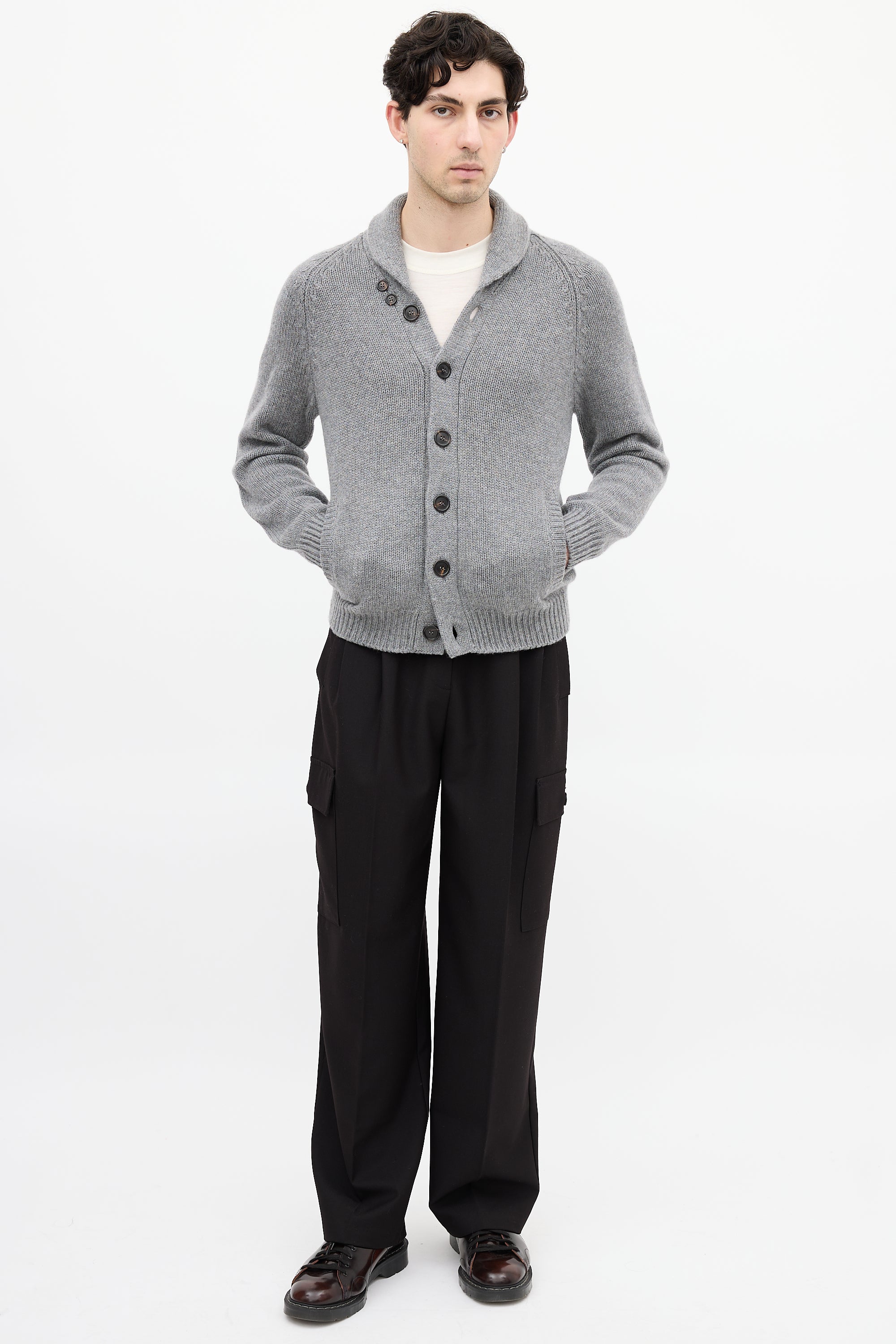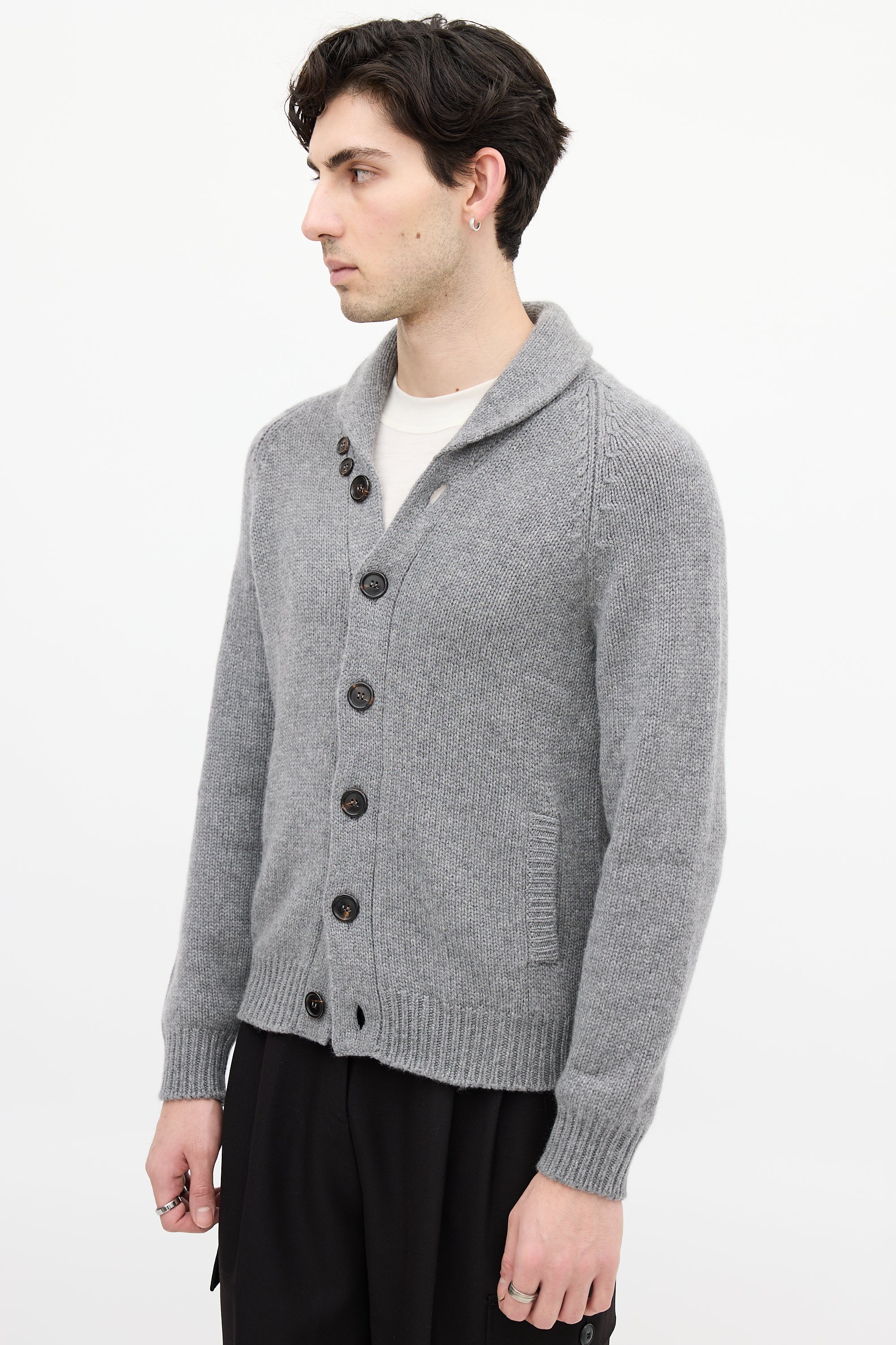 Pre-owned Brunello Cucinelli grey cashmere cardigan featuring a shawl collar, button up front closure, two front pockets, two interior pockets and ribbed exterior pocket edges, hem, and cuffs.