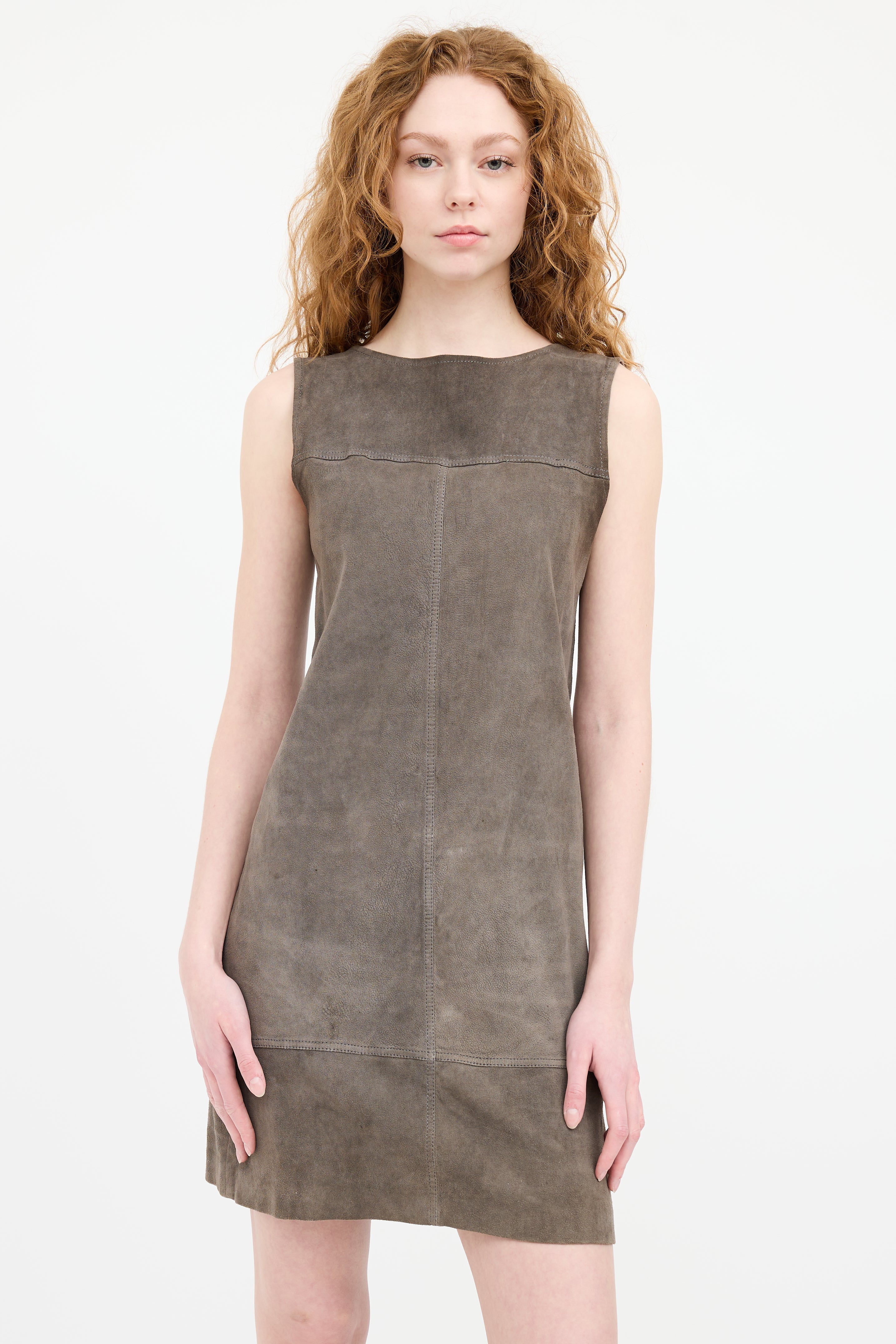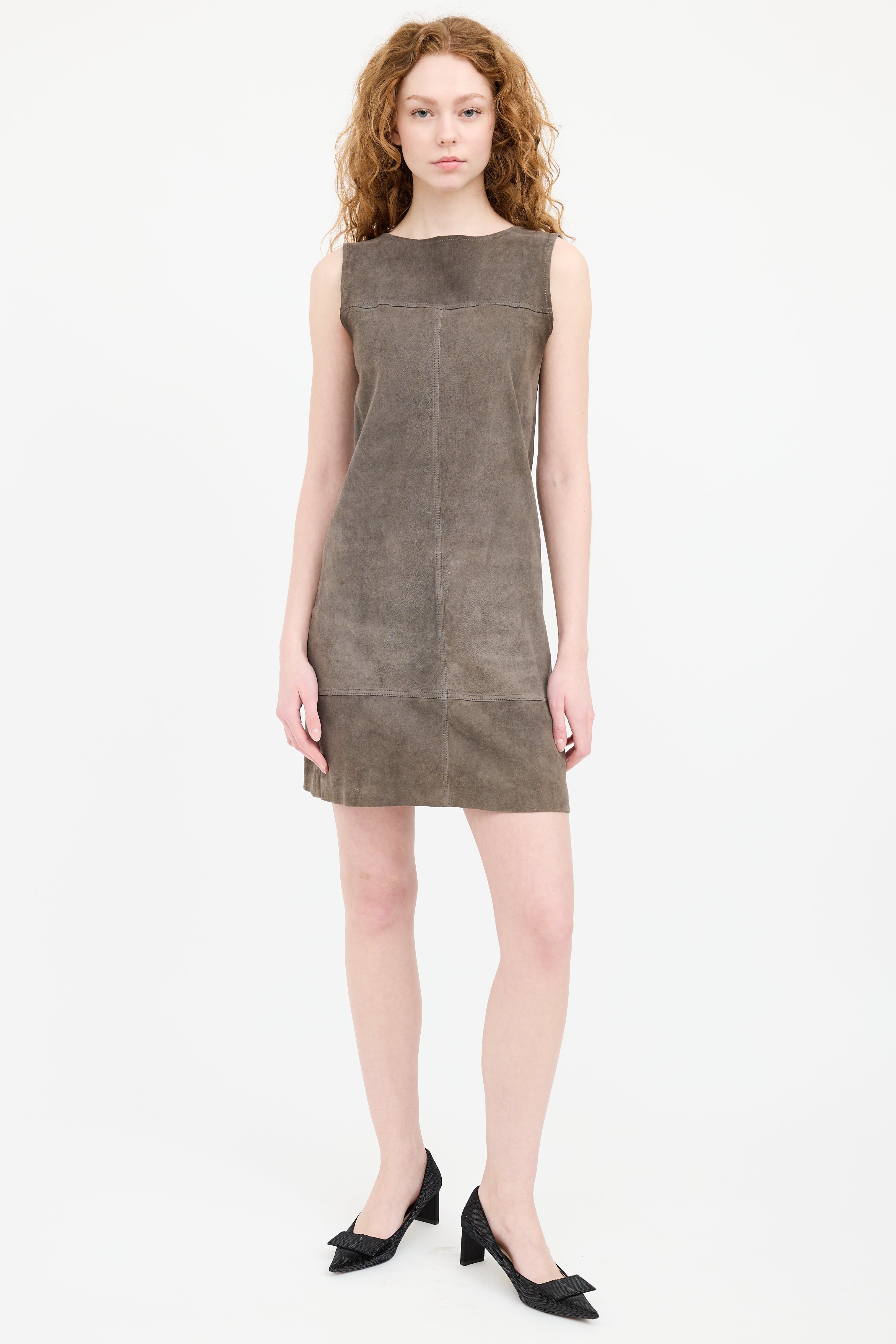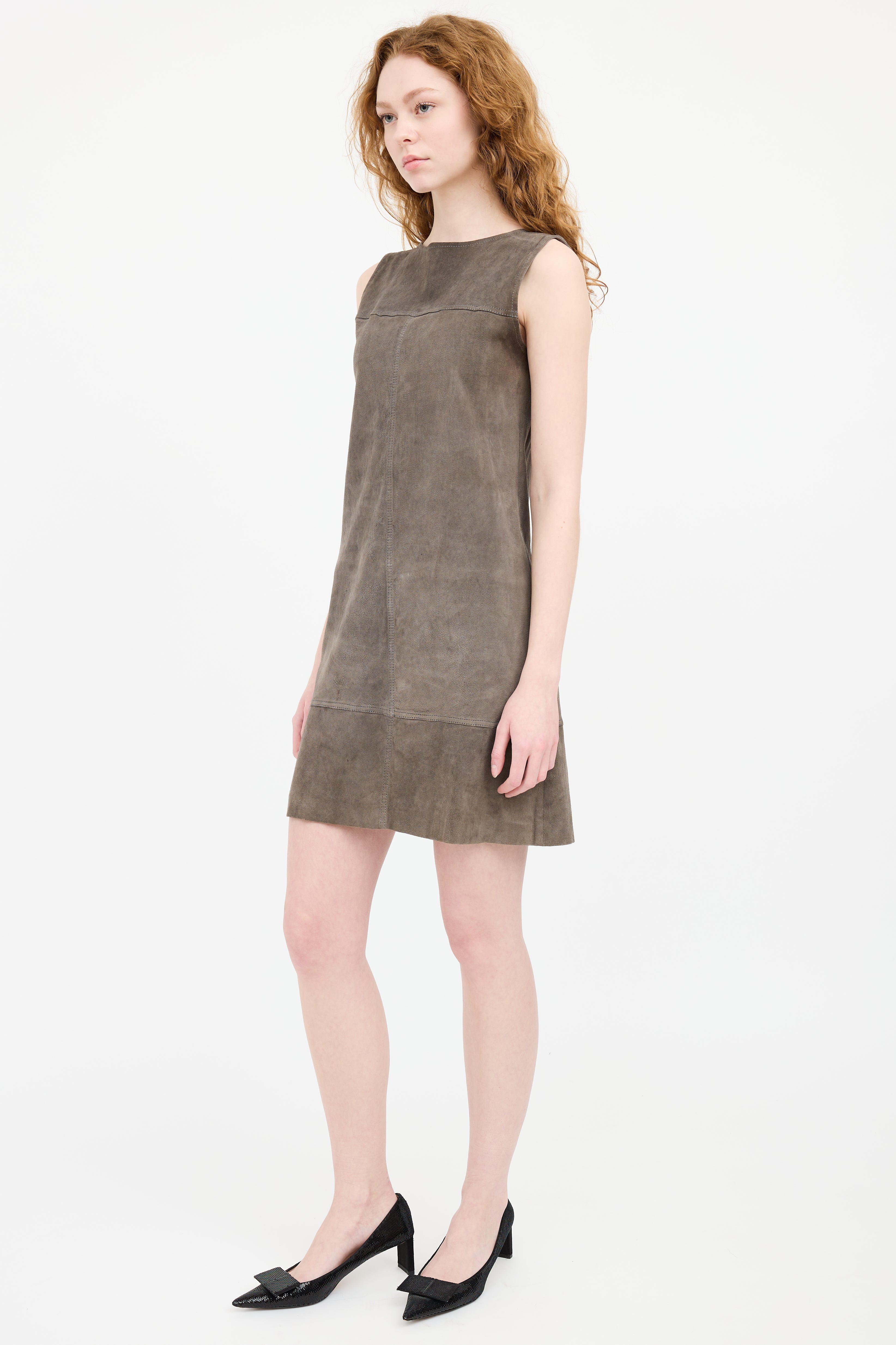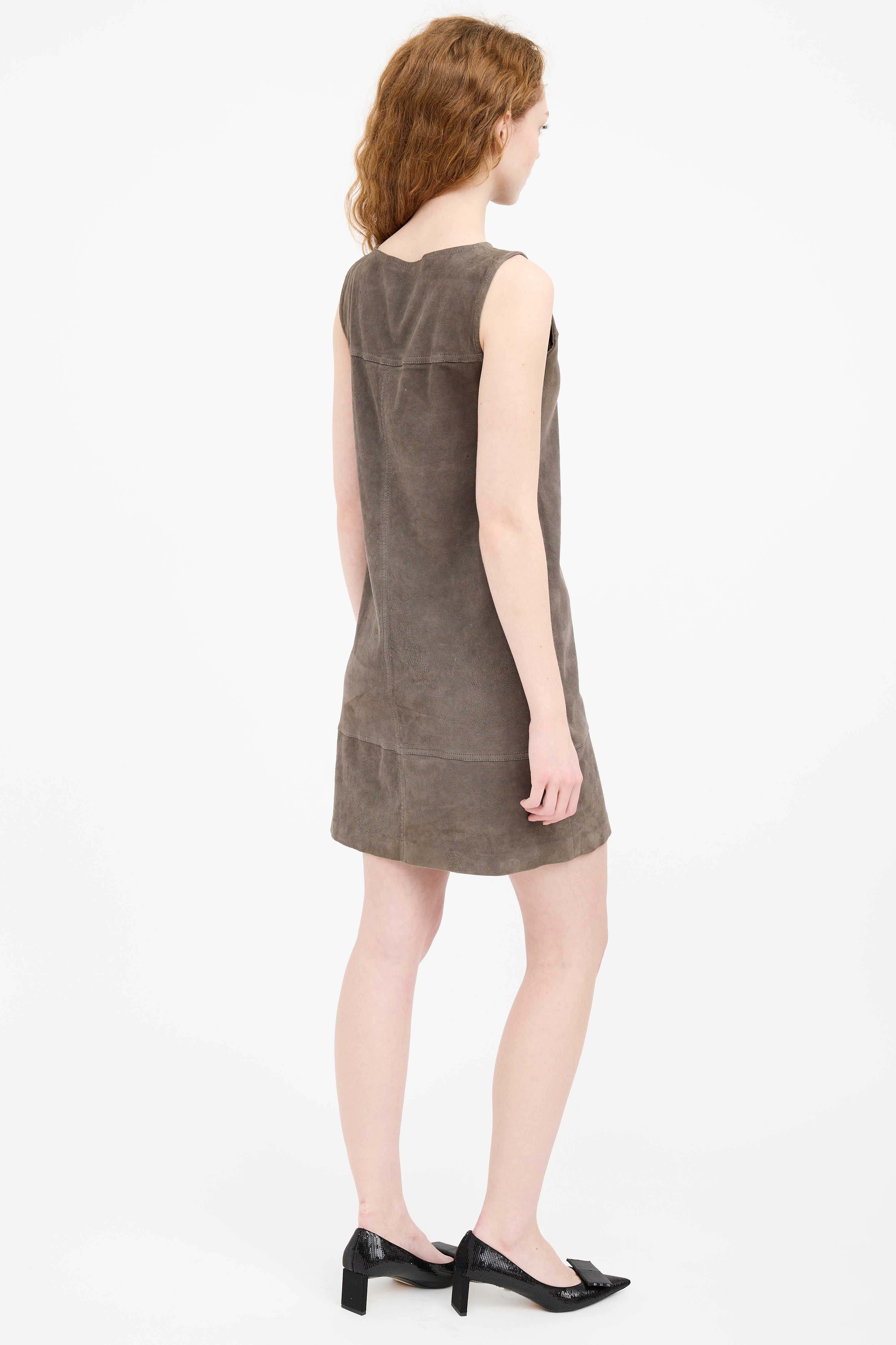 Pre-owned Brunello Cucinelli grey suede sleeveless dress featuring a round neckline, and panelled seams.