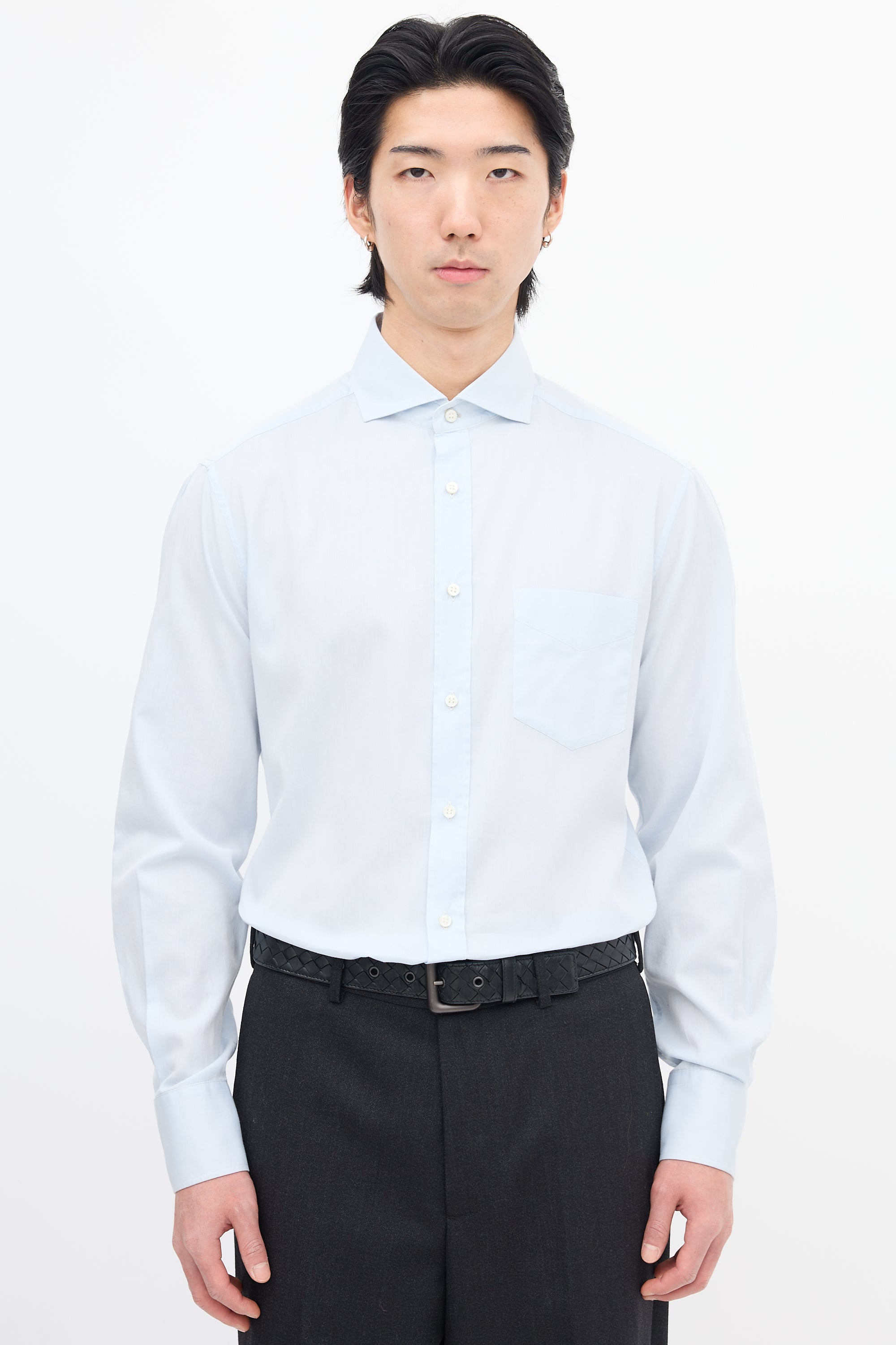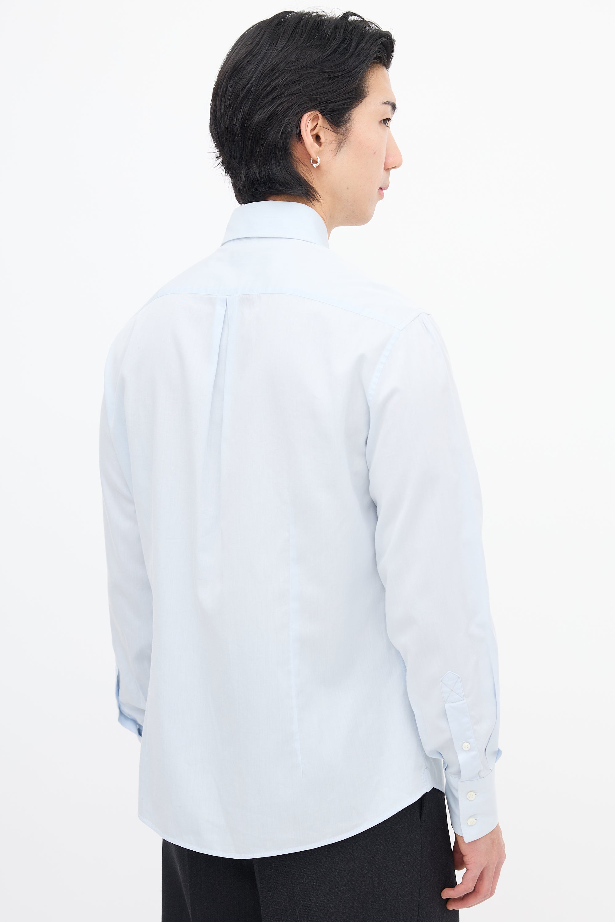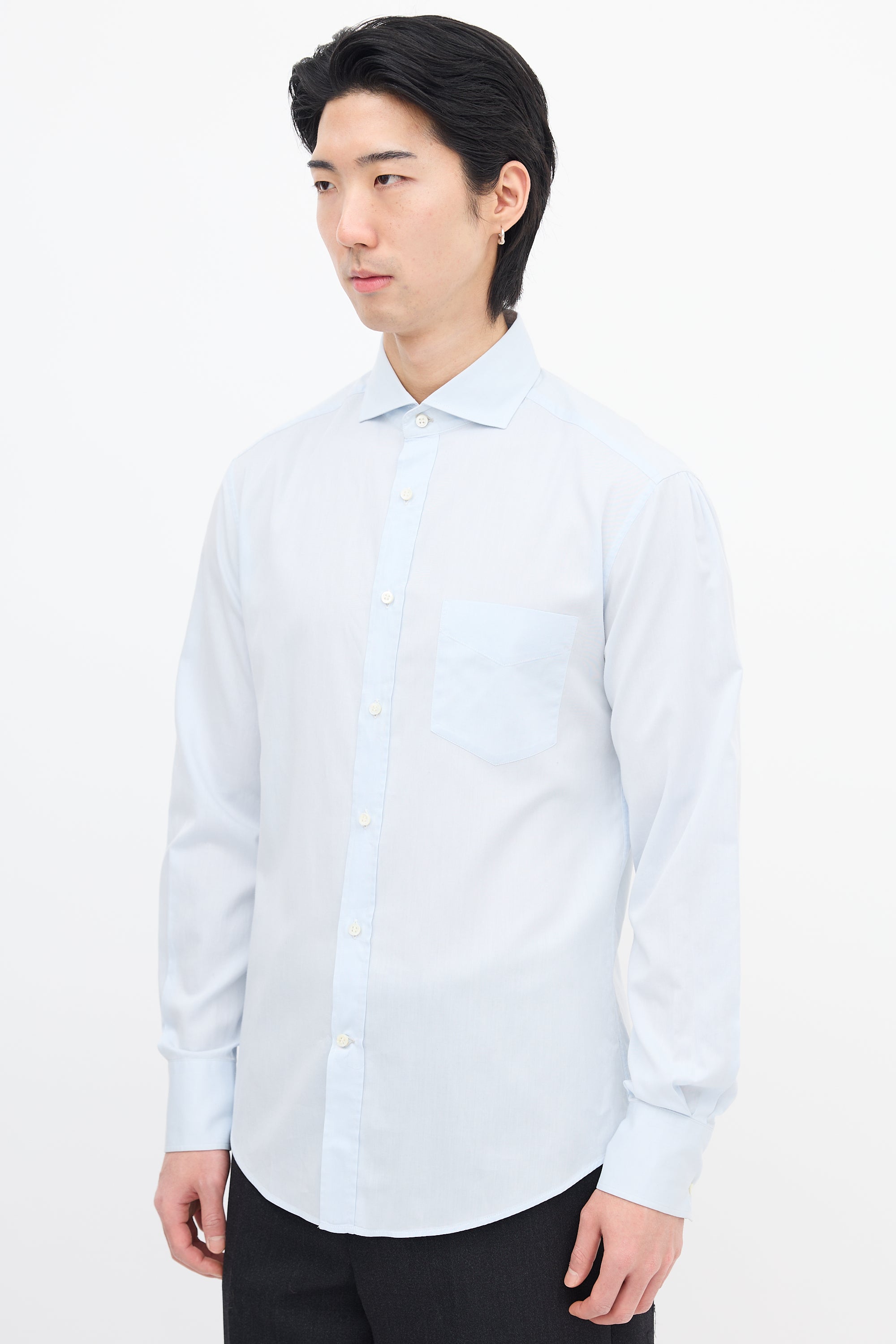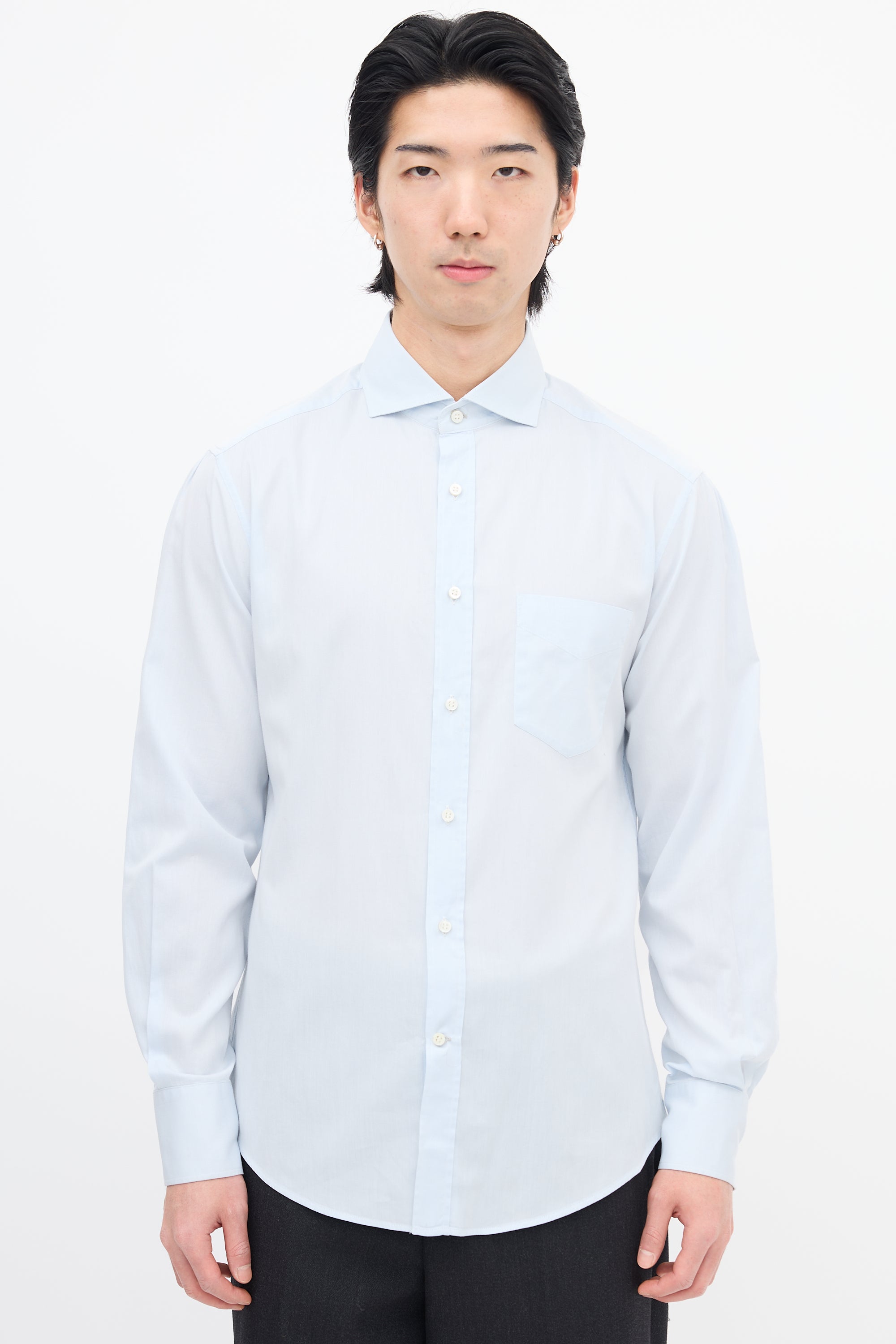 Pre-owned Brunello Cucinelli light blue shirt featuring a spread collar, button up front, patch pocket at left chest, pleated back yoke, and pleated and buttoned cuffs.