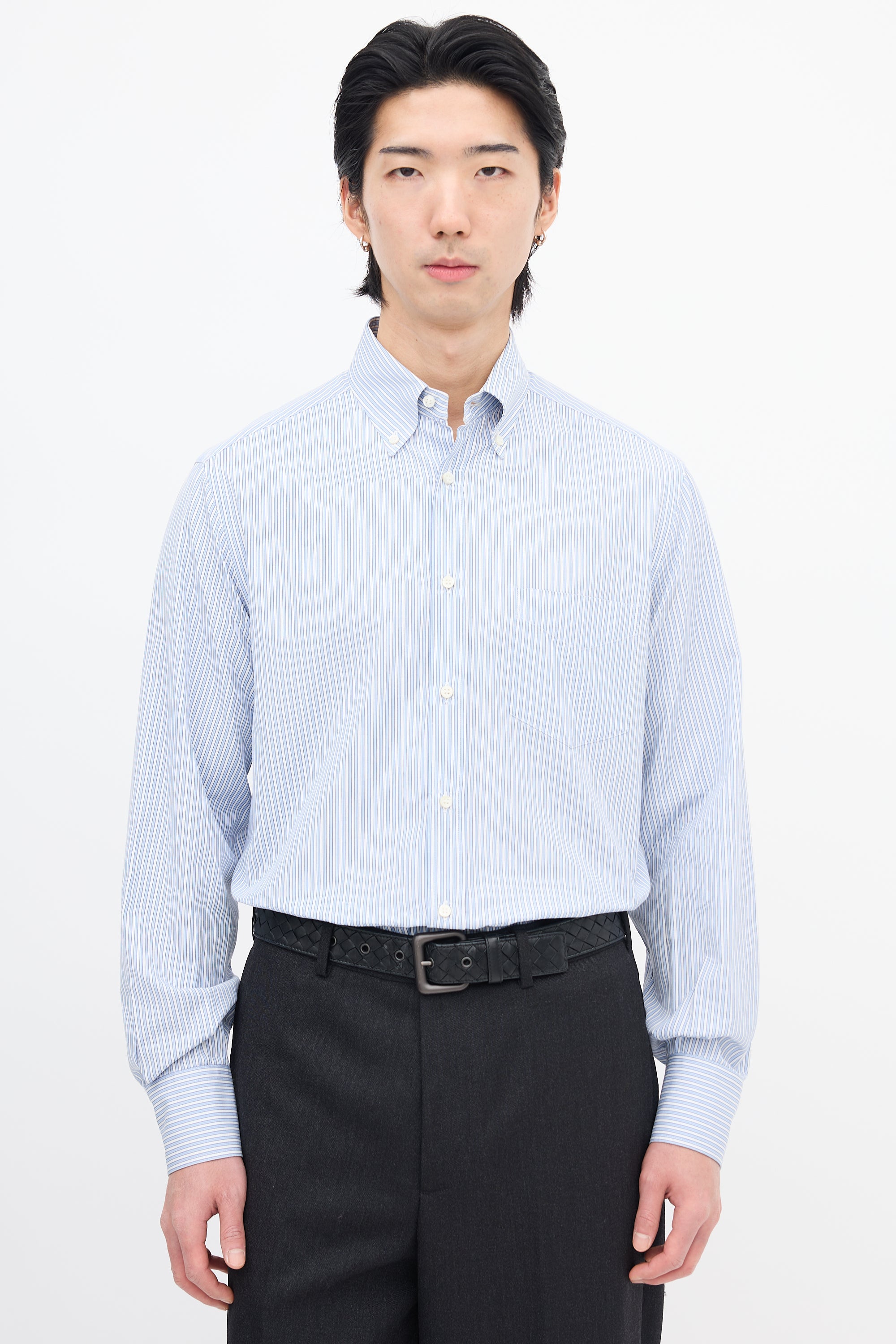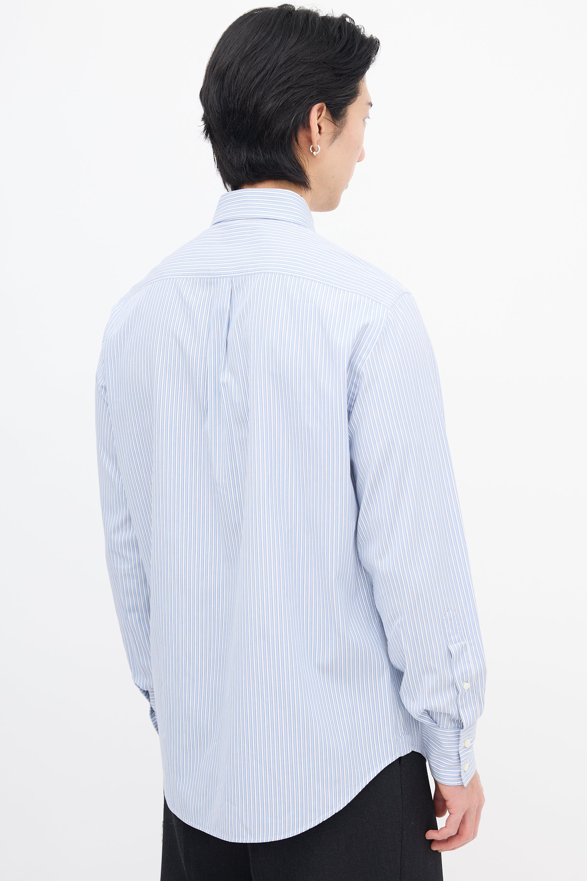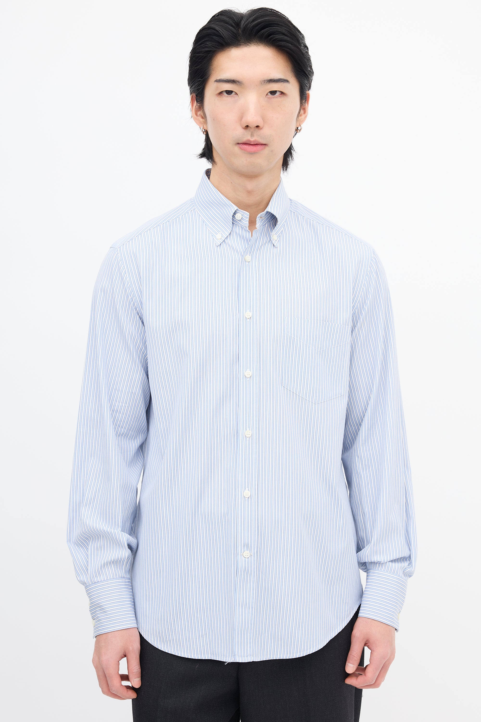 Pre-owned Brunello Cucinelli light blue and white shirt featuring a pinstripe pattern, buttoned point collar, button up front, patch pocket at left chest, pleated back yoke, and pleated and buttoned cuffs.