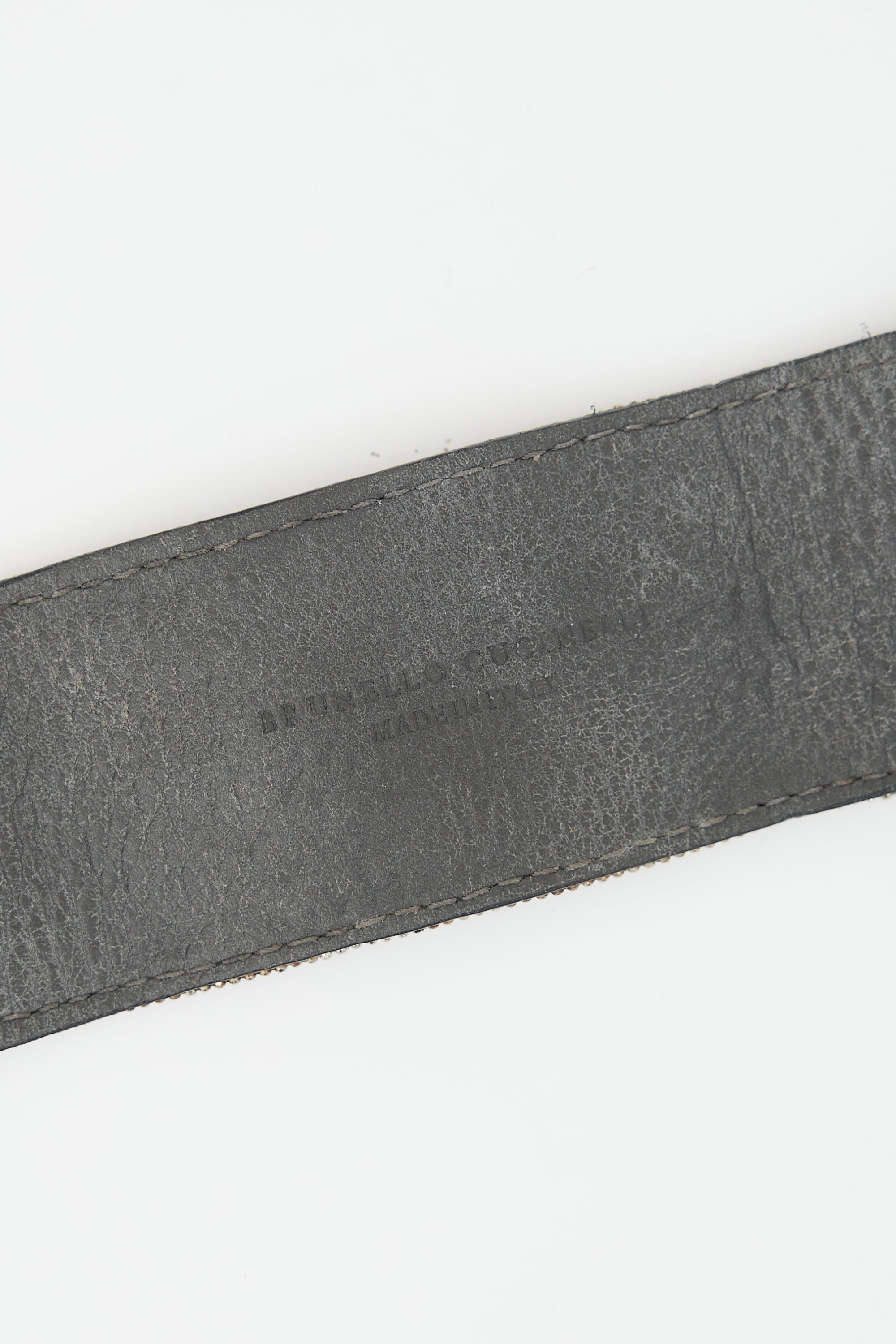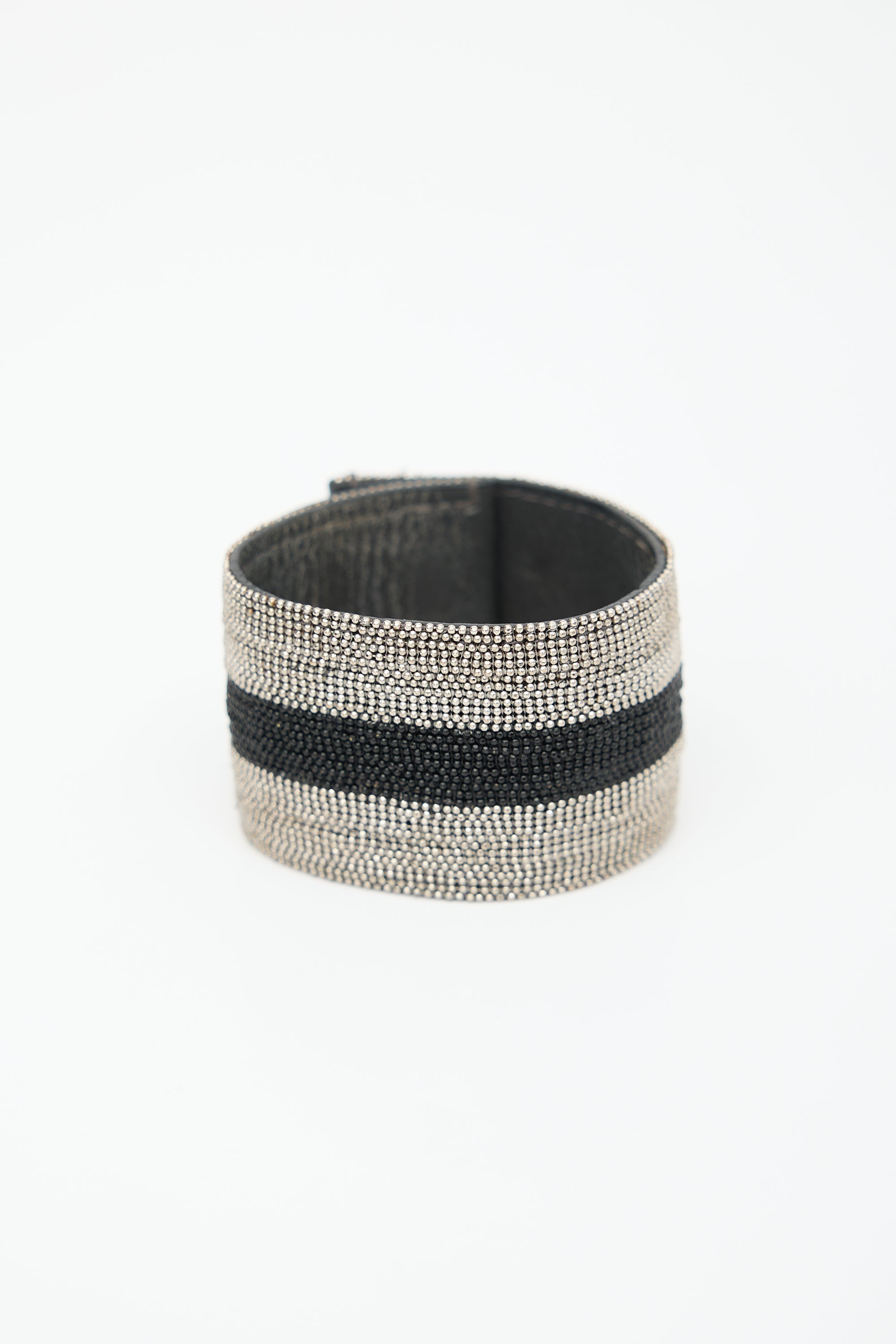 Pre-owned Brunello Cucinelli grey leather cuff bracelet featuring silver tone and black Monili beaded surface, stripe design, stamped logo at reverse, and snap button closure.