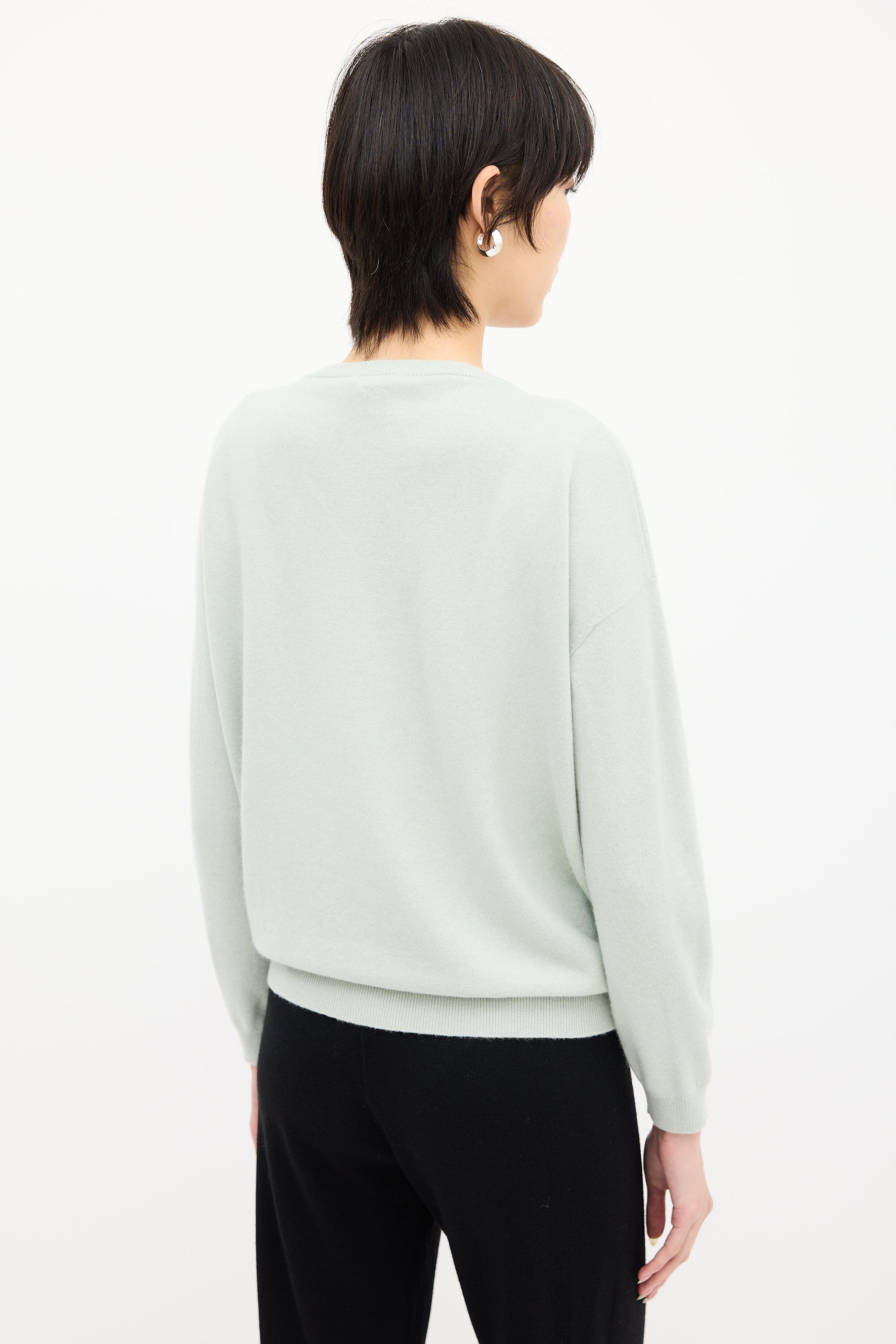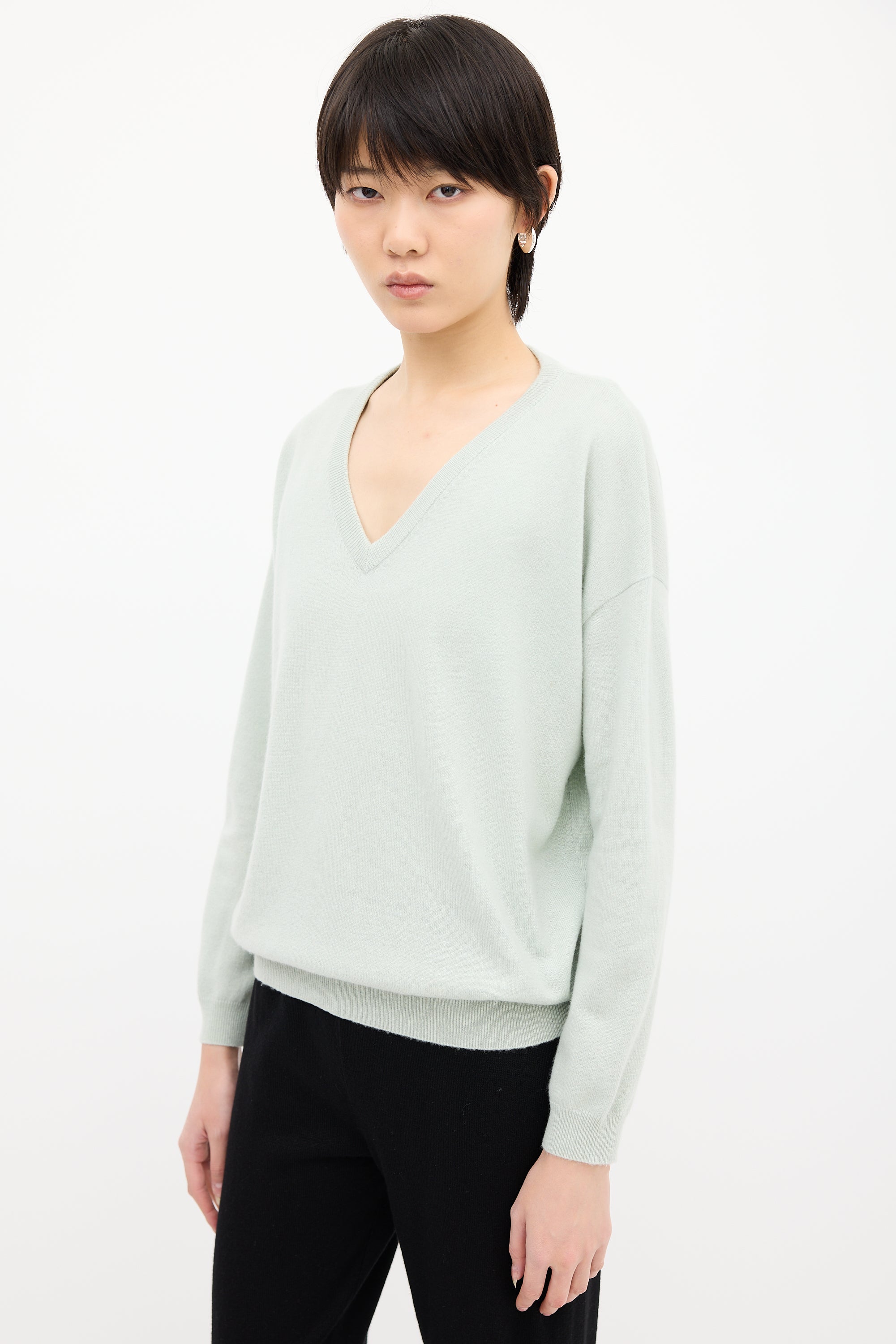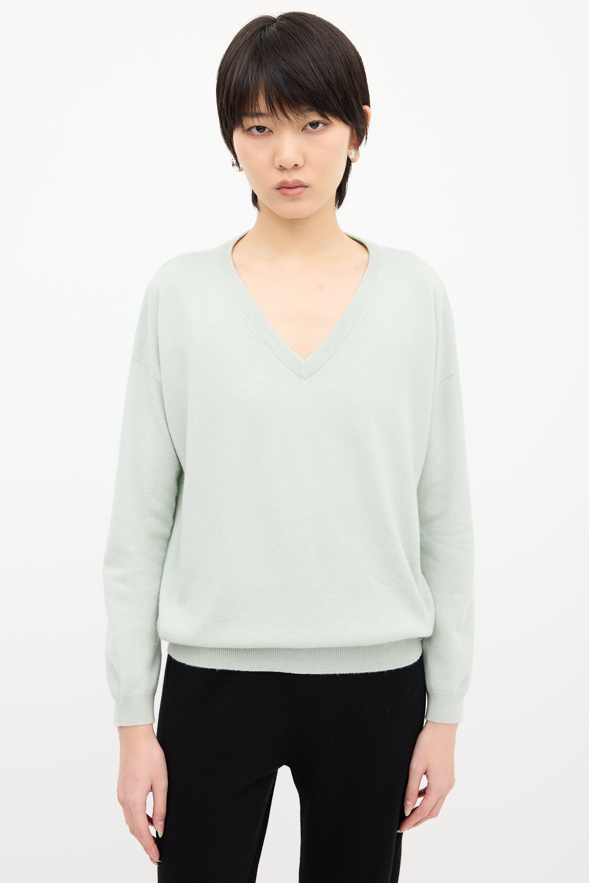 Pre-owned Brunello Cucinelli pastel green cashmere sweater featuring V-neckline, ribbed hem and cuffs, and drop shoulders.