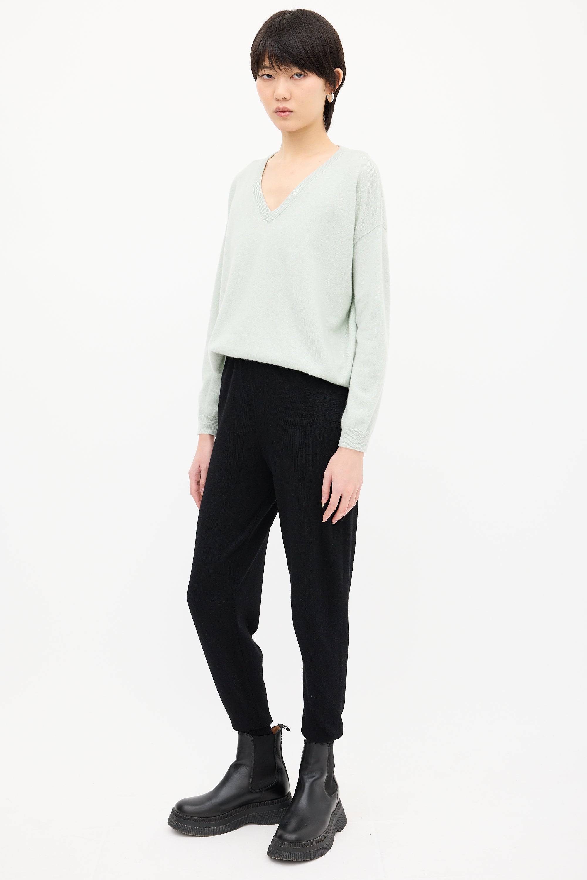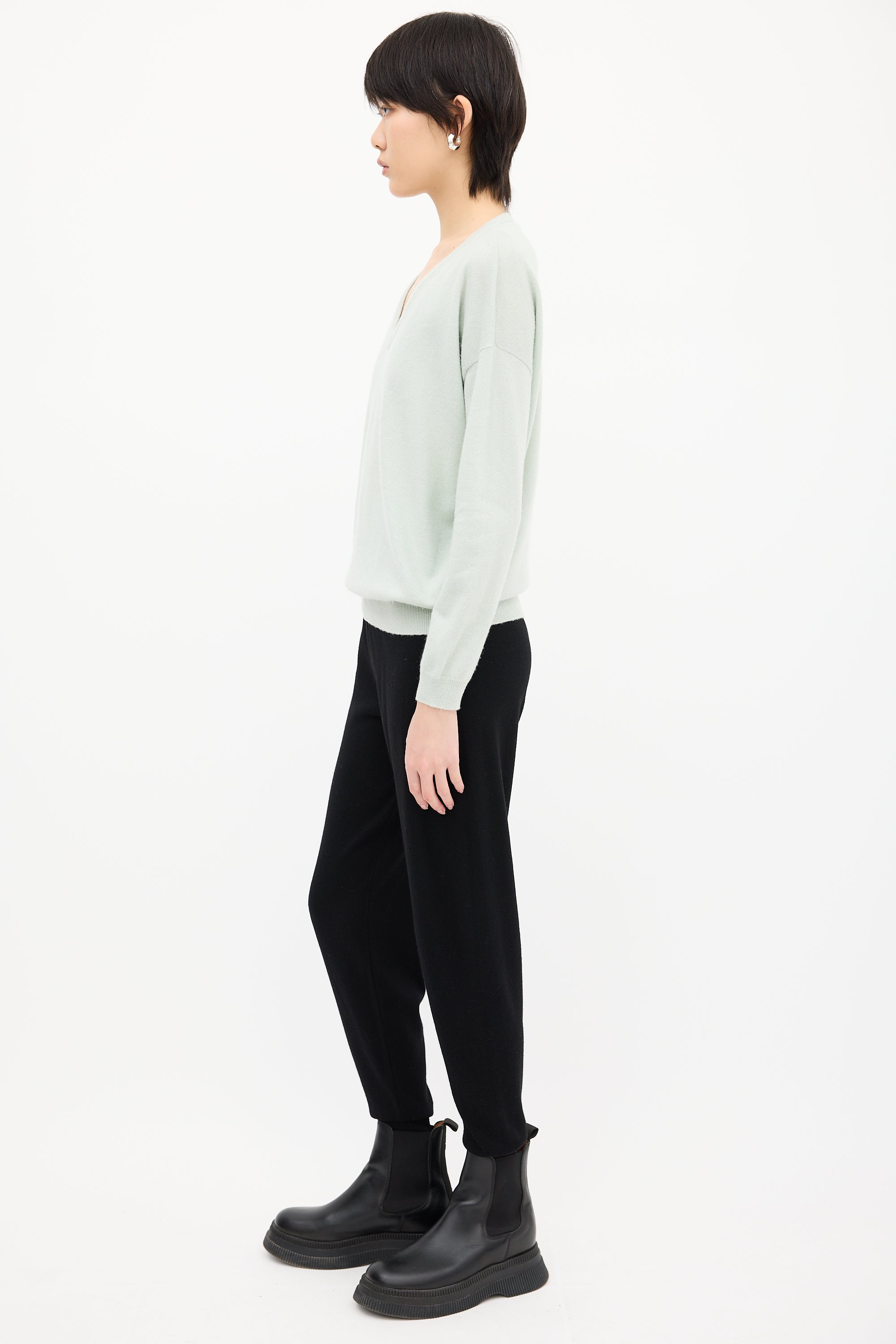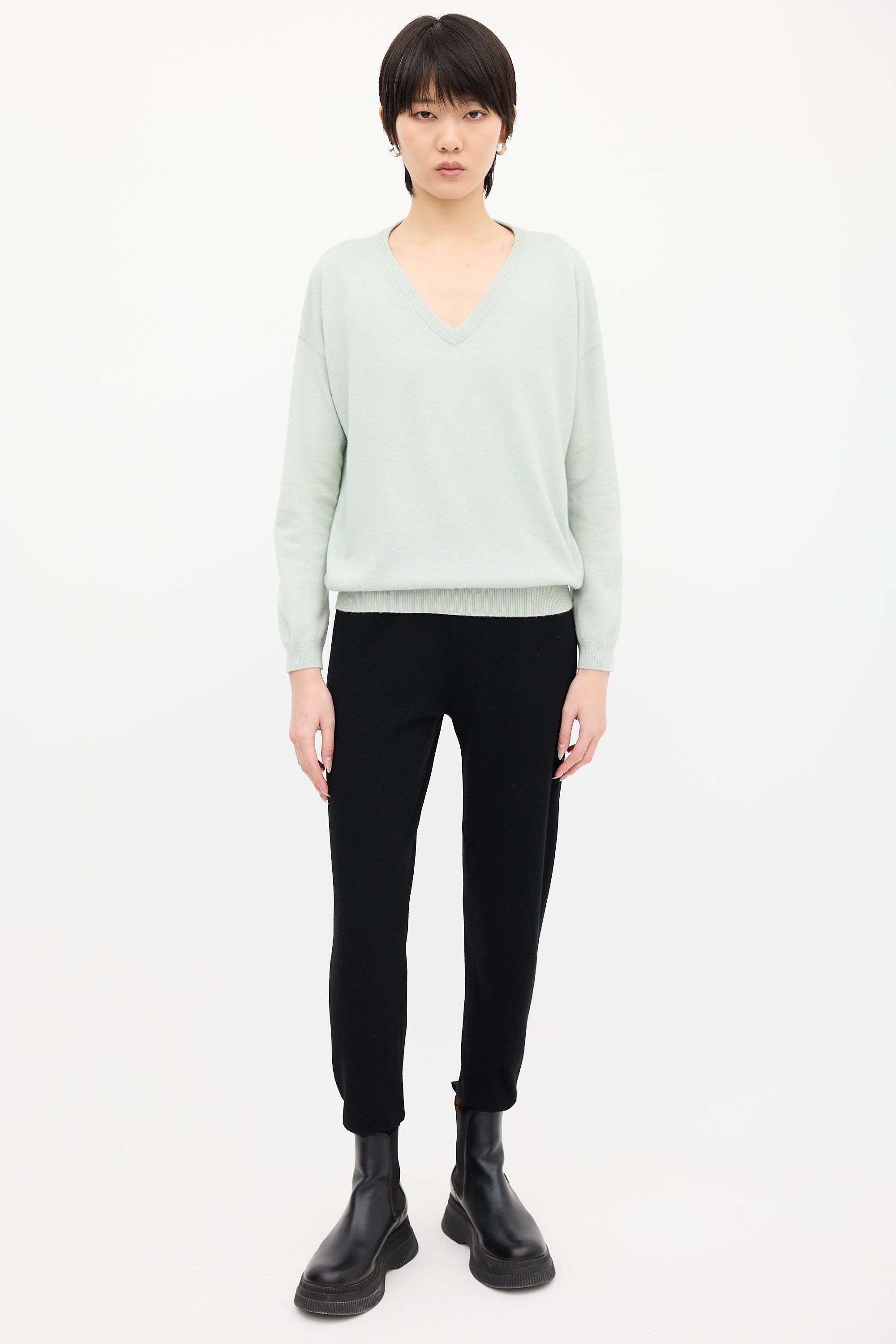 Pre-owned Brunello Cucinelli pastel green cashmere sweater featuring V-neckline, ribbed hem and cuffs, and drop shoulders.