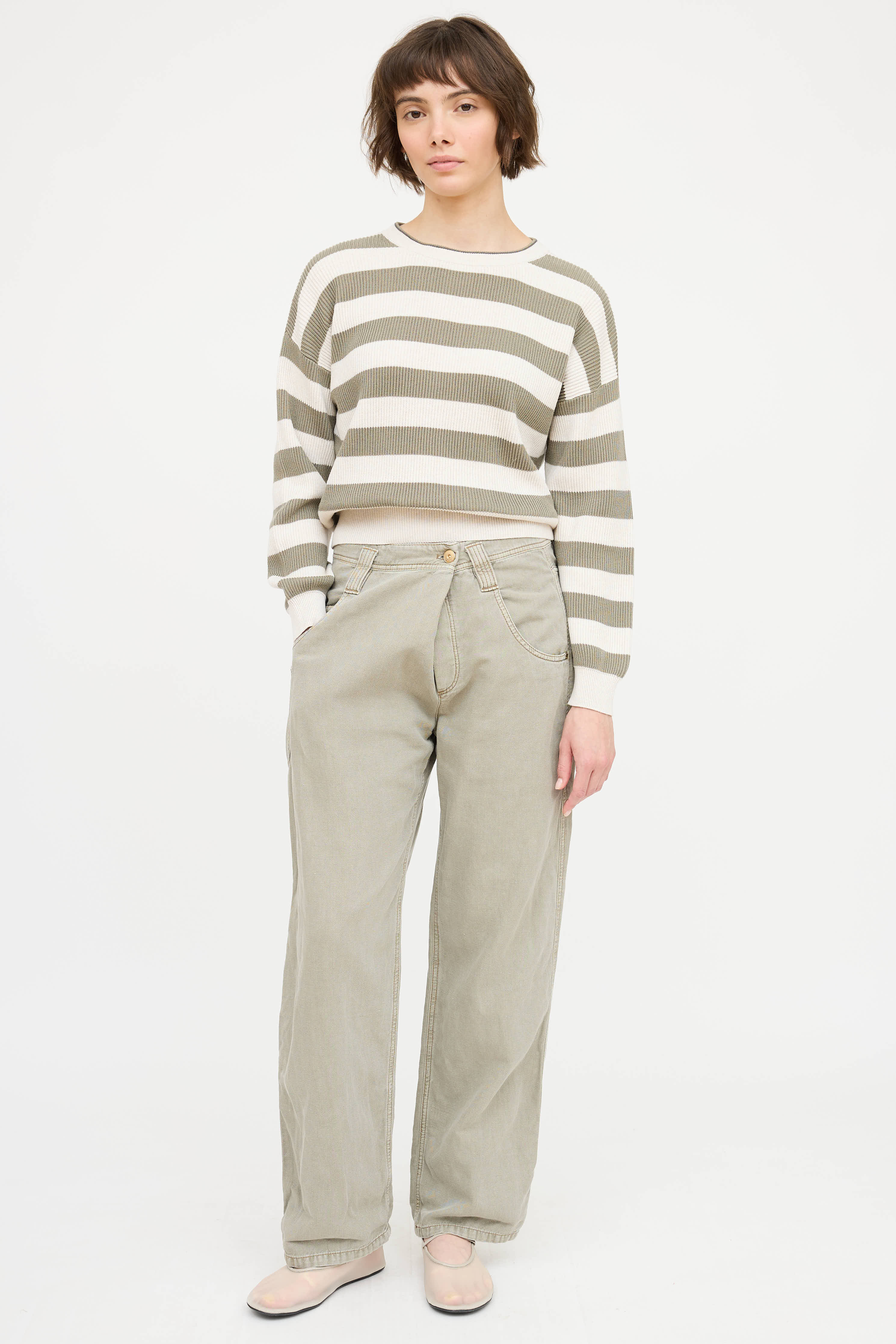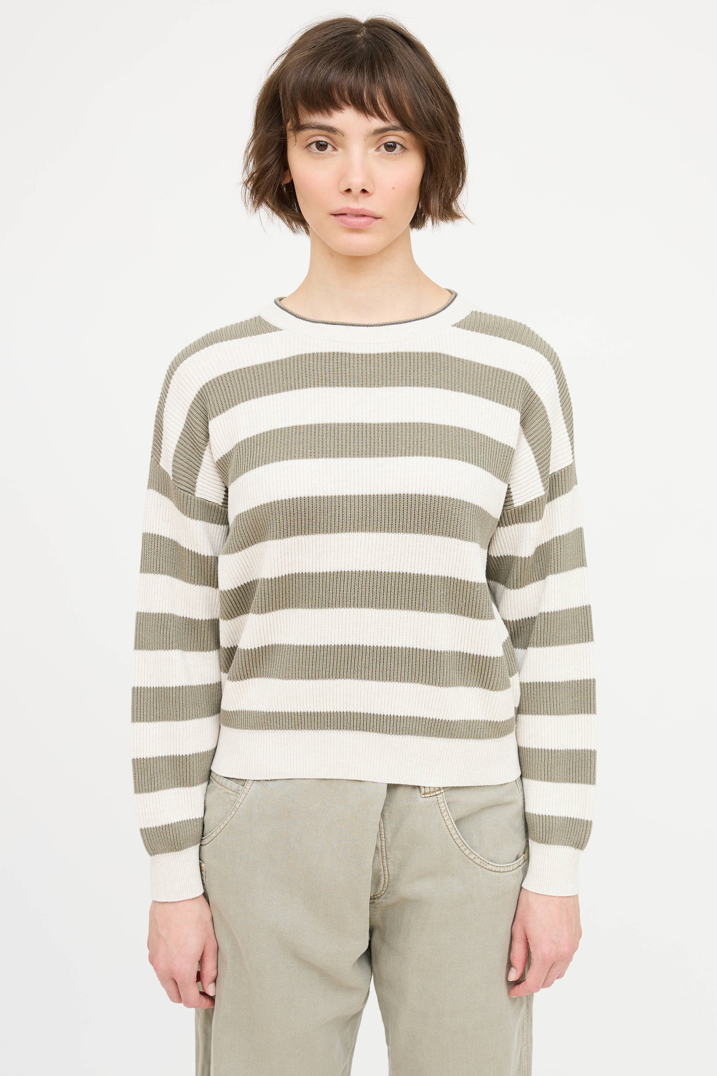 Pre-owned Brunello Cucinelli green and cream knit sweater featuring a crew neckline with Monili bead detailing, long sleeves with ribbed cuffs, and ribbed hemline.