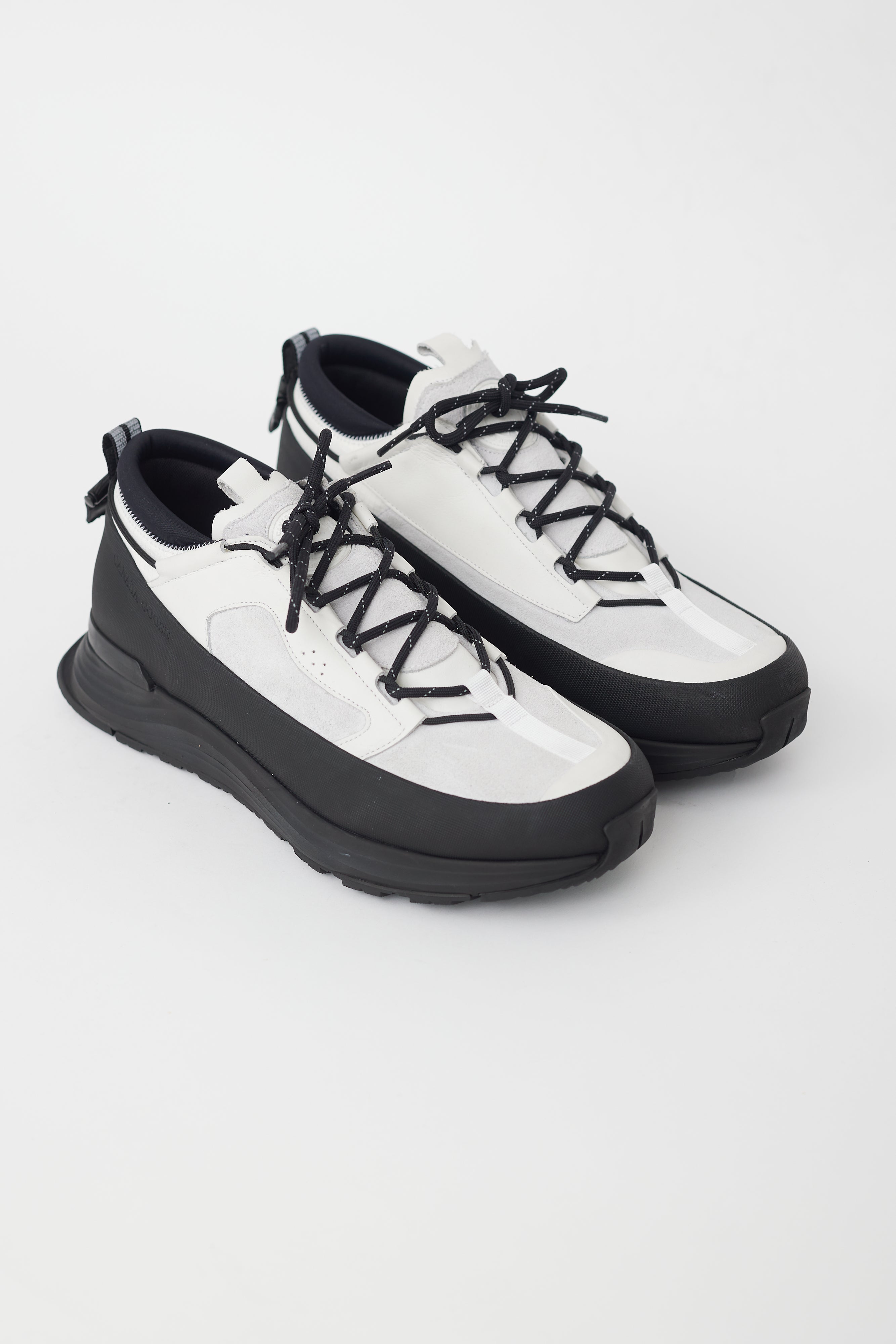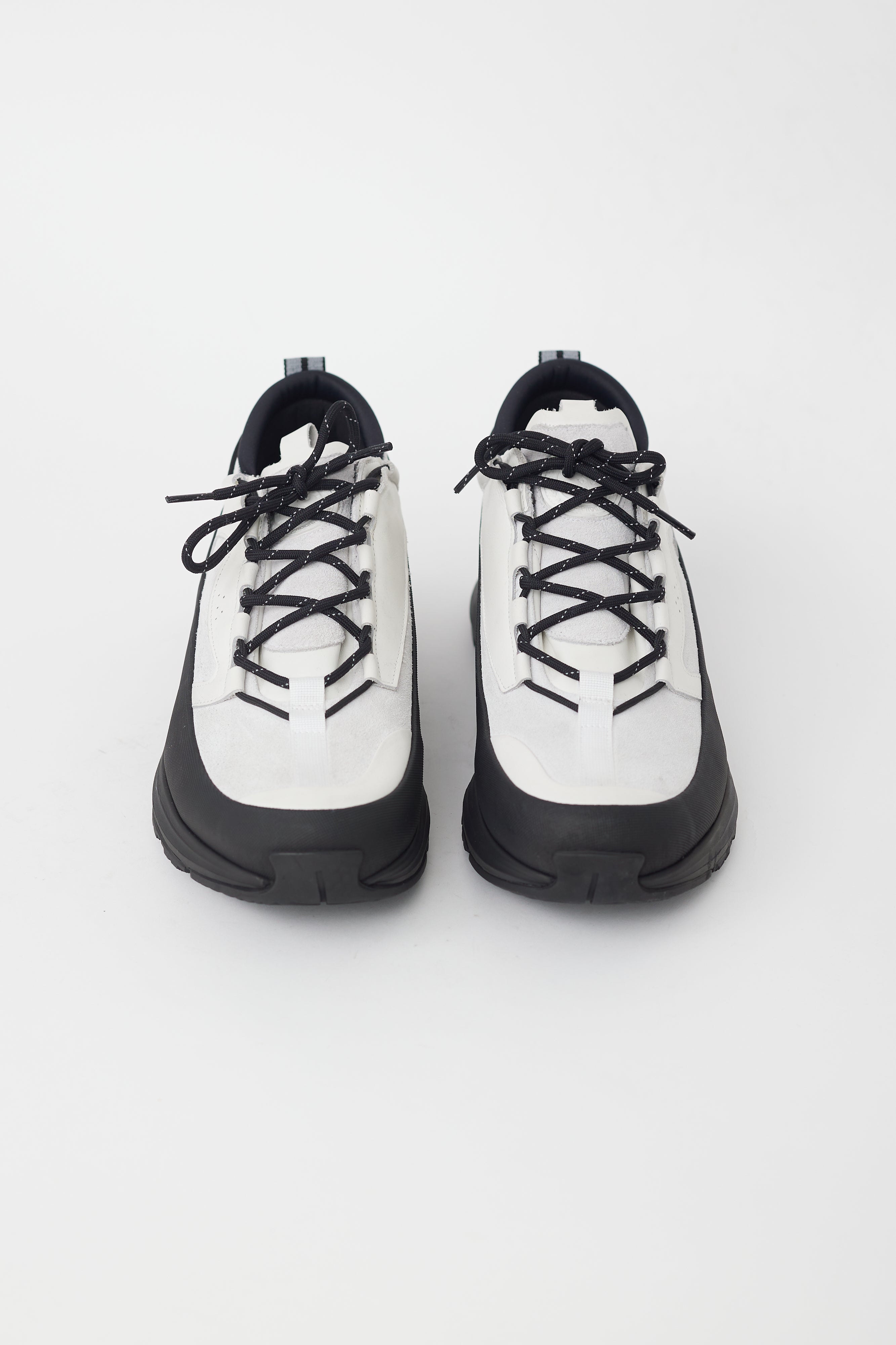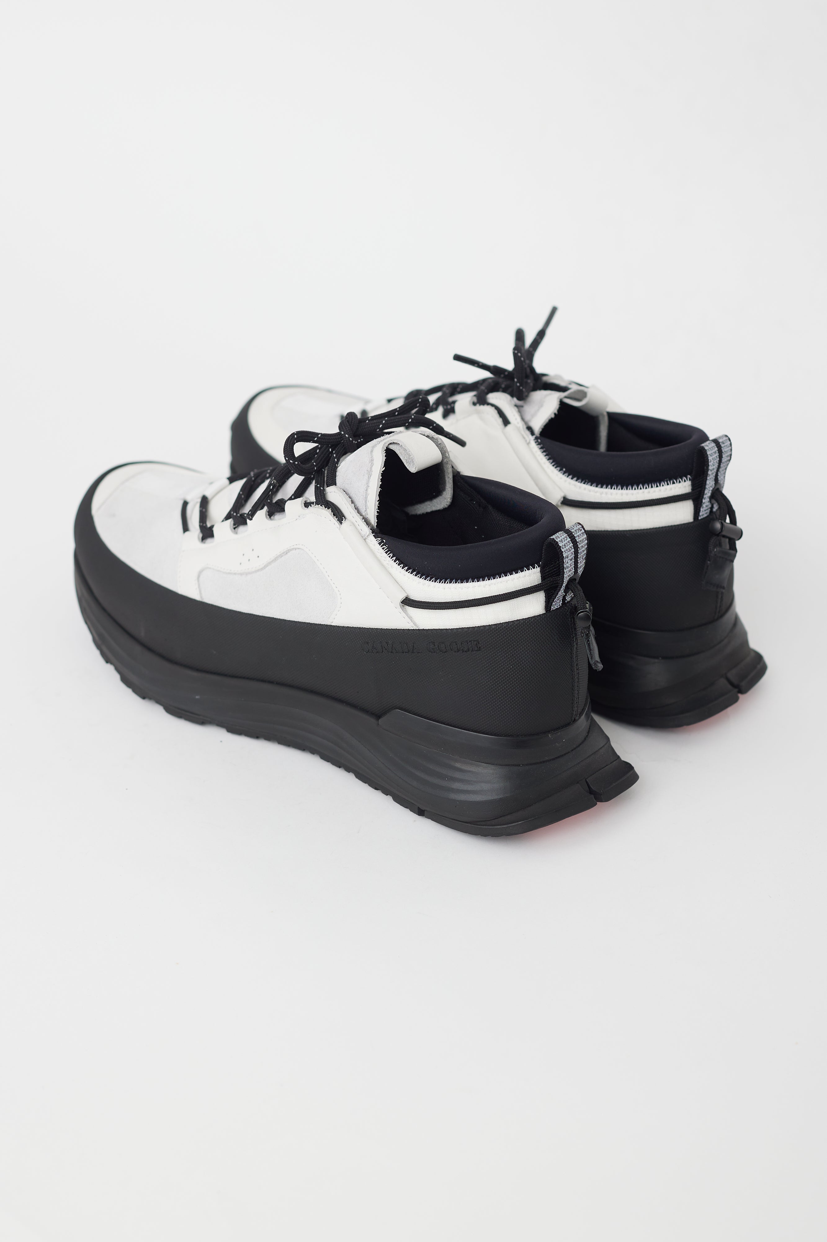Pre-owned Canada Goose white and black Glacier Trail sneakers featuring round toe, black and white lace up front, elongated black rubber midsole, grey suede panels and white leather panels at upper, pull loop at counter, embossed tonal logo at side, white logo patch at tongue, and leather insoles.