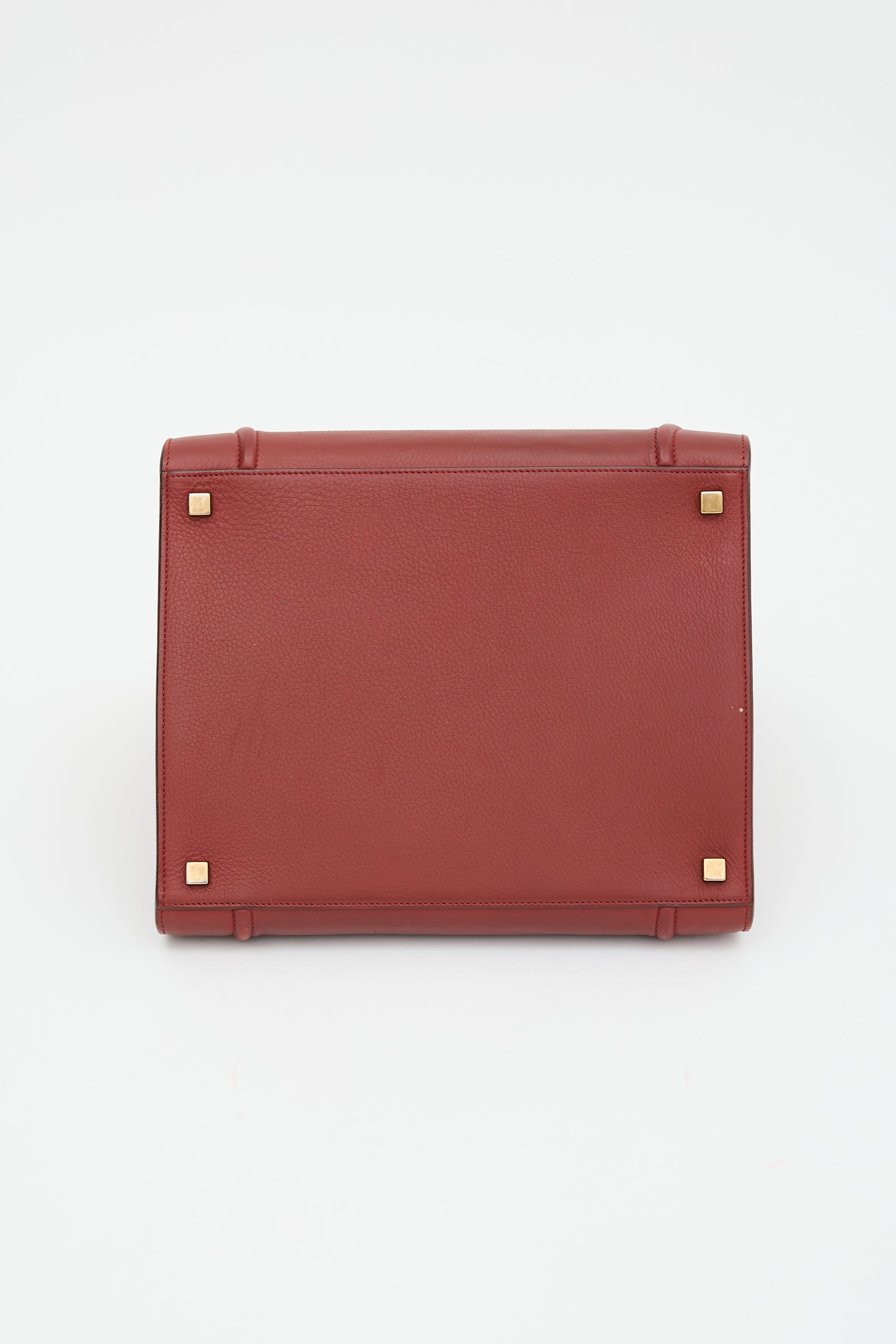 Pre-owned Celine 2016 burgundy leather Medium Phantom Luggage tote bag featuring dual rolled top handles, debossed logo at top front face, front zip pocket with braided zip pull, open top with adjustable strap closure, and one main compartment with one zip pocket.