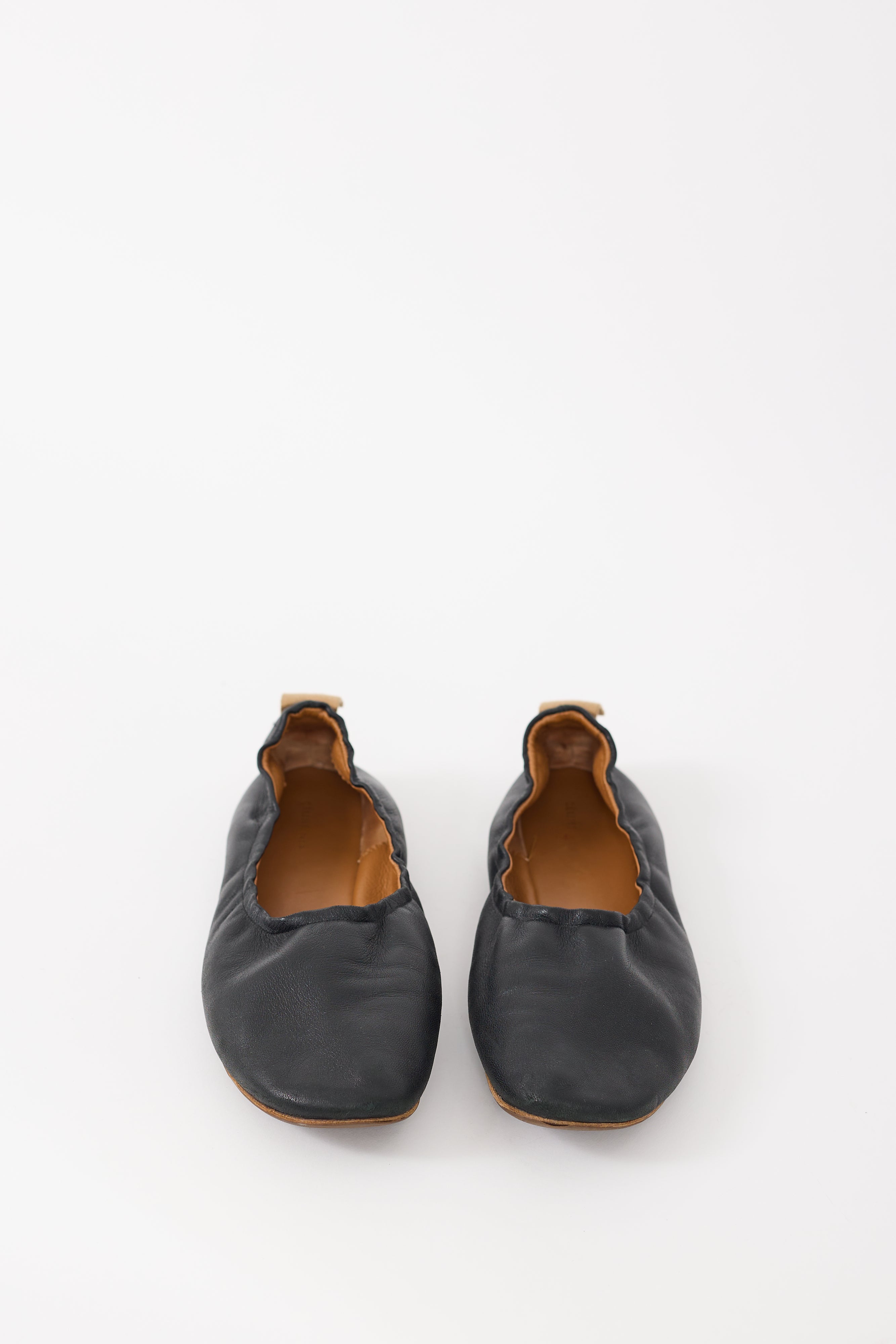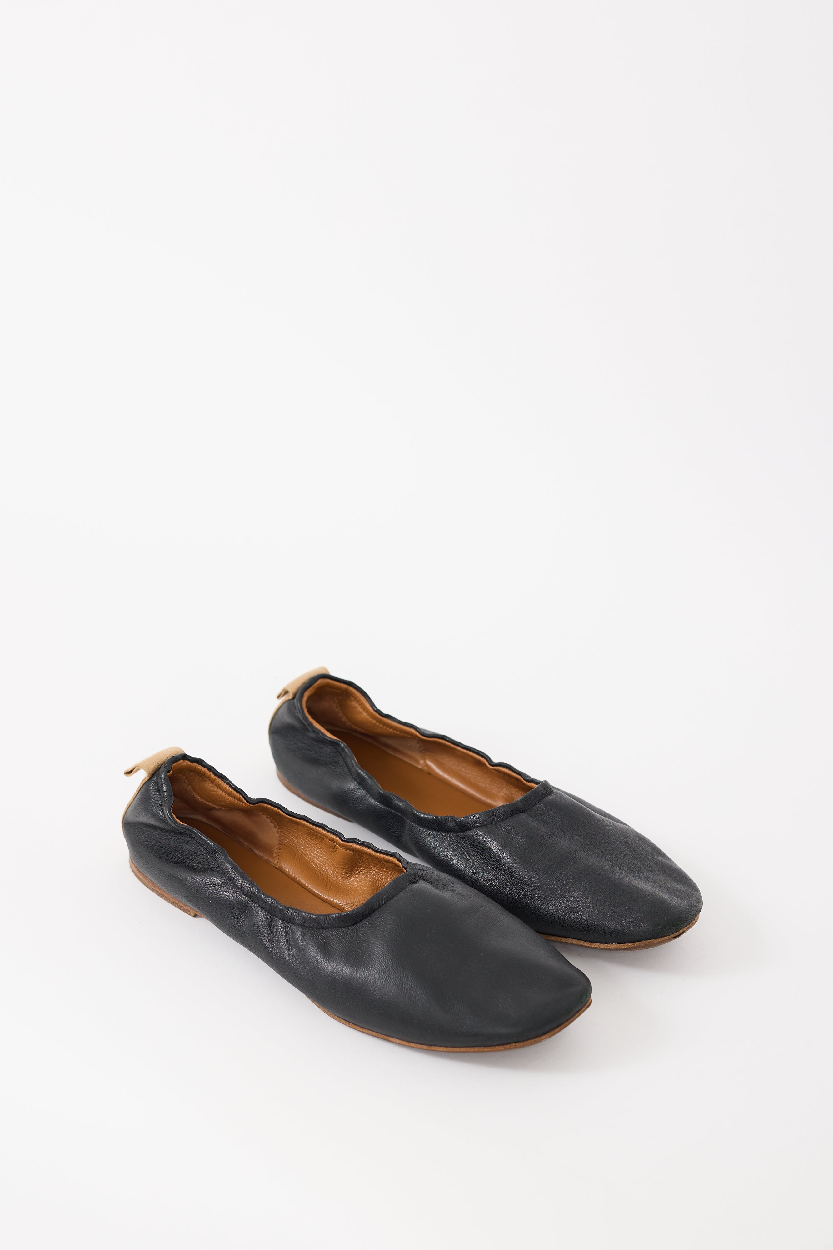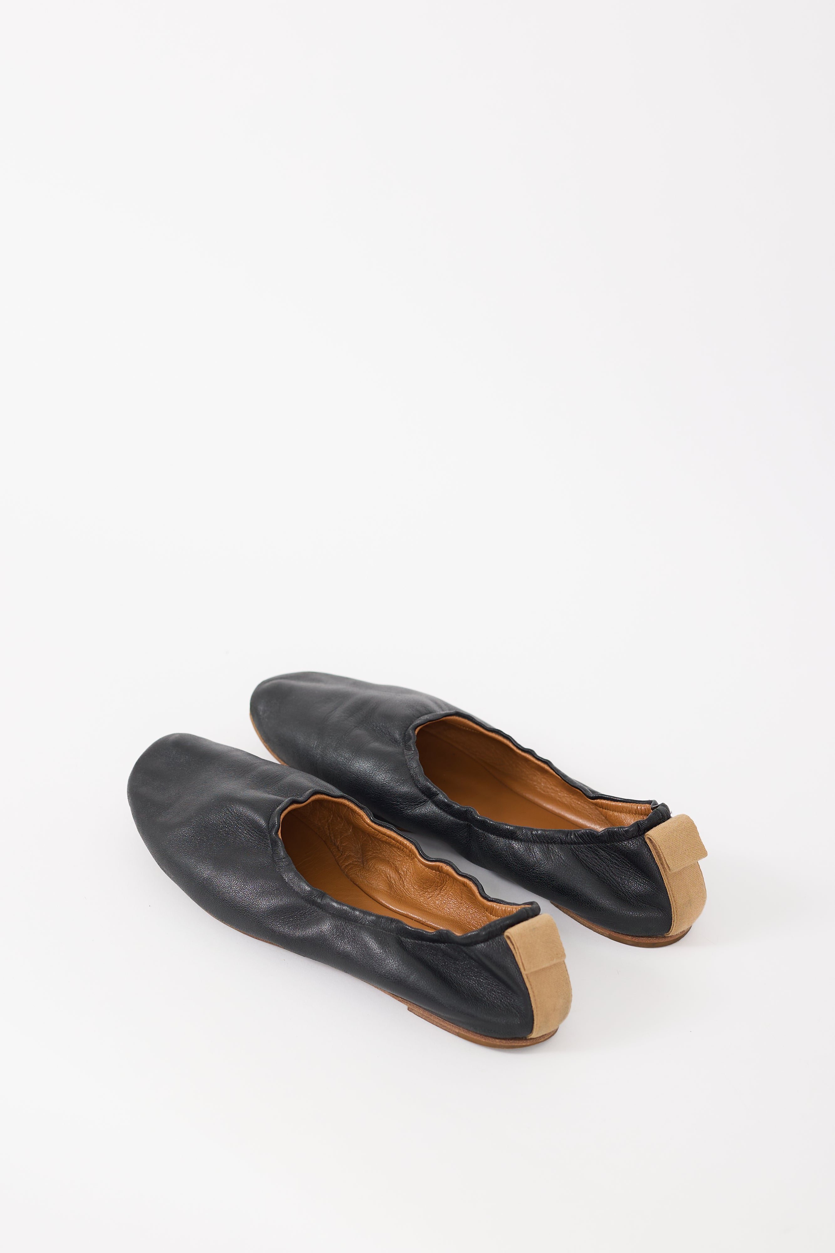 Pre-owned Celine black leather ballet flats featuring elasticized collar, rounded toe, and beige pull tab at back. Phoebe Philo era design.