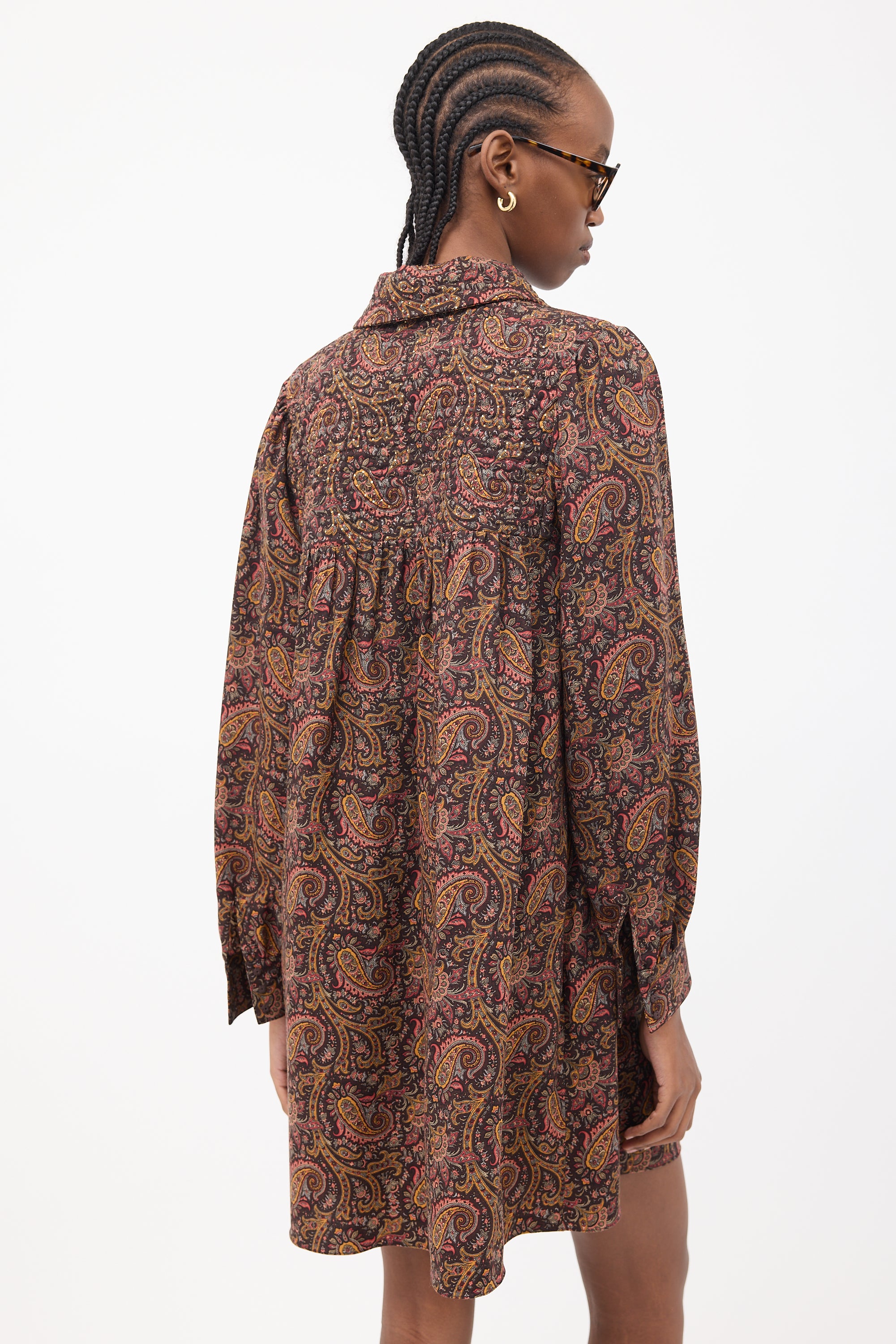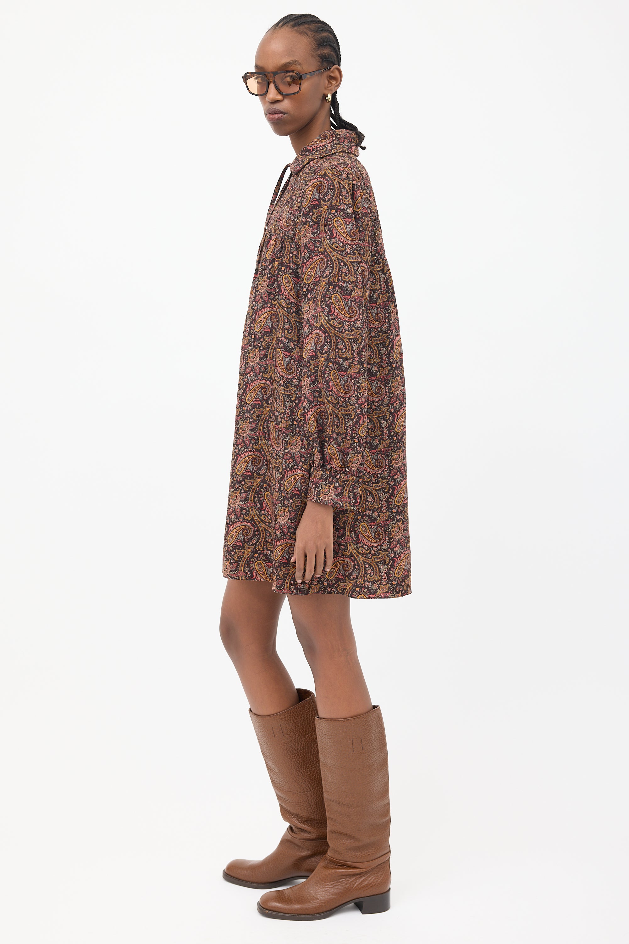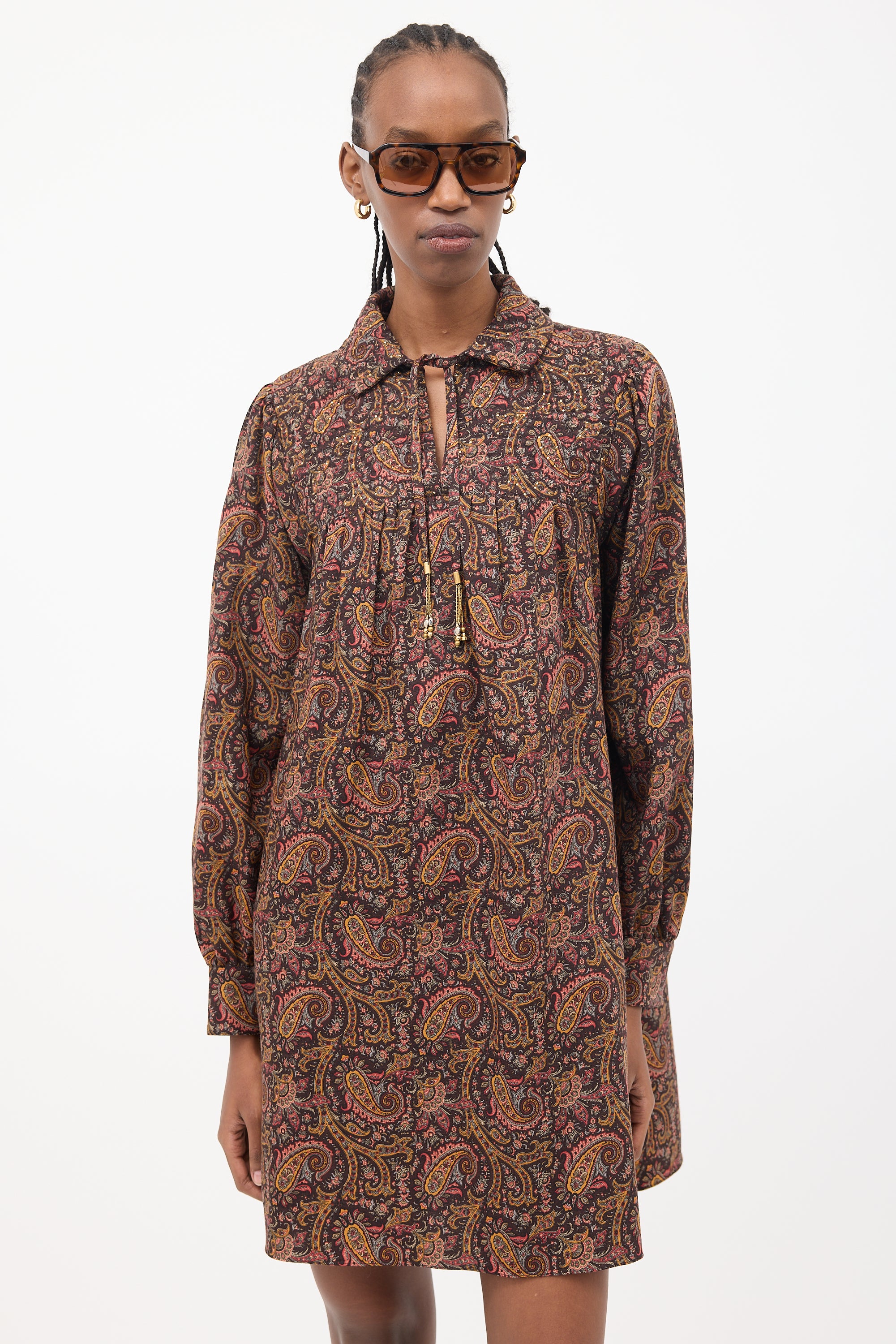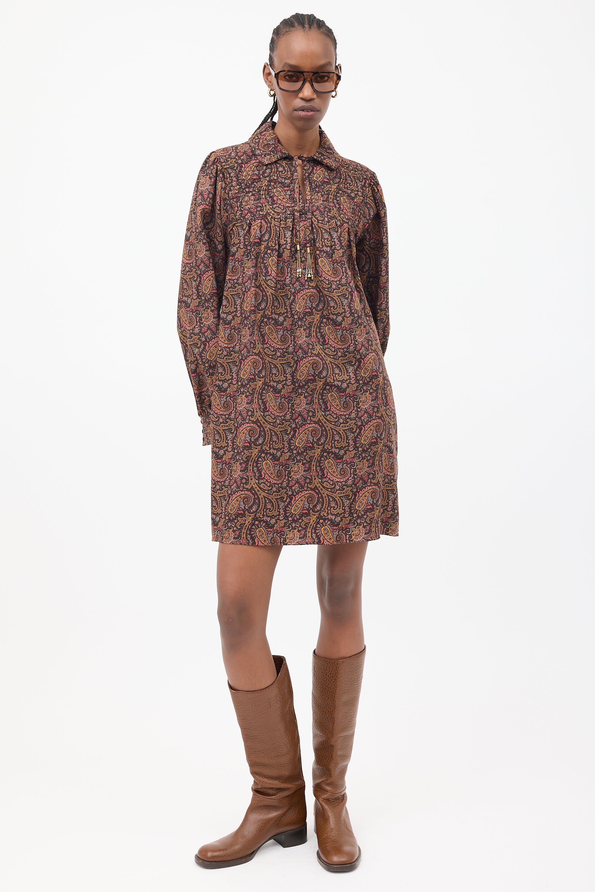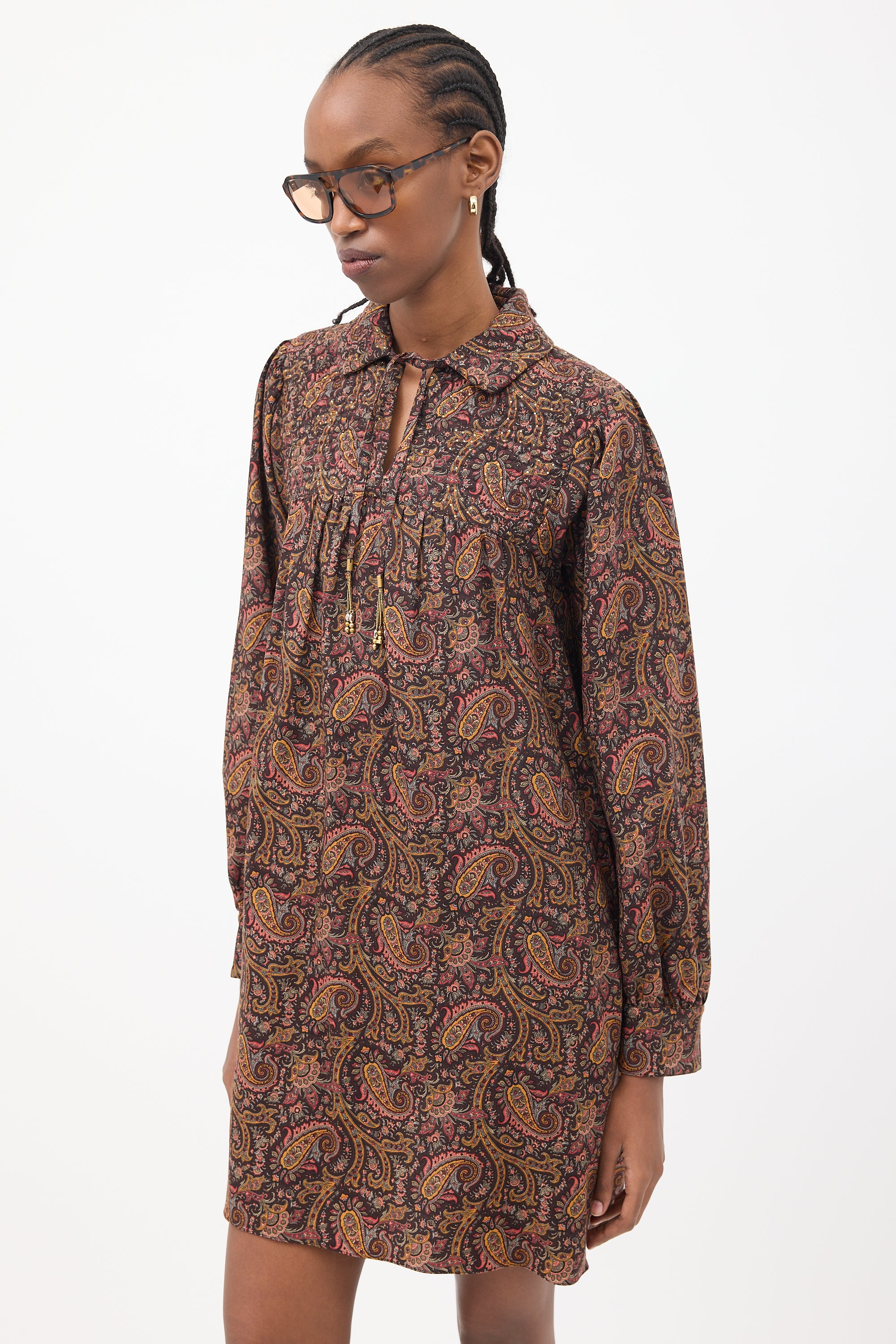 Pre-owned Celine brown and multicolour mini Folk dress featuring classic collar, keyhole neckline with tie fastening, paisley print, padded shoulder with sequin embellishment, snap buttoned cuffs, and two inseam pockets.