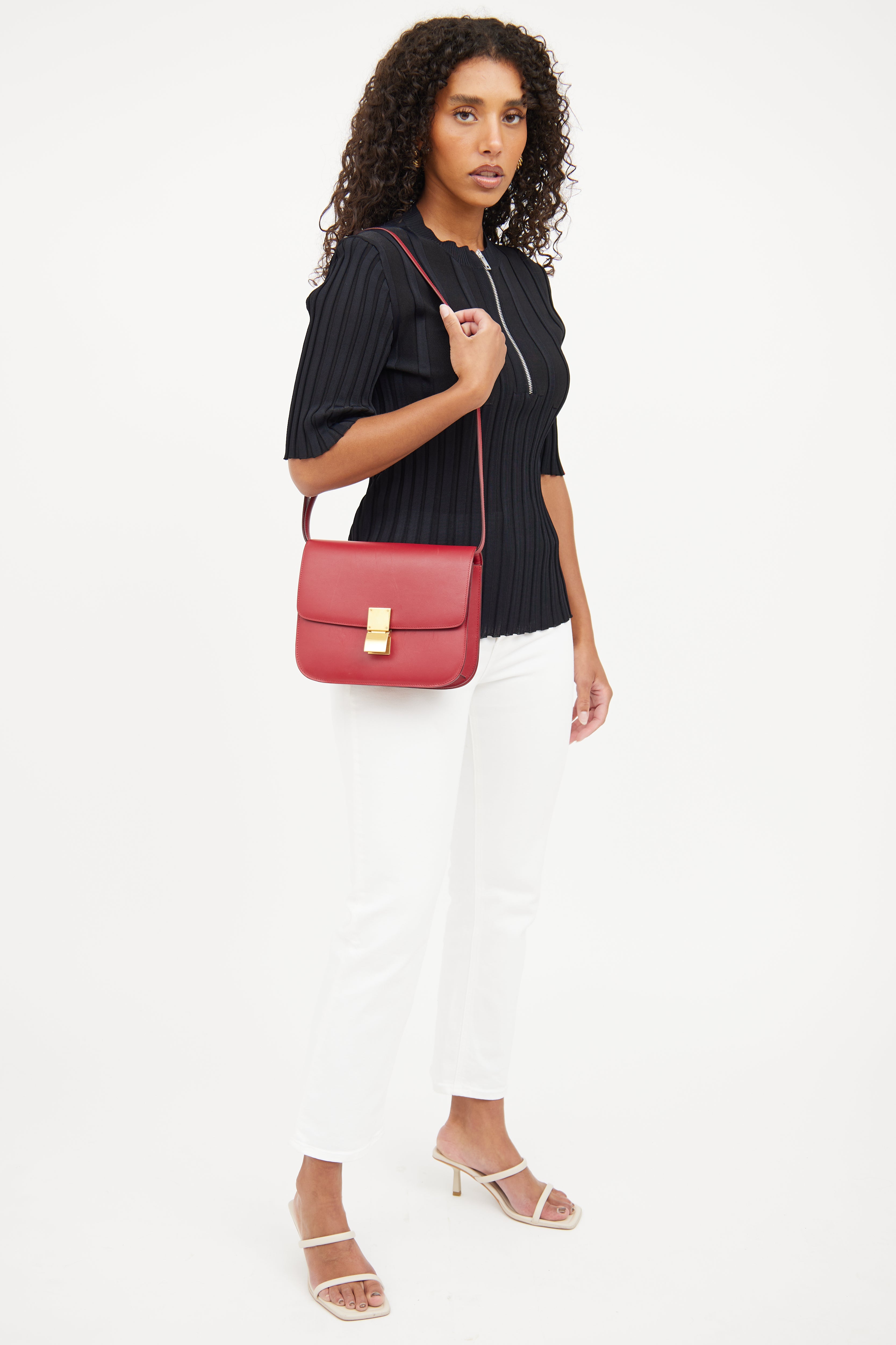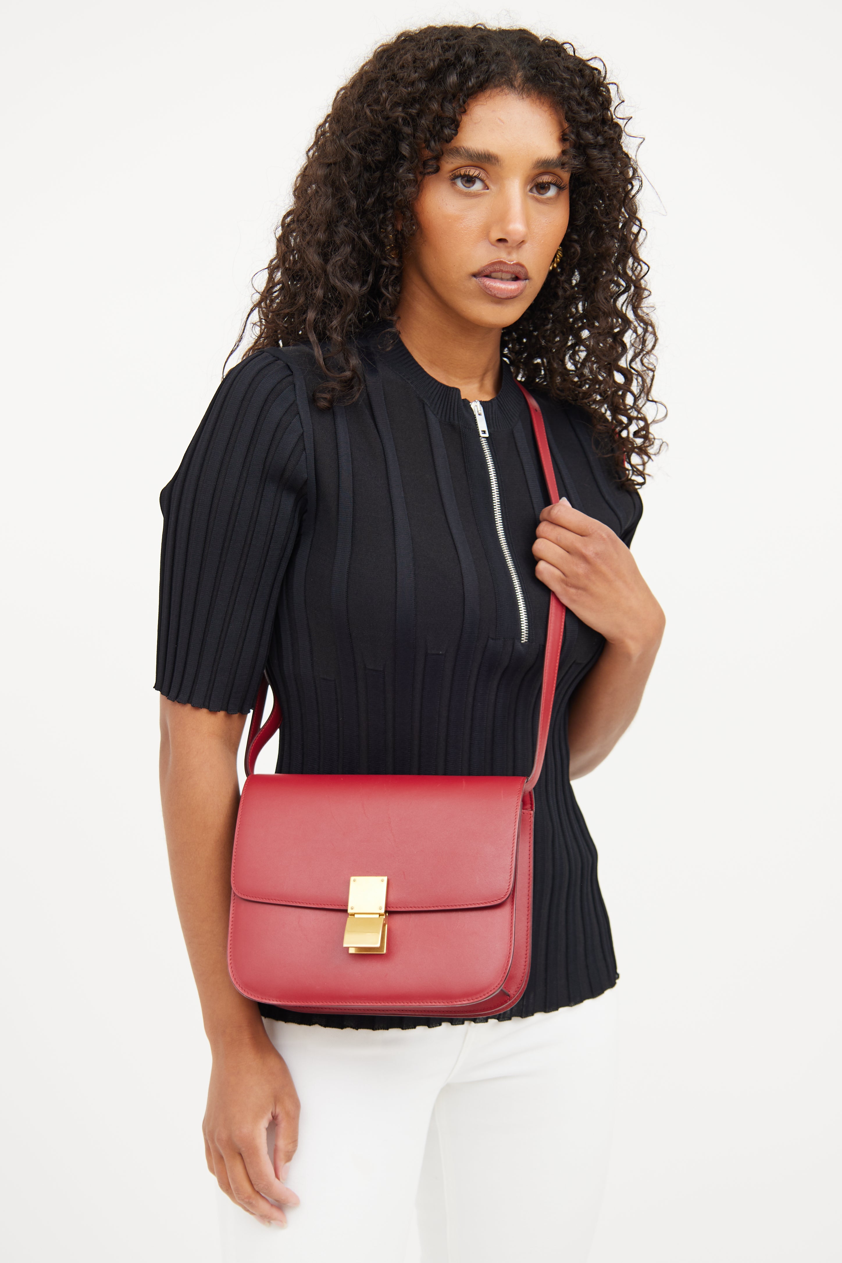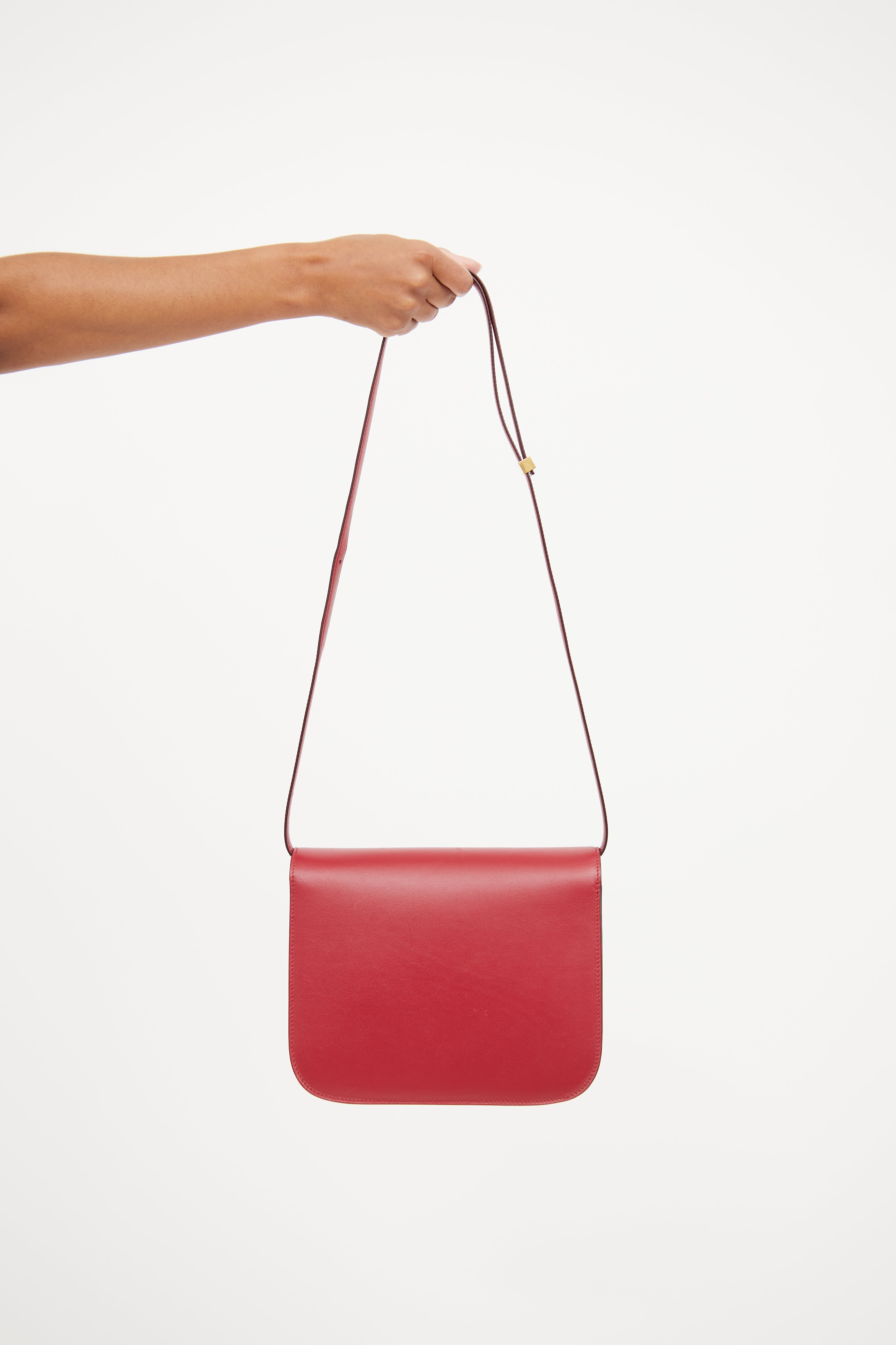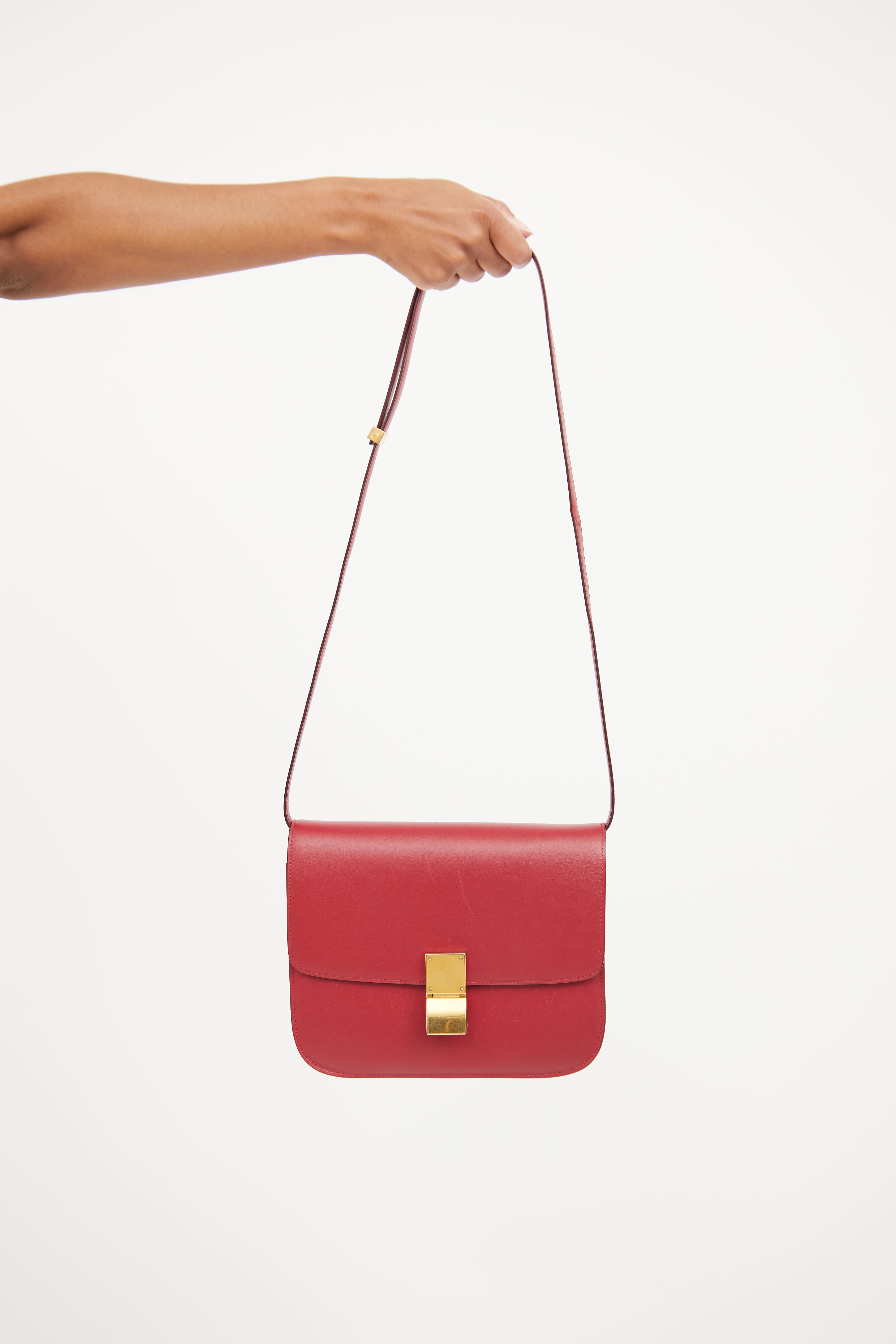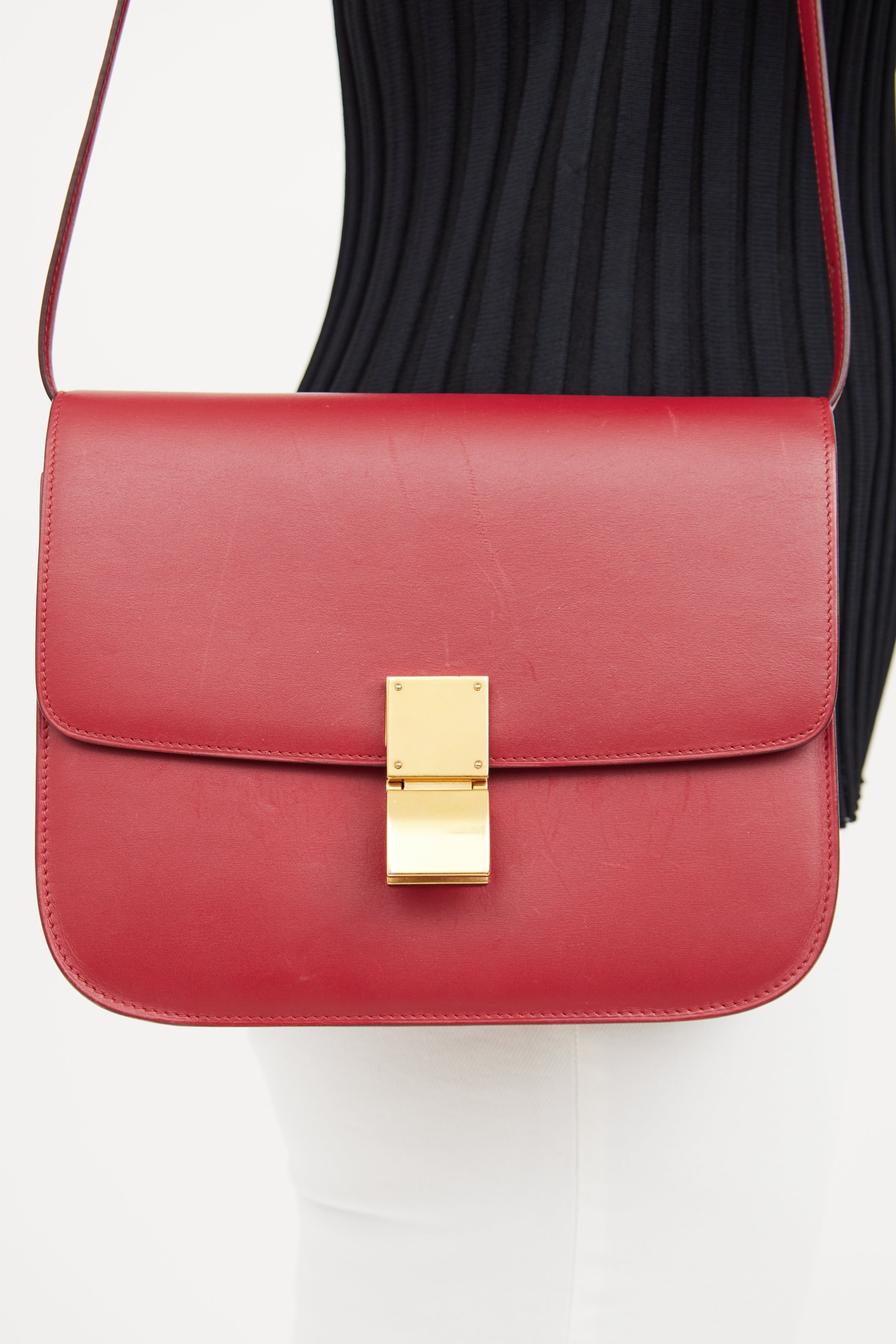 Pre-owned Celine medium red Box leather bag featuring a top flap, two main compartments with two slip pockets, one interior zip pocket, adjustable shoulder strap, and gold tone latch closure.