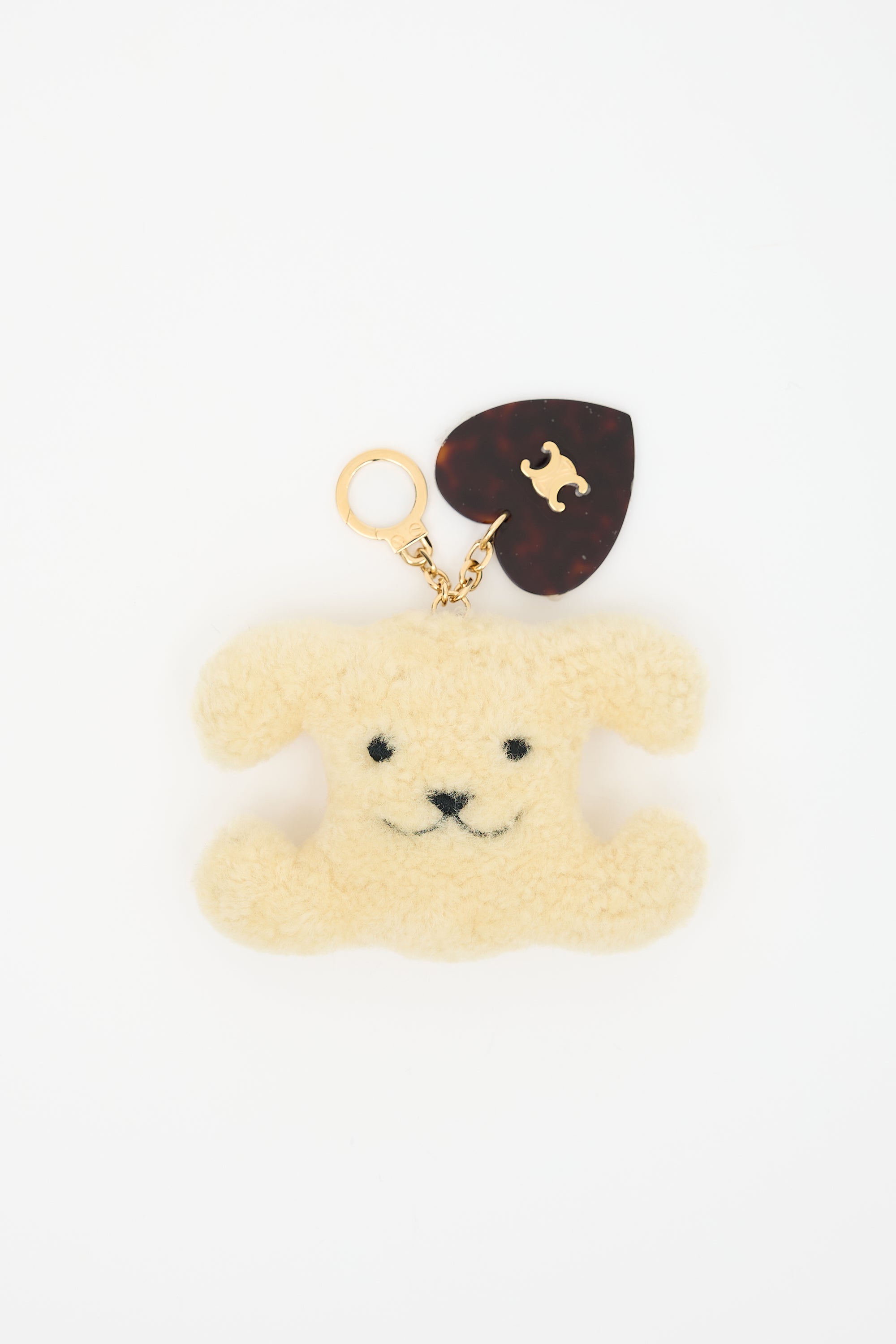 Pre-owned Celine a beige shearling Pom-Pom keychain featuring a Triomphe charm with black embroidered dog face, gold tone hardware, Tortoiseshell acetate heart charm, and O-ring clasp. Comes with original dust bag.