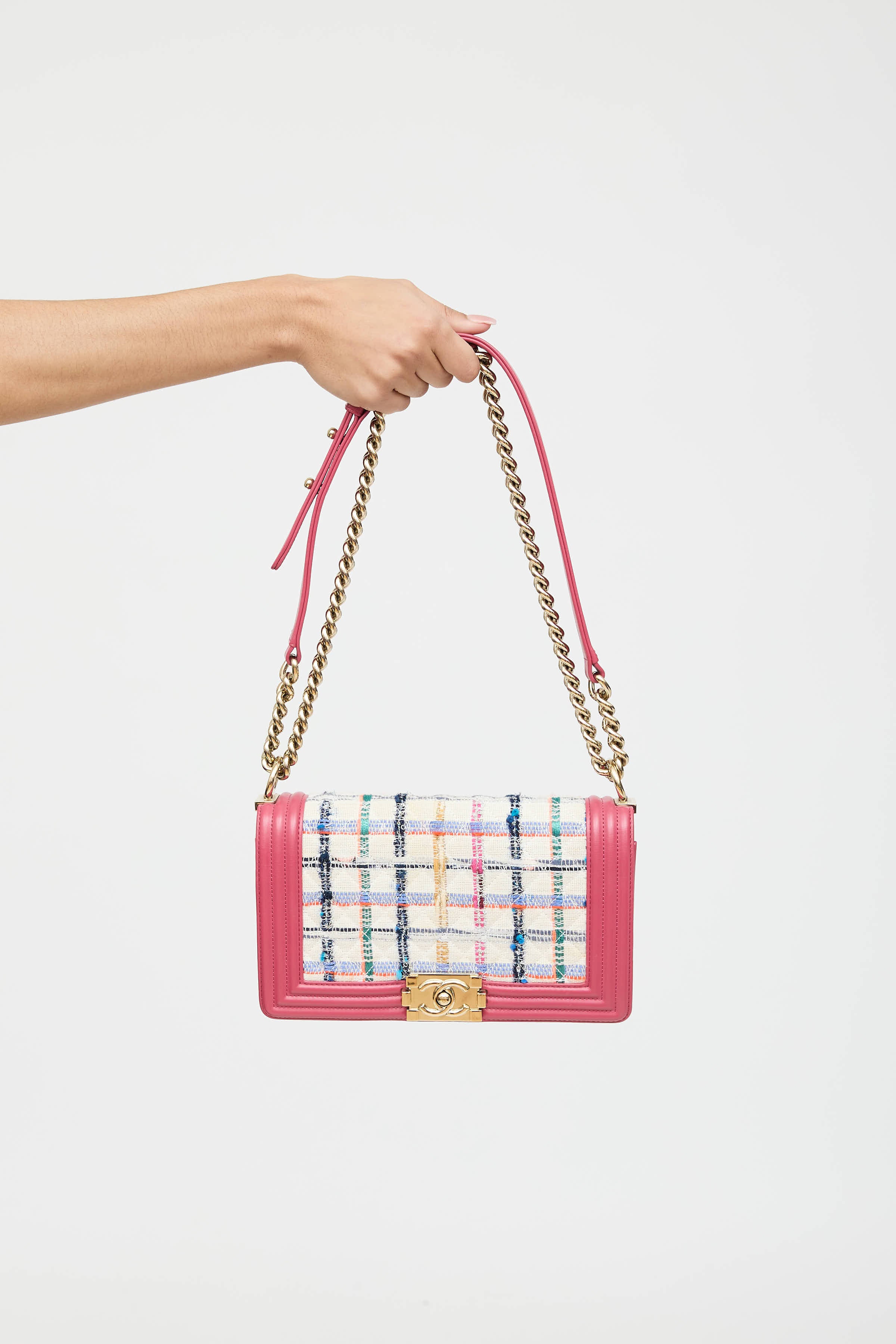 Pre-owned Chanel 2019 pink and white Medium Tweed Boy Bag featuring tweed front and back panel, sliding chain and leather shoulder strap, gold tone hardware, interlocking CC logo push lock closure at front, top flap with one main compartment, and one slip pocket. From the 2019 Collection by Virginie Viard.