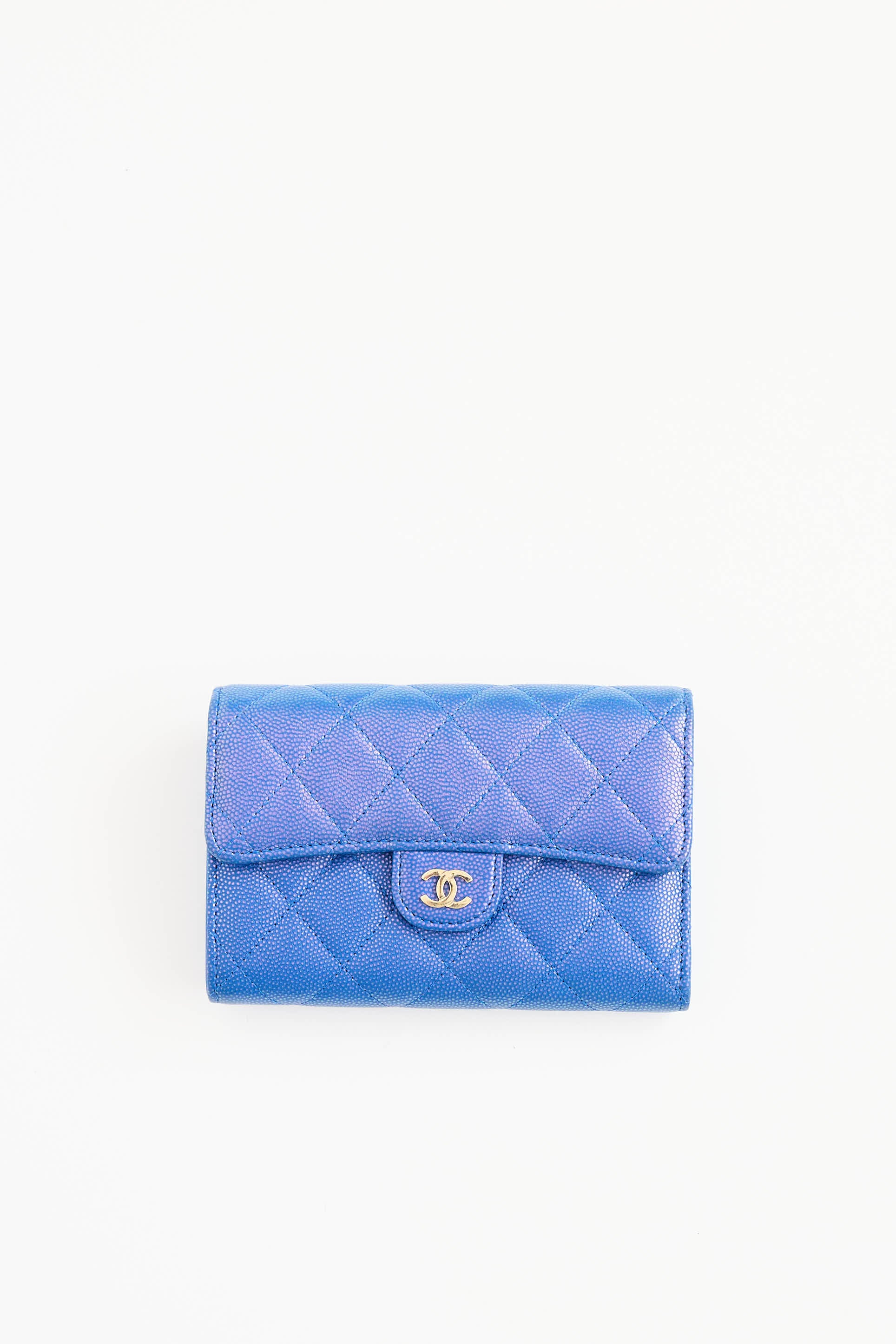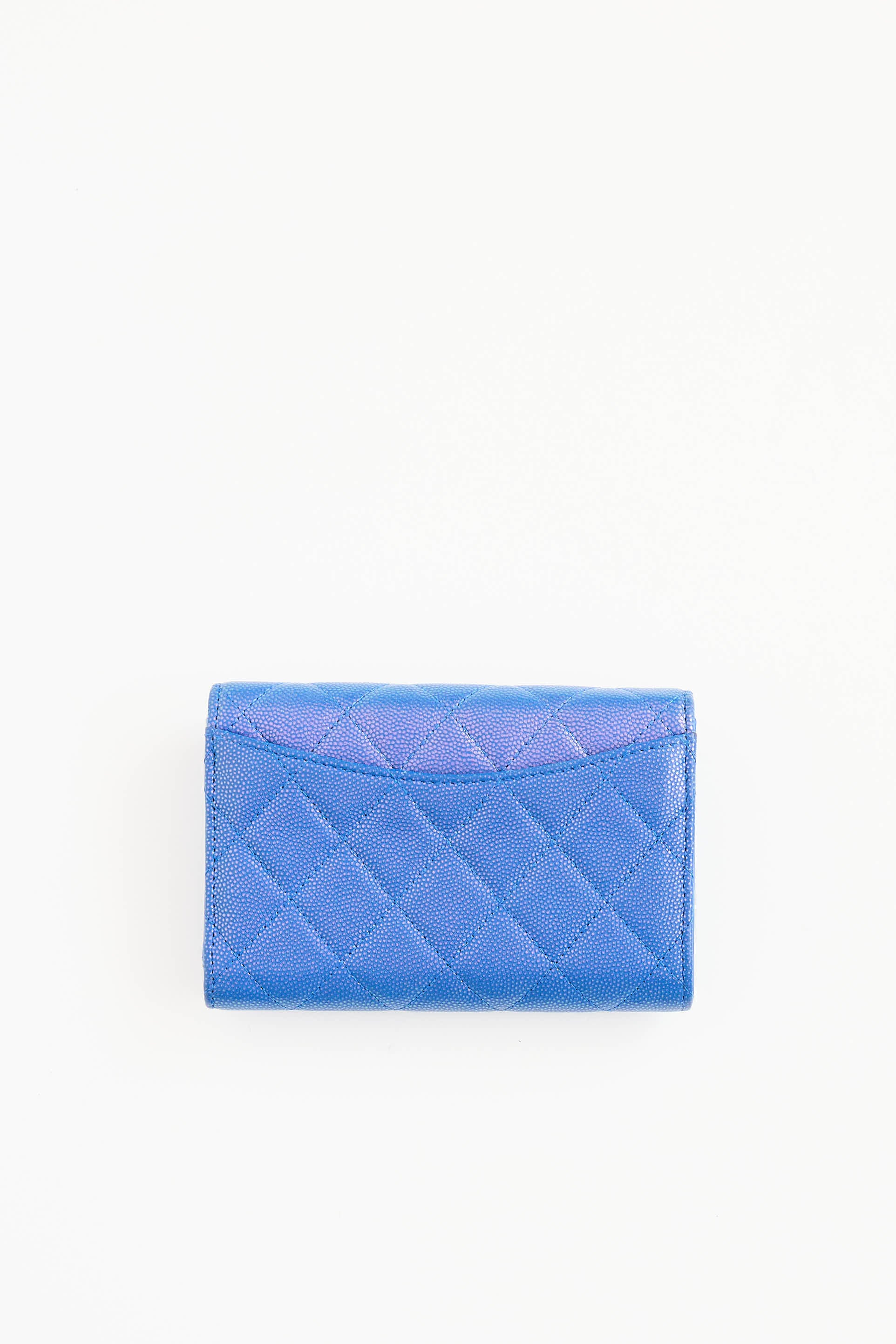 Pre-owned Chanel 31 Series blue iridescent Caviar wallet featuring quilted leather, slip pocket at back, gold tone CC hardware at front, top flap, five card slots, two slip pockets, one zip pocket, and one bill slot. From the 2021 Collection by Virginie Viard.