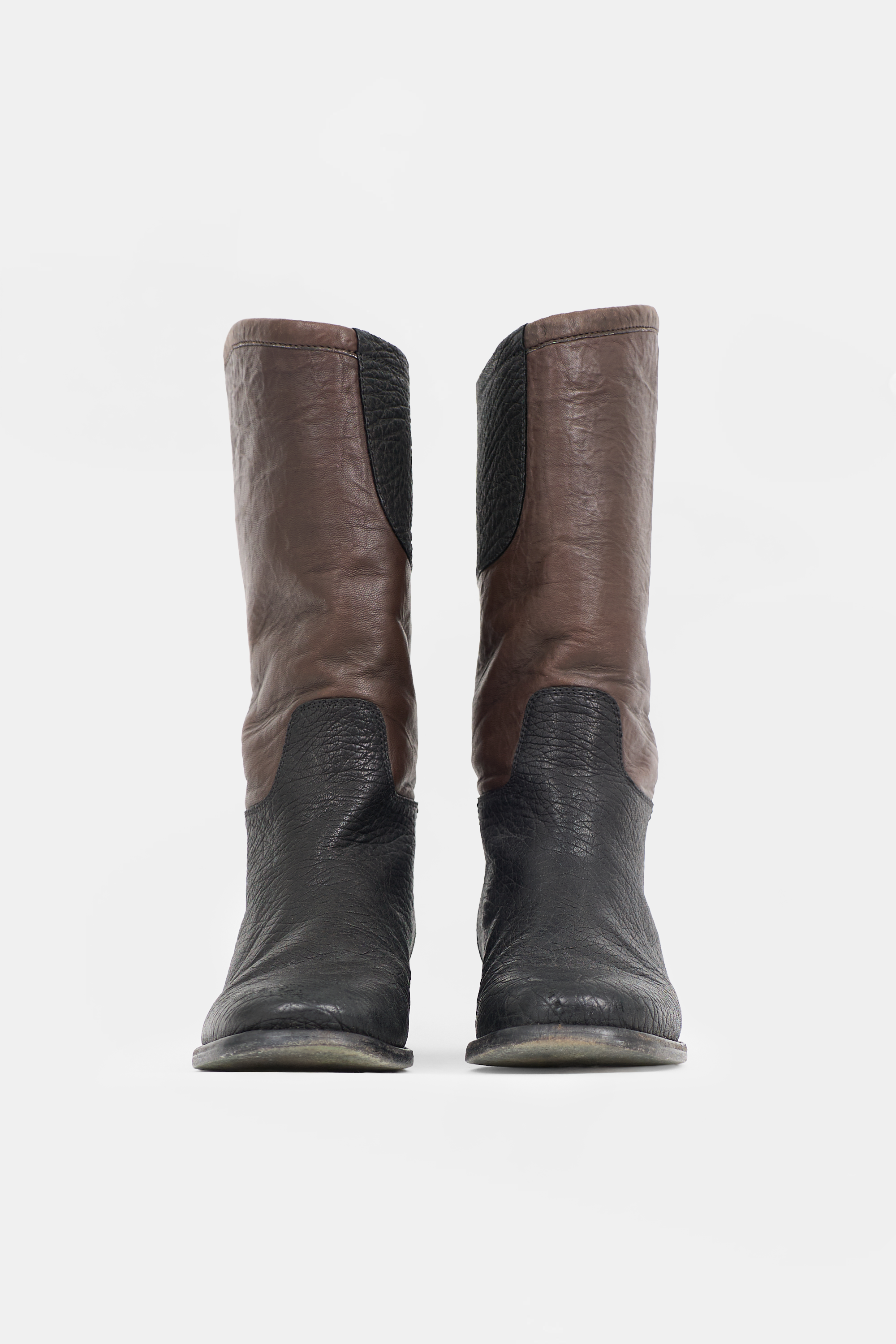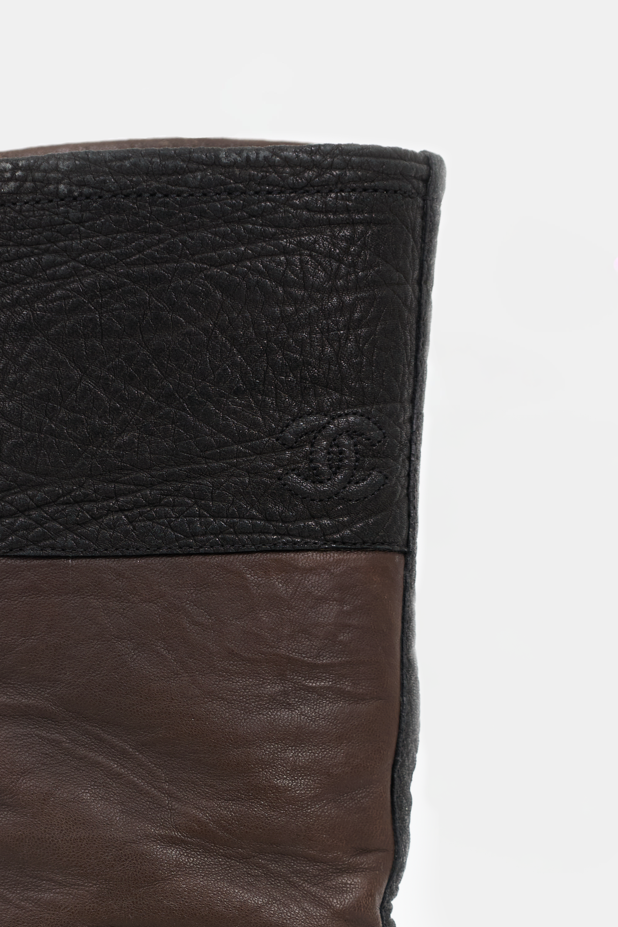 Pre-owned Chanel brown and black leather two tone boots featuring rounded toe, stitched CC motif at inner shaft, pull on entry, and stacked heel.