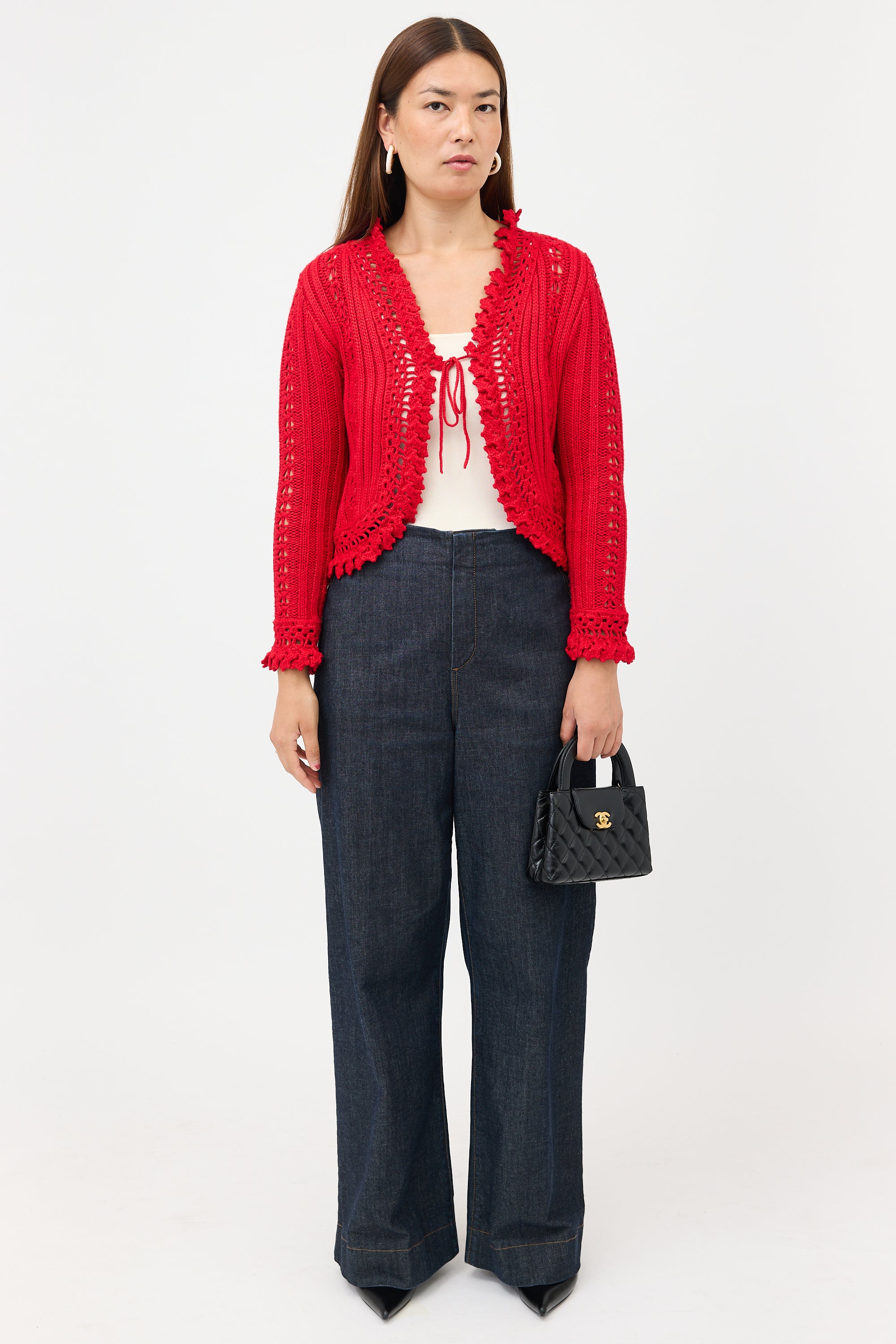 Pre-owned Chanel Spring Summer 2004 red crochet cardigan featuring an open front with tie fastening, ruffled trims, and glass logo plaque at hem.