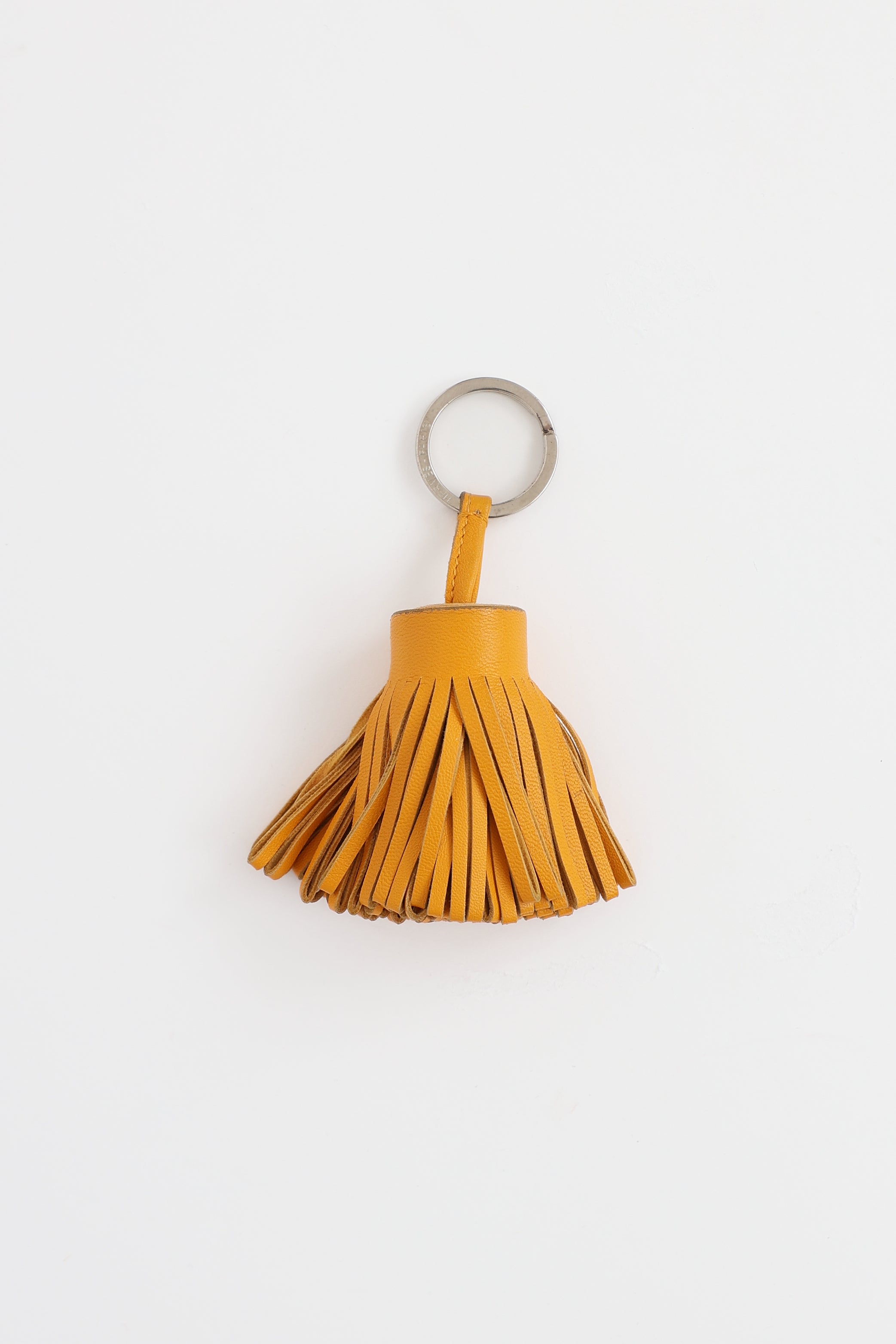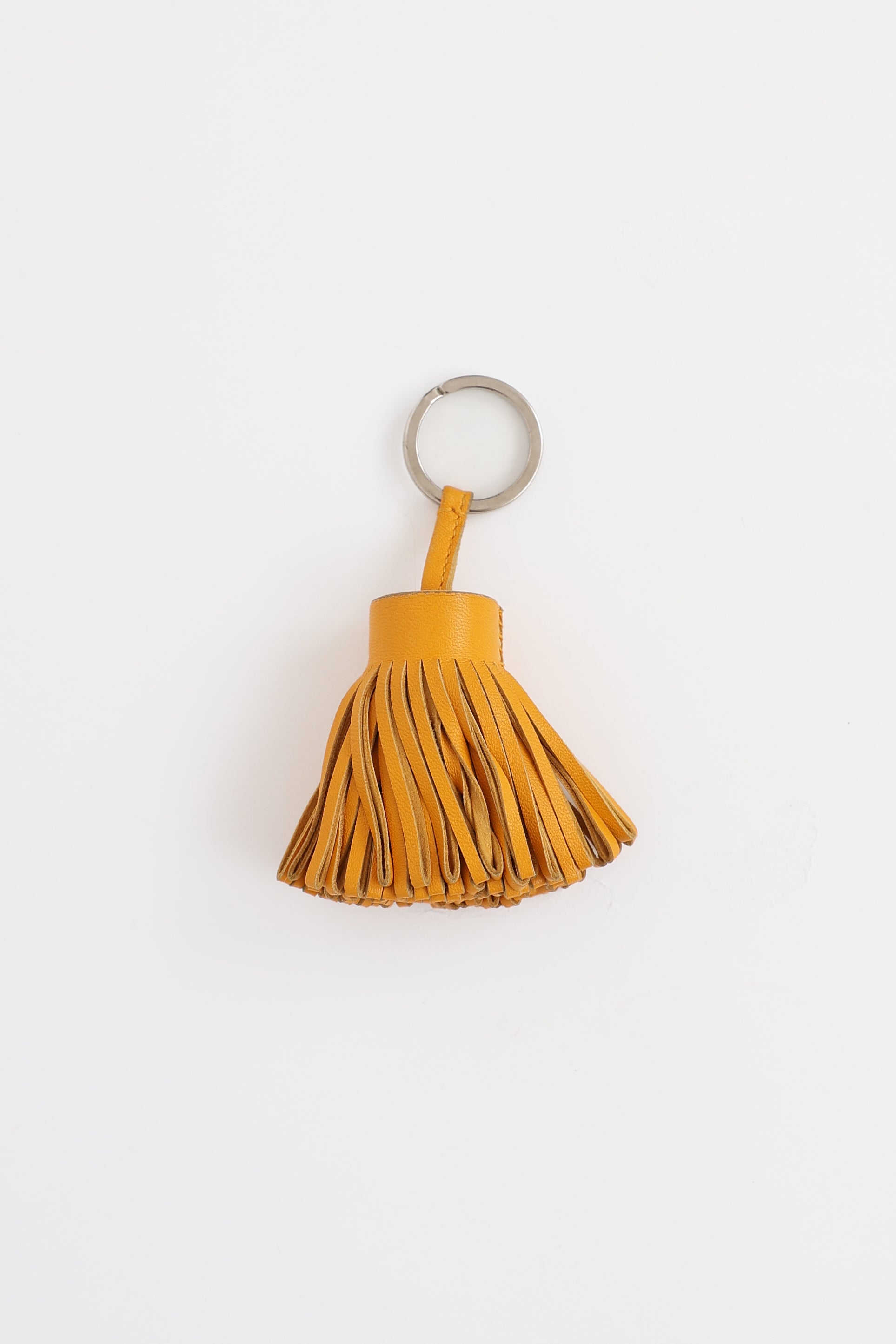 Pre-owned Hermès orange Carmen Tassel key ring featuring milo lambskin fringe, stainless steel hardware, and key ring closure with engraved logo.