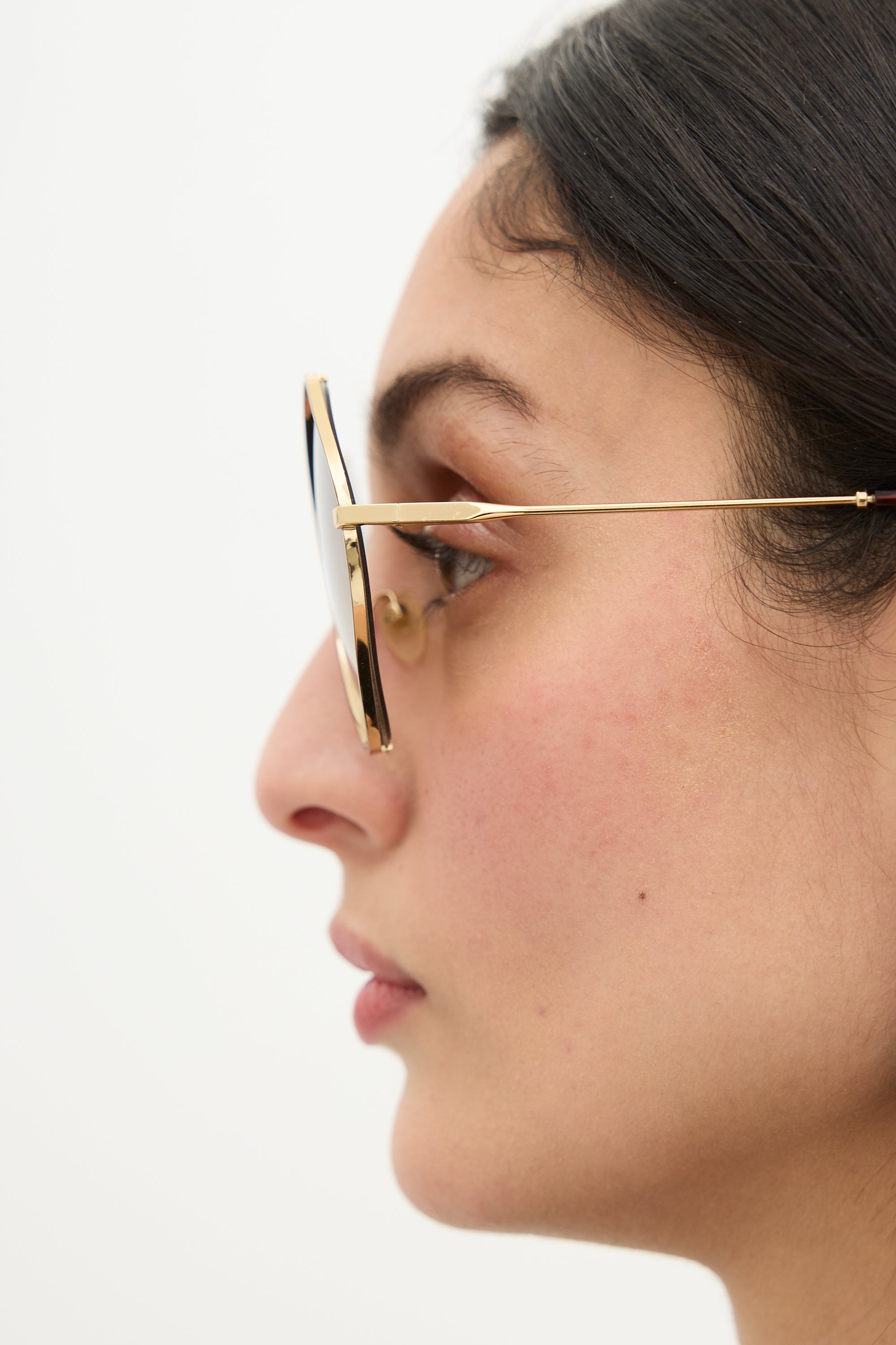 Pre-owned Chloé gold CE159S sunglasses featuring diamond shaped wire frame with tortoise print outline trim, brown tinted lenses, adjustable nose pads, and rubber tortoise print arm tips. Comes with original case.
