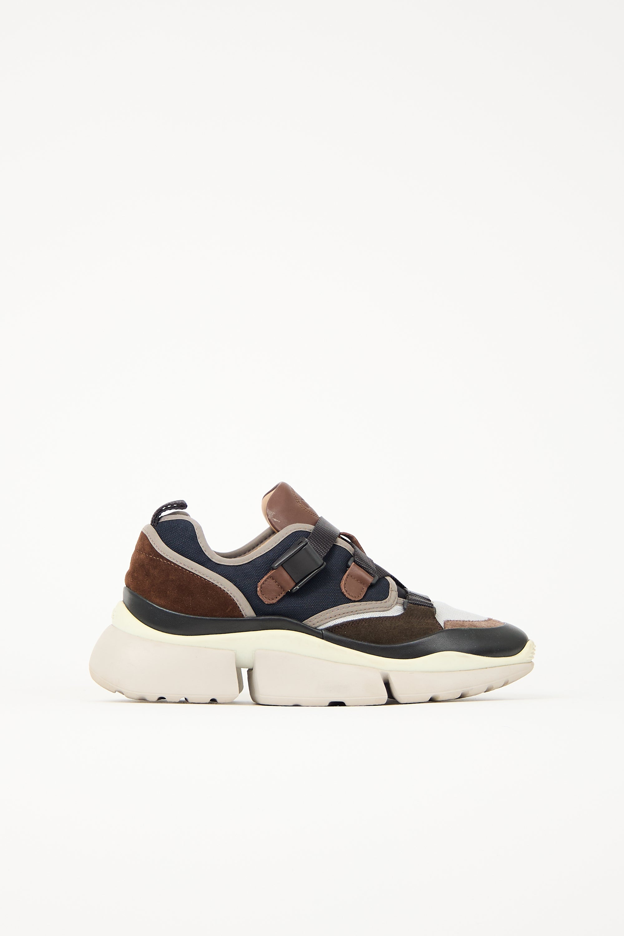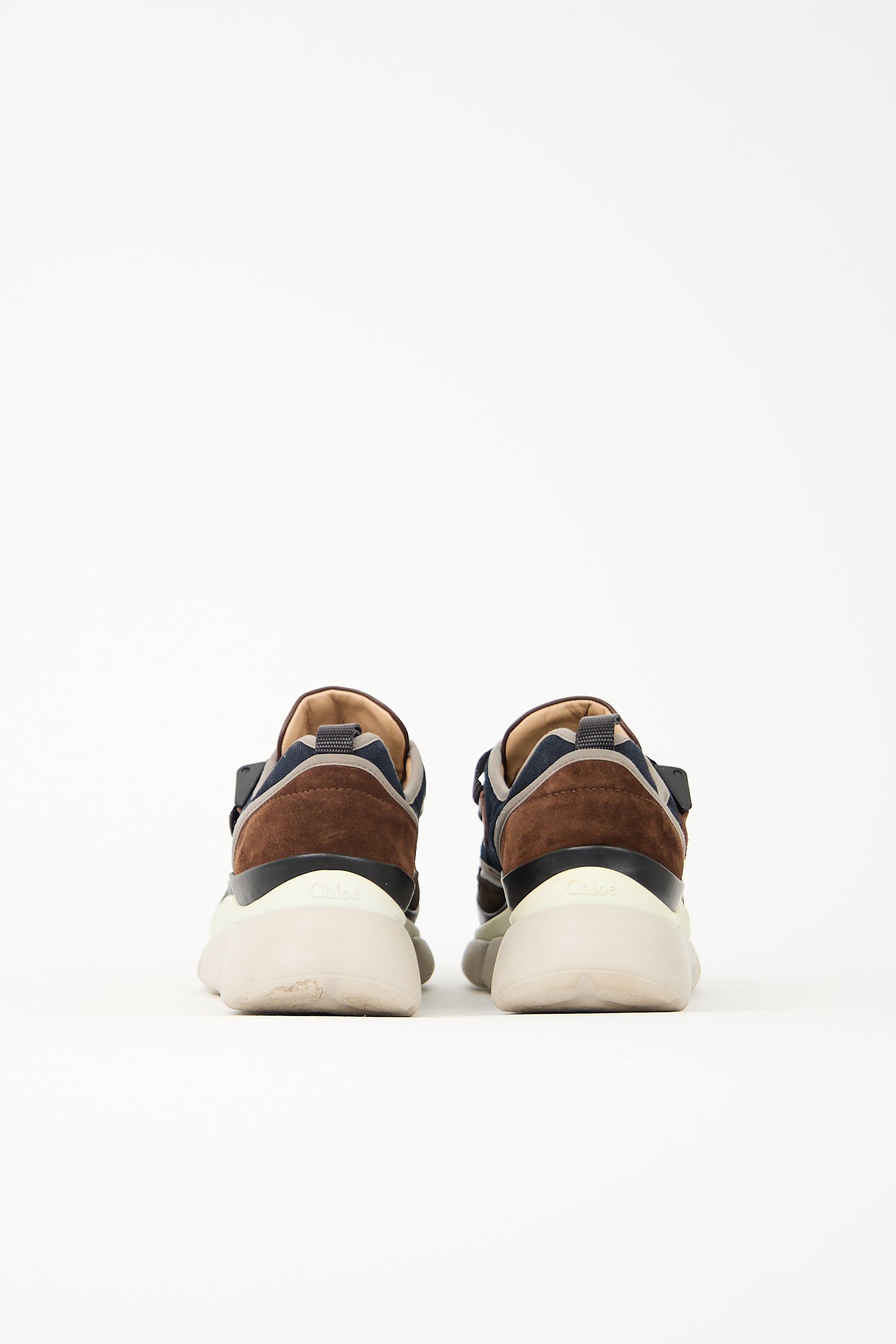 Pre-owned Chloé brown and navy mesh Sonnie sneakers featuring an almond toe, suede and soft leather panels throughout, adjustable grosgrain strap with a cam buckle fastening, logo at tongue and midsole counter, pull tab at heel, and a cut out rubber sole.