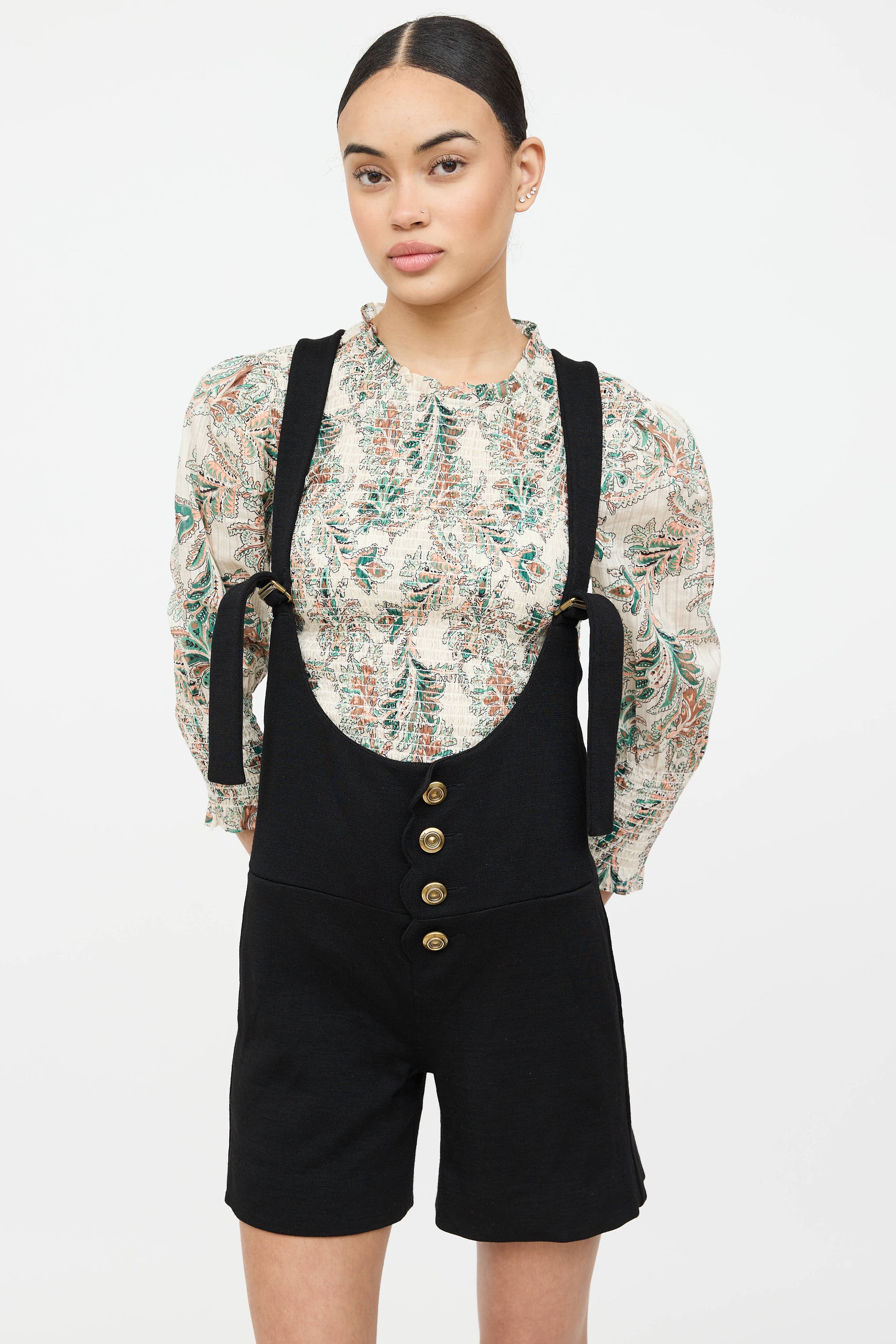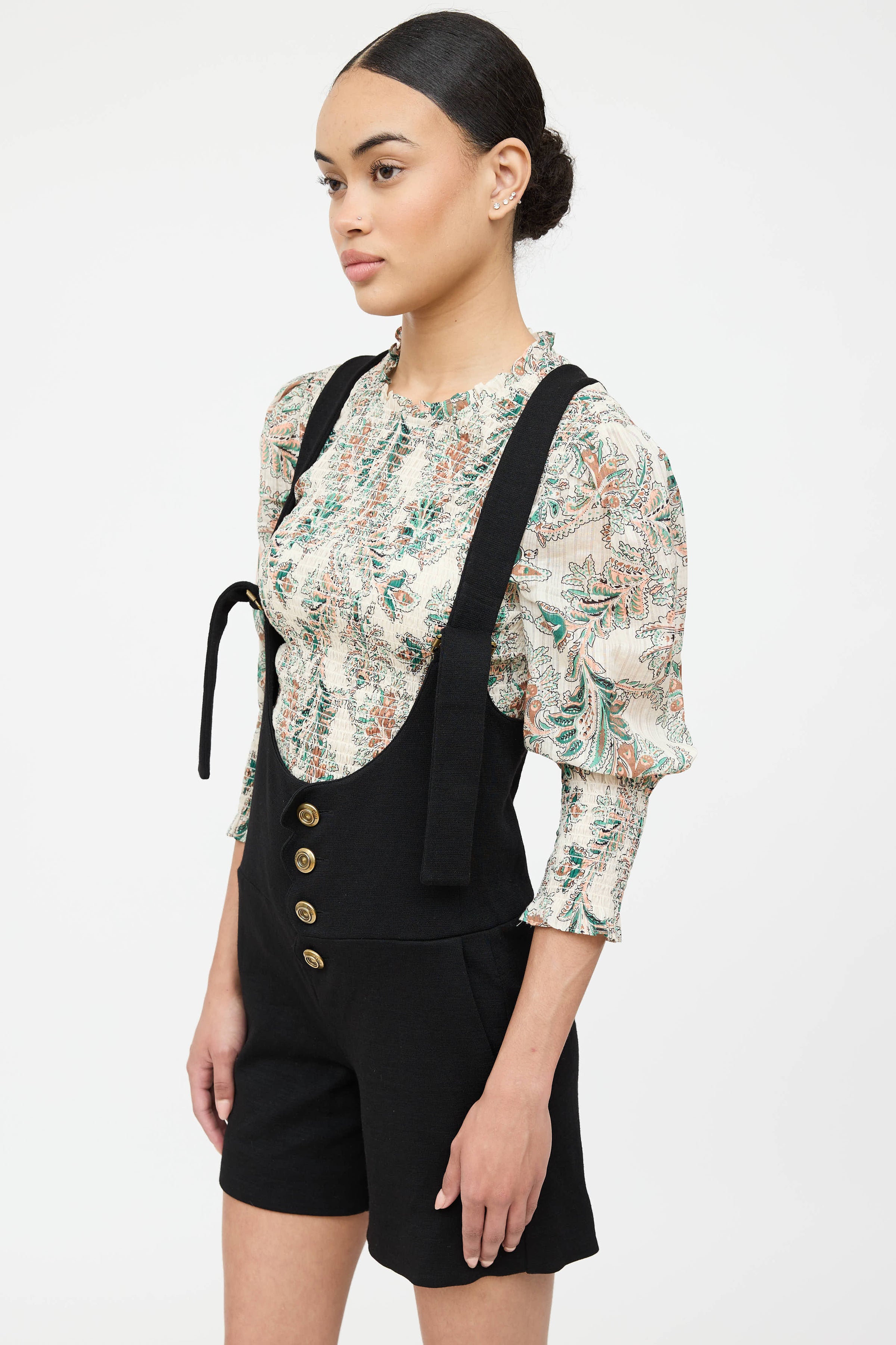Pre-owned Chloé black sleeveless pinafore overall romper featuring adjustable overall straps, gold tone button front with scalloped hemline, and slit pockets at side.