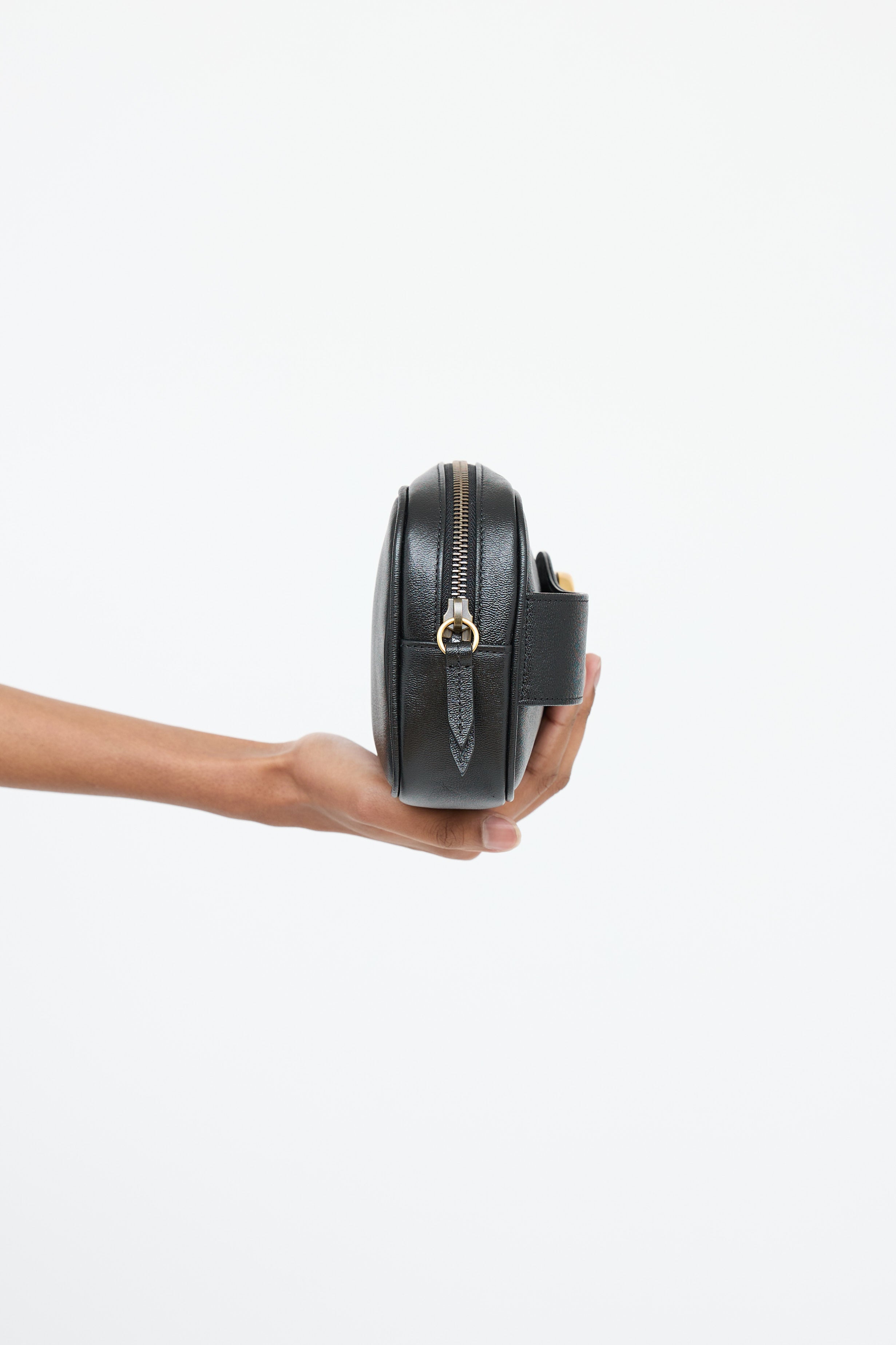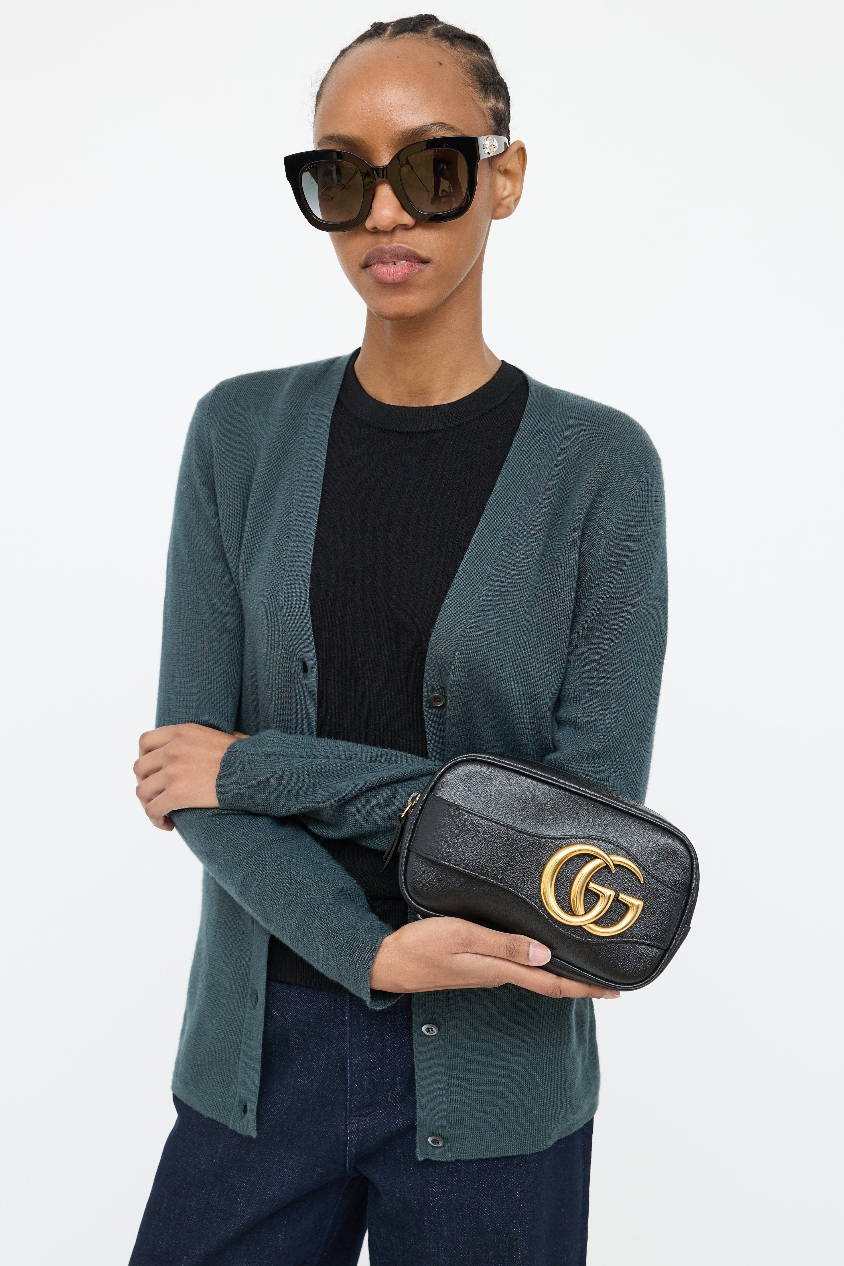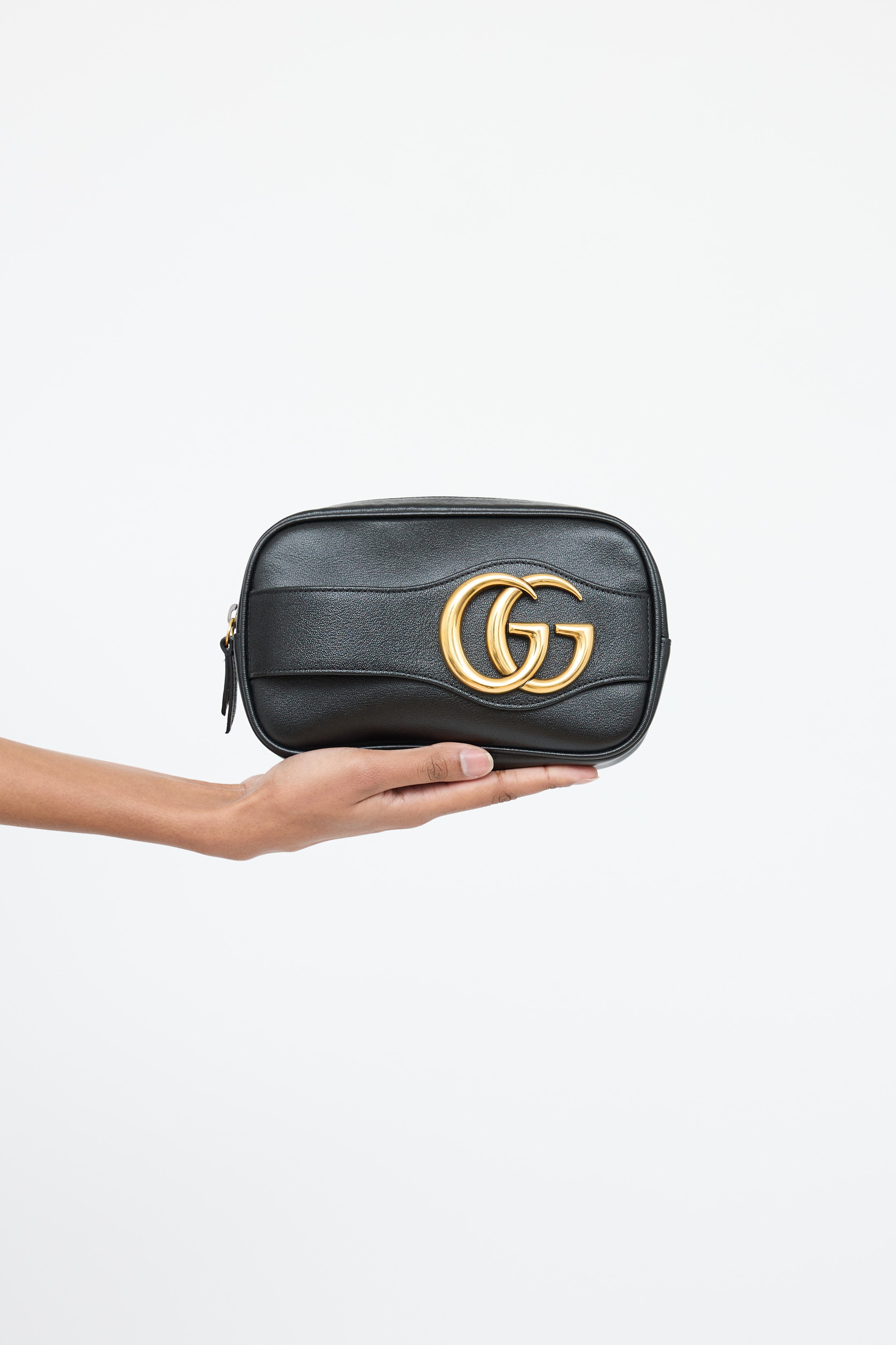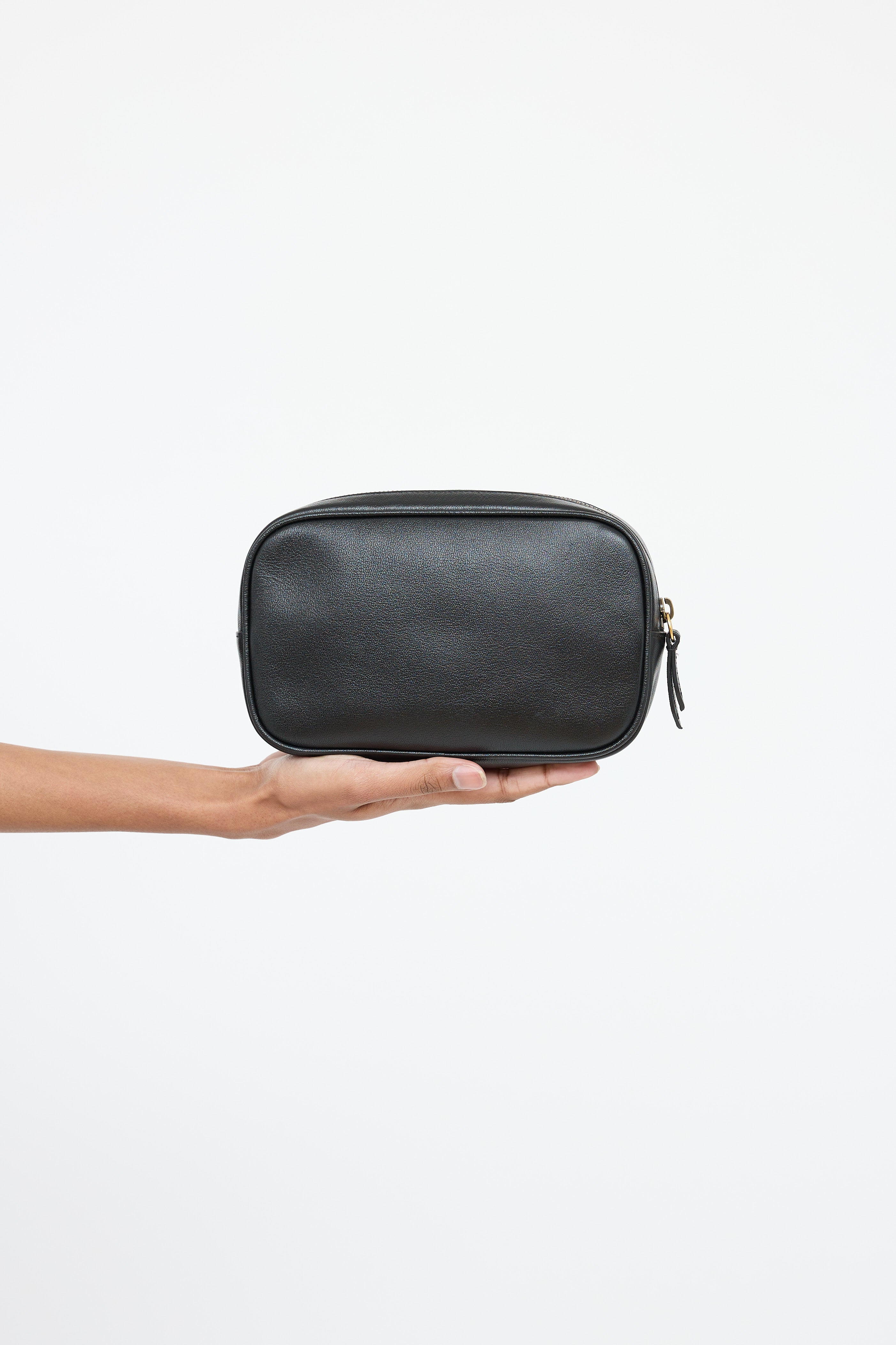 Pre-owned Gucci black Marmont Dhalia leather clutch featuring a strap at front with gold tone GG logo hardware, one main compartment with two slip pockets, and top zip closure.